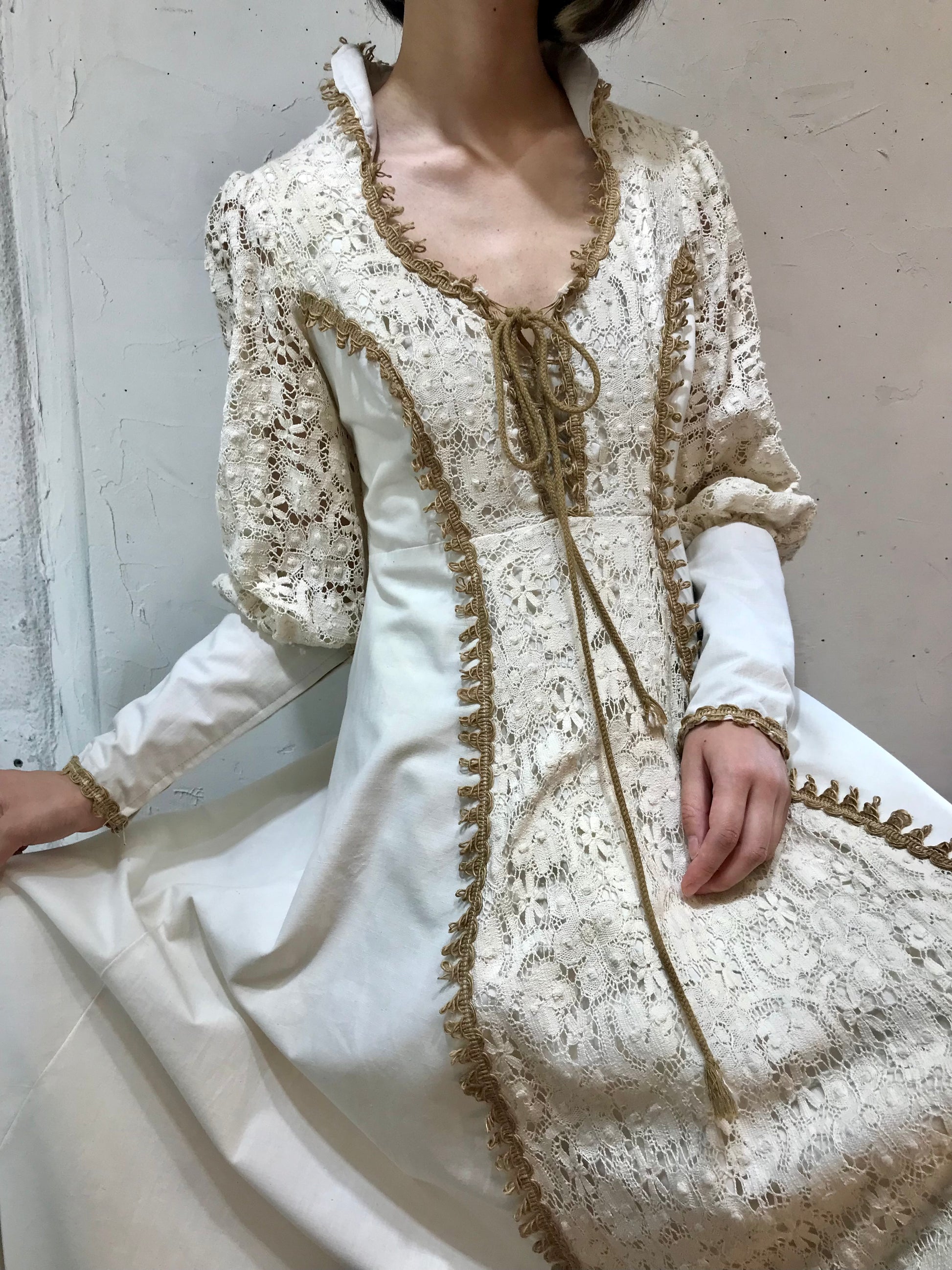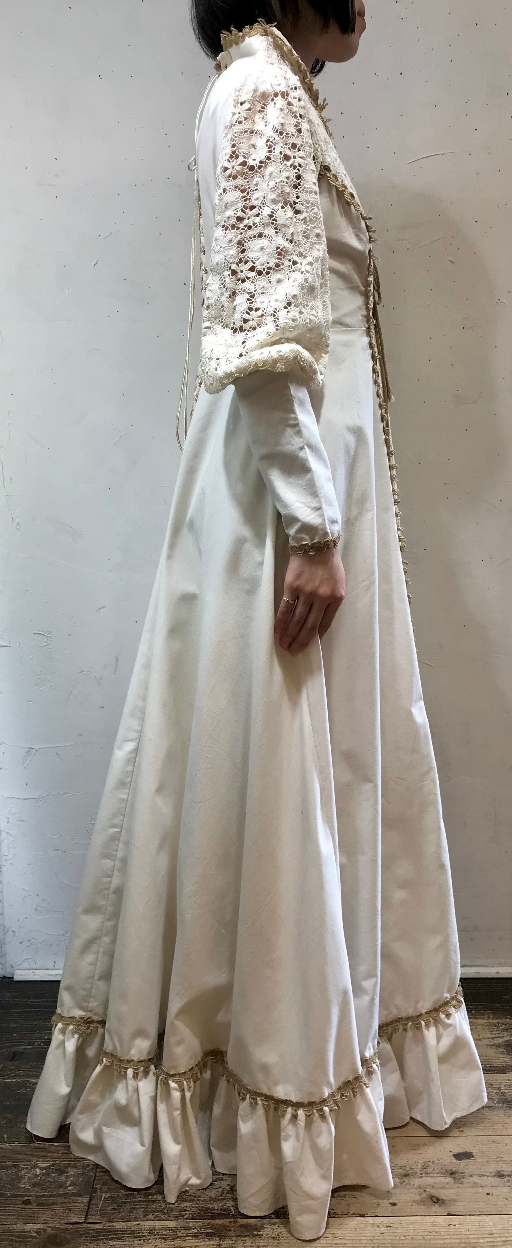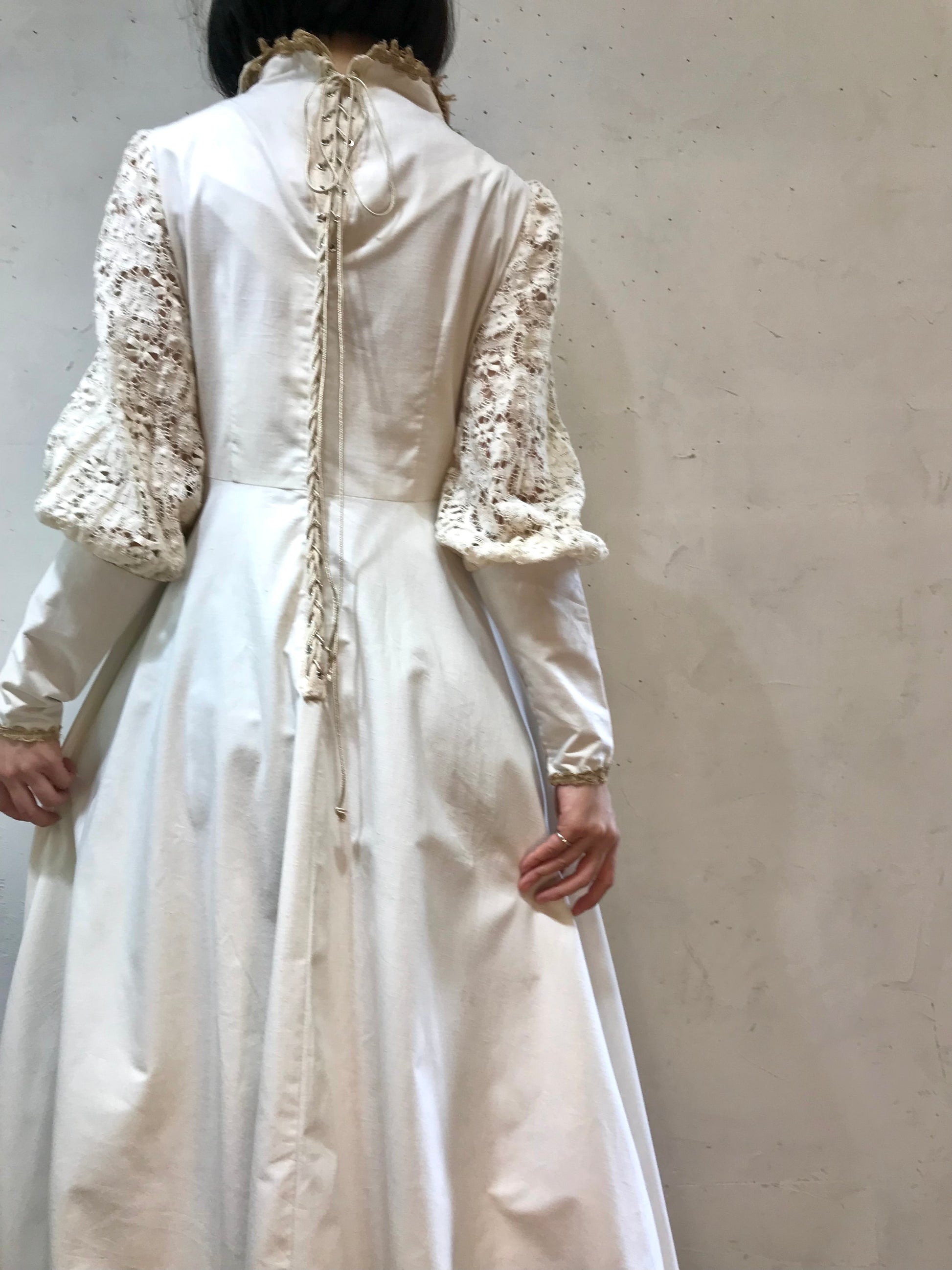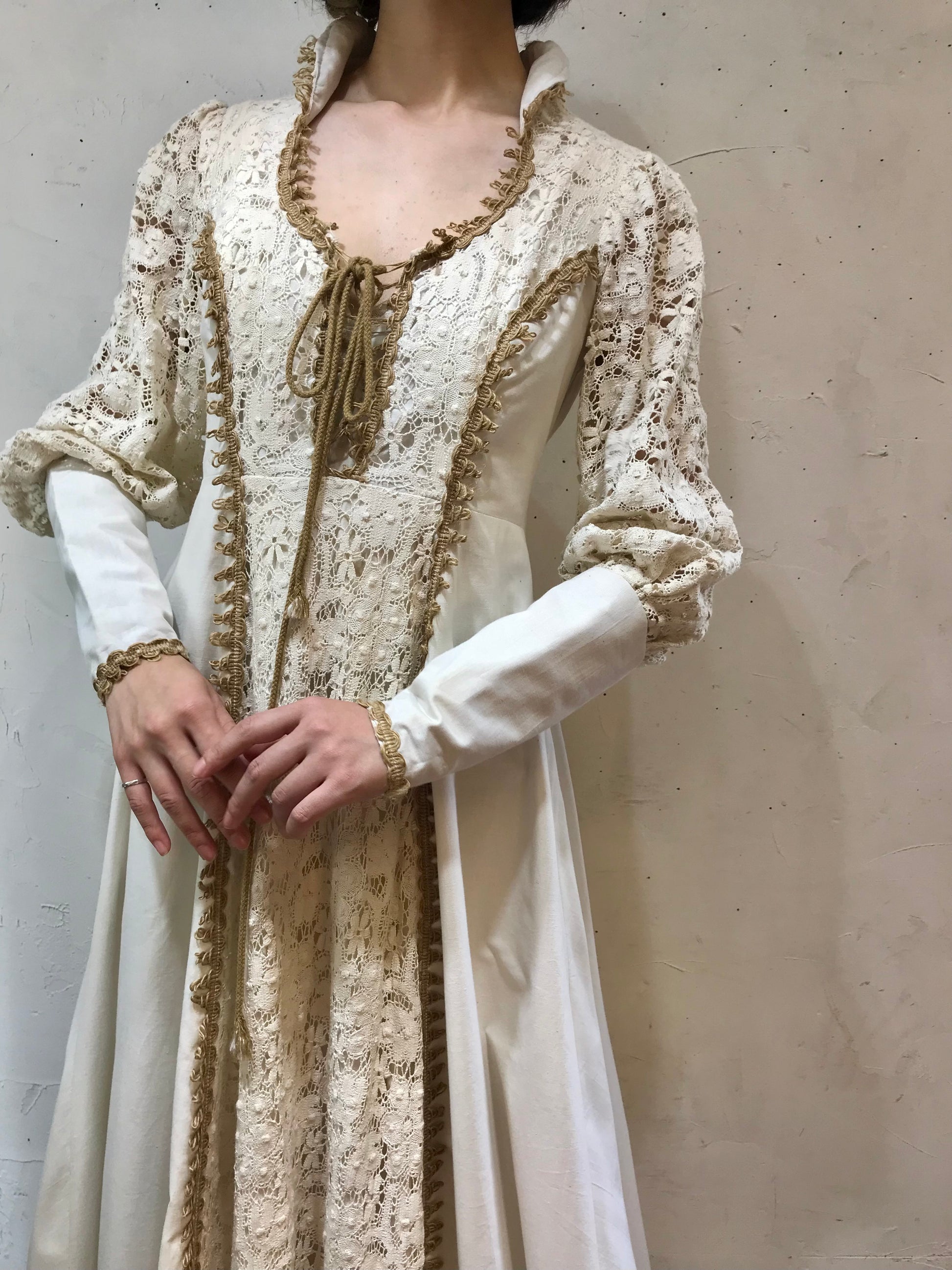 ロングカフスや、繊細なレースがたっぷり使われた贅沢で重厚感ある雰囲気のビンテージならではな1着。