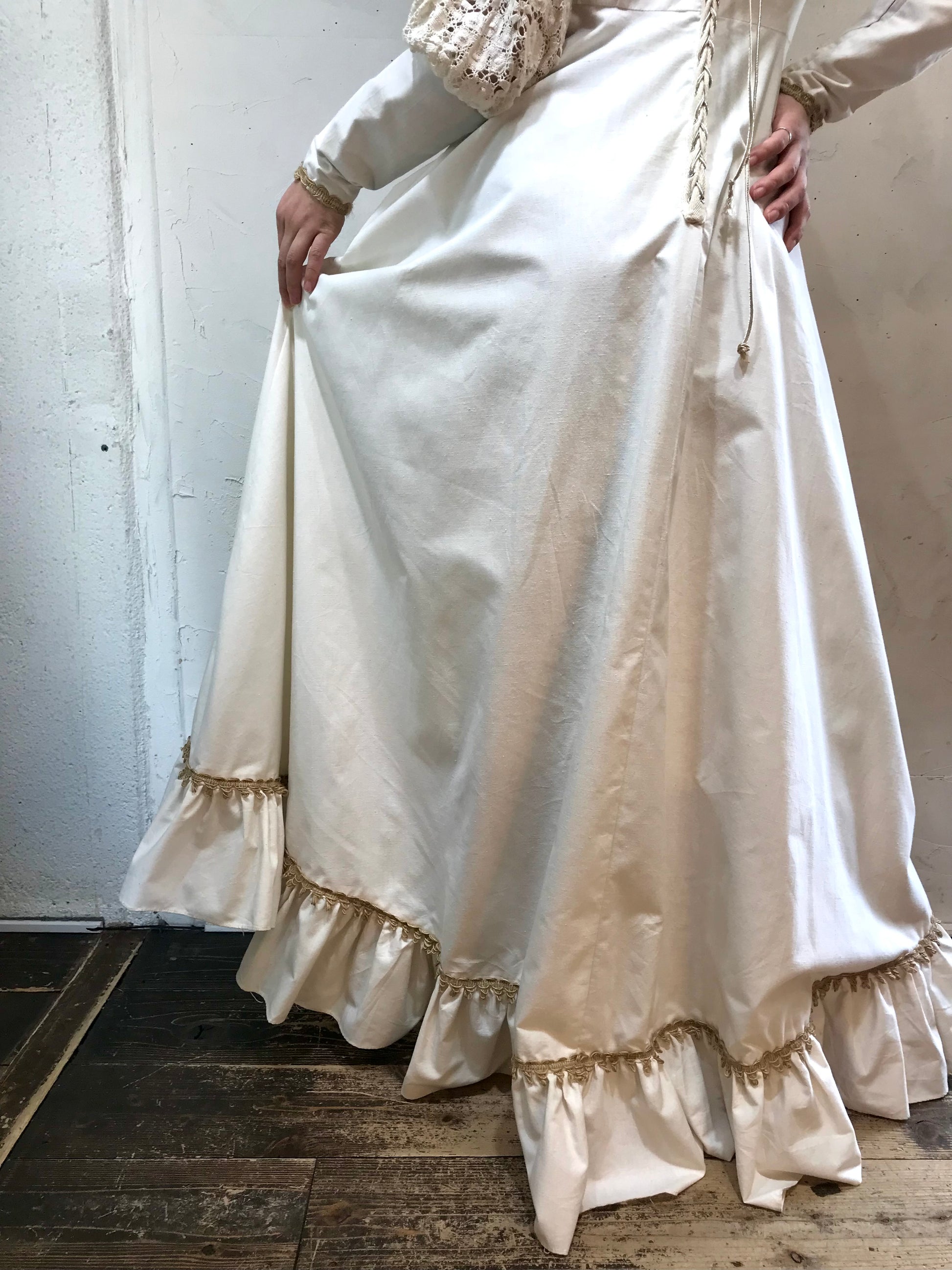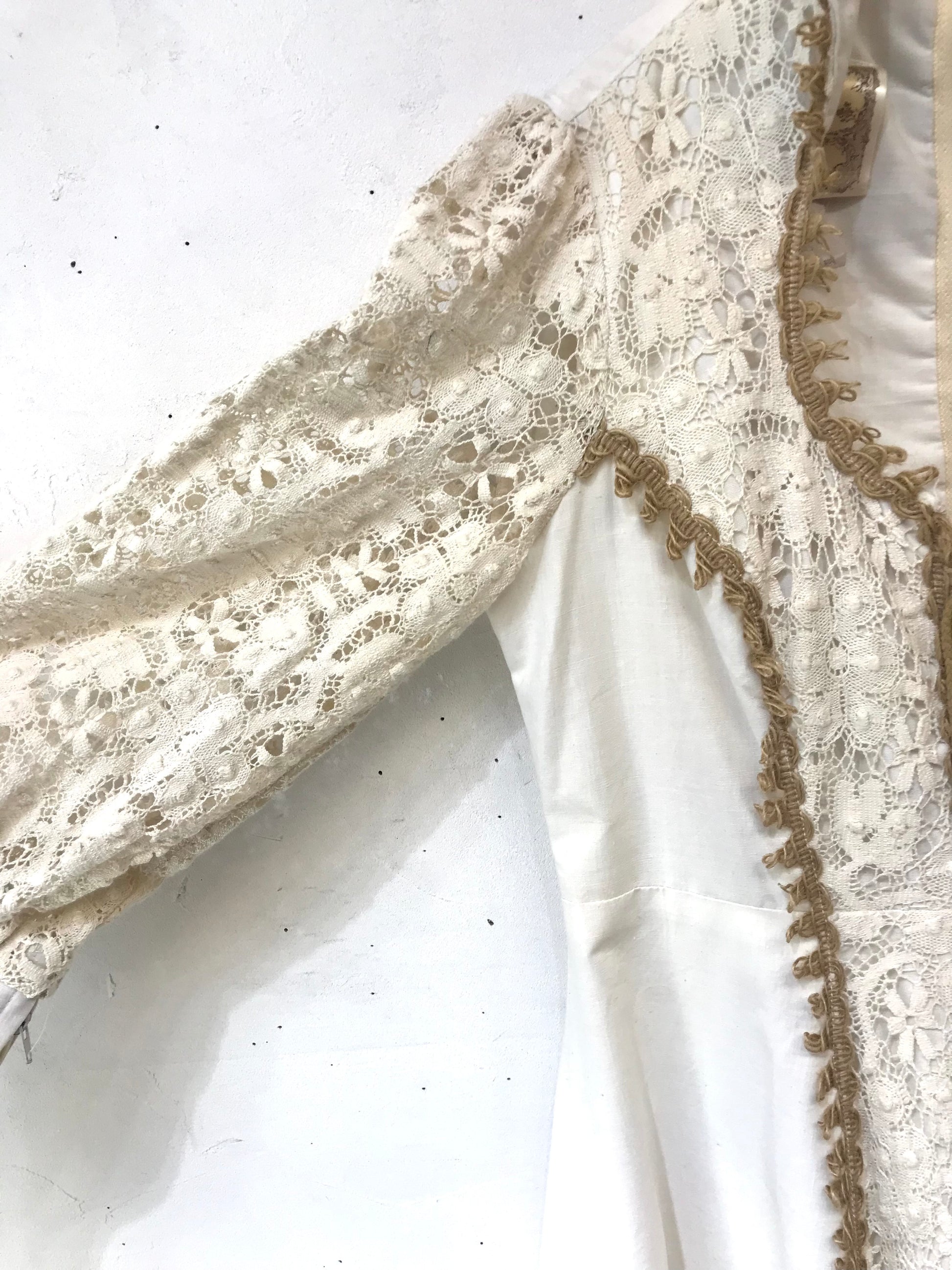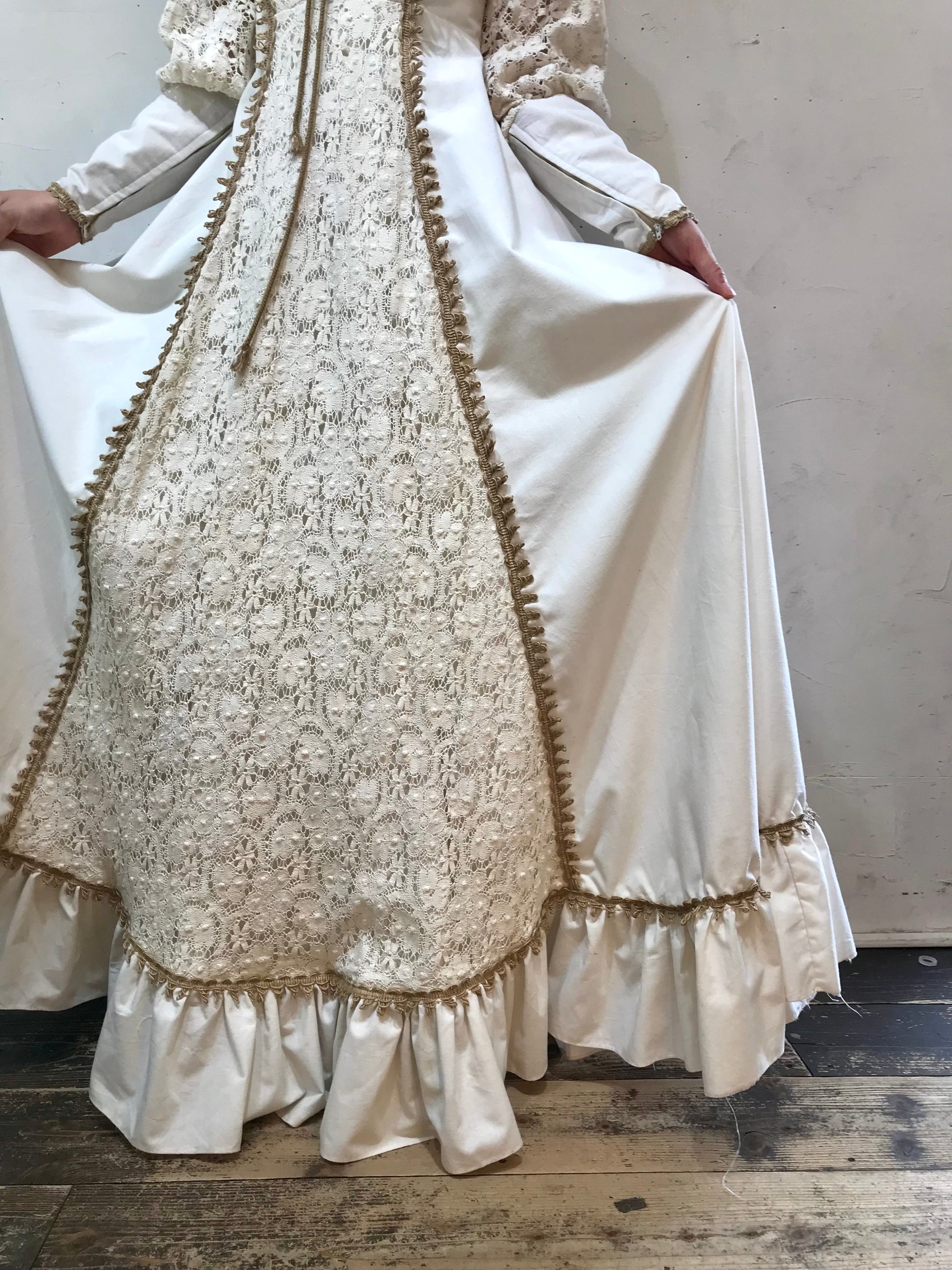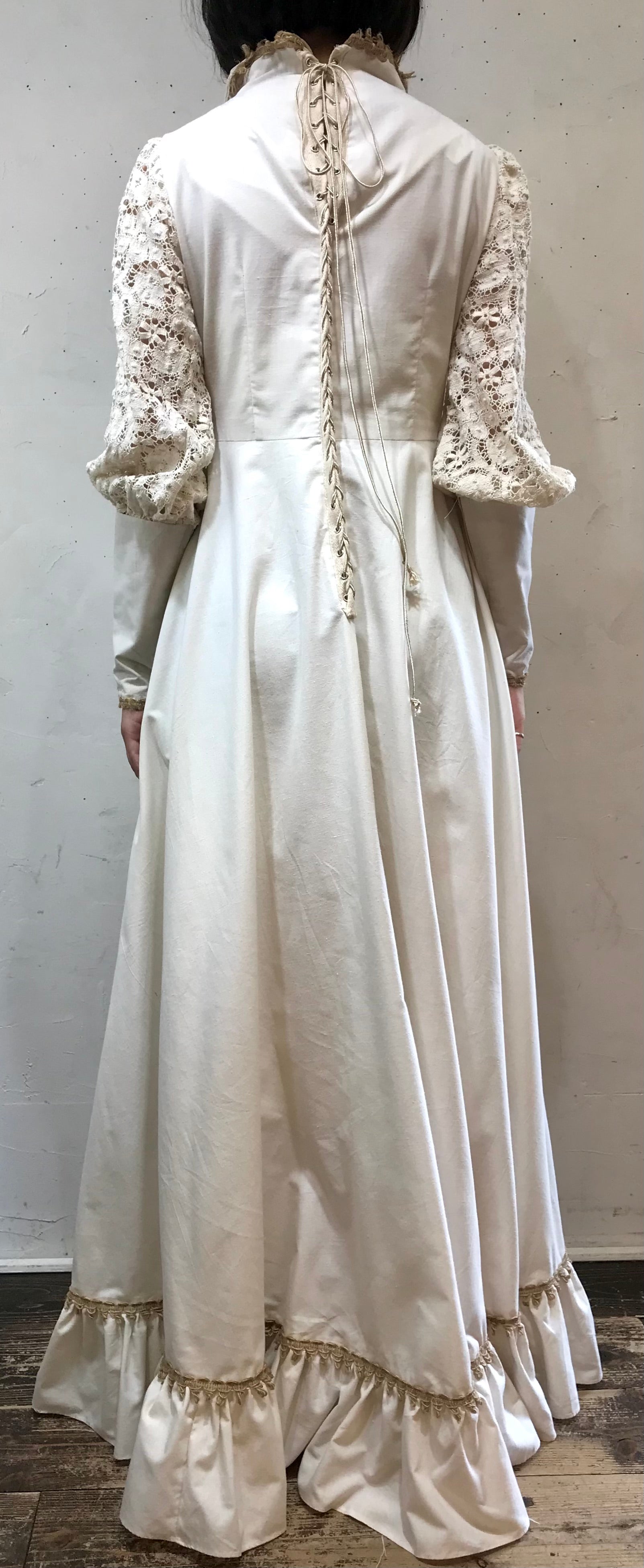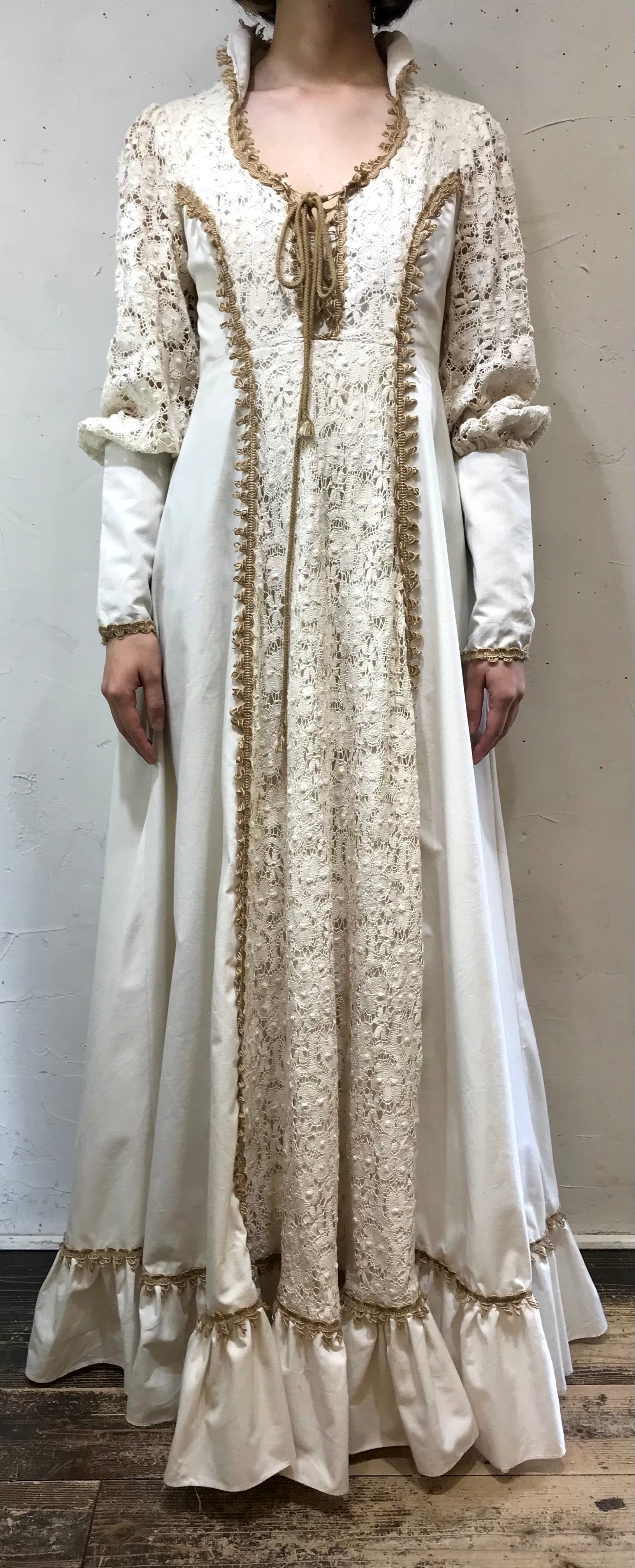 ロングカフスや、繊細なレースがたっぷり使われた贅沢で重厚感ある雰囲気のビンテージならではな1着。