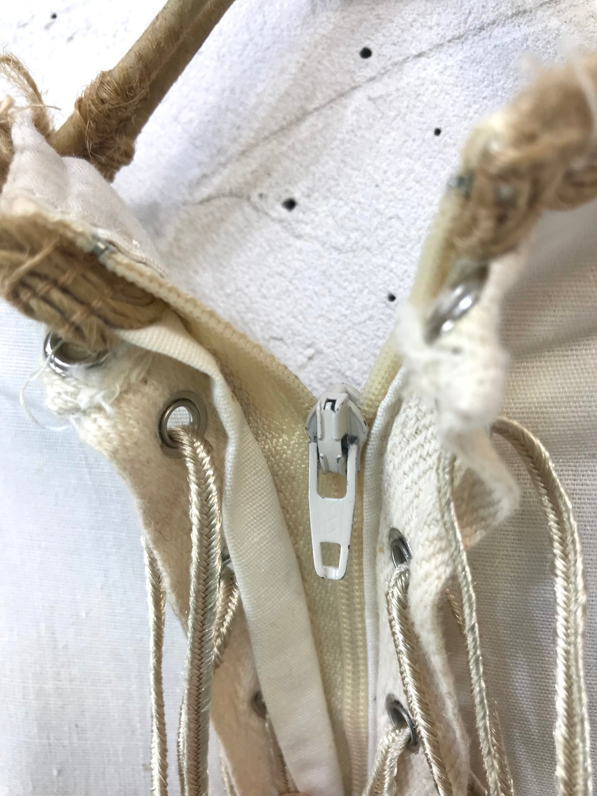 コンディション:タグに書き込み、右肩に黒い糸の混じっている所、所々にシミや汚れ、バックに色移りがございますが、ビンテージにご理解いただいている方でしたら気にせずご着用頂ける程度と思います。