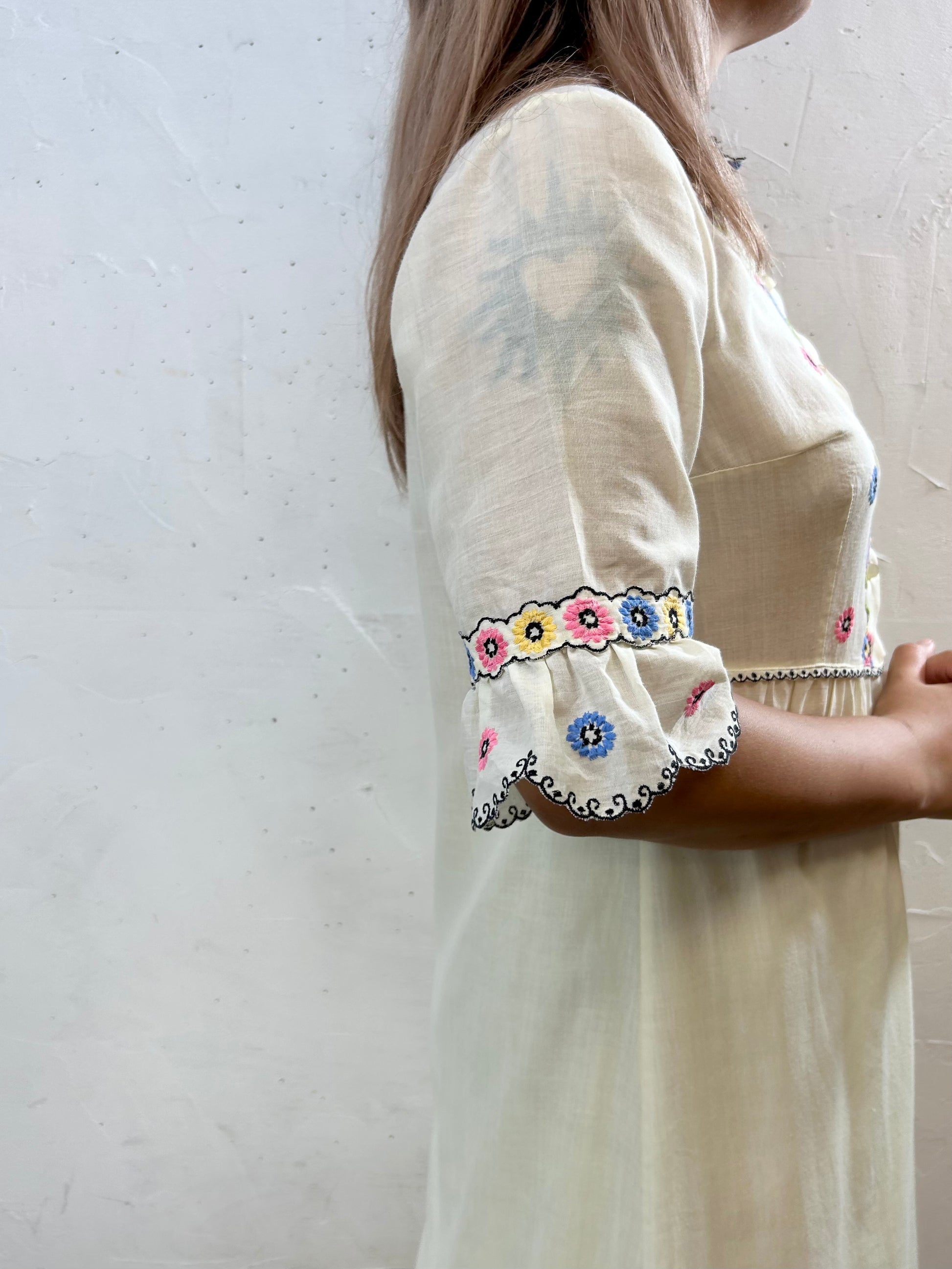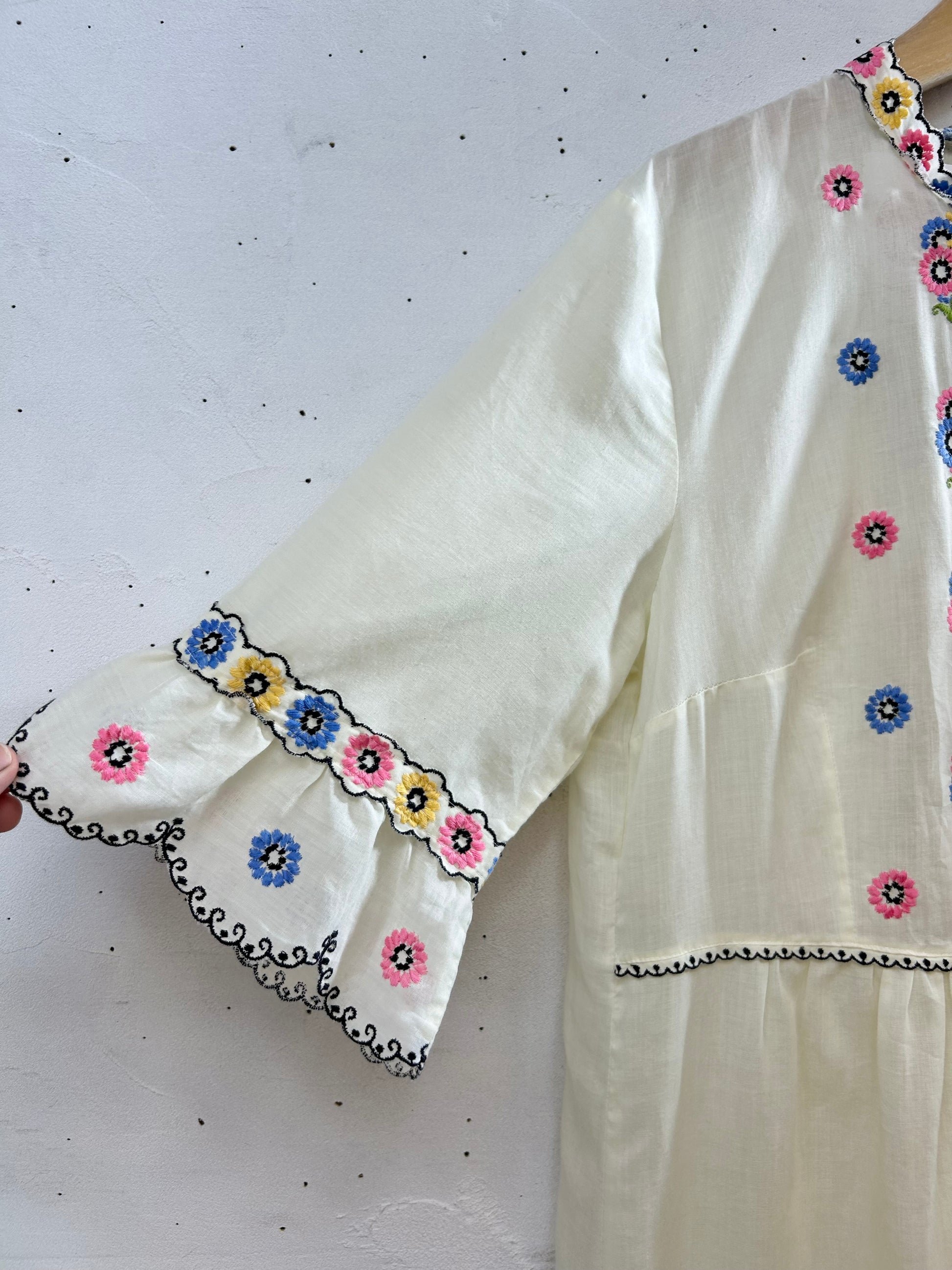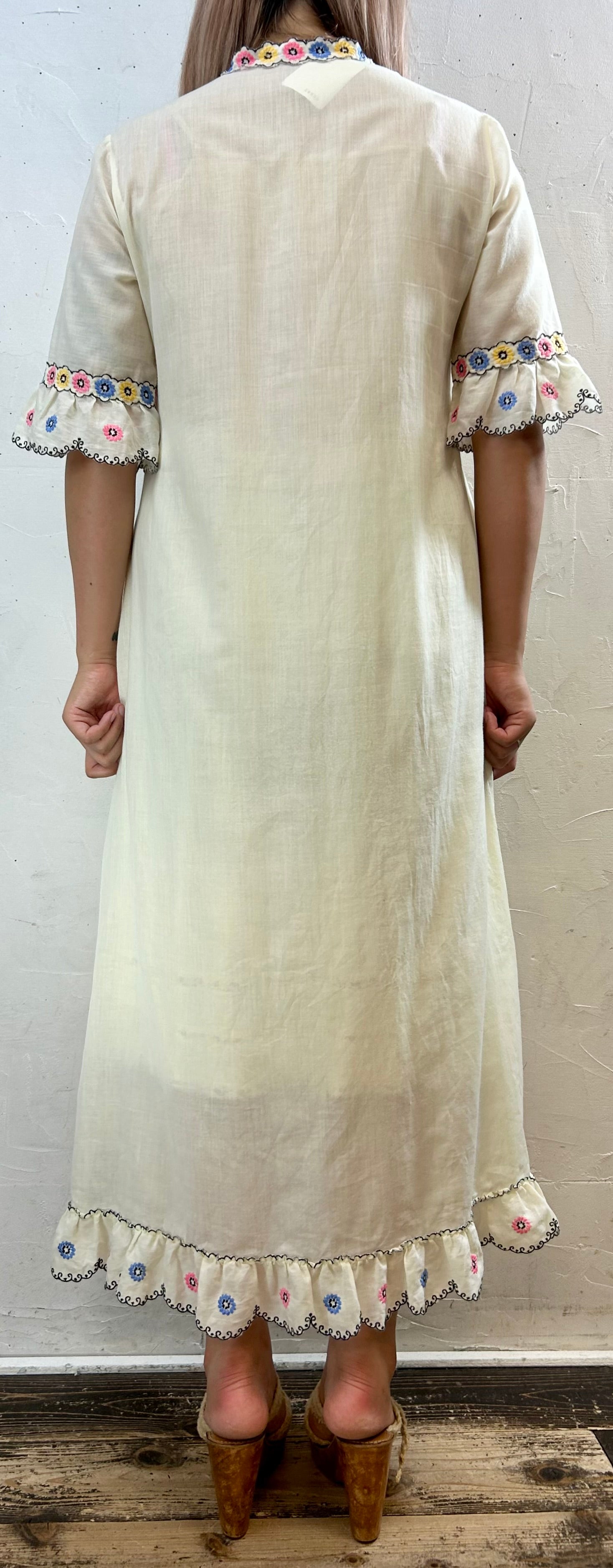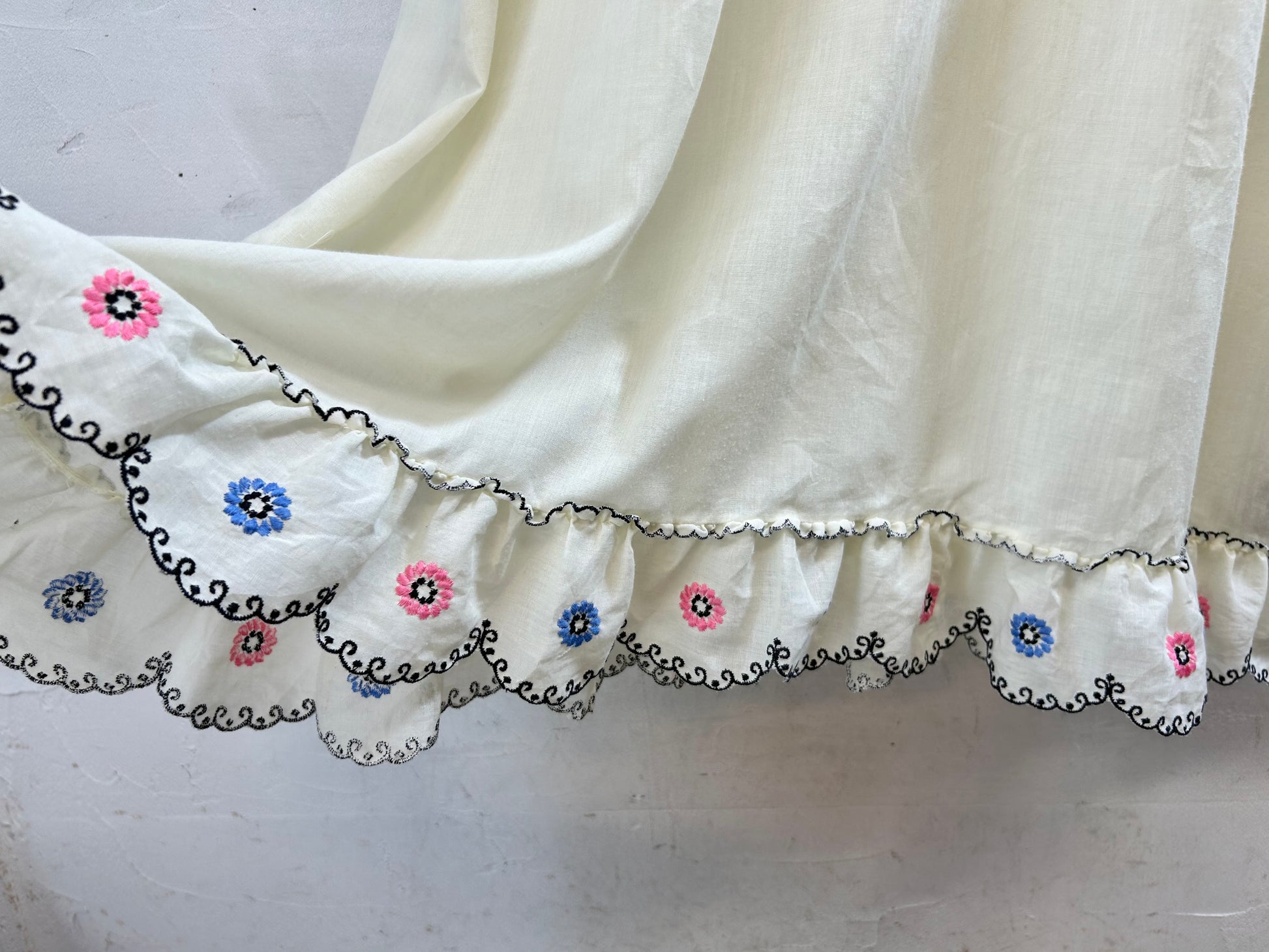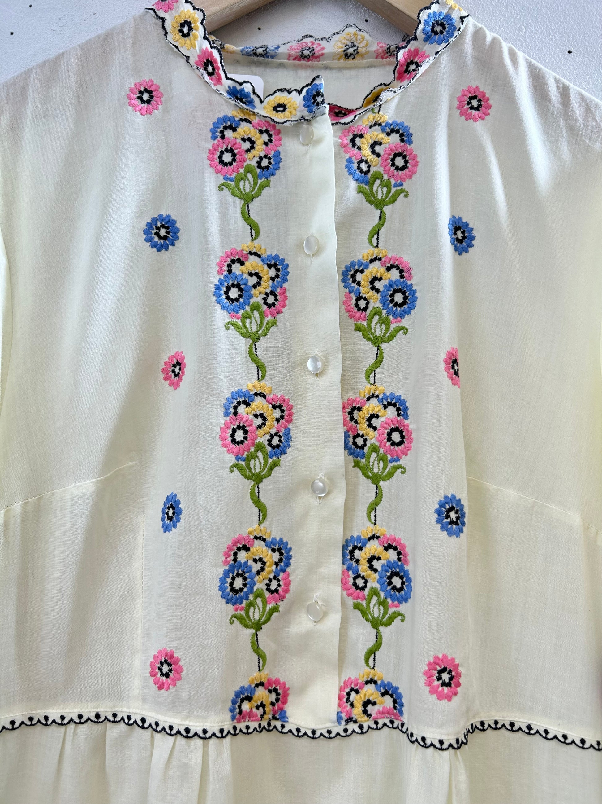 クリームボディに絶妙な色合いのフラワー刺繍がたっぷりと施されたとても可愛らしい1着。