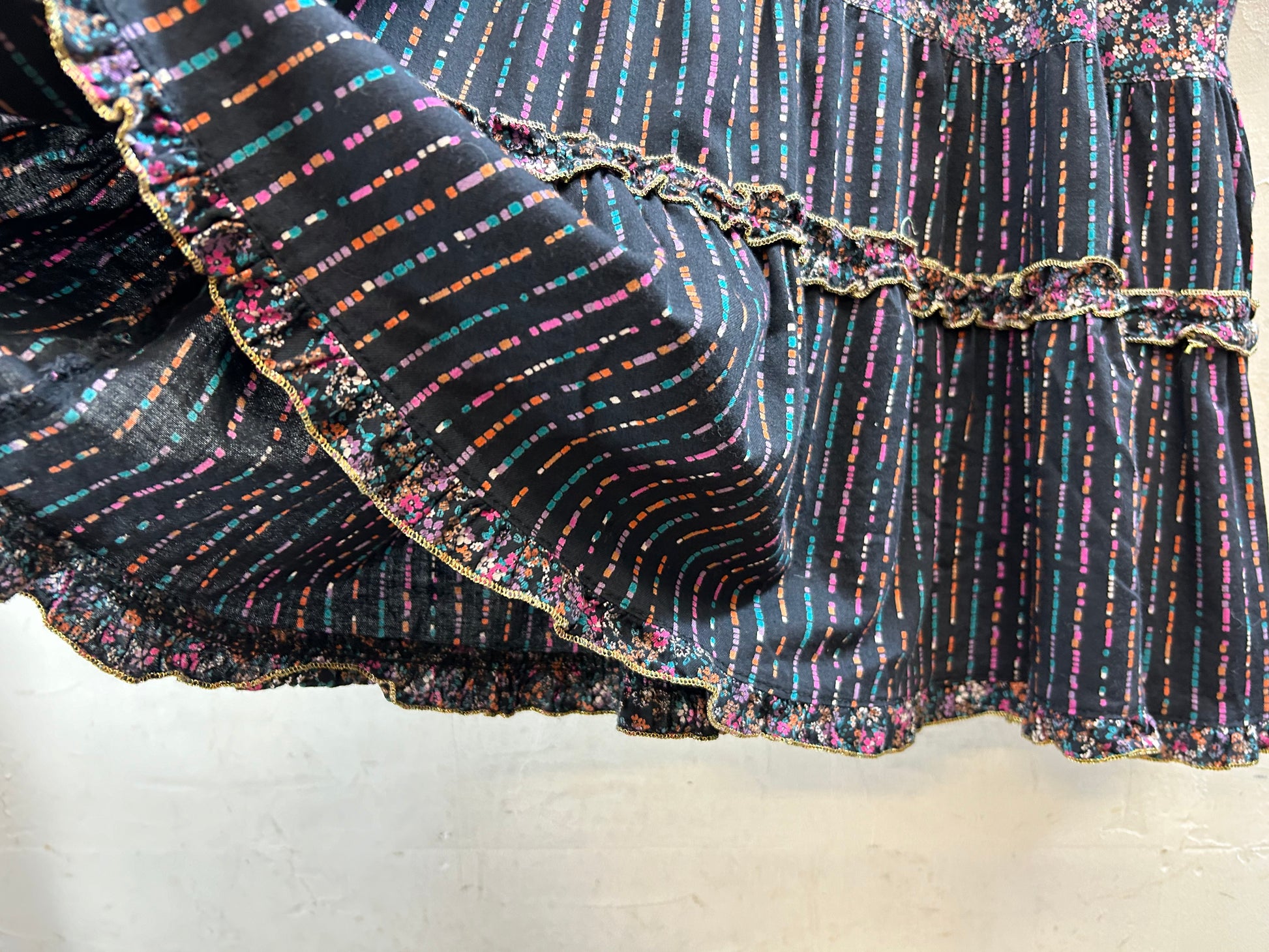 ゴールドの糸やボタンがアクセントになり、裾はティアードでボリュームのありシルエットもとても可愛いです。