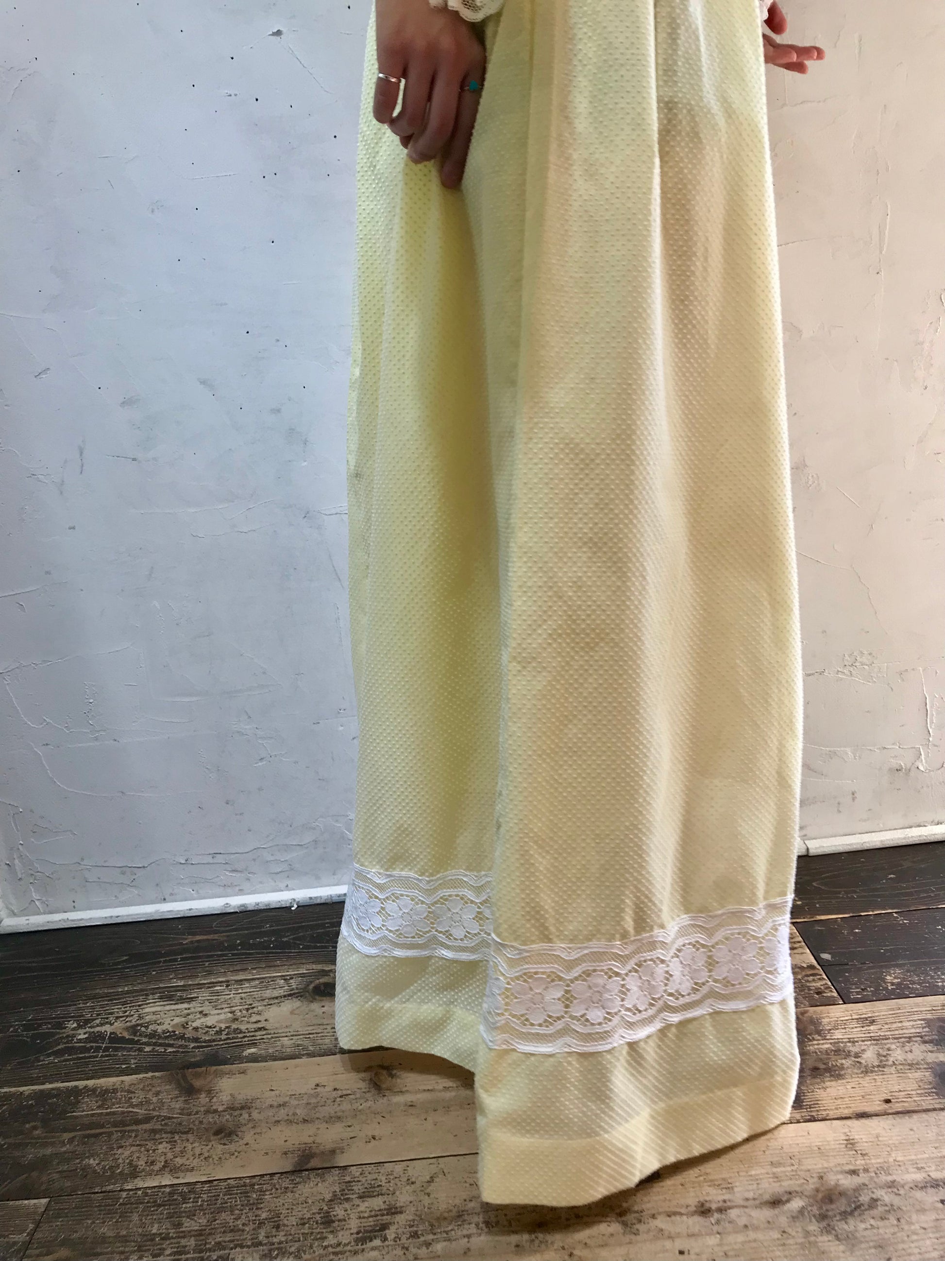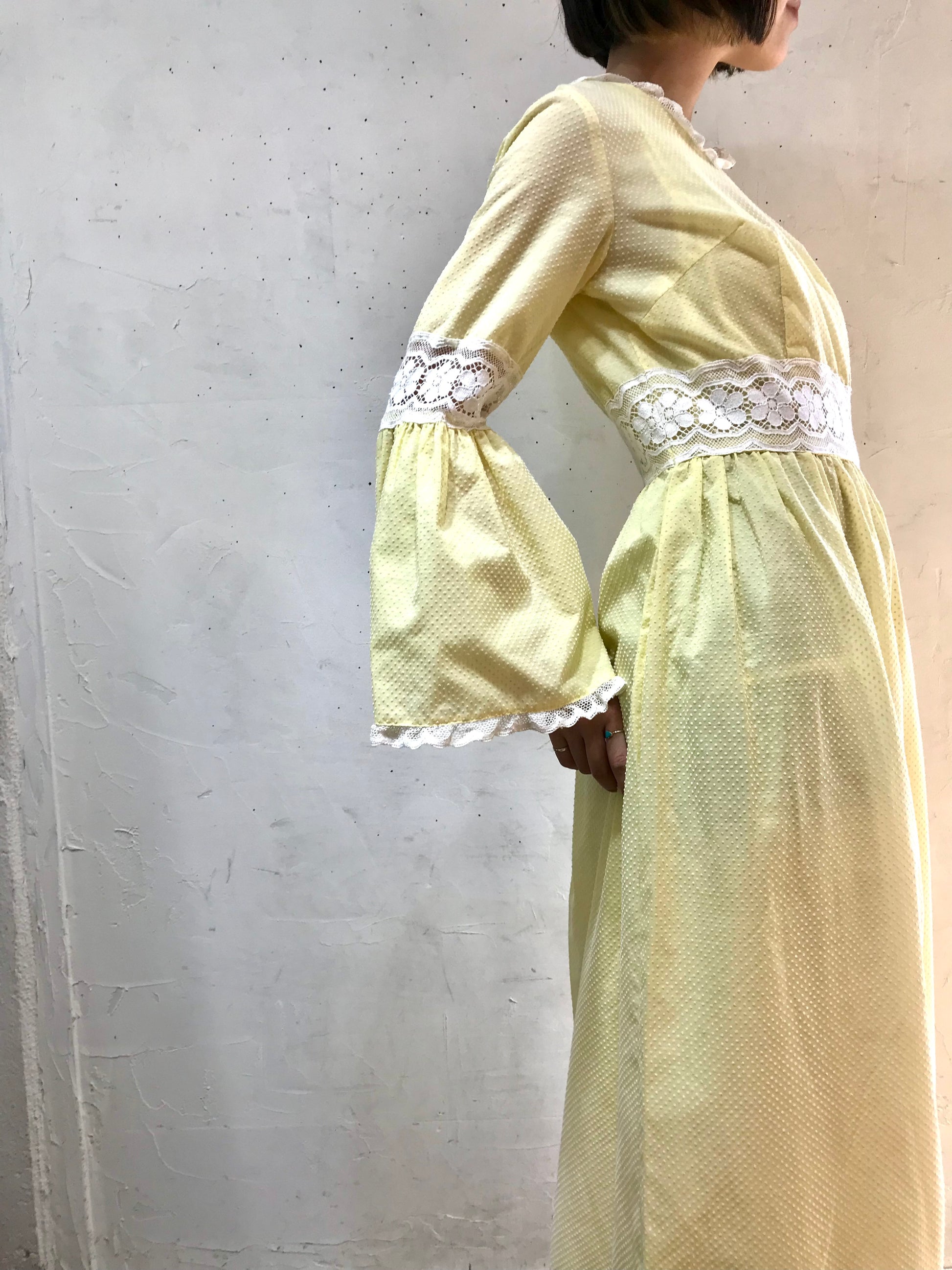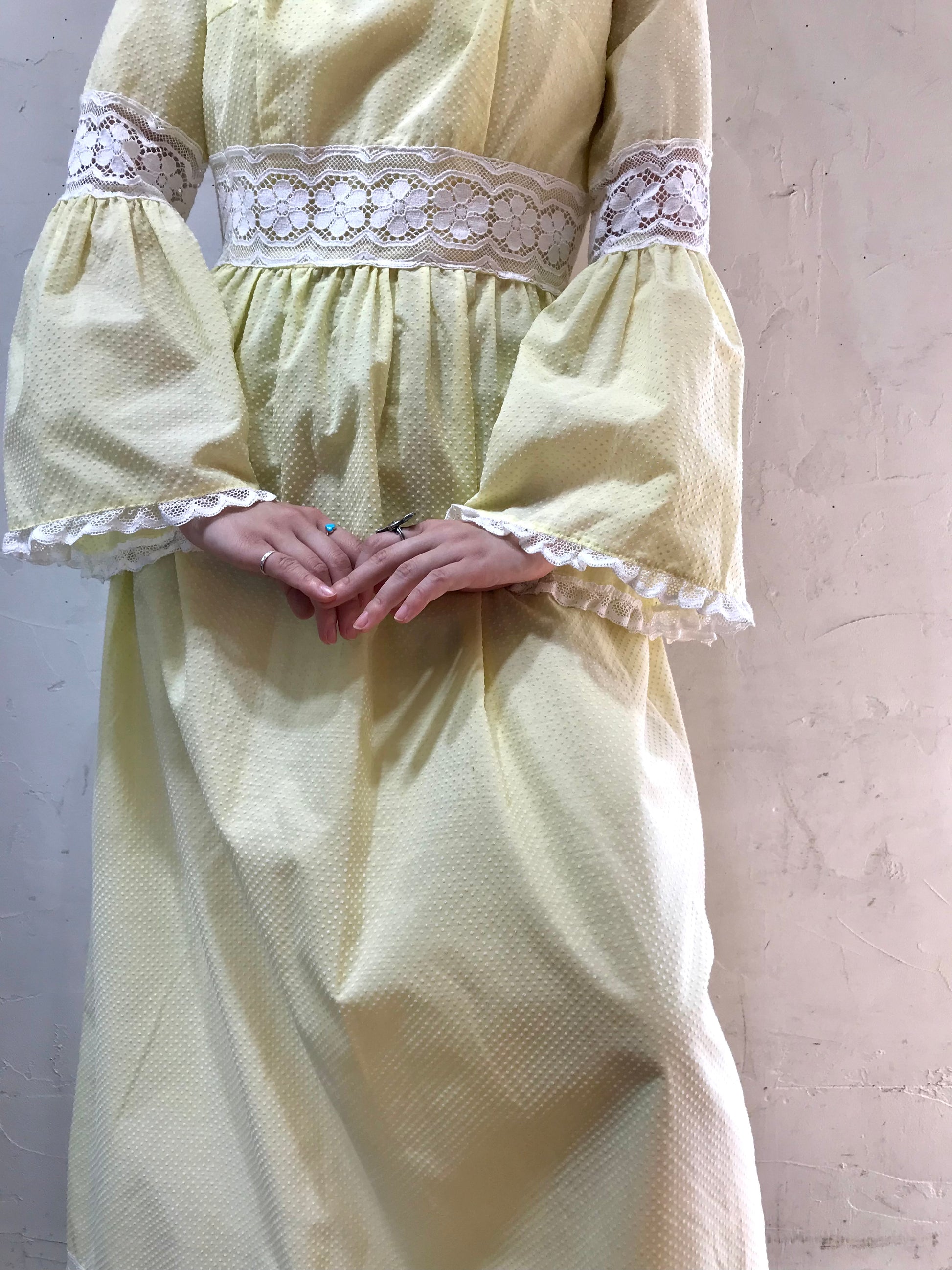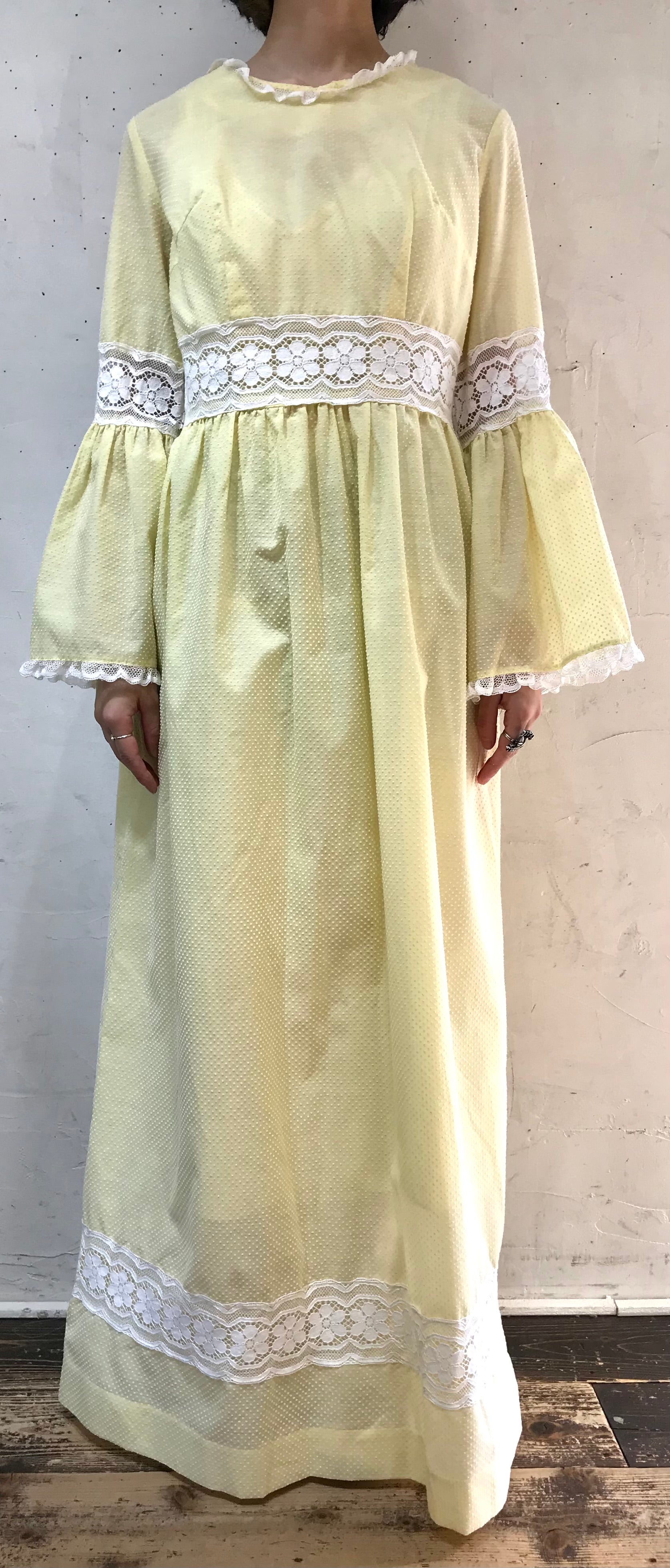 ふんわりと広がるフレアスリーブが可愛らしく、ハイウエスト切り替えのマキシ丈でまさに70年代らしいデザインで一際存在感を放ちます。