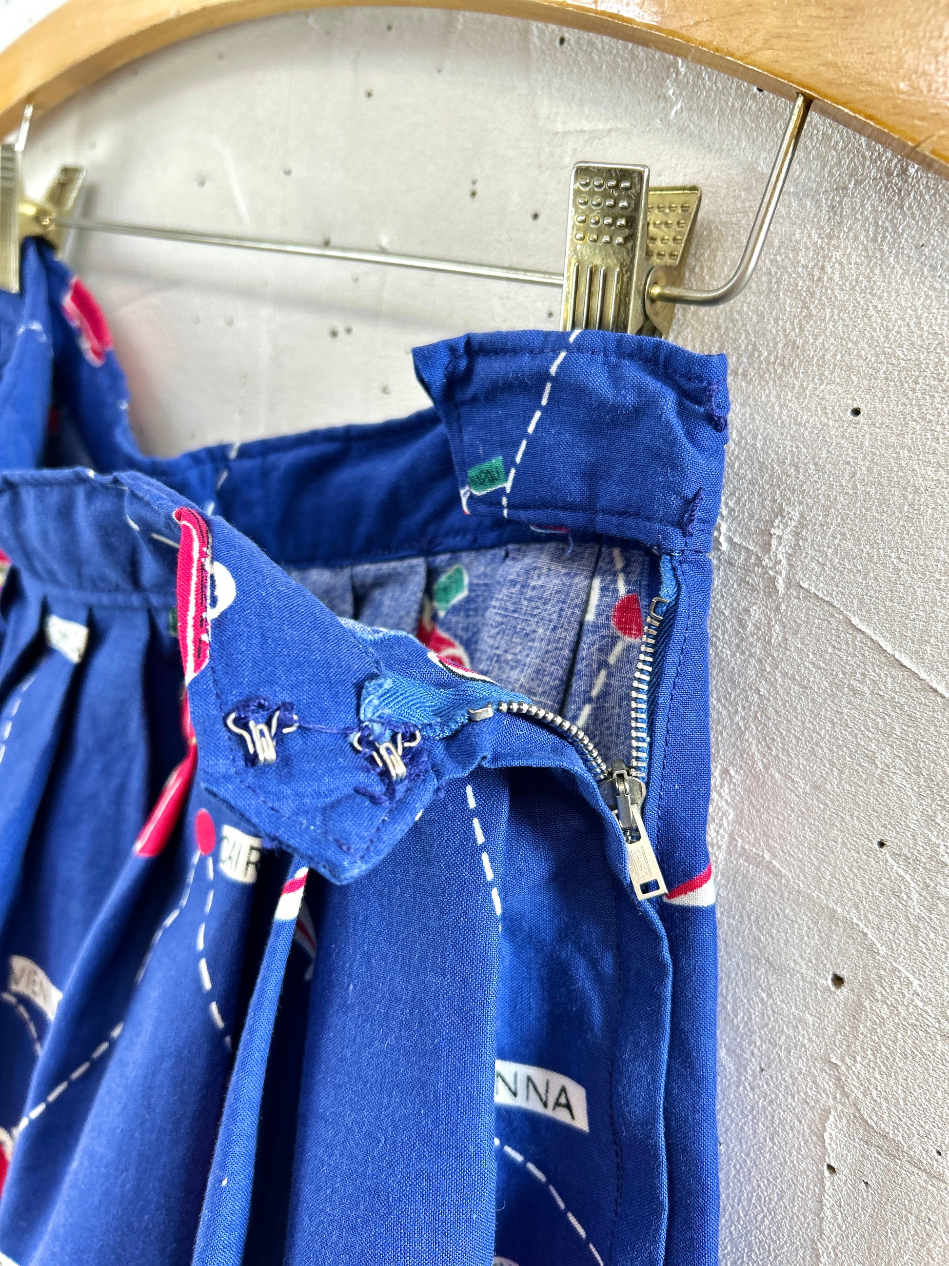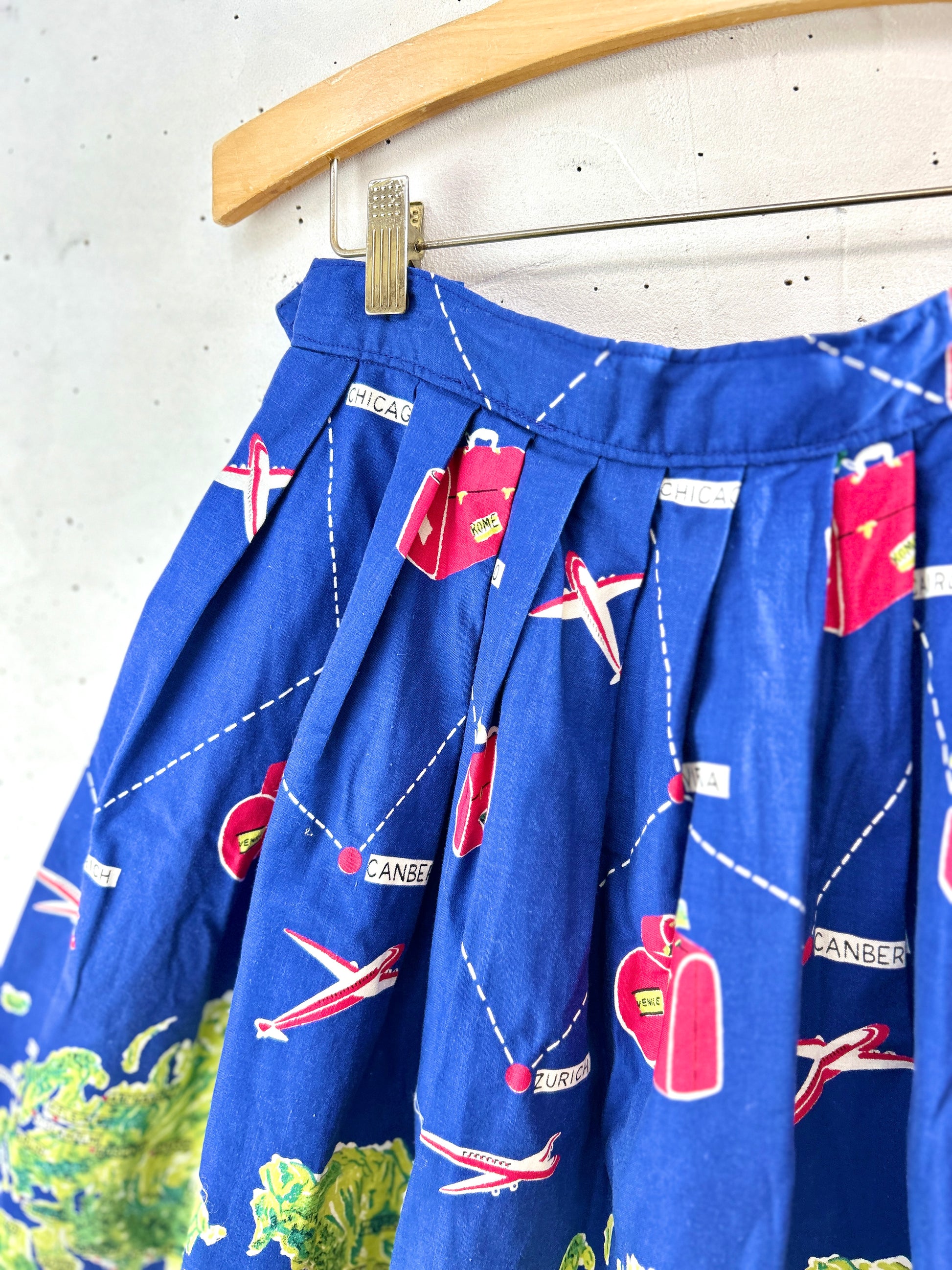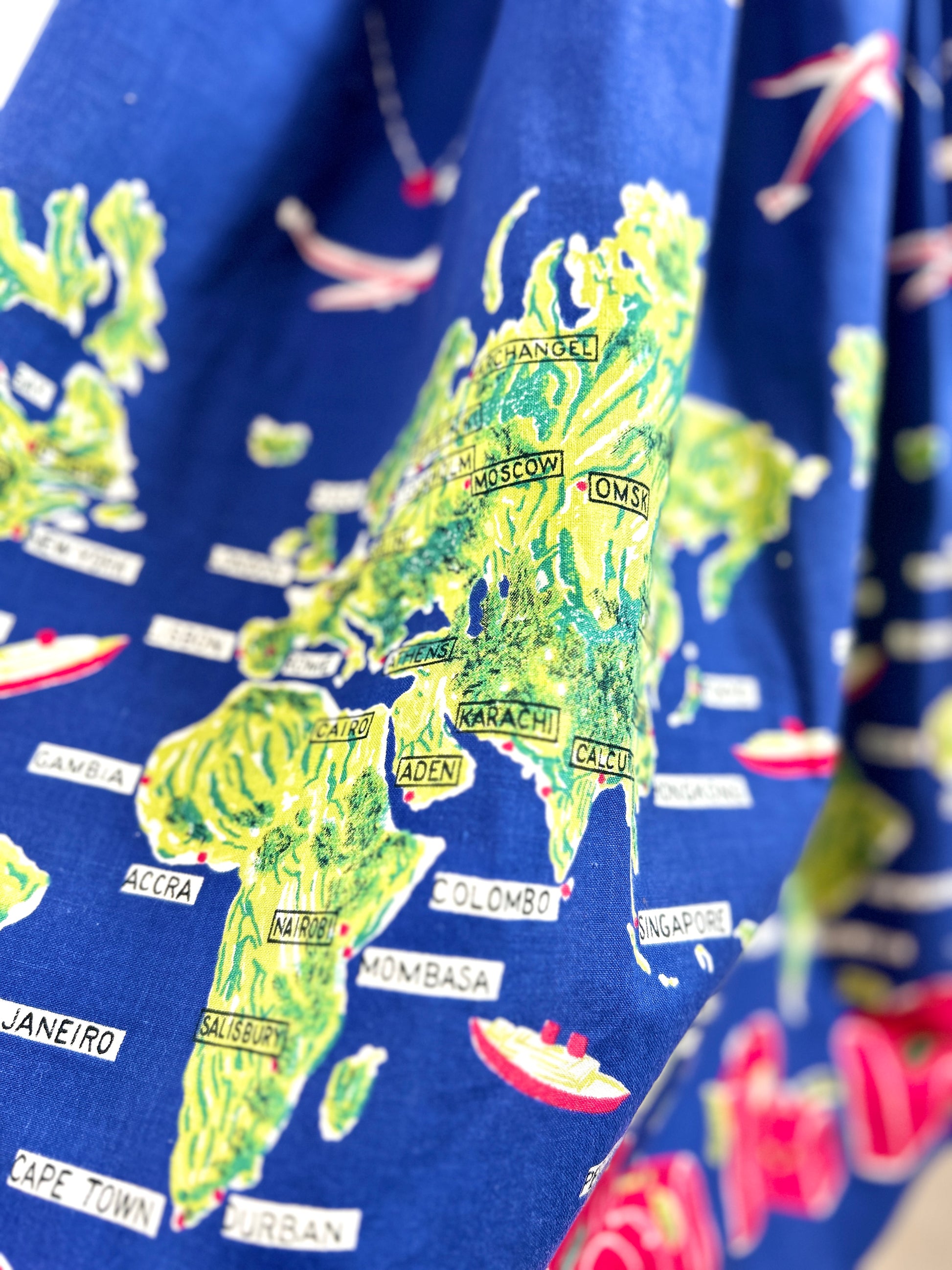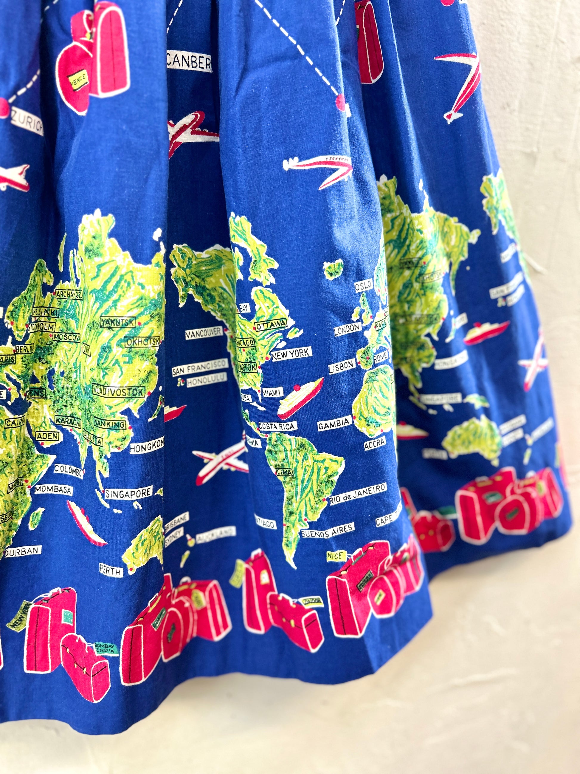 深みのあるブルーカラーをベースに、トラベルマップや飛行機、船、旅行鞄などを描いたプリントがビンテージらしい1着。