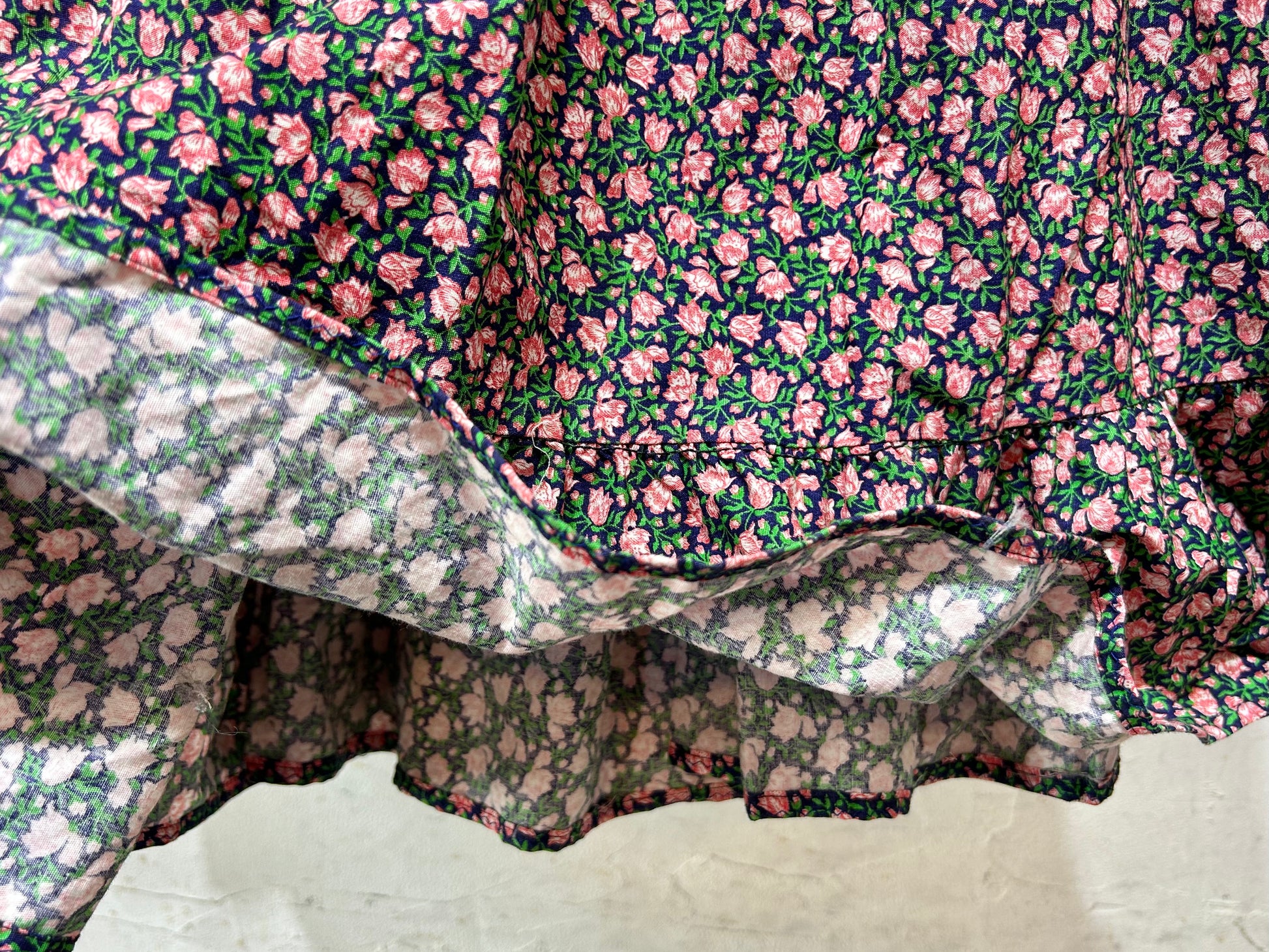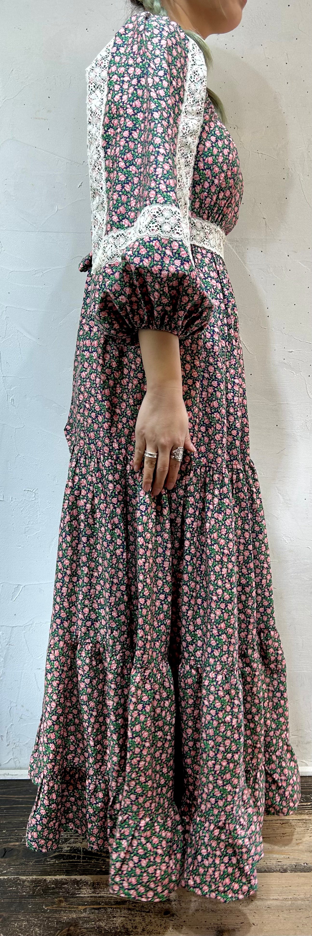 生地を贅沢に使用したティアードデザインに、袖のレースも可愛らしく、細部まで高いこだわりが感じられます。