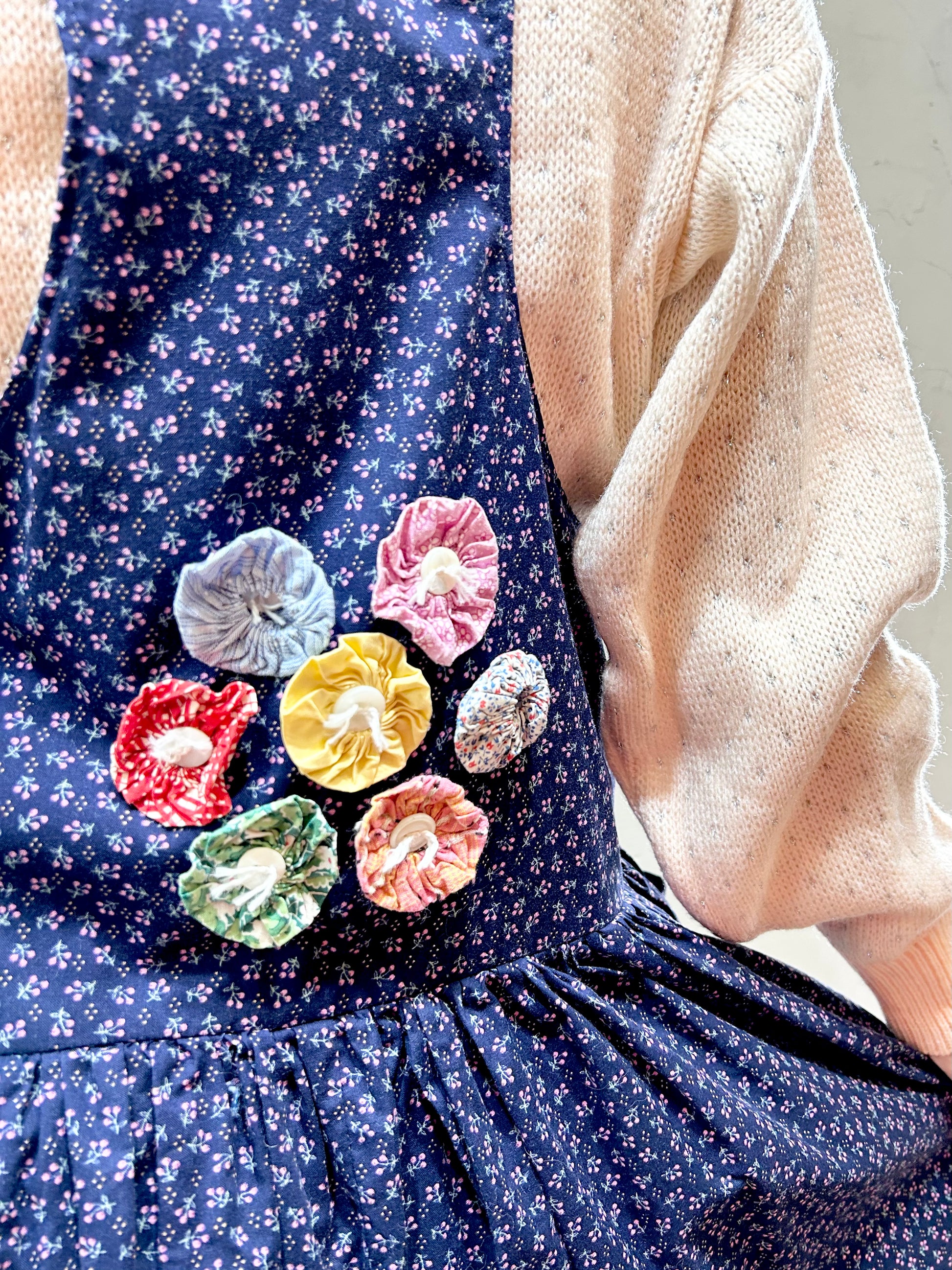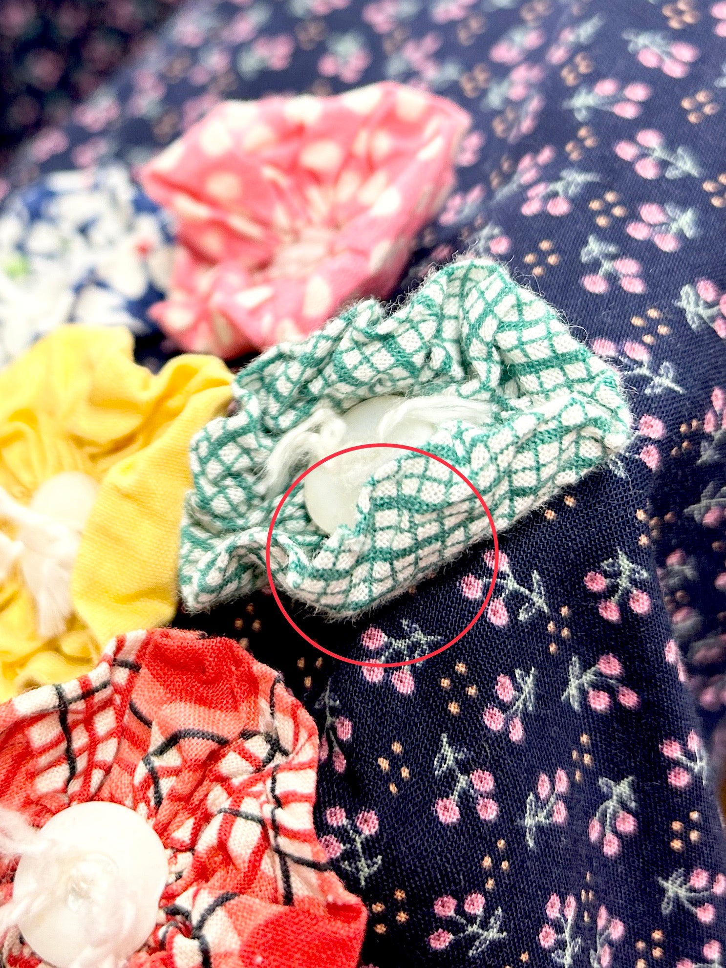 小花柄のボディにヨーヨーキルトがフラワーのようについたとてもキュートなアイテム。