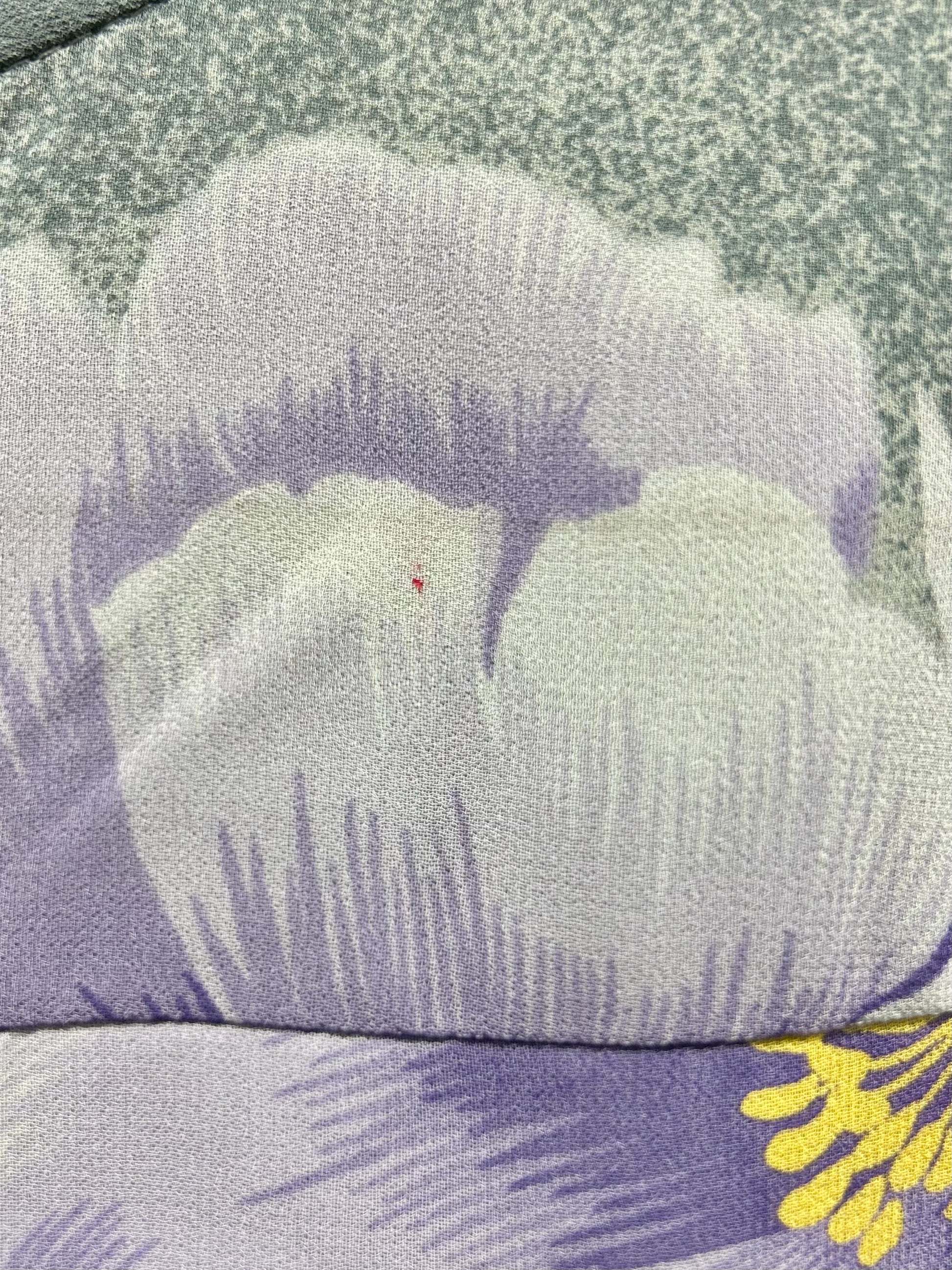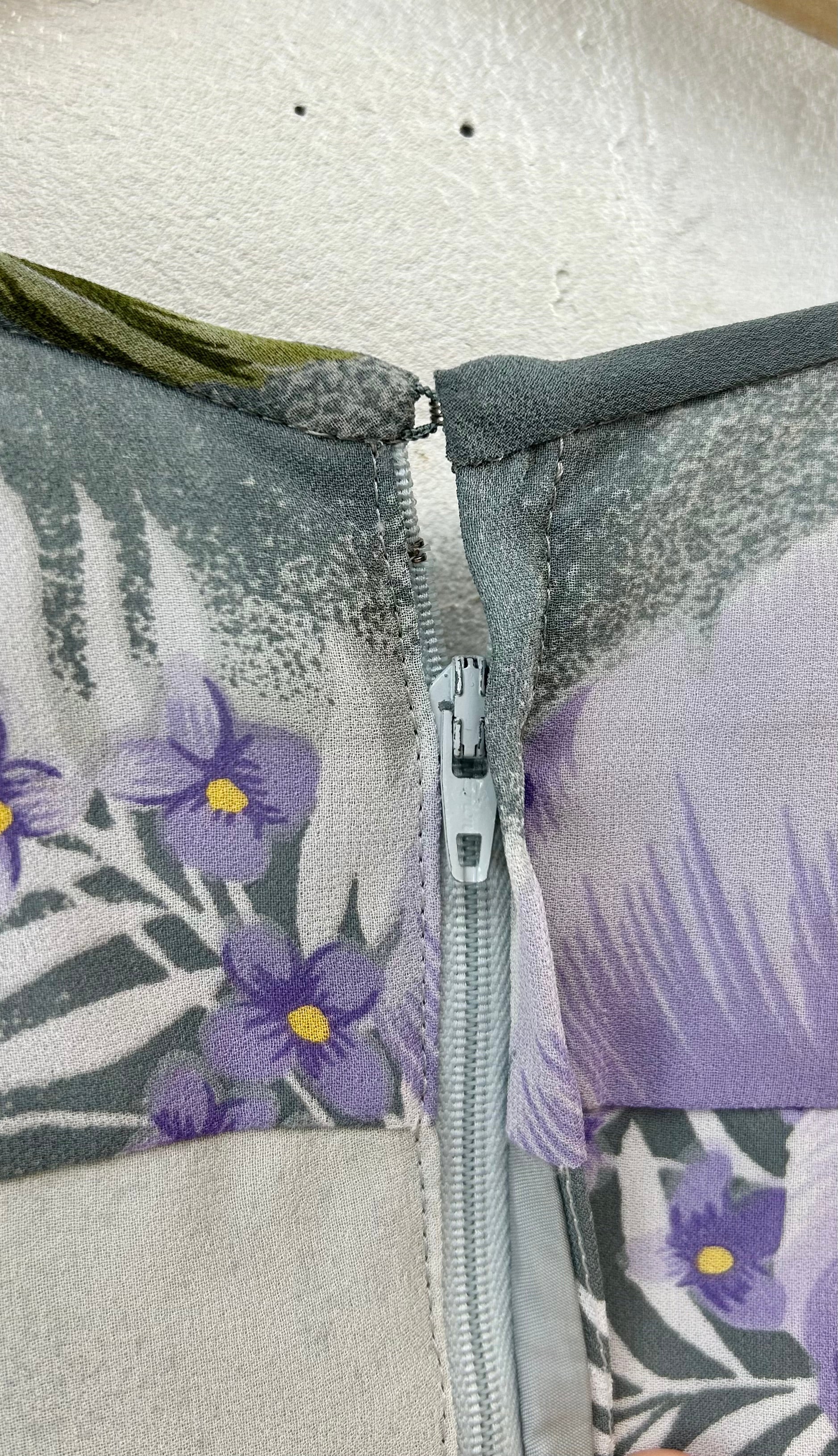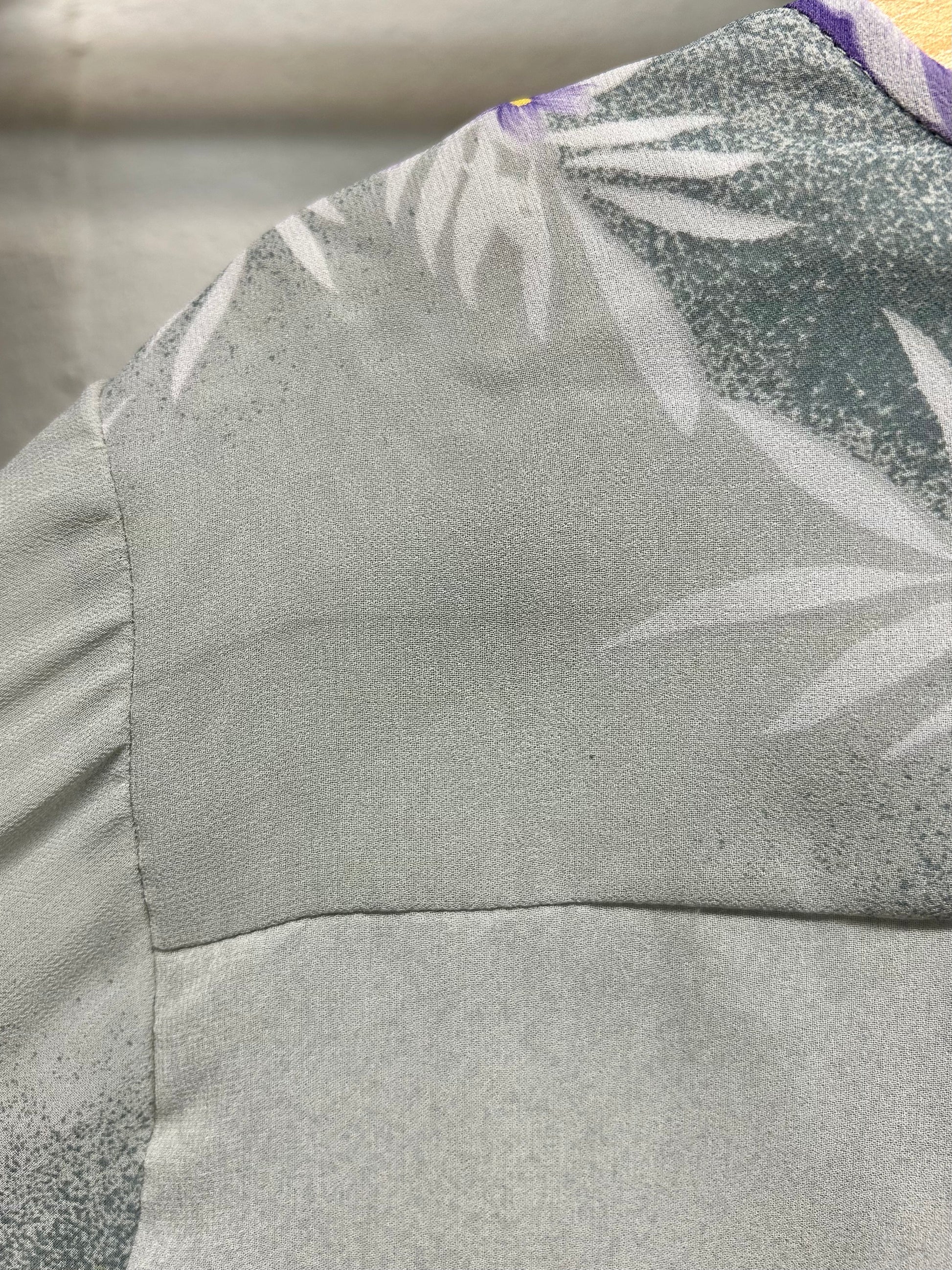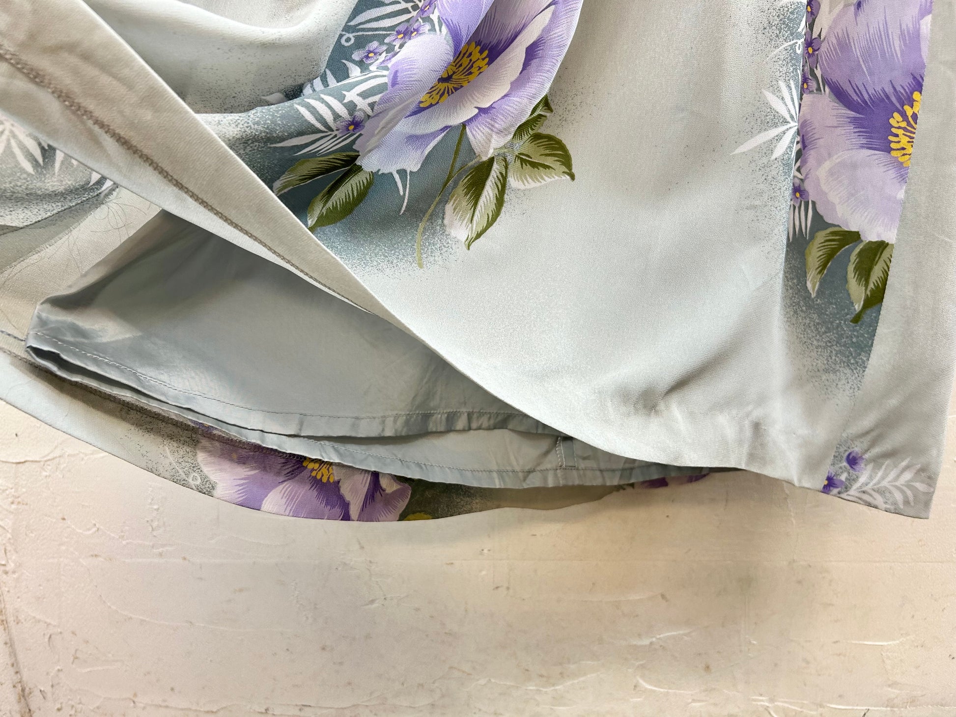 グレーボディに大ぶりなパープルのフラワーが映え美しい1着。