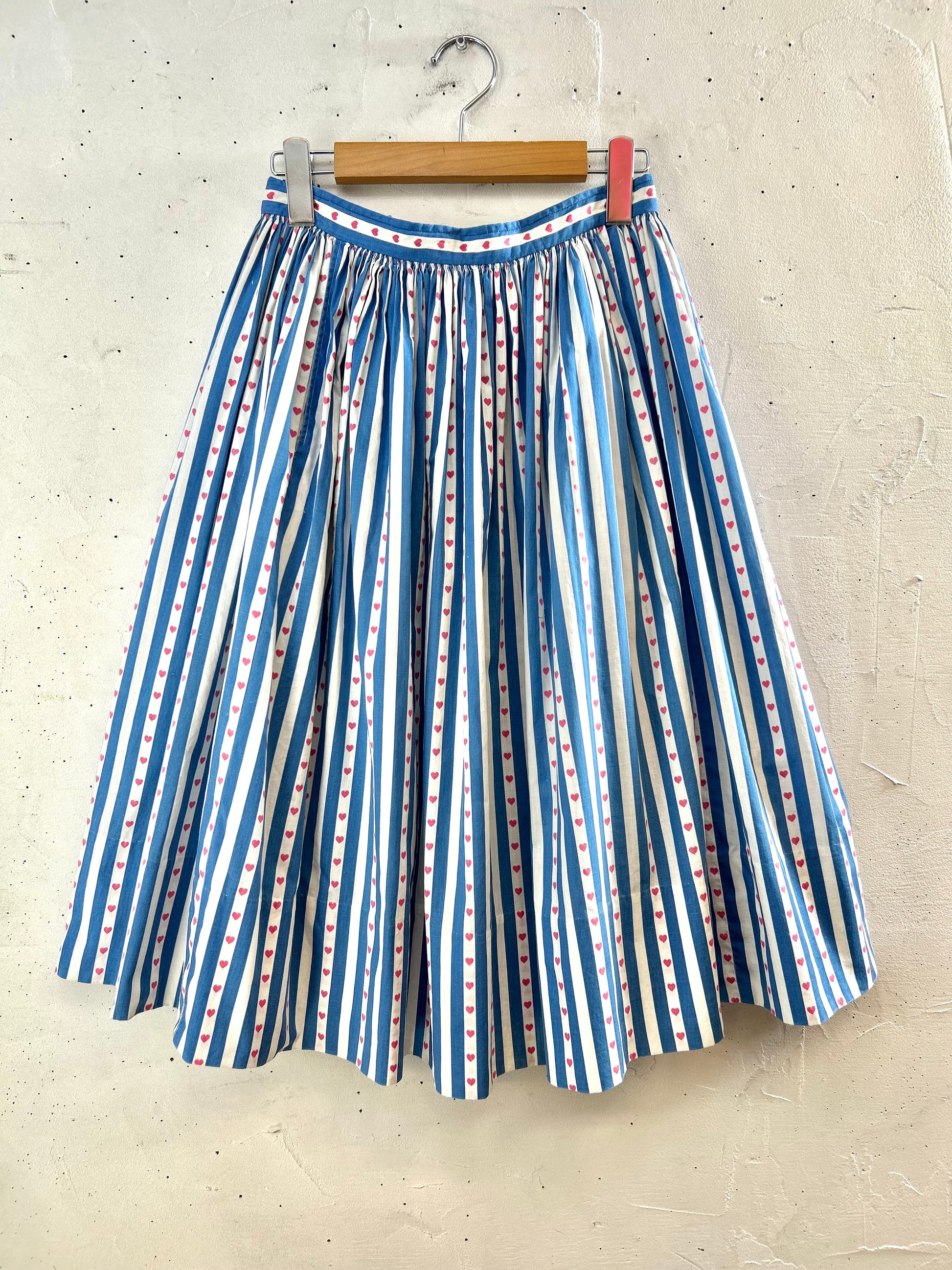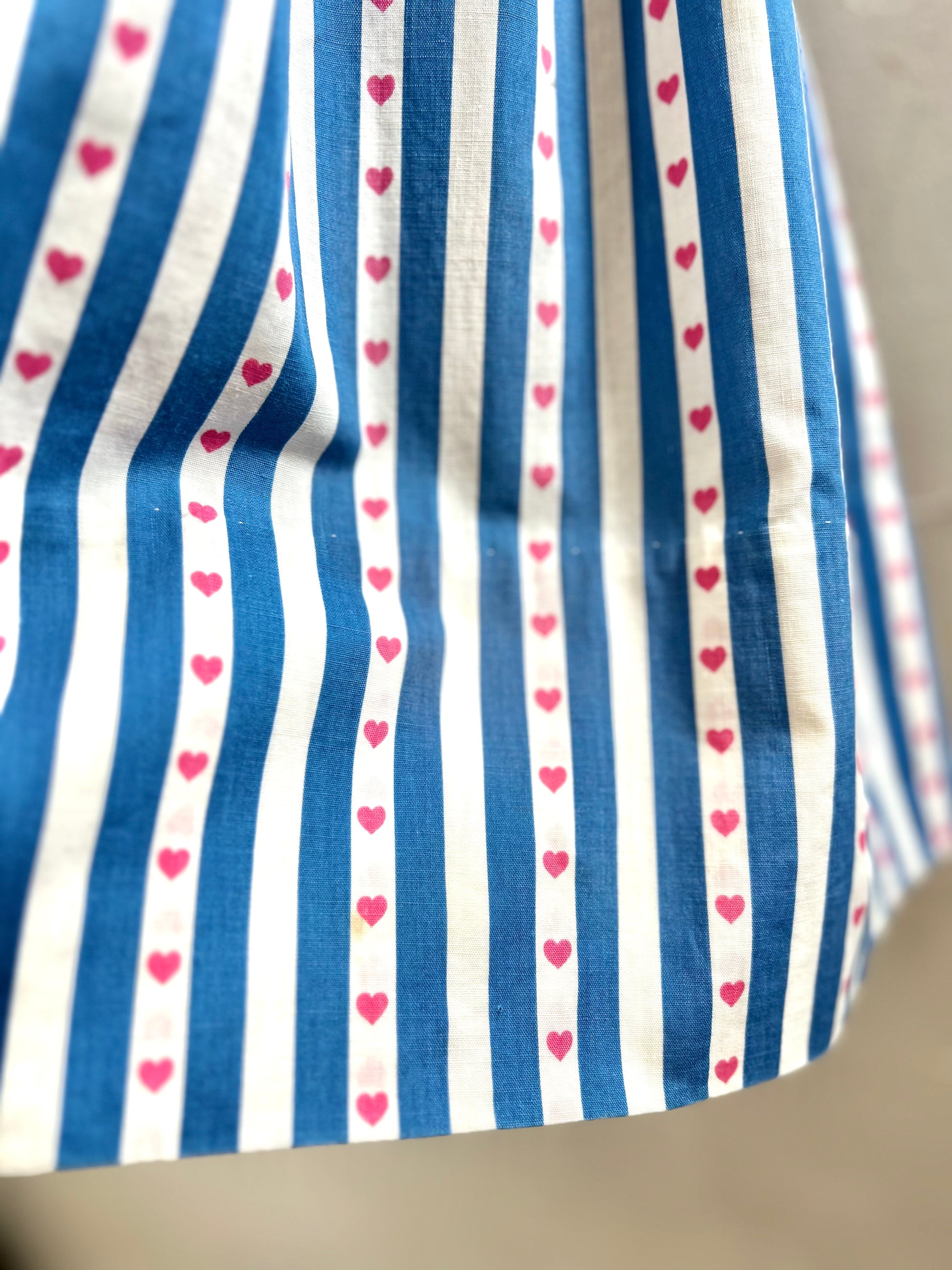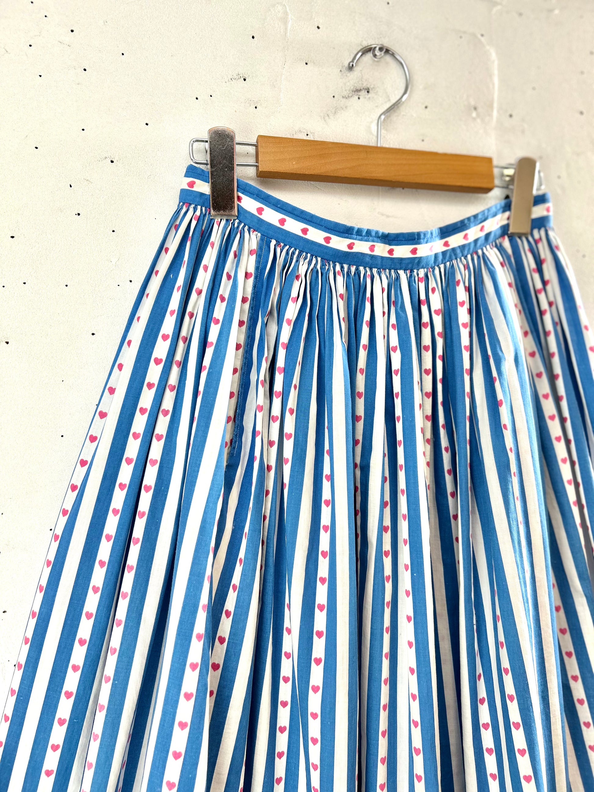 ブルー&ホワイトのストライプに、ハート柄が可愛く、時代を反映したポップな雰囲気が可愛らしい1着。