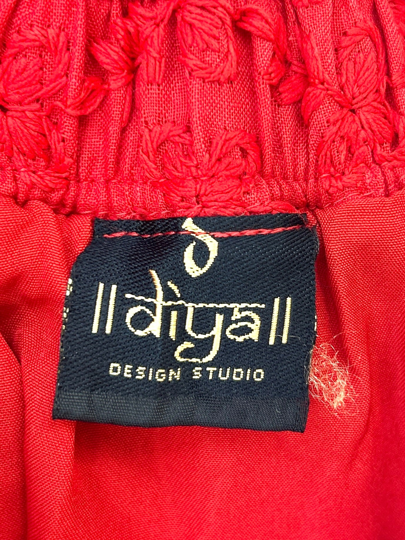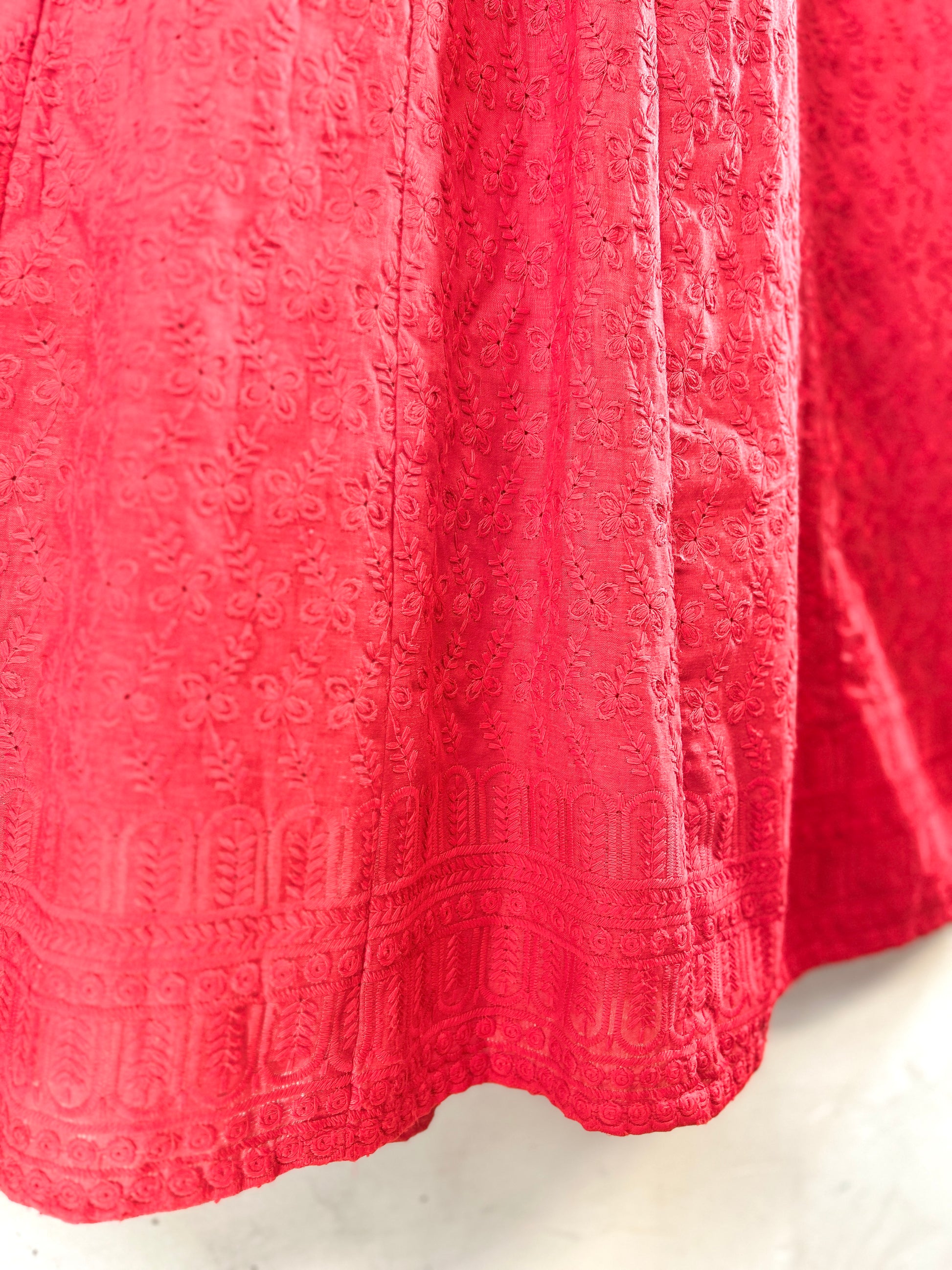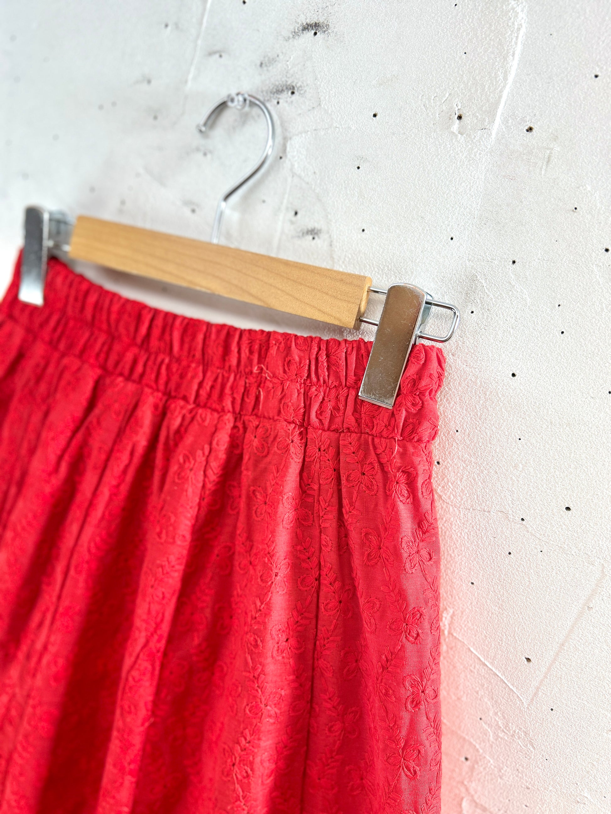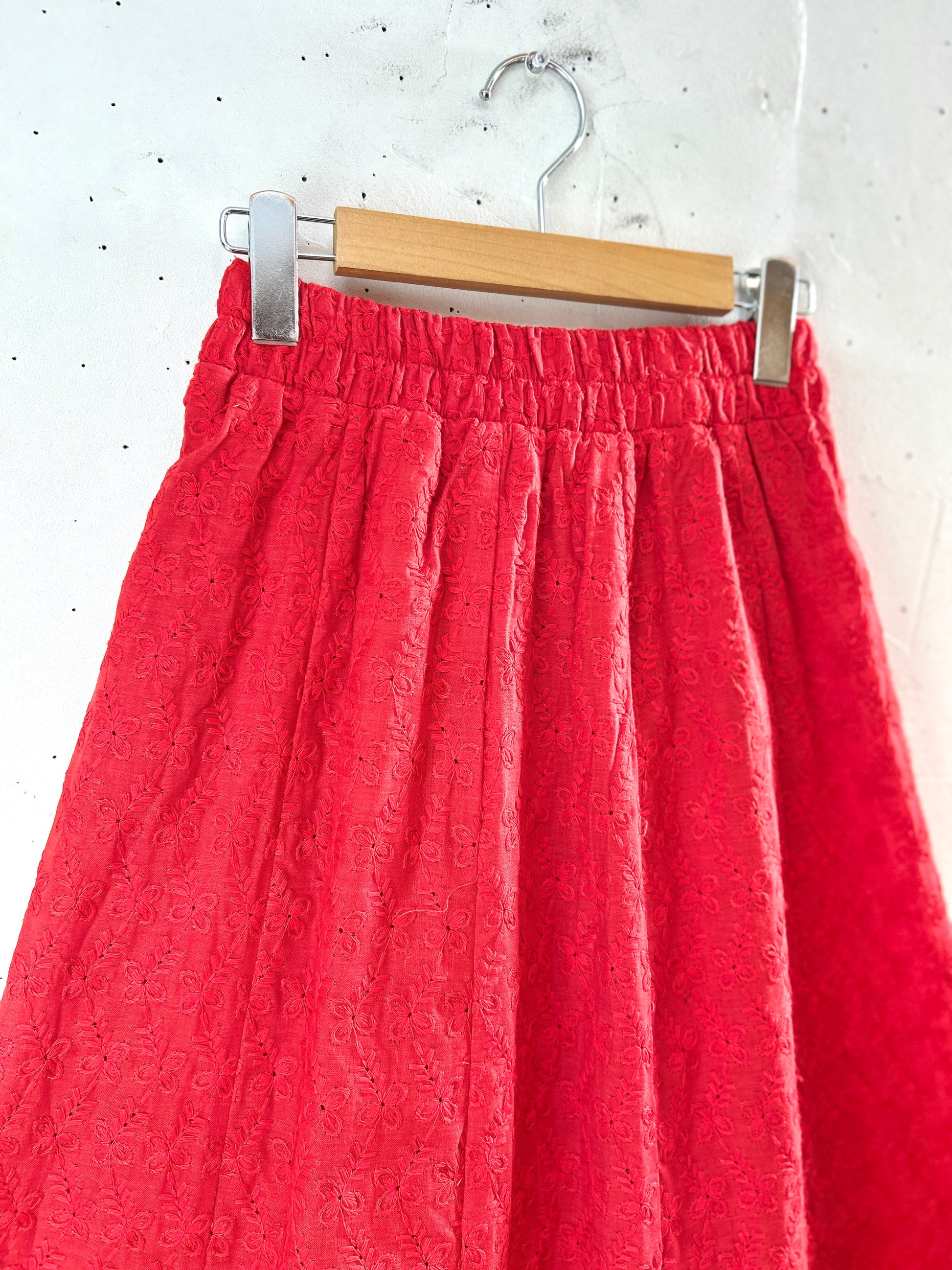 あまり見かけることのない真っ赤なロングスカートがとても雰囲気があり可愛い一着。