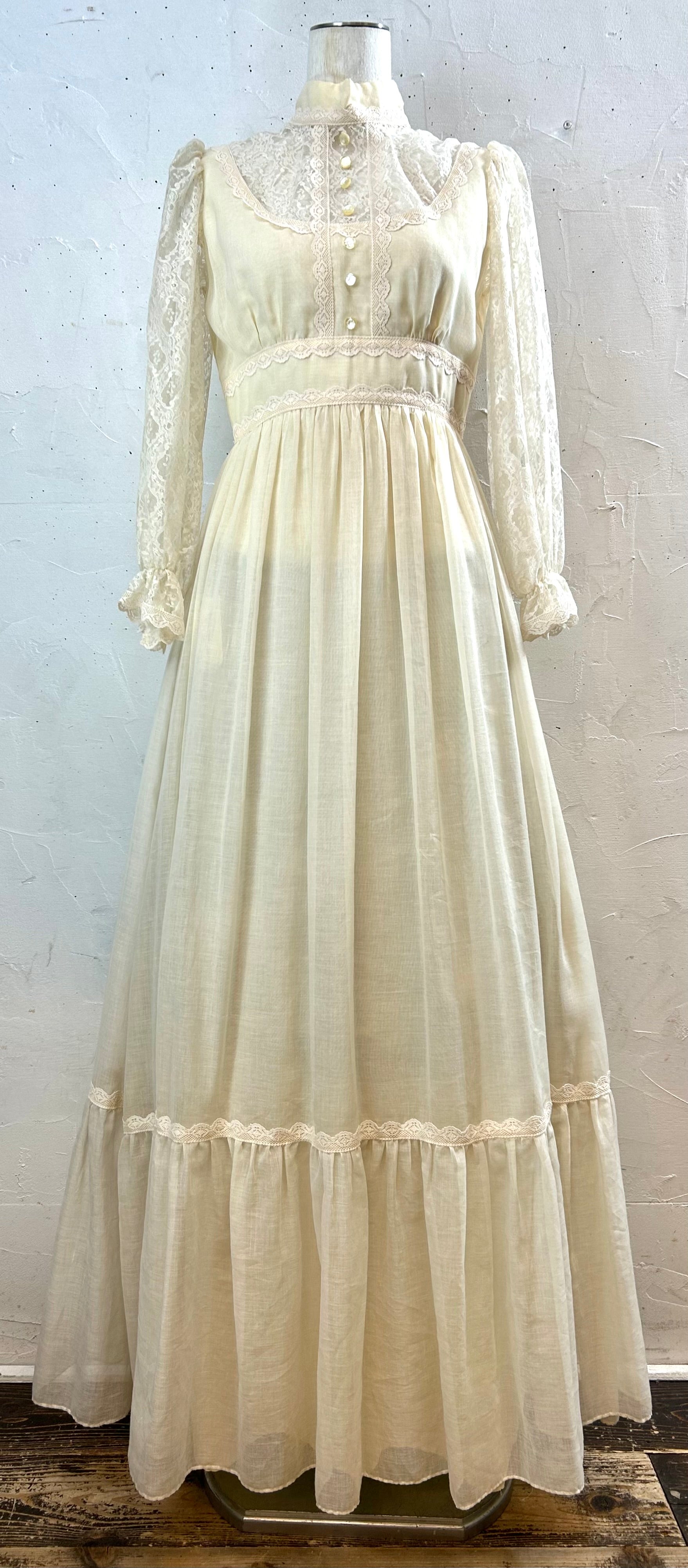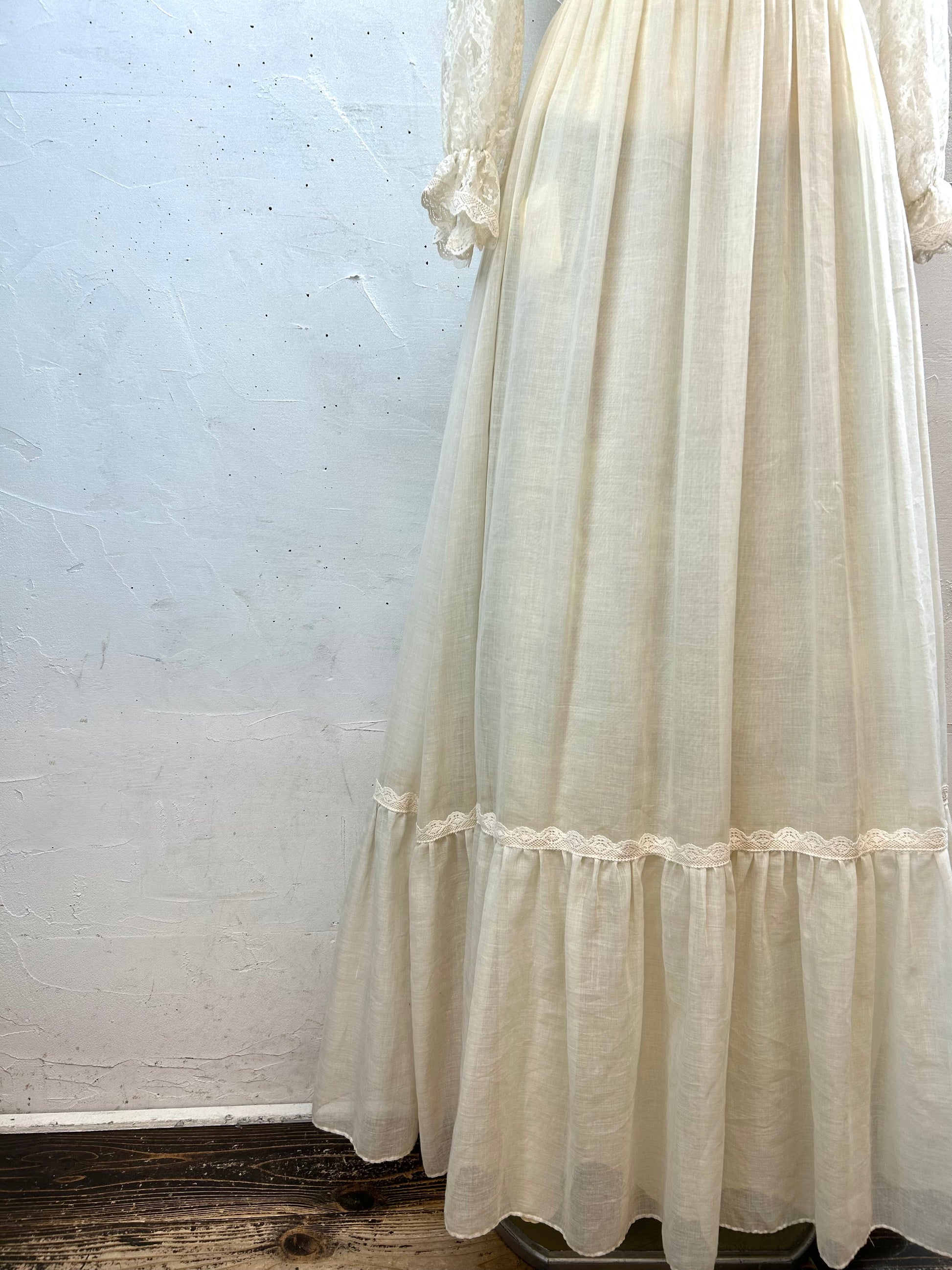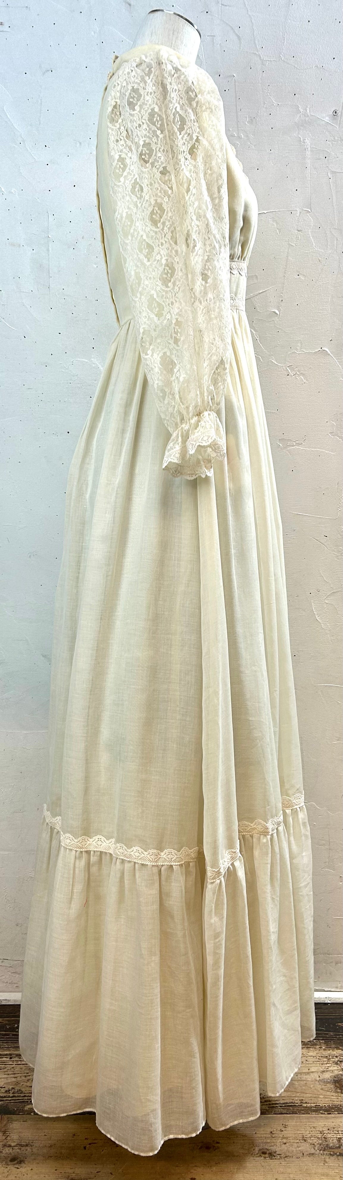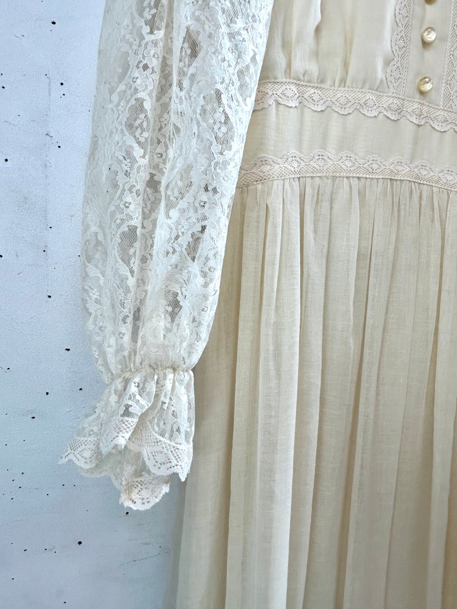 深みのあるオフホワイトのレースと柔らかな生地を使ってデザインされたドレスでとても品があり現代でも世界的に人気の高いアイテムとなっており、長いカフスや細かな刺繍等細部までのこだわりも魅力的です。