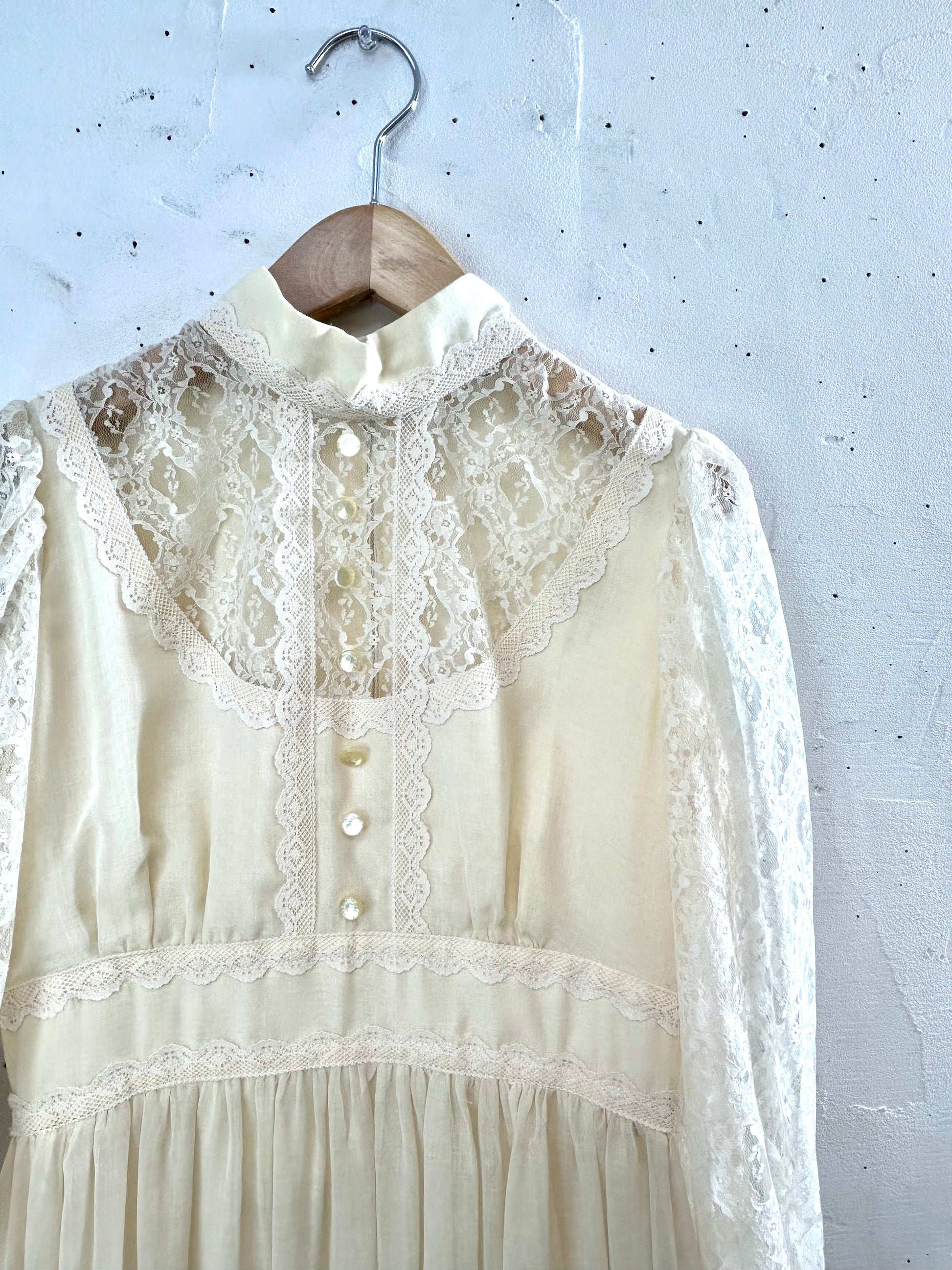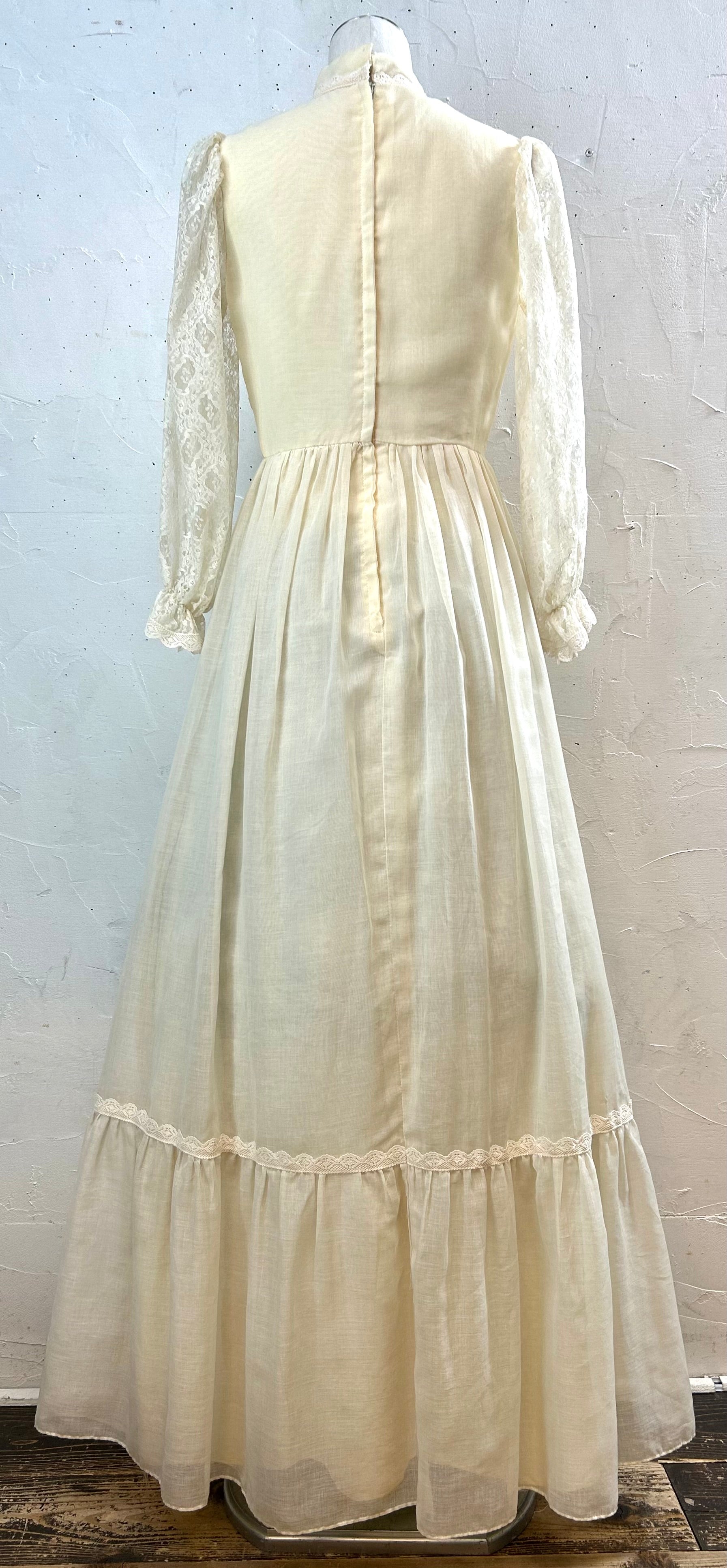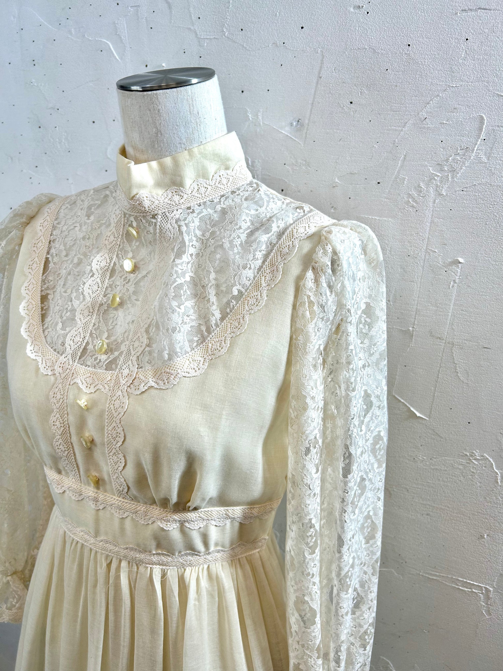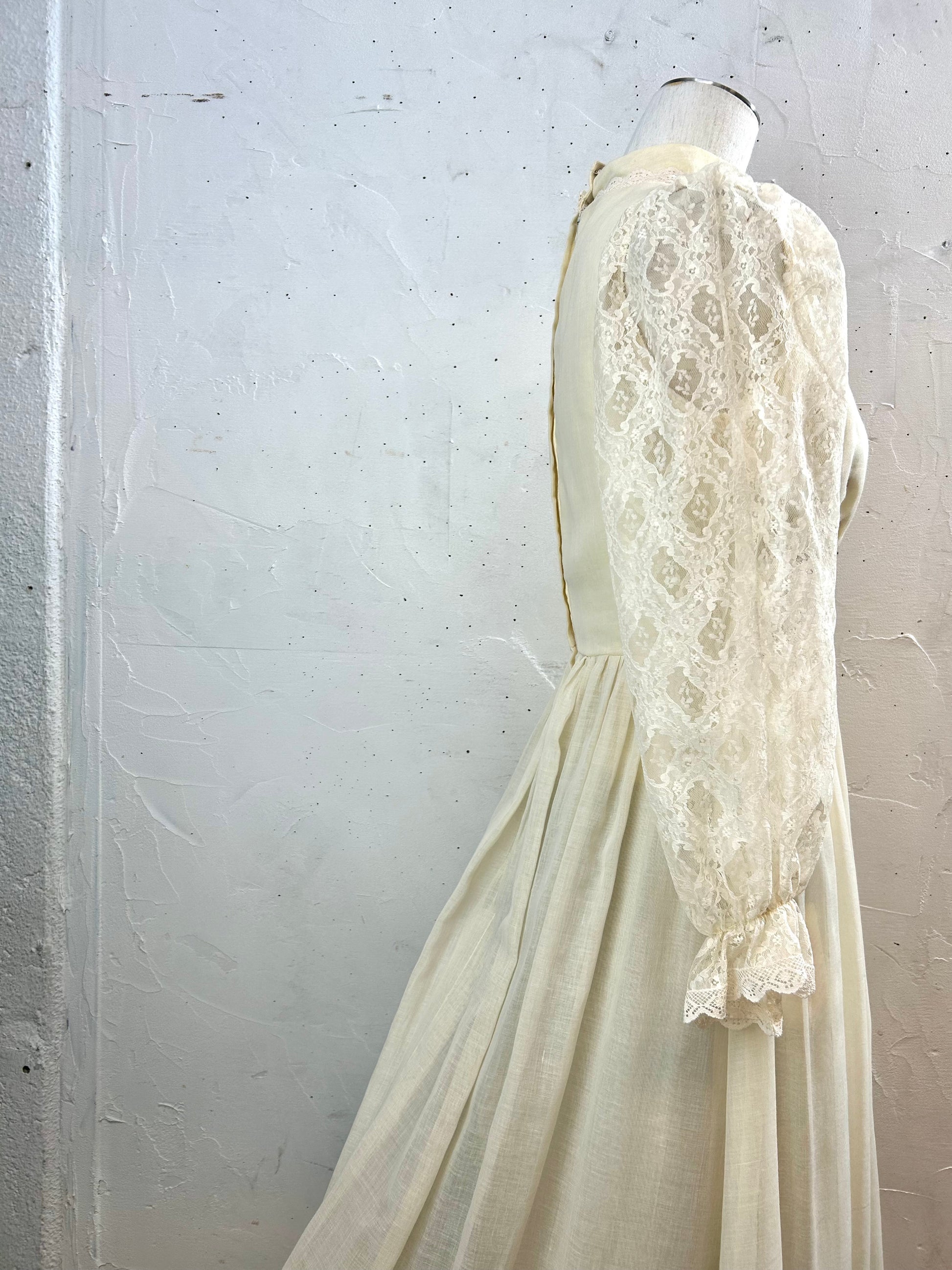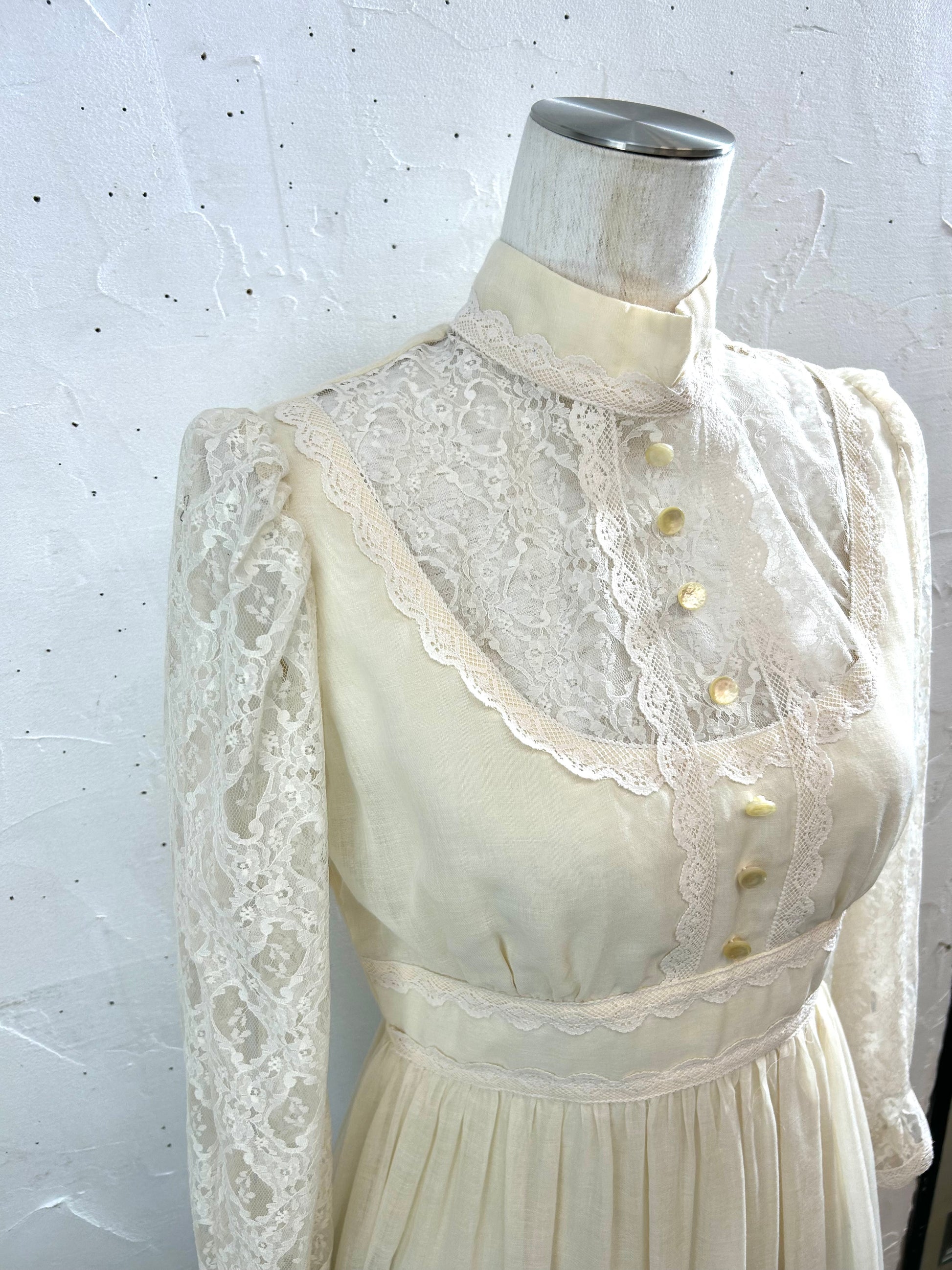 深みのあるオフホワイトのレースと柔らかな生地を使ってデザインされたドレスでとても品があり現代でも世界的に人気の高いアイテムとなっており、長いカフスや細かな刺繍等細部までのこだわりも魅力的です。