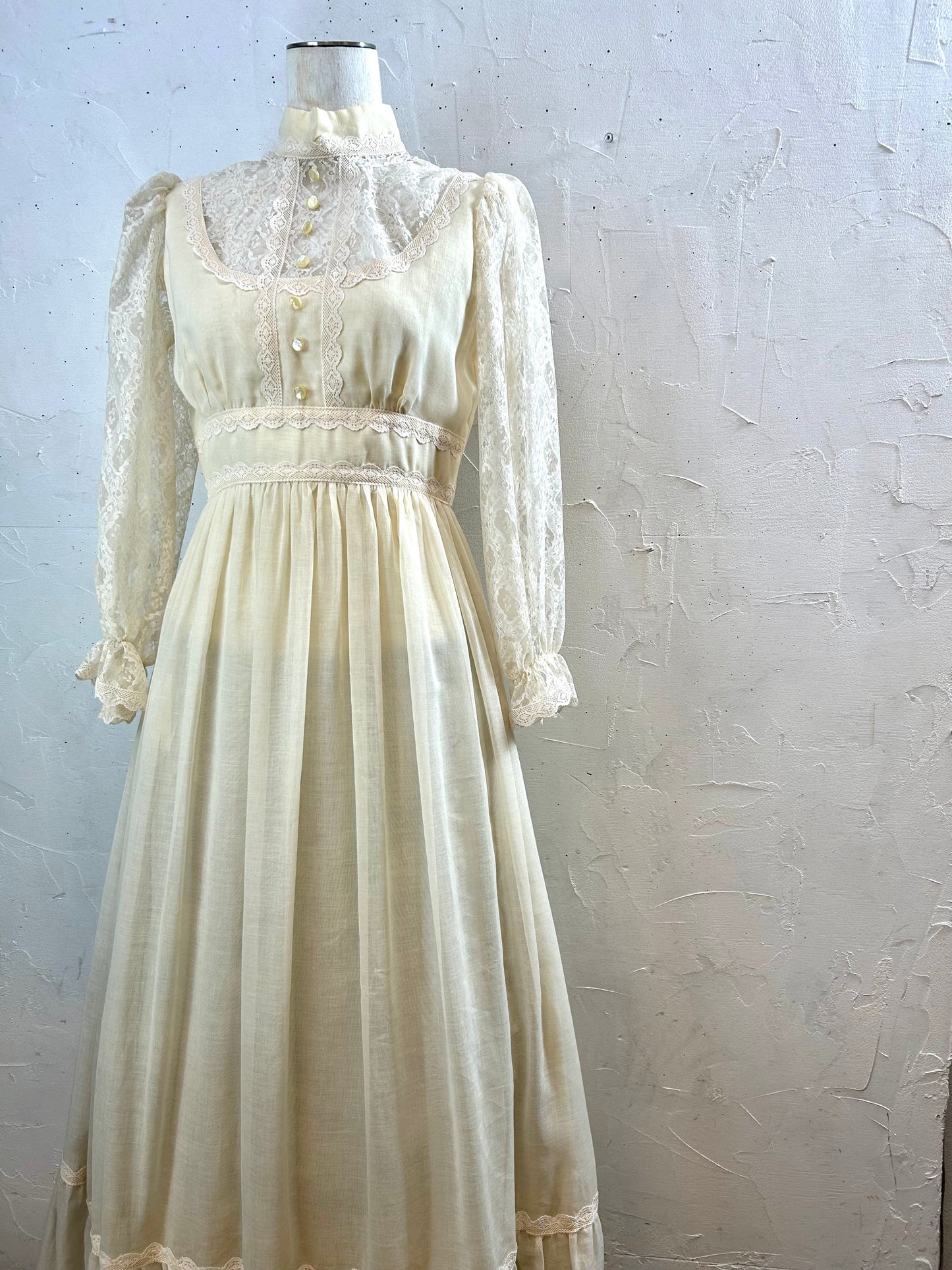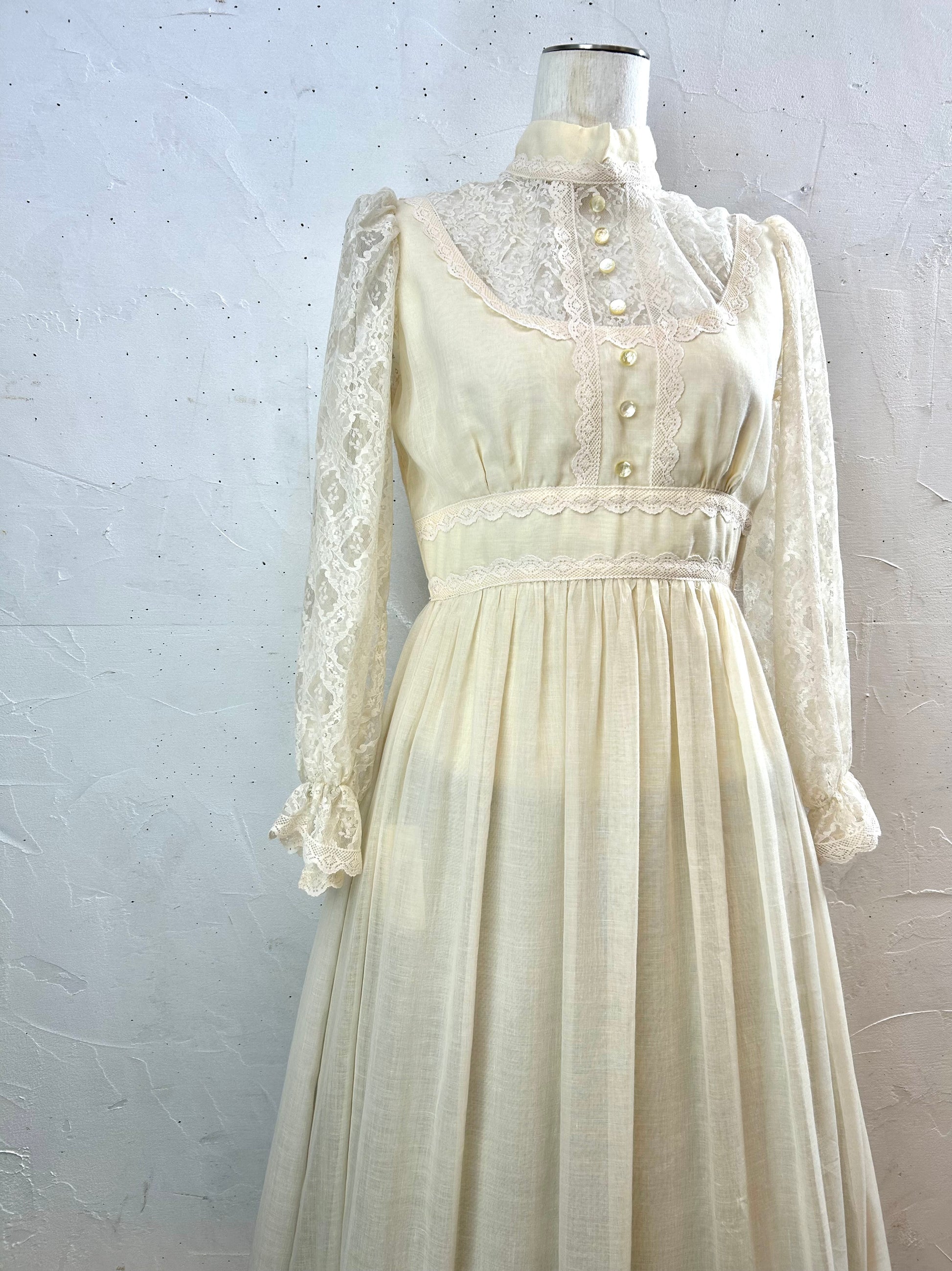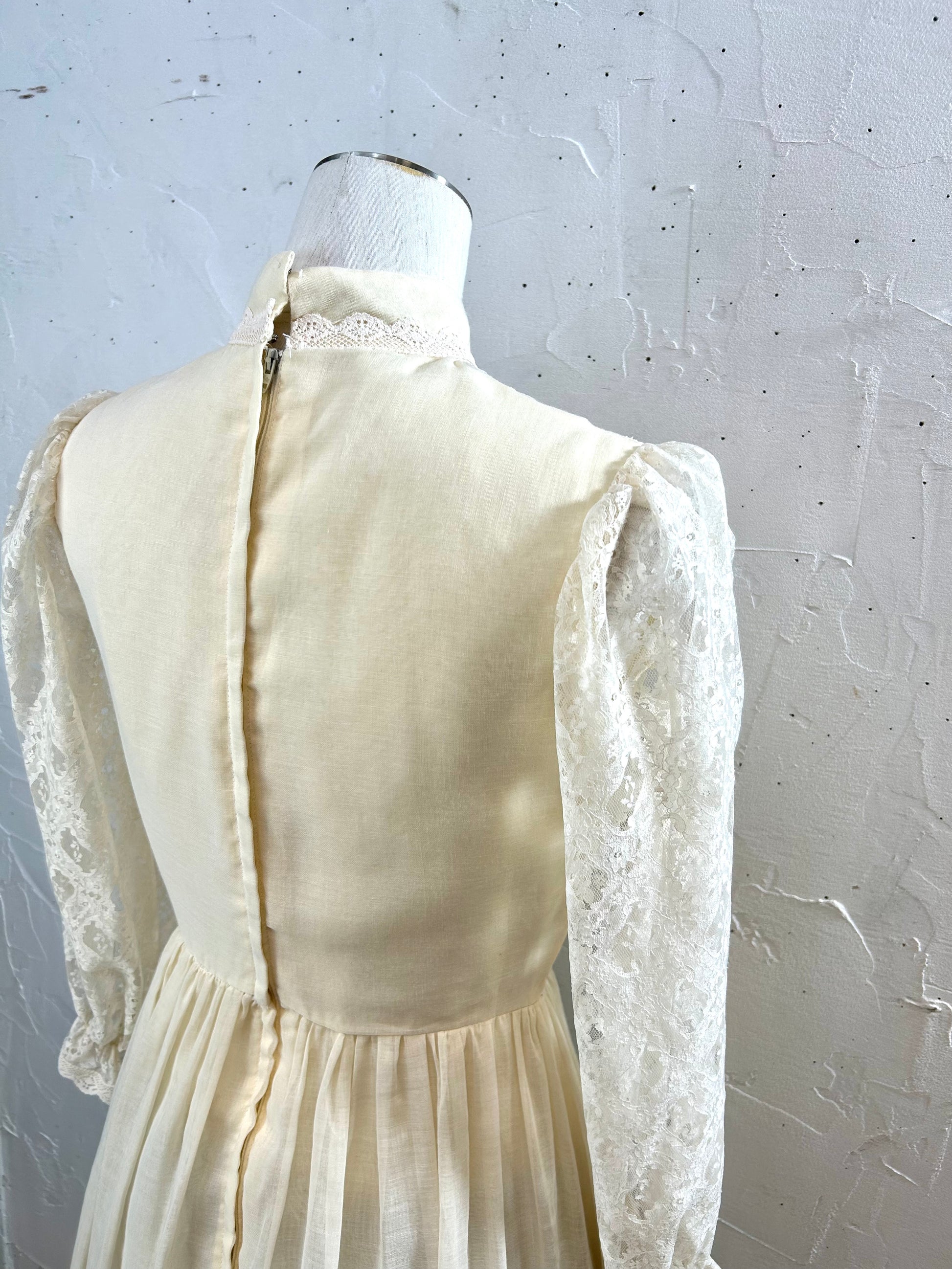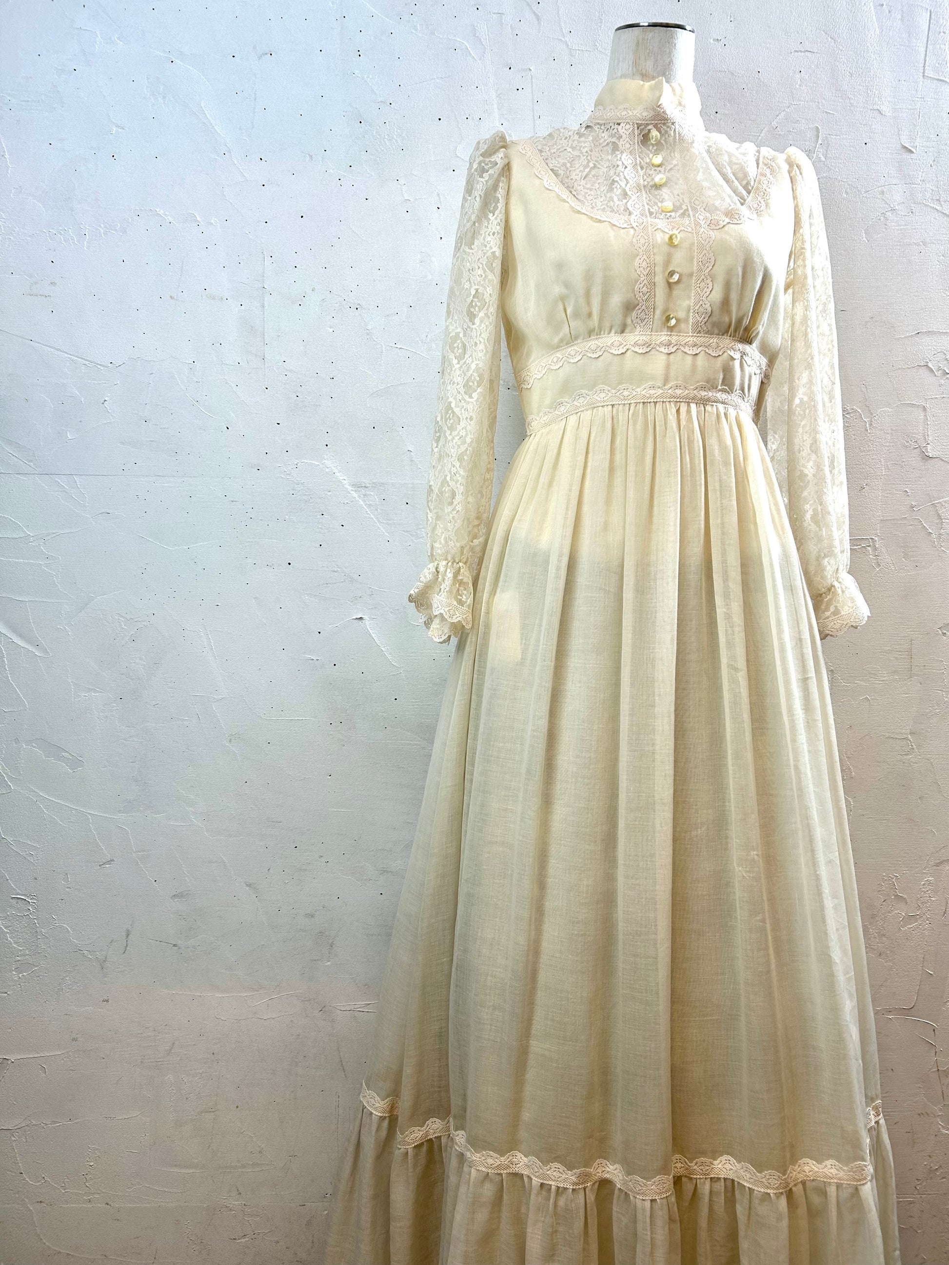 深みのあるオフホワイトのレースと柔らかな生地を使ってデザインされたドレスでとても品があり現代でも世界的に人気の高いアイテムとなっており、長いカフスや細かな刺繍等細部までのこだわりも魅力的です。