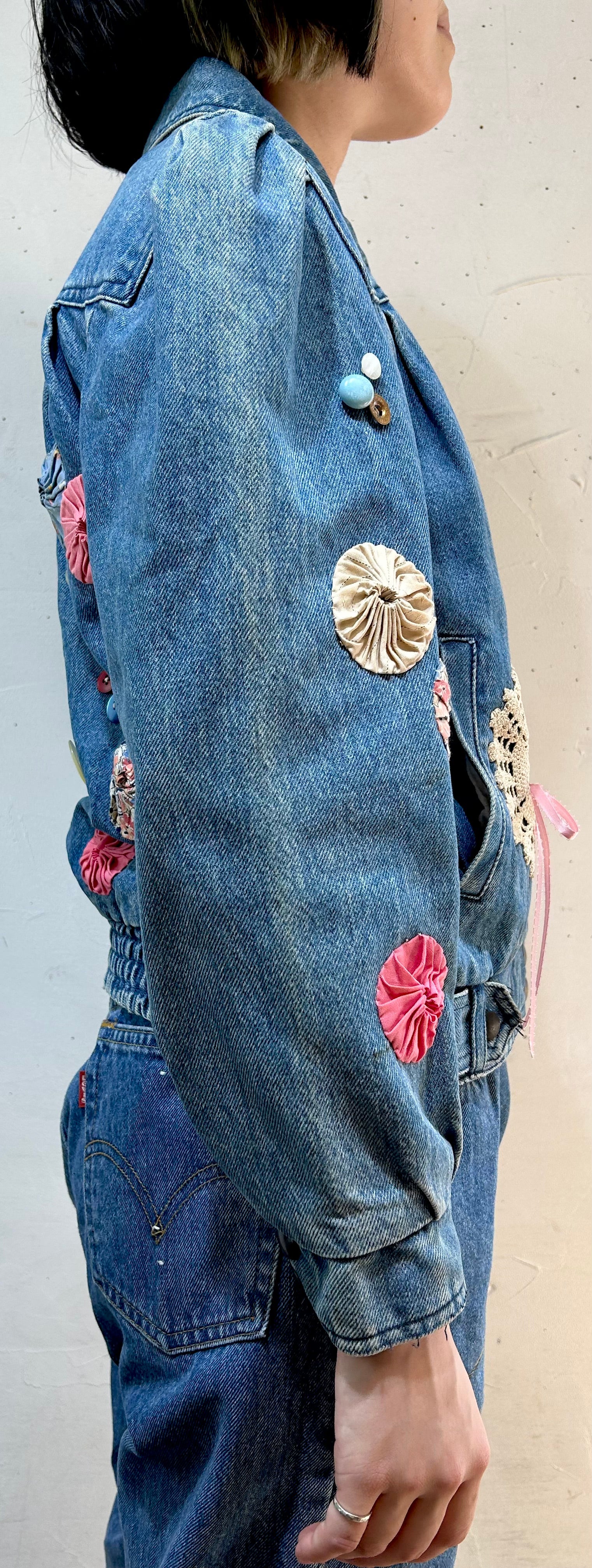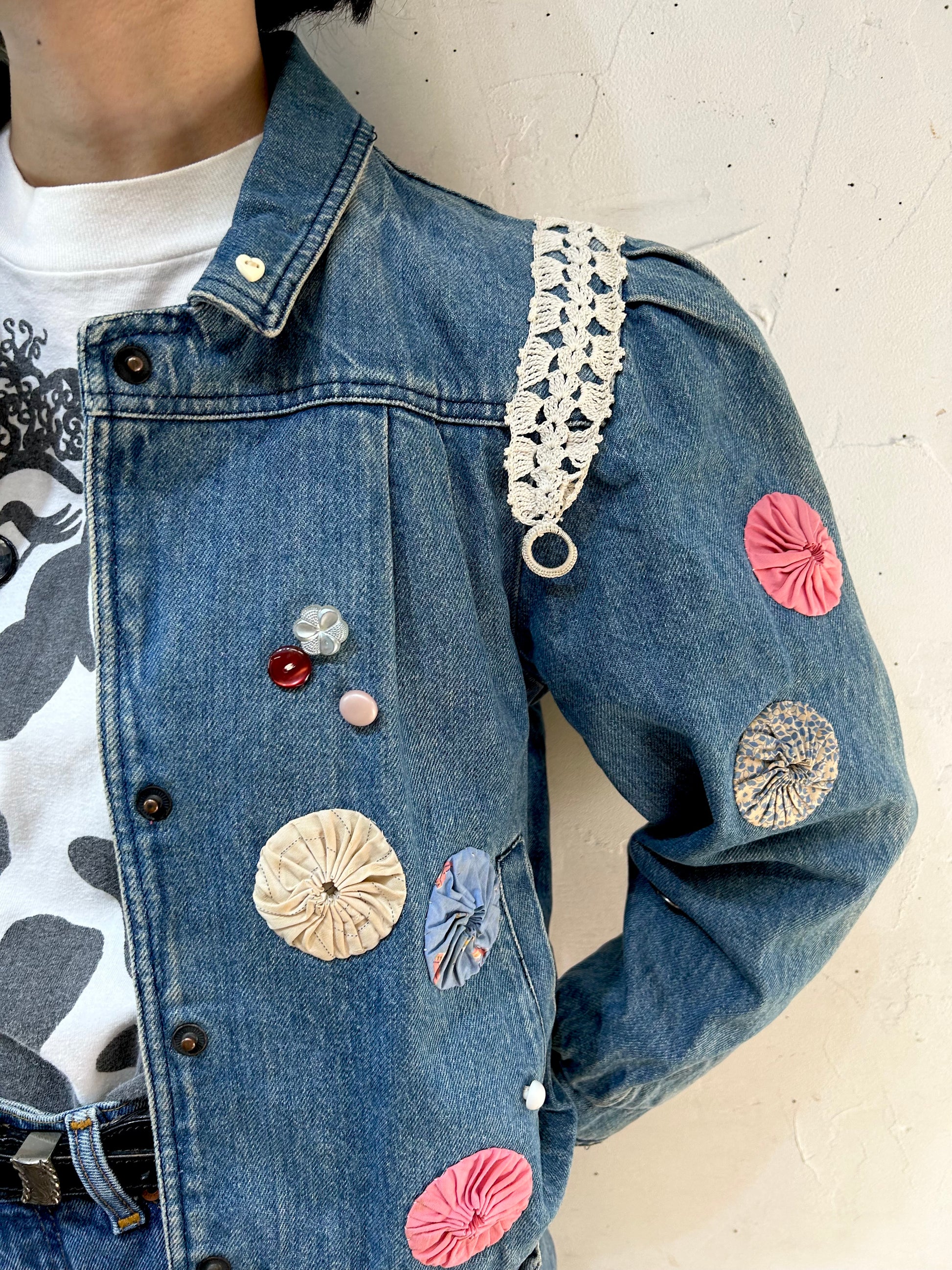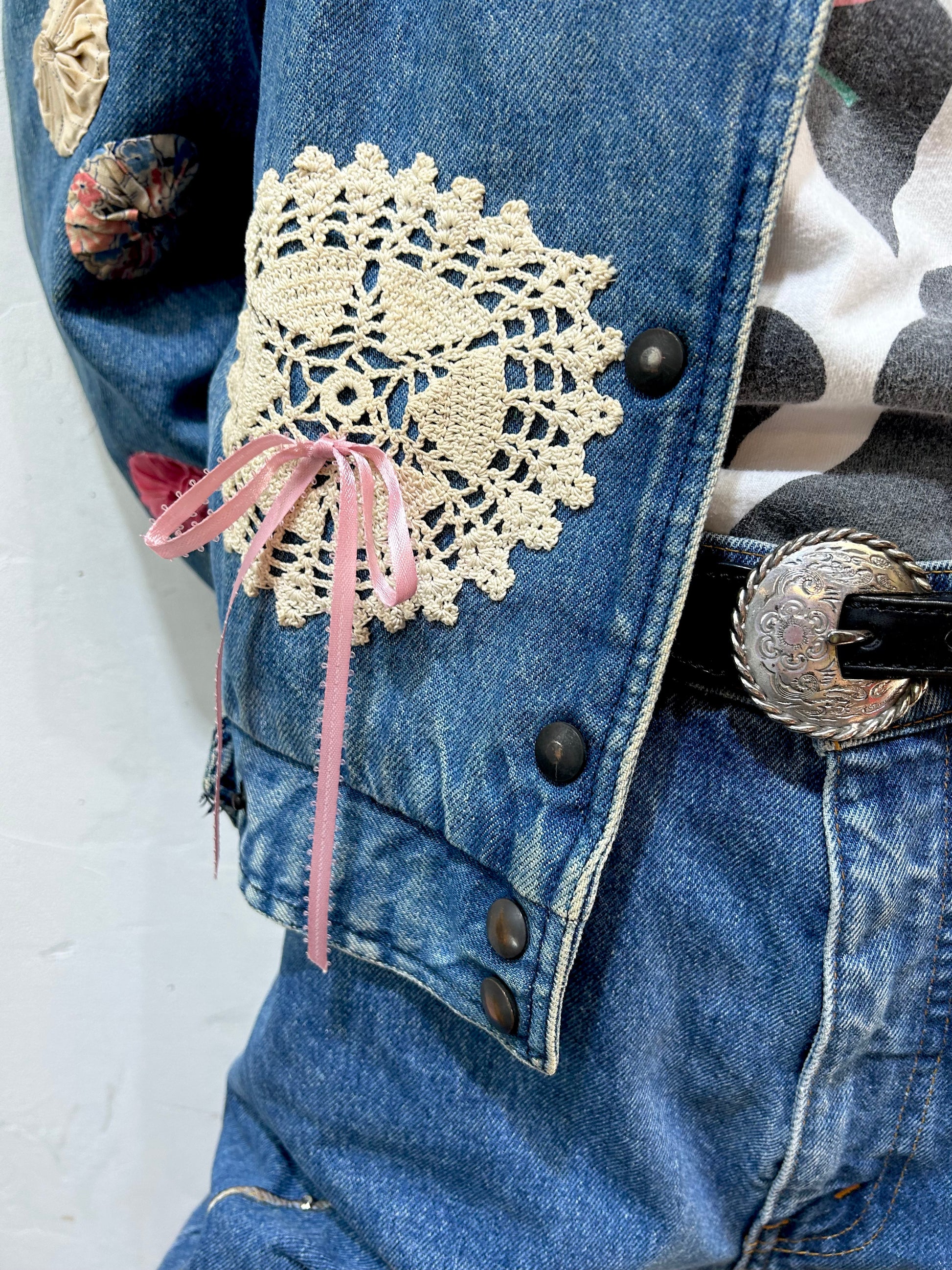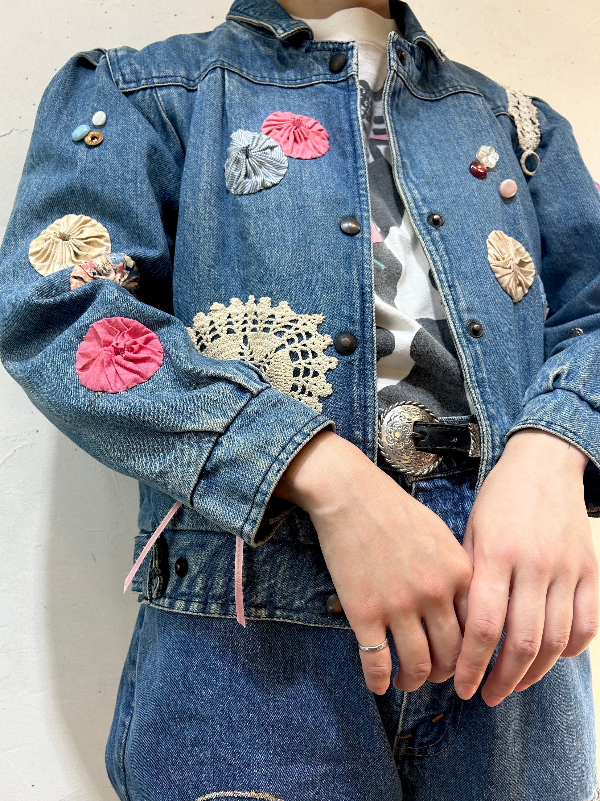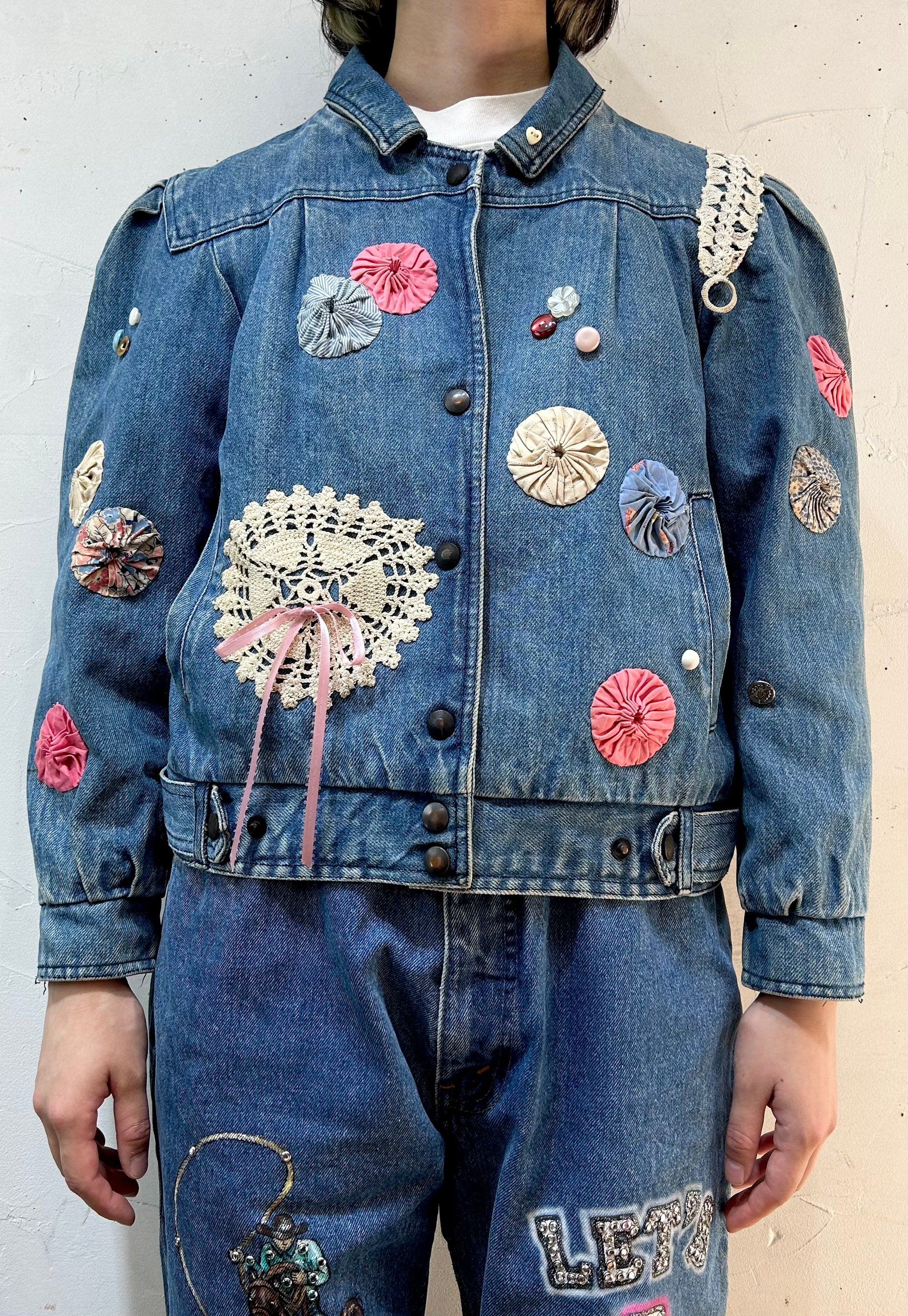 デニムにヨーヨーキルトやクロシェレースを贅沢に使用しカスタムした一着。
