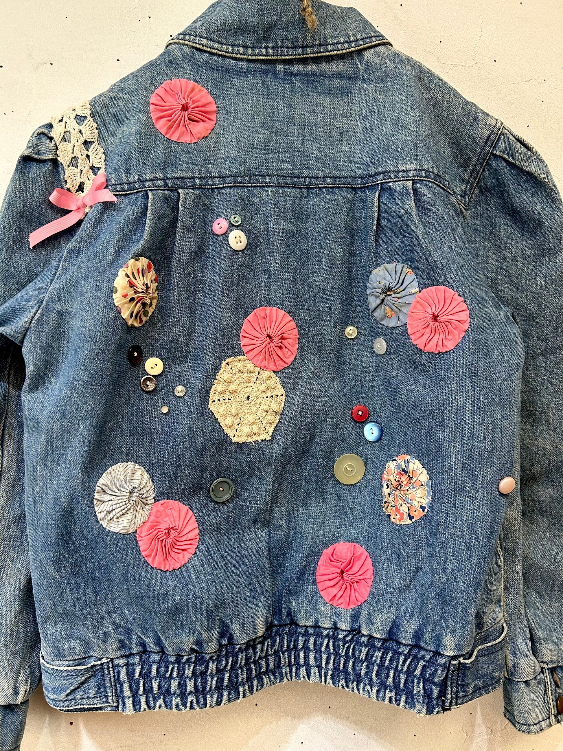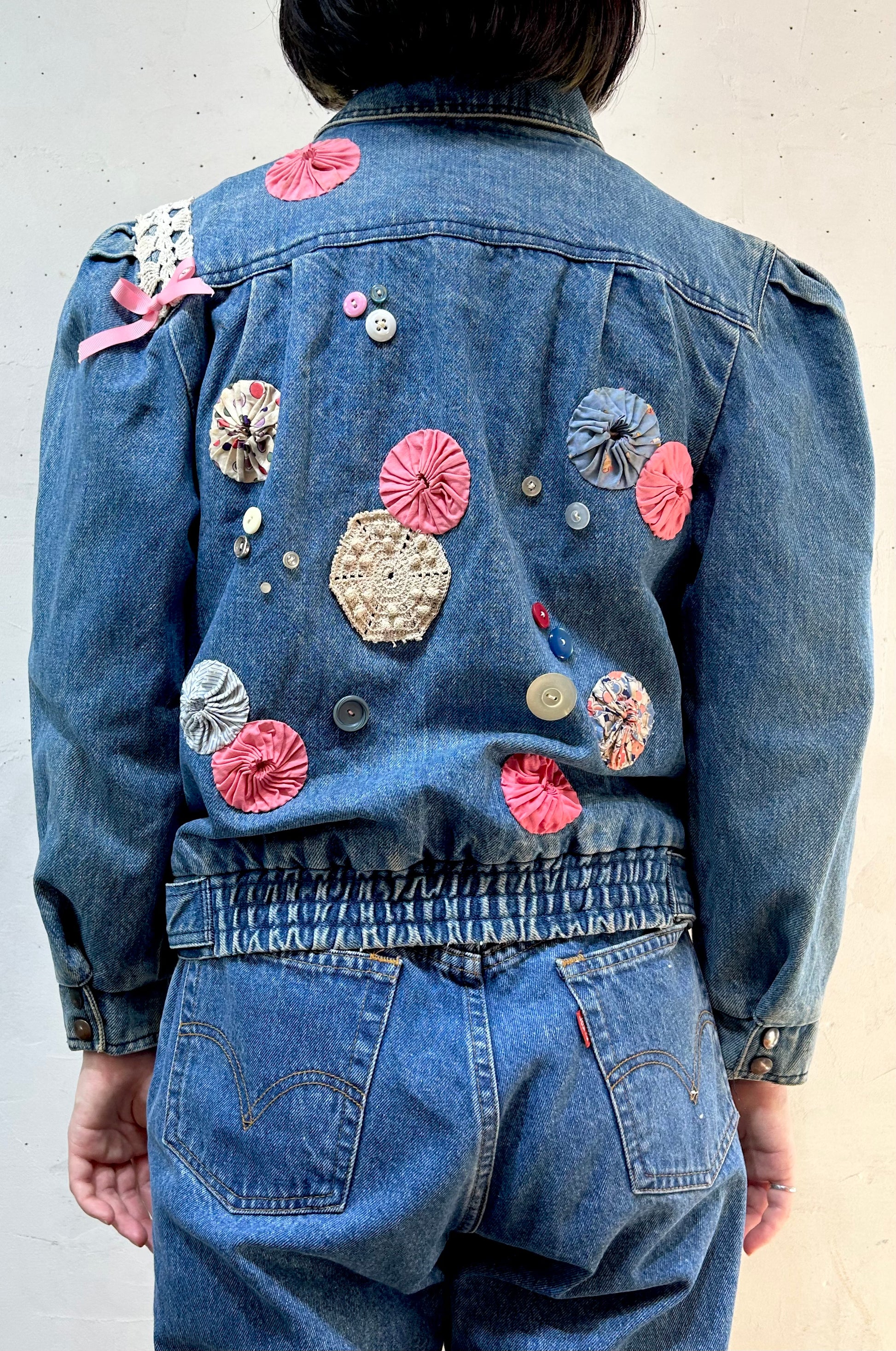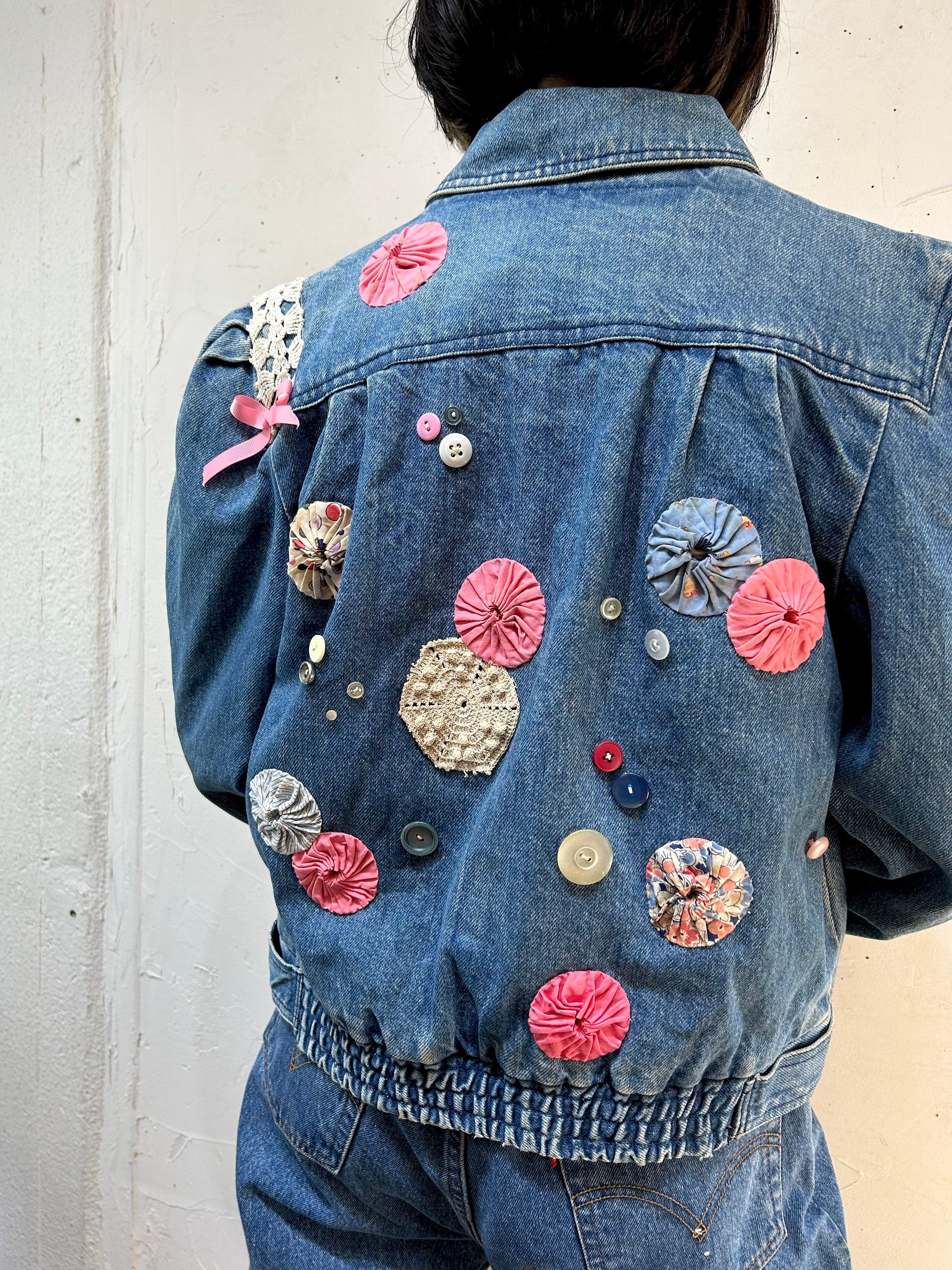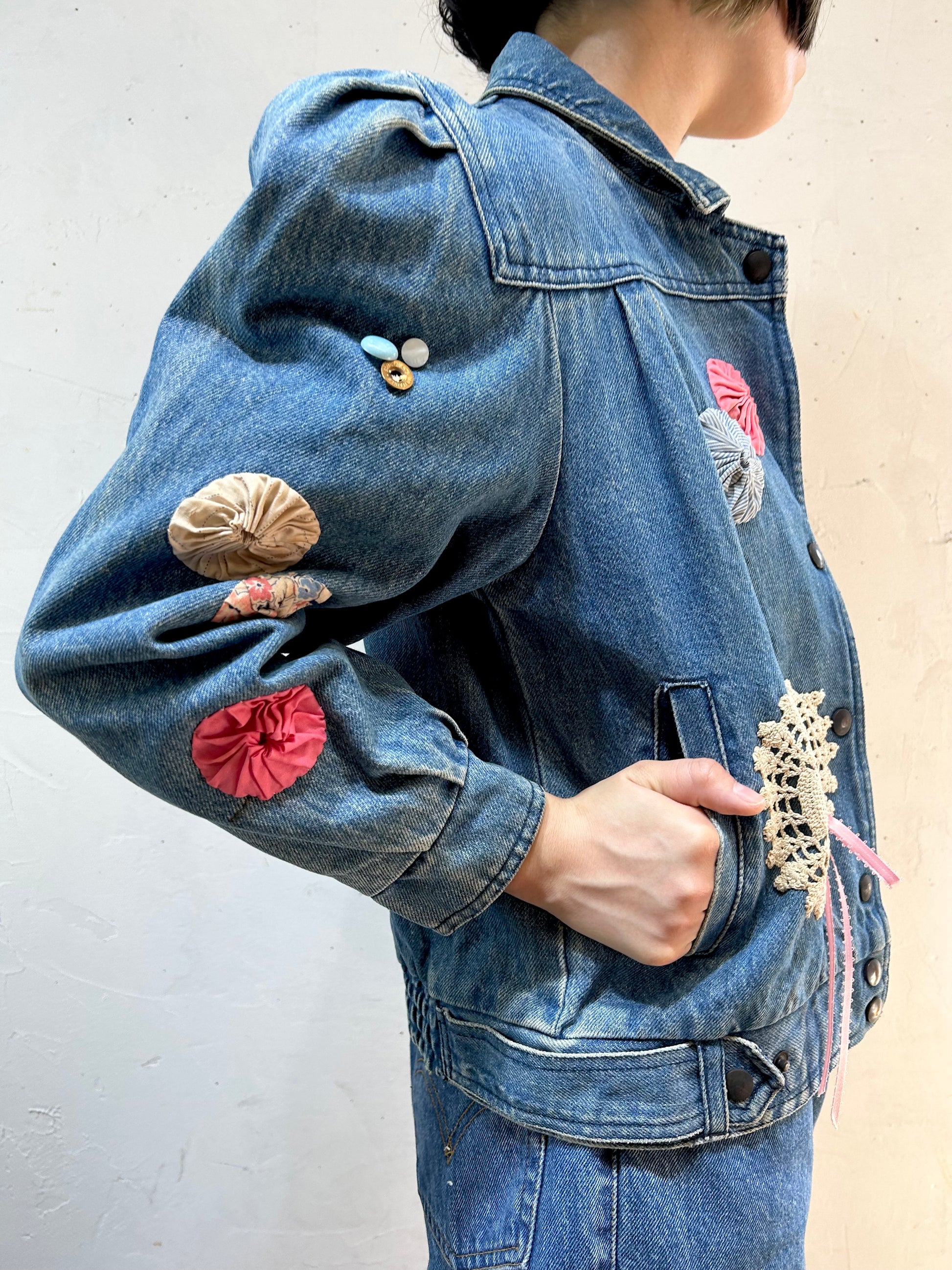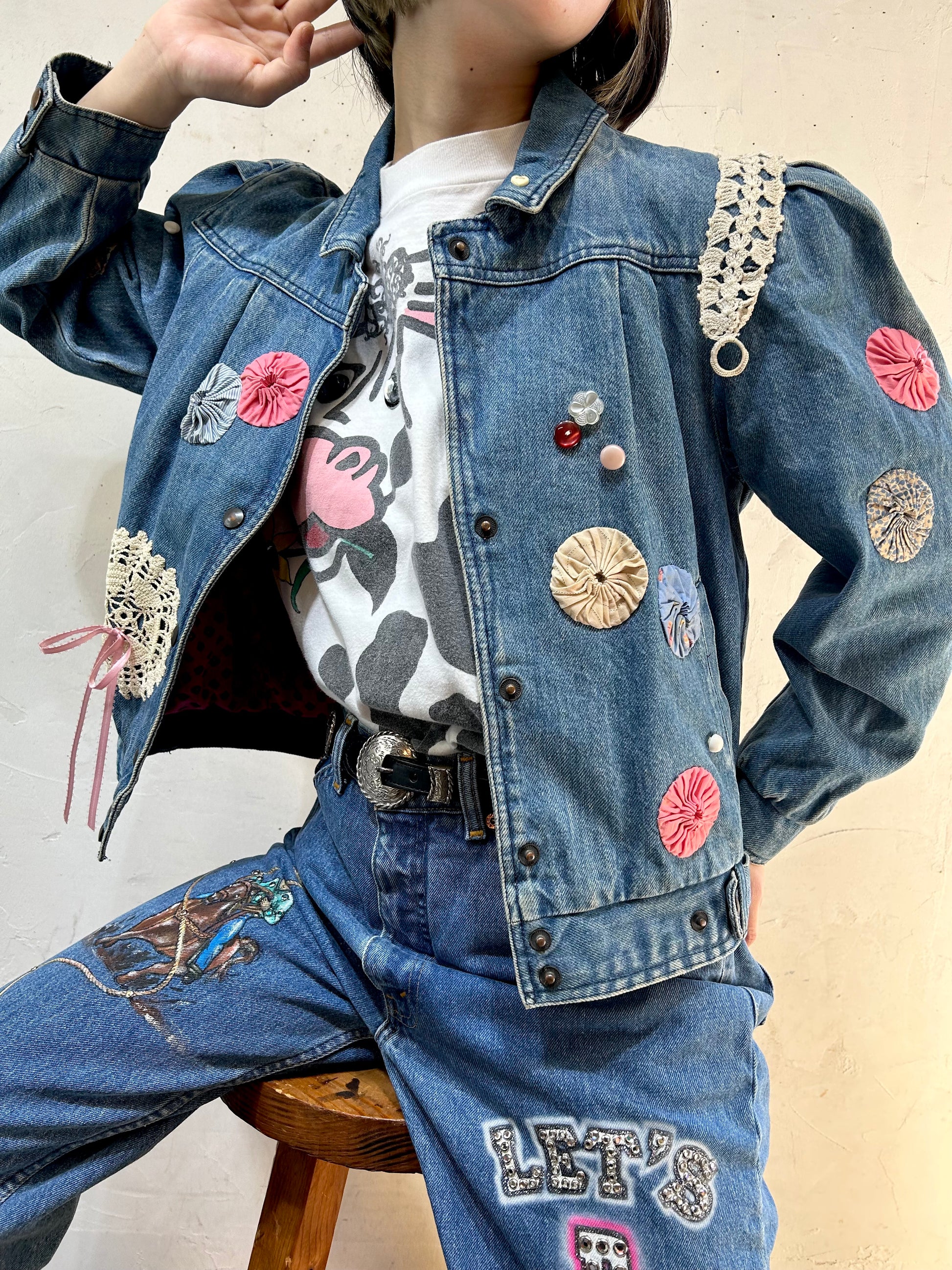 デニムにヨーヨーキルトやクロシェレースを贅沢に使用しカスタムした一着。