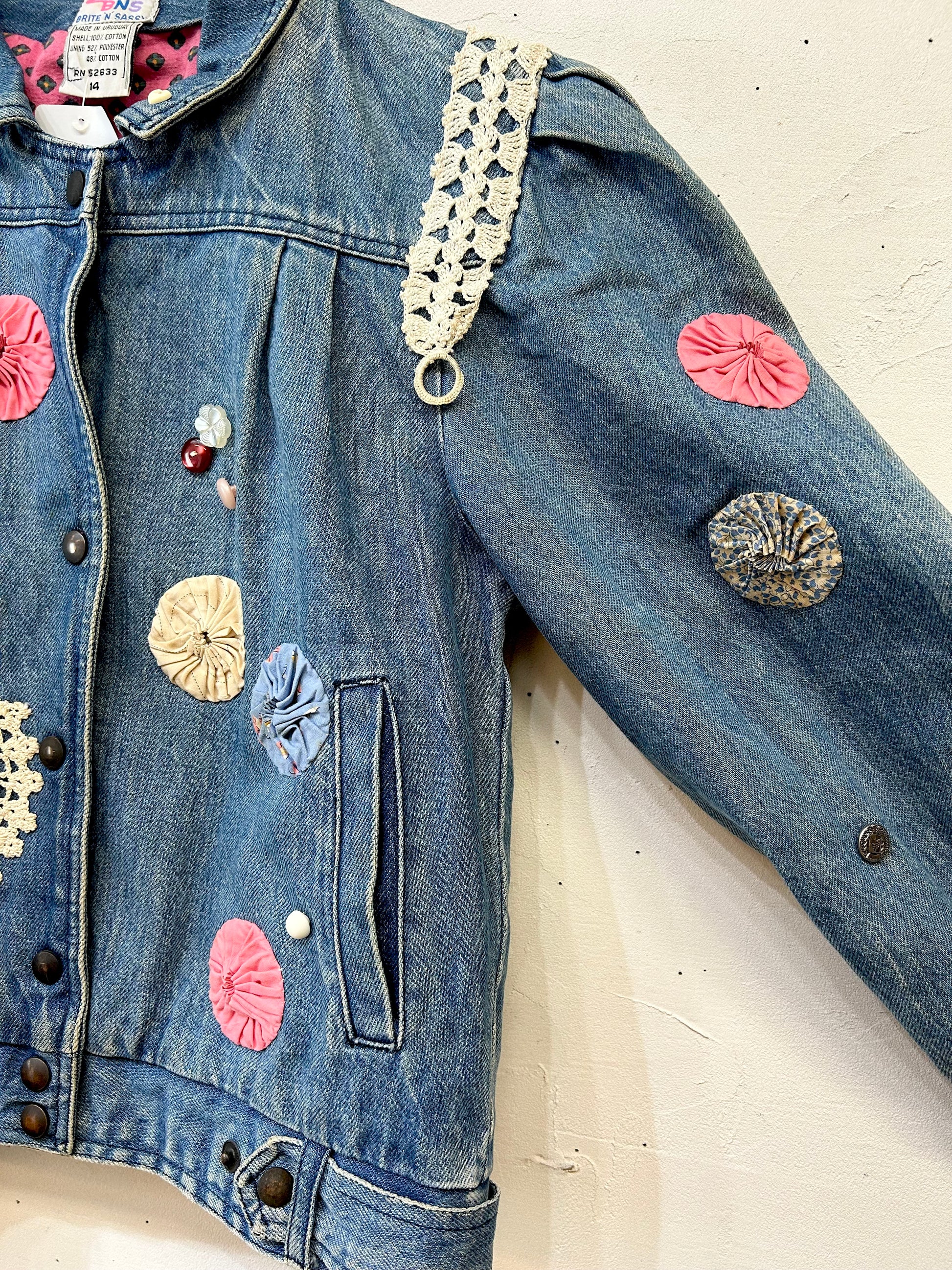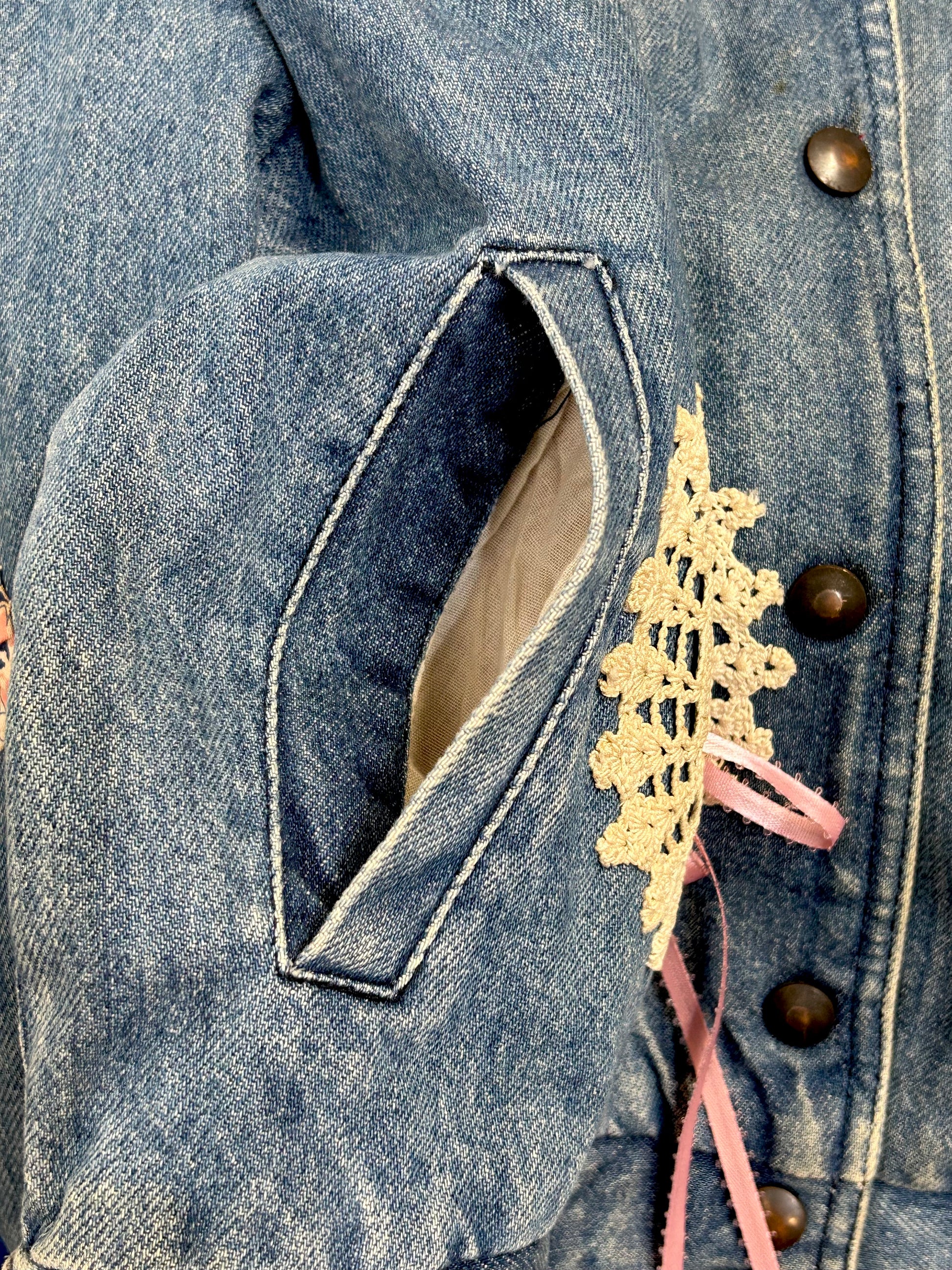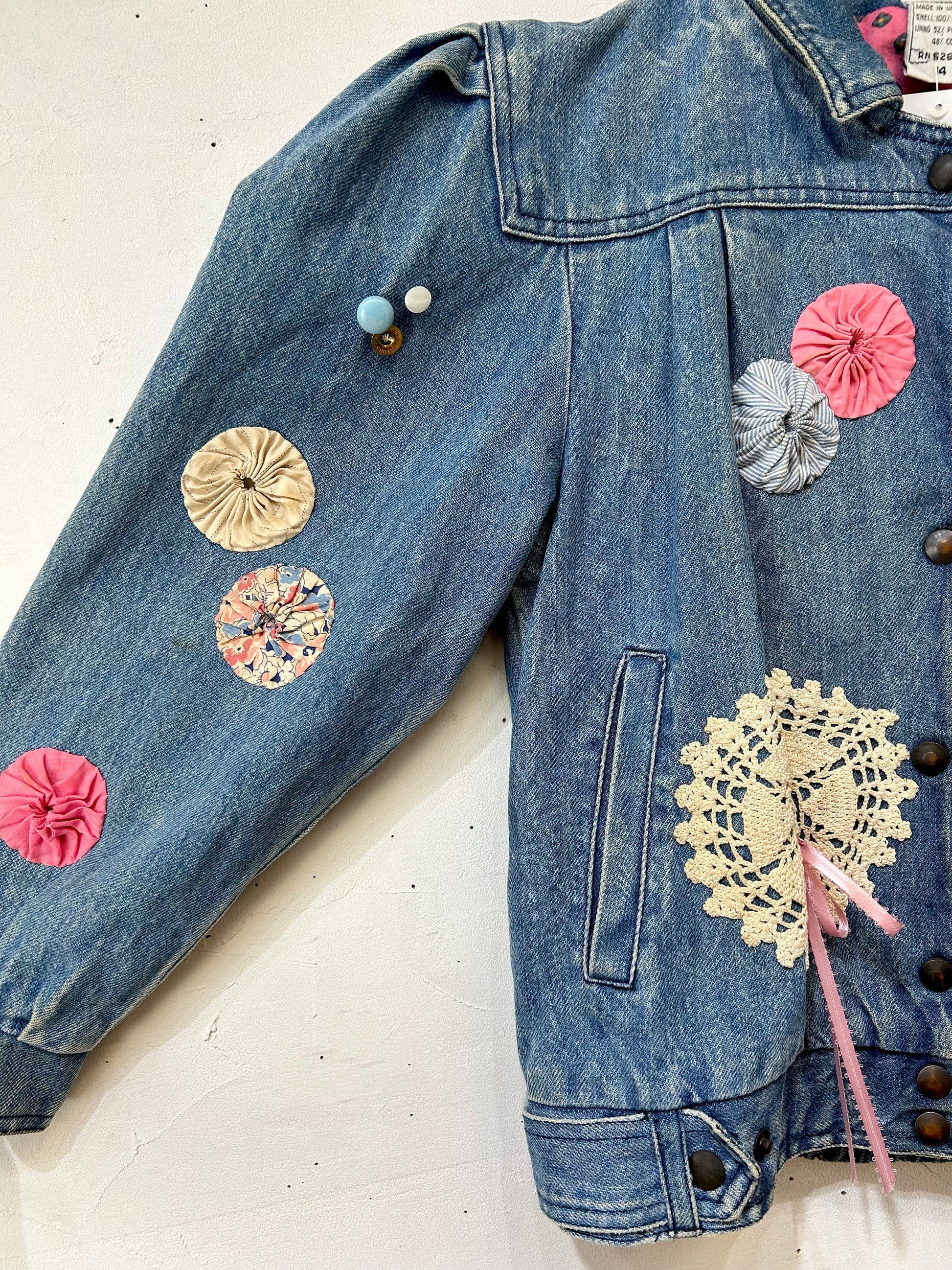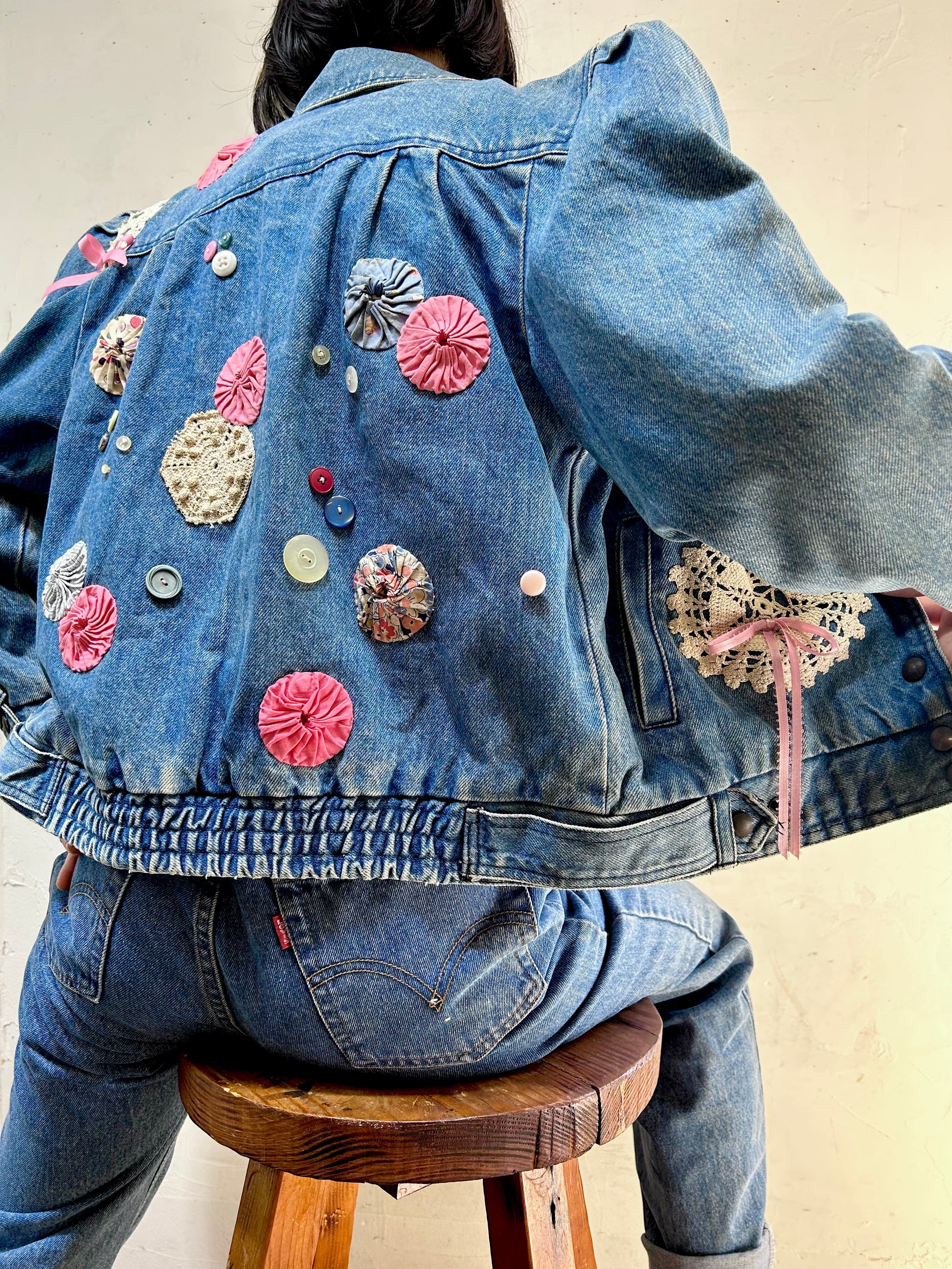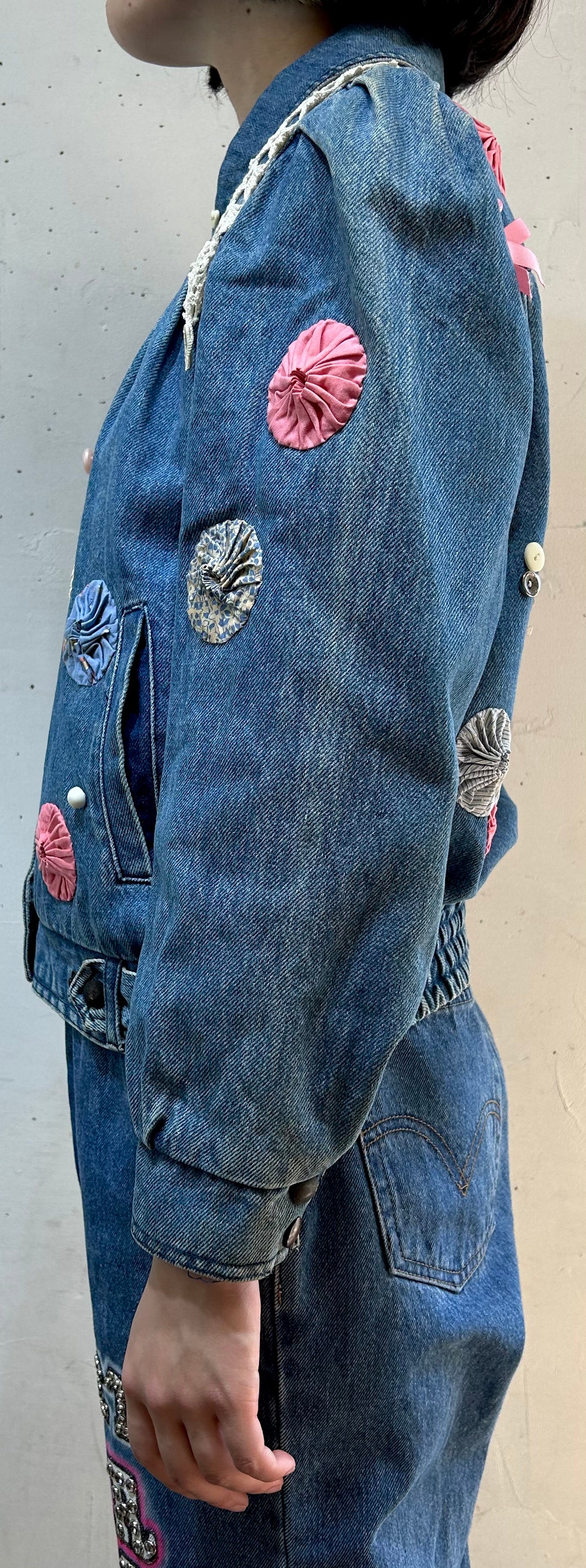 デニムにヨーヨーキルトやクロシェレースを贅沢に使用しカスタムした一着。