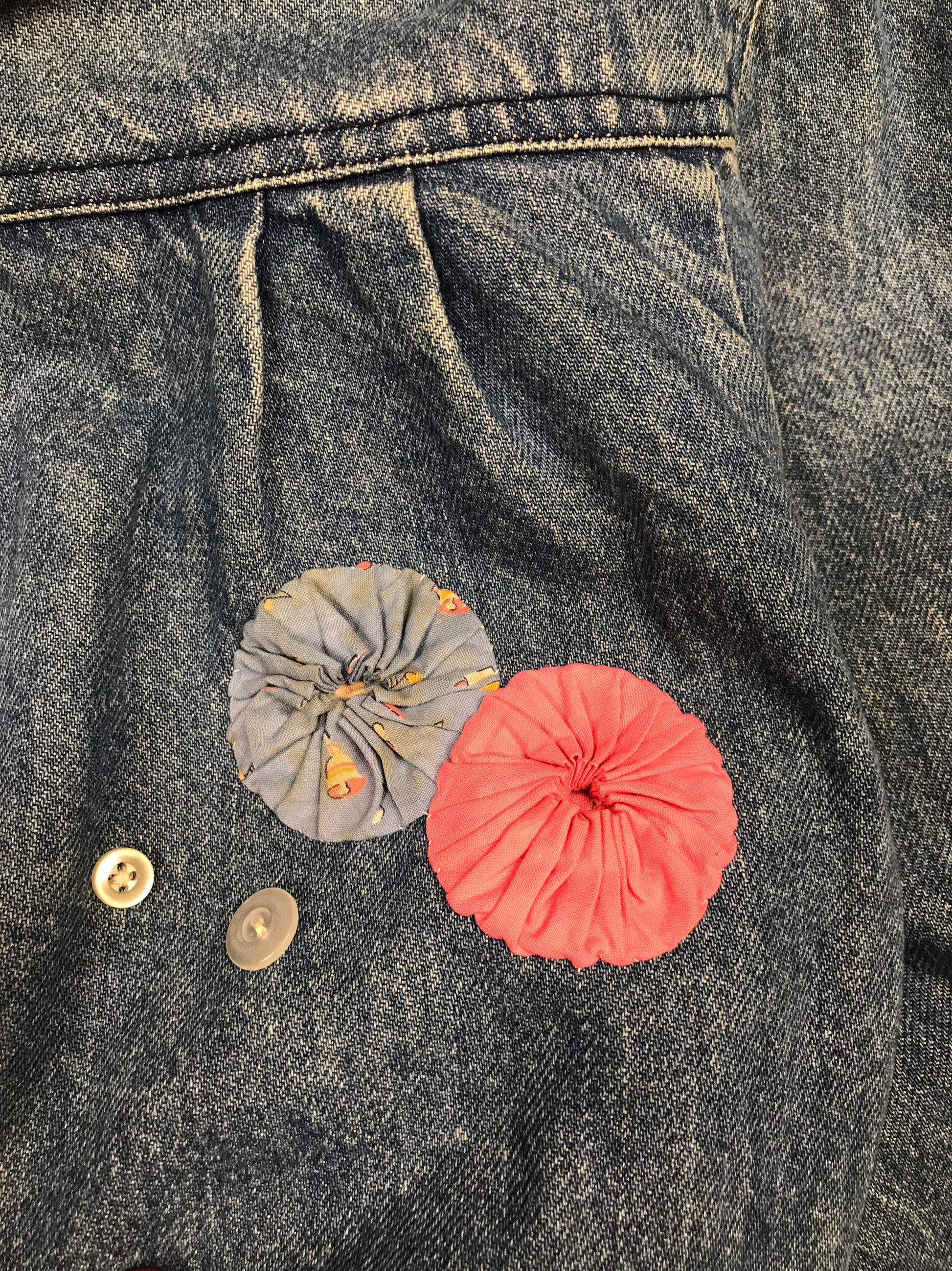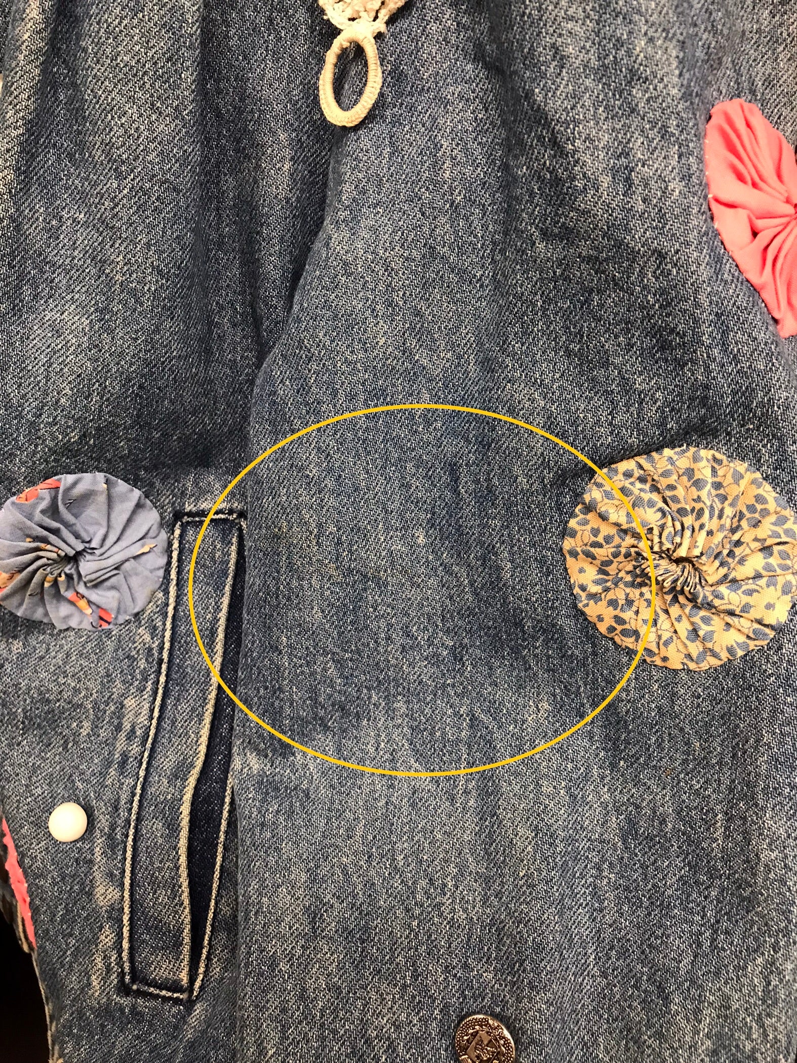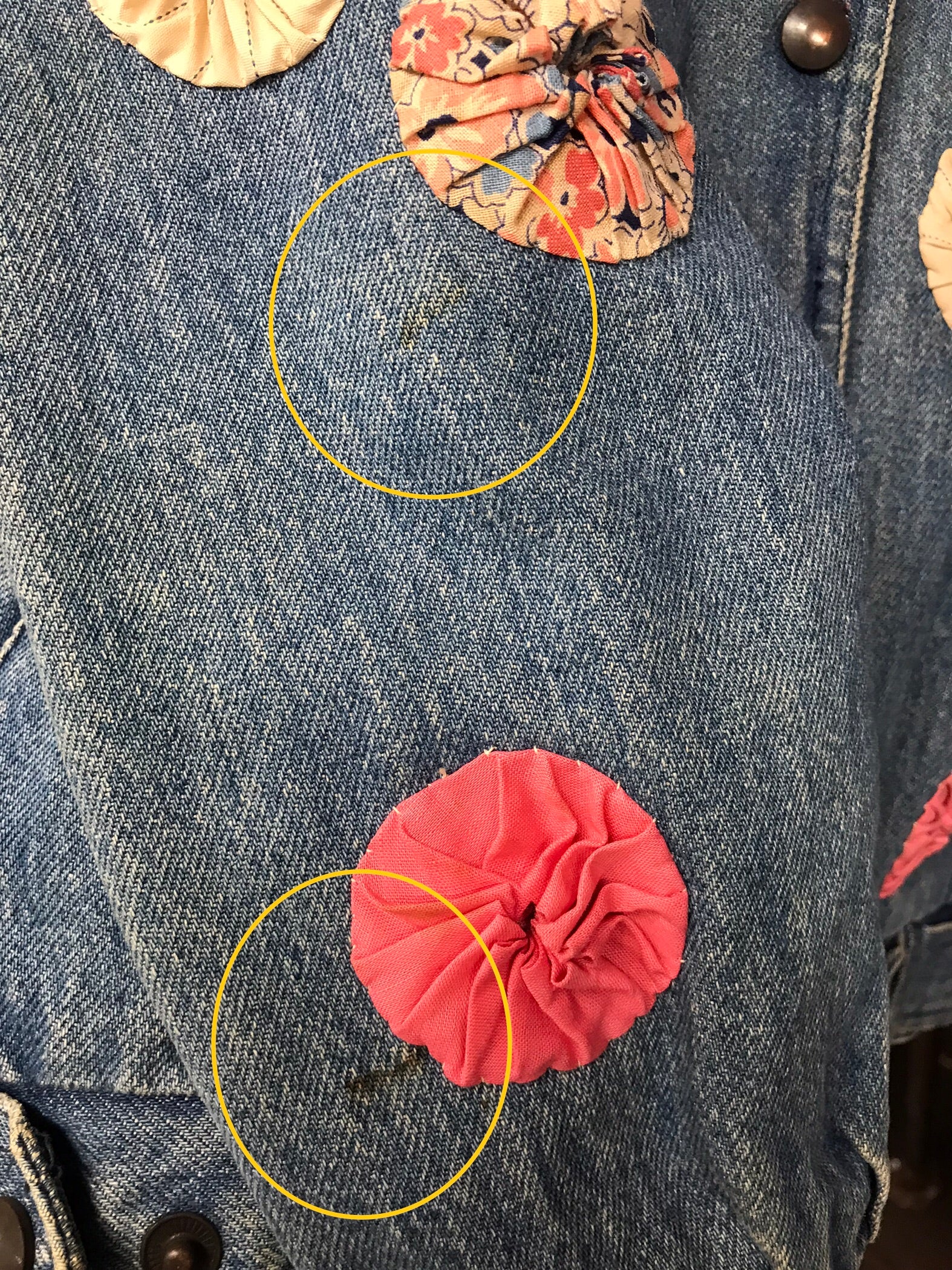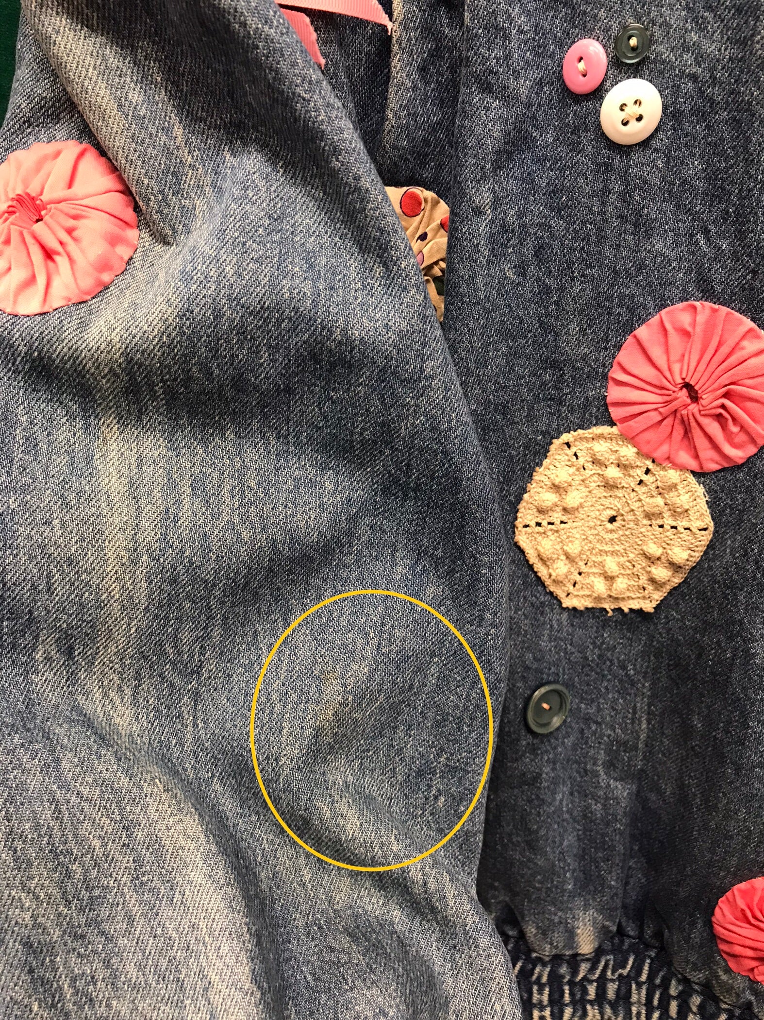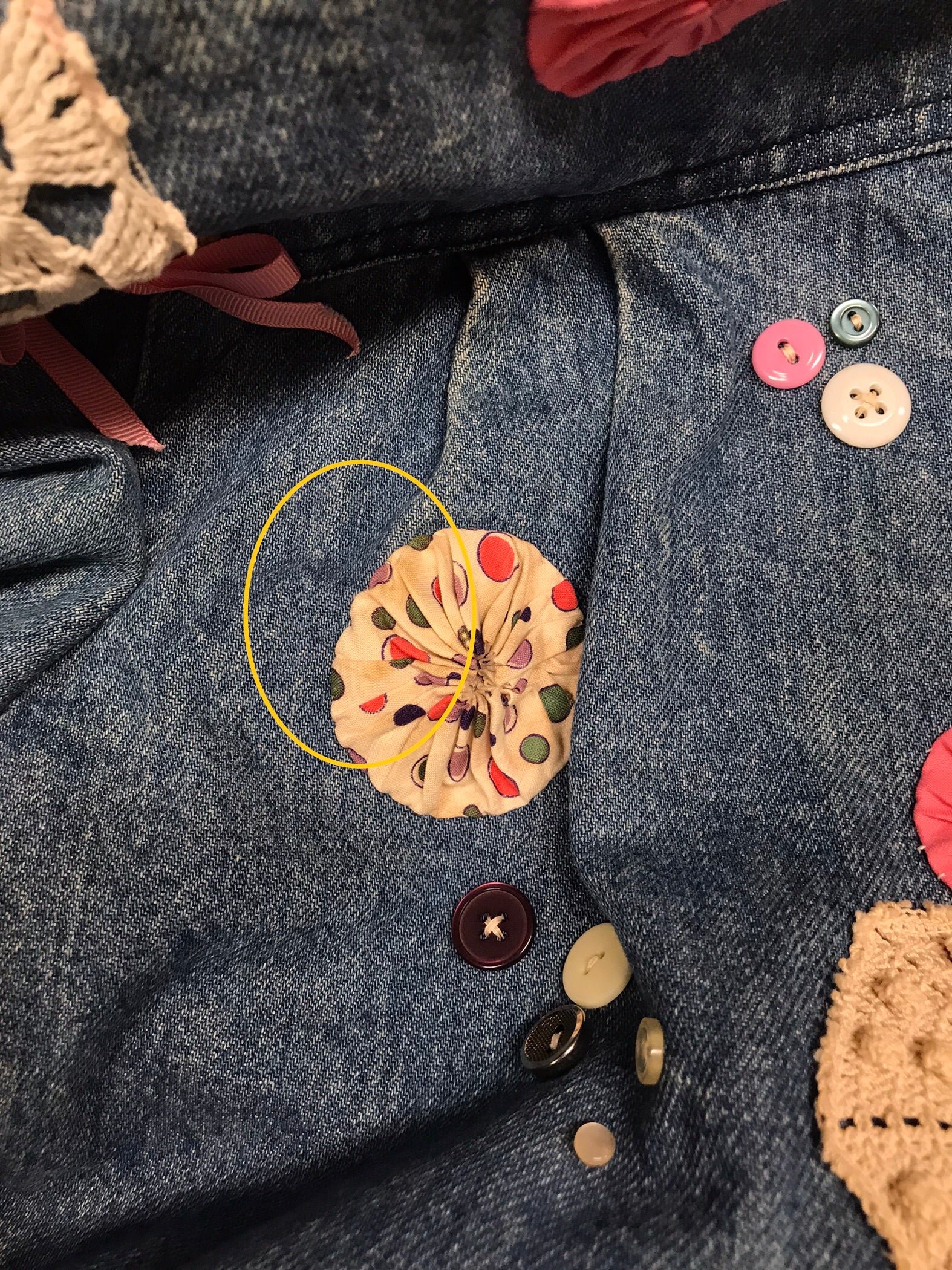 デニムにヨーヨーキルトやクロシェレースを贅沢に使用しカスタムした一着。