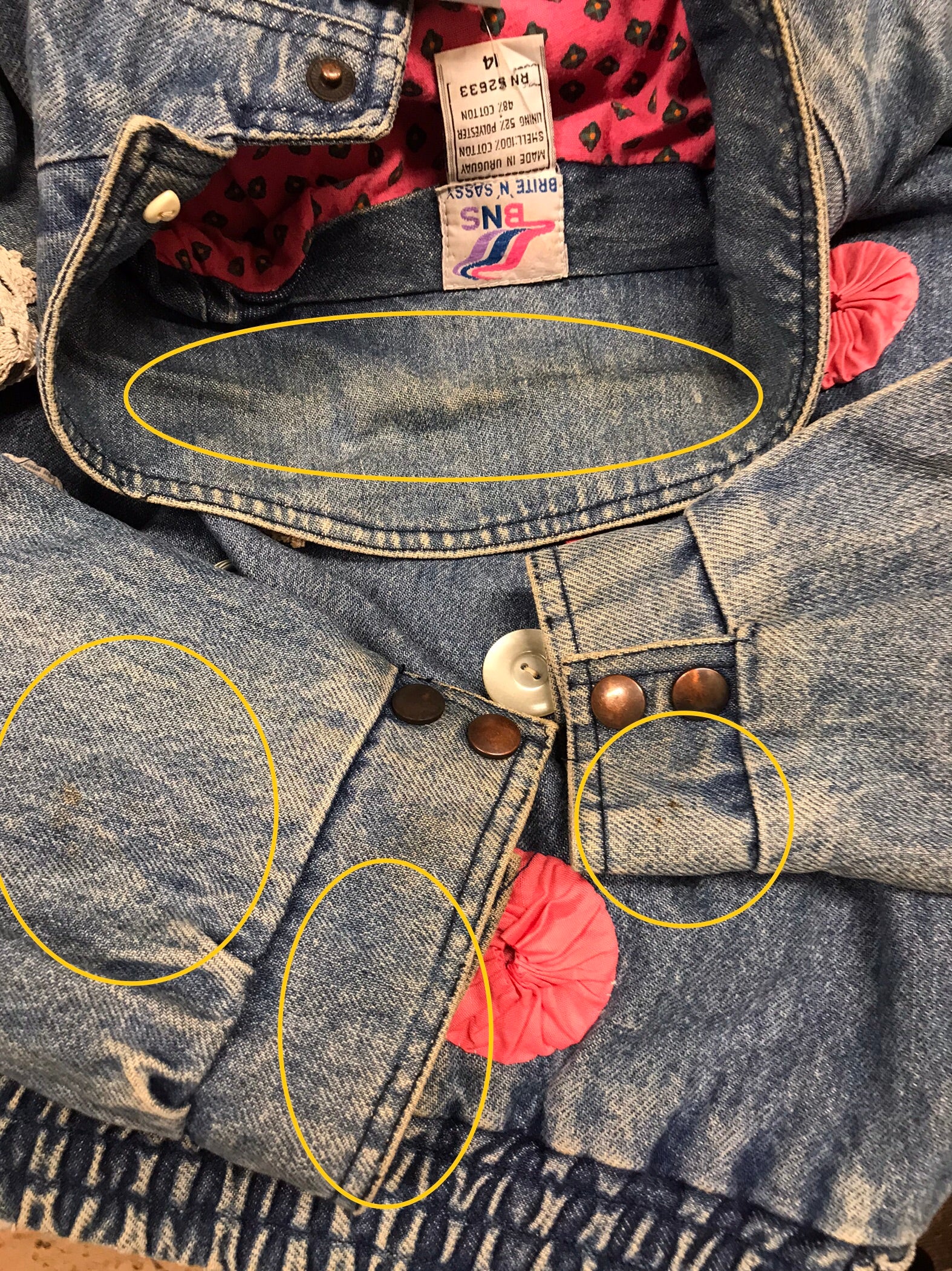 コンディション:全体的に所々汚れやシミ、スレがございますが、ビンテージにご理解いただいている方でしたら、気にせずご着用いただける程度かと思われます。