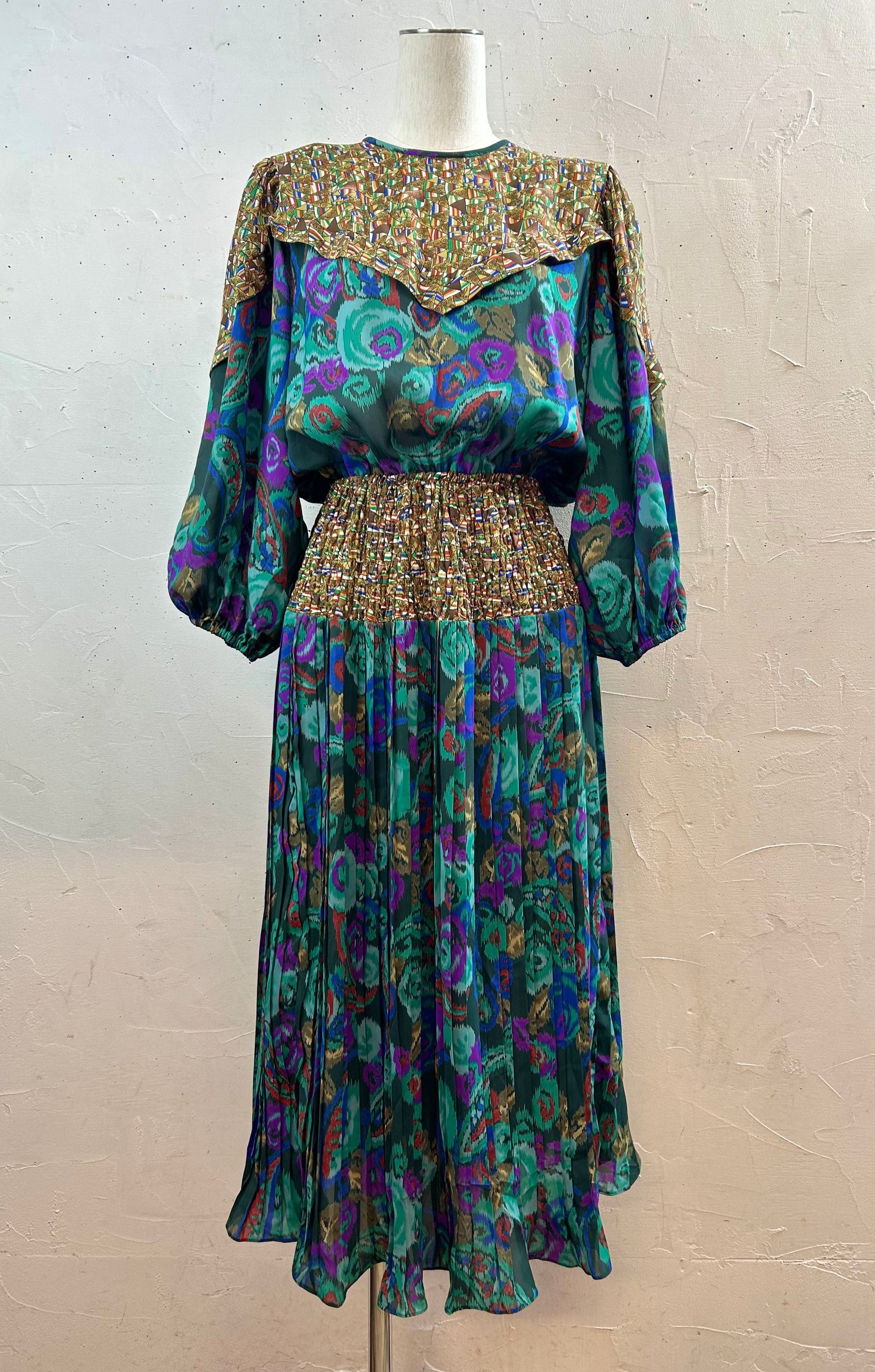 ストライプと三角模様のパターンとモザイクフラワーペイズリーパターンの組み合わせが存在感を放つ一着。