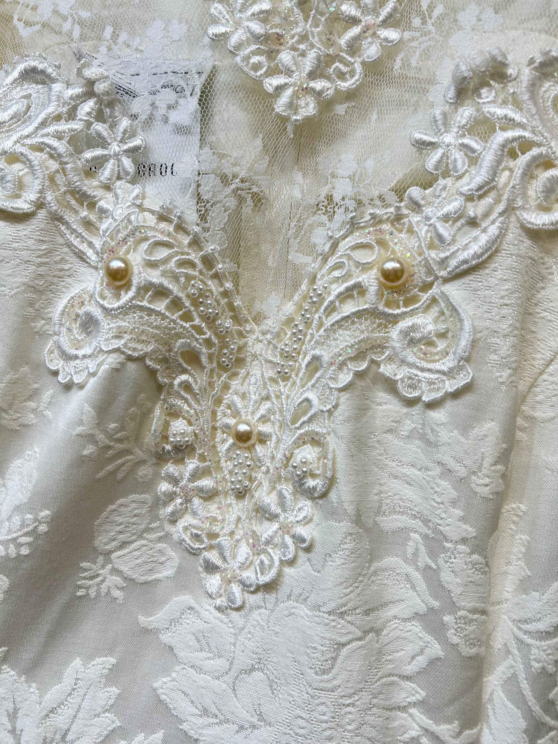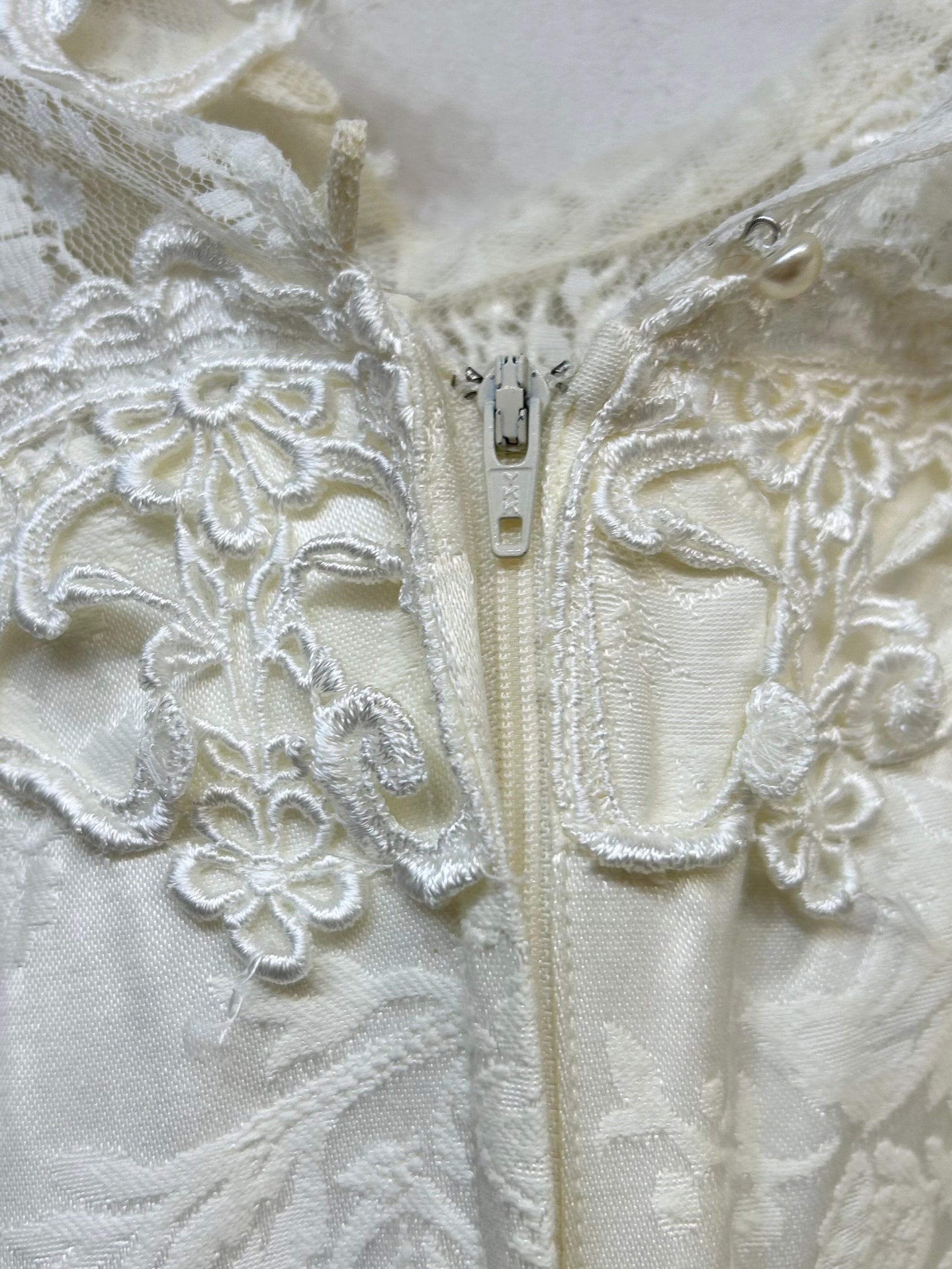レースのヨーク切替が美しく、ビーズやラメも贅沢に施された華やかなデザインが魅力的で、Iラインに近いメリハリのあるシルエットも美しく、どこから見ても抜かりない素晴らしいアイテムです。