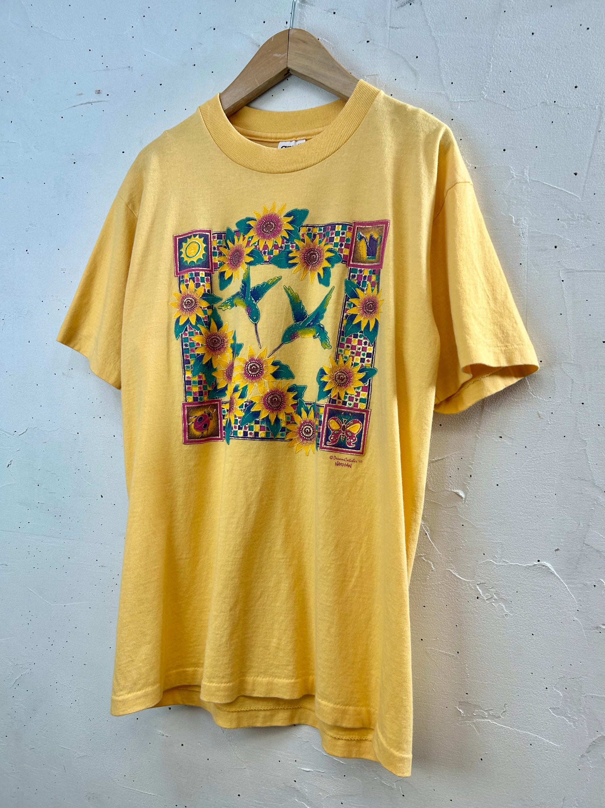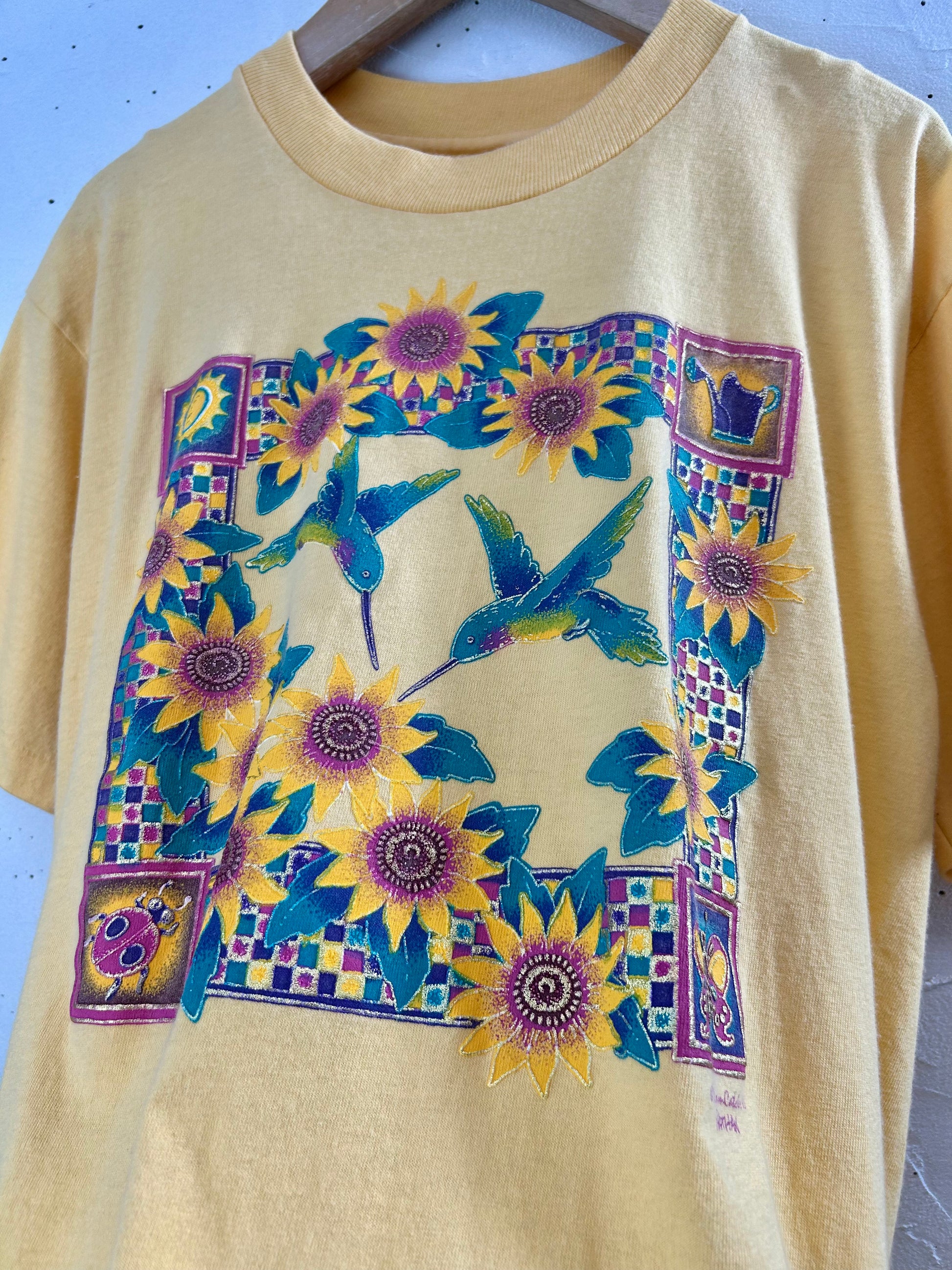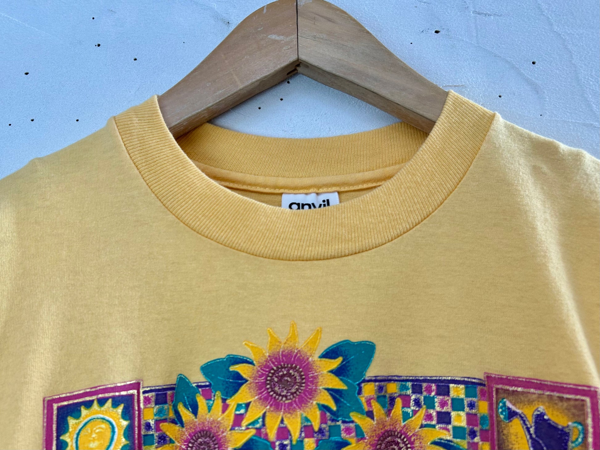 anvilの山吹色ボディに、ひまわりやハチドリのハッピーなプリントがキュートな一着。