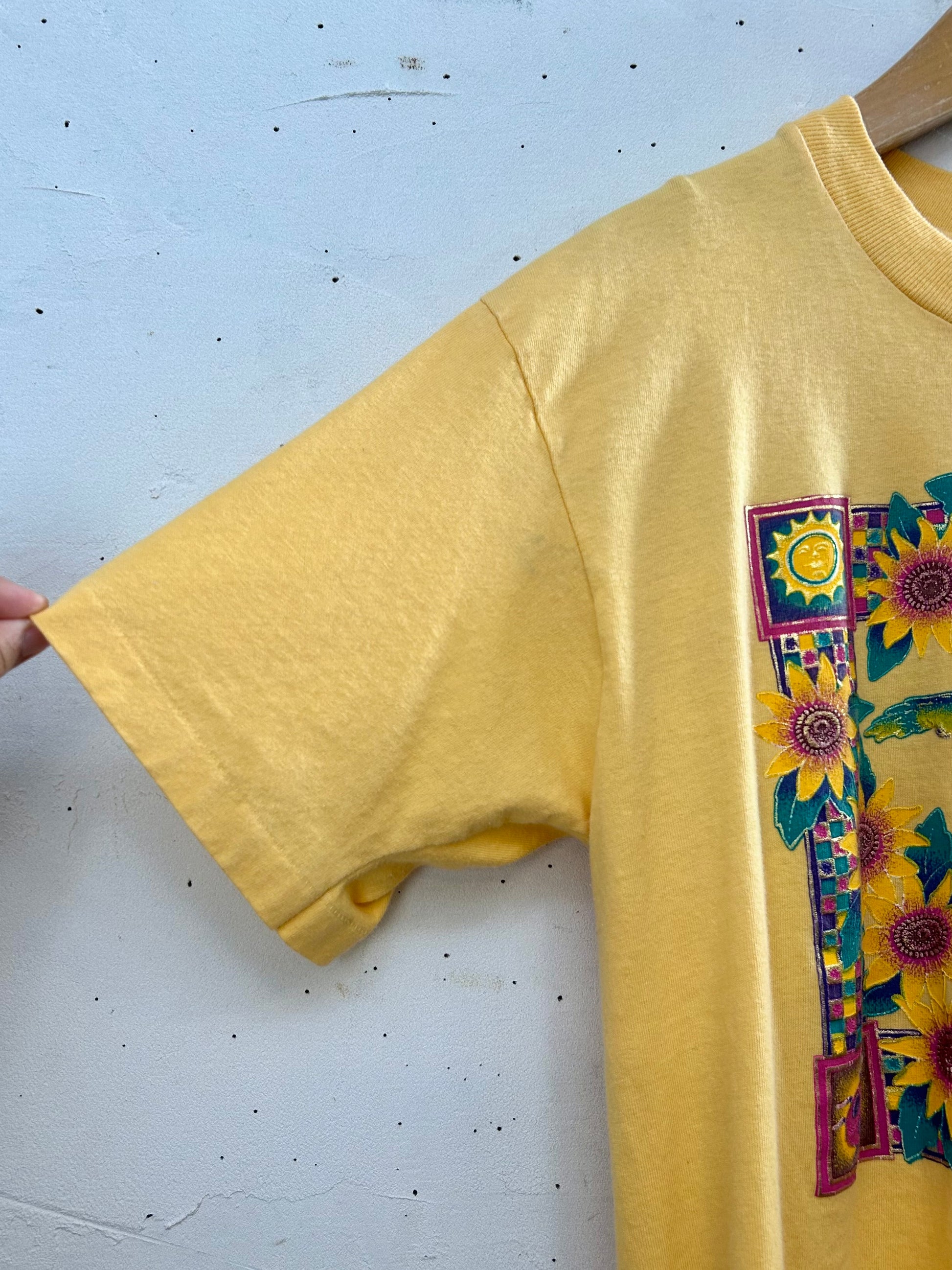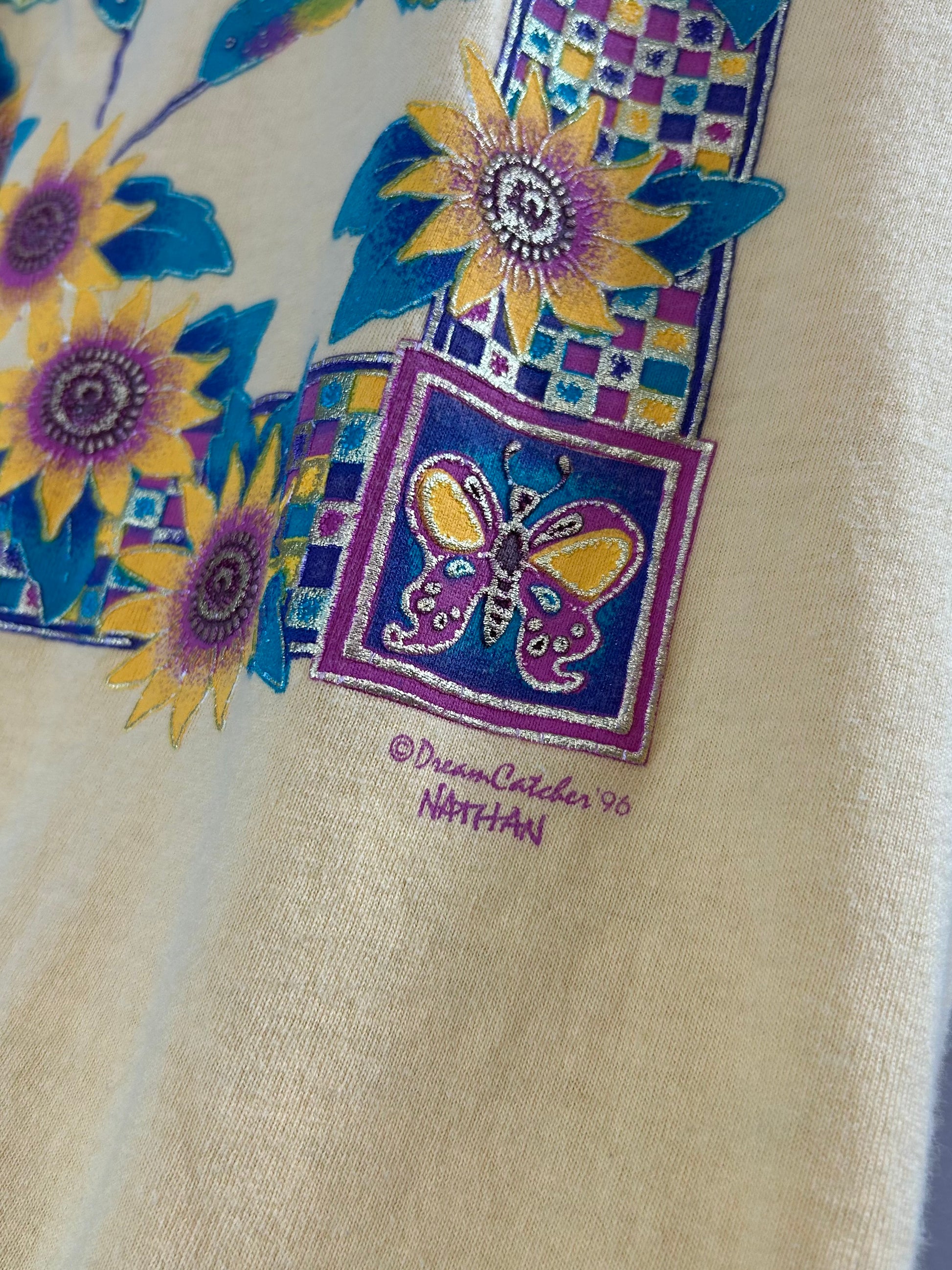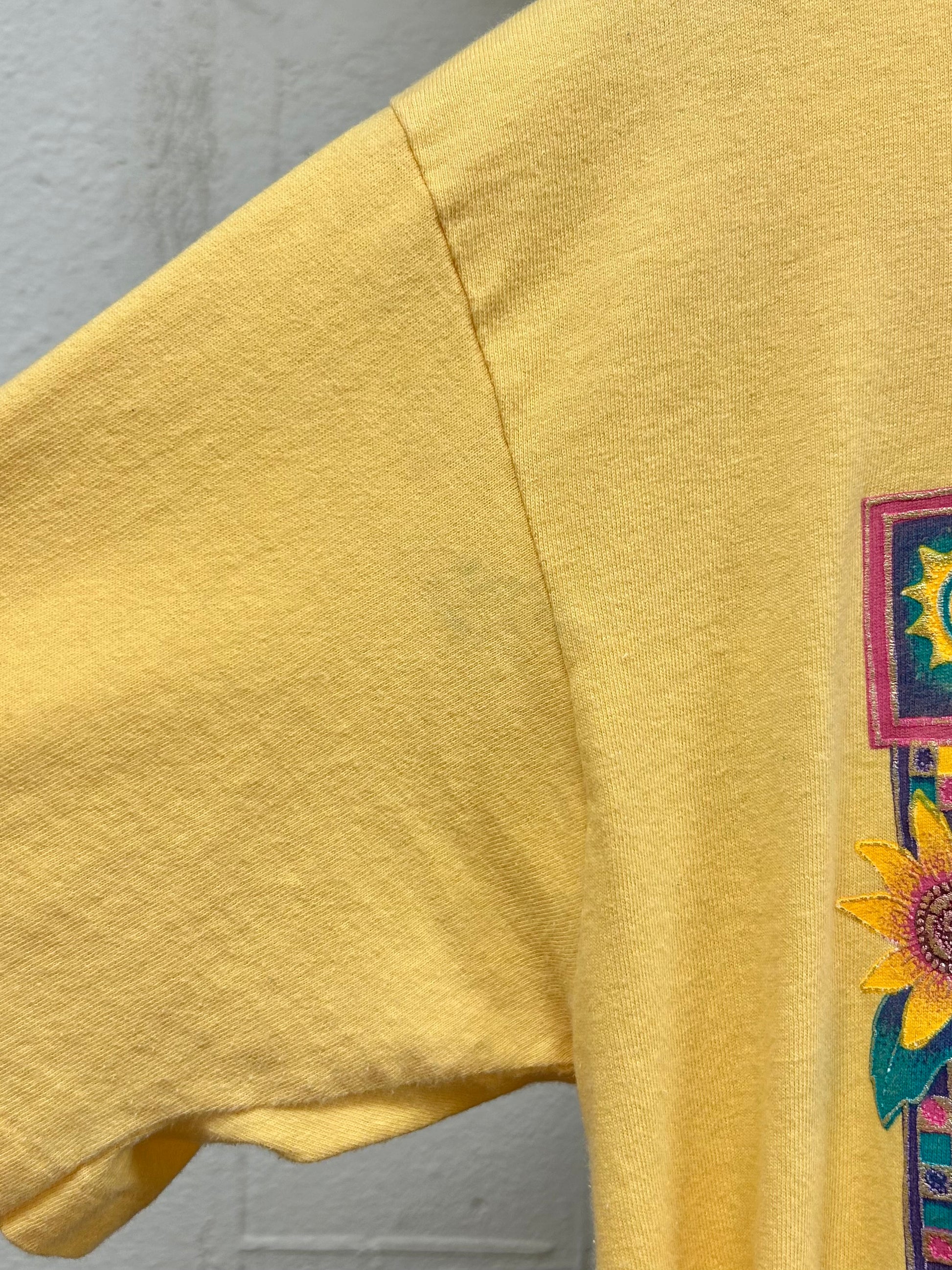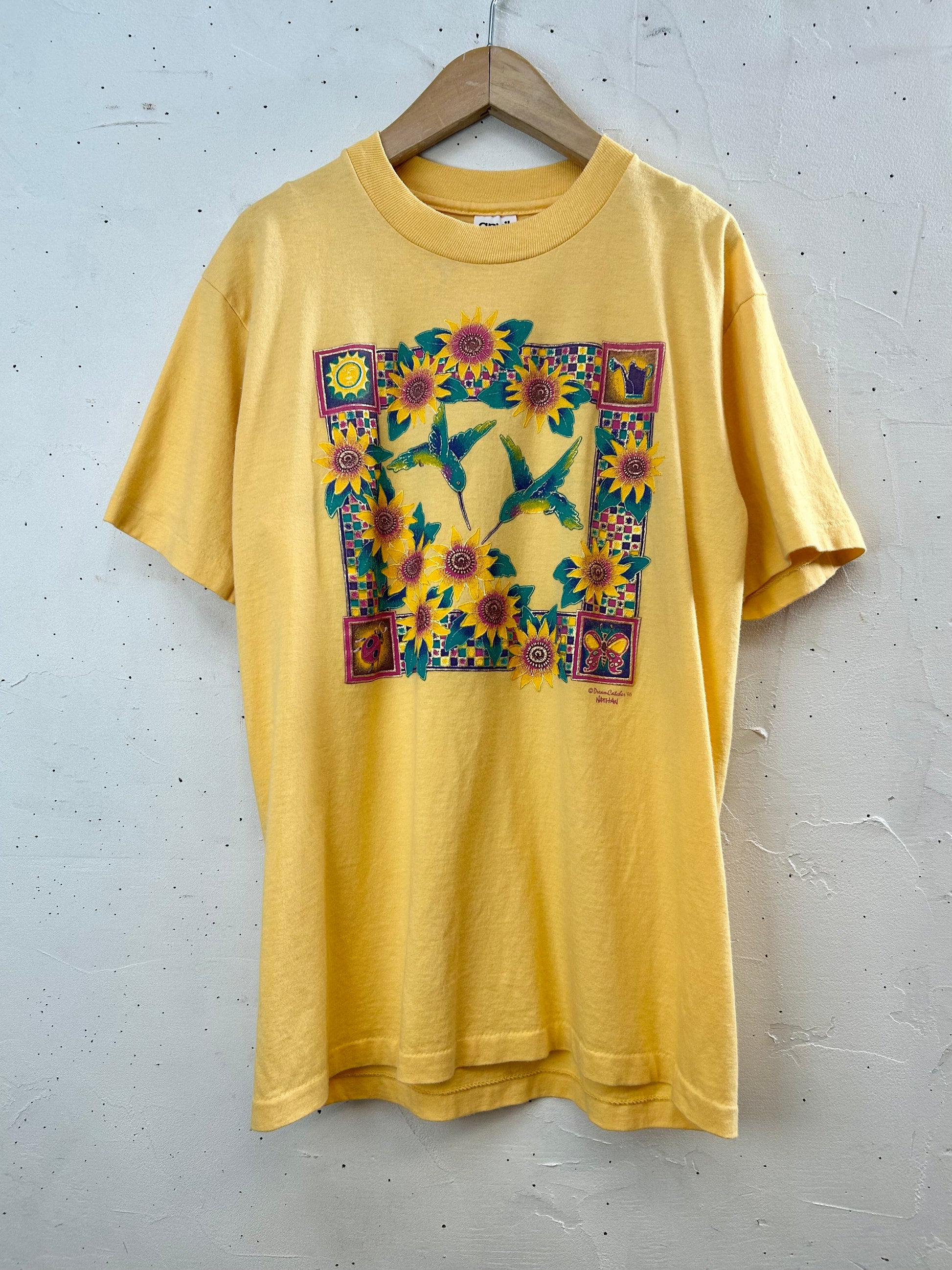 anvilの山吹色ボディに、ひまわりやハチドリのハッピーなプリントがキュートな一着。