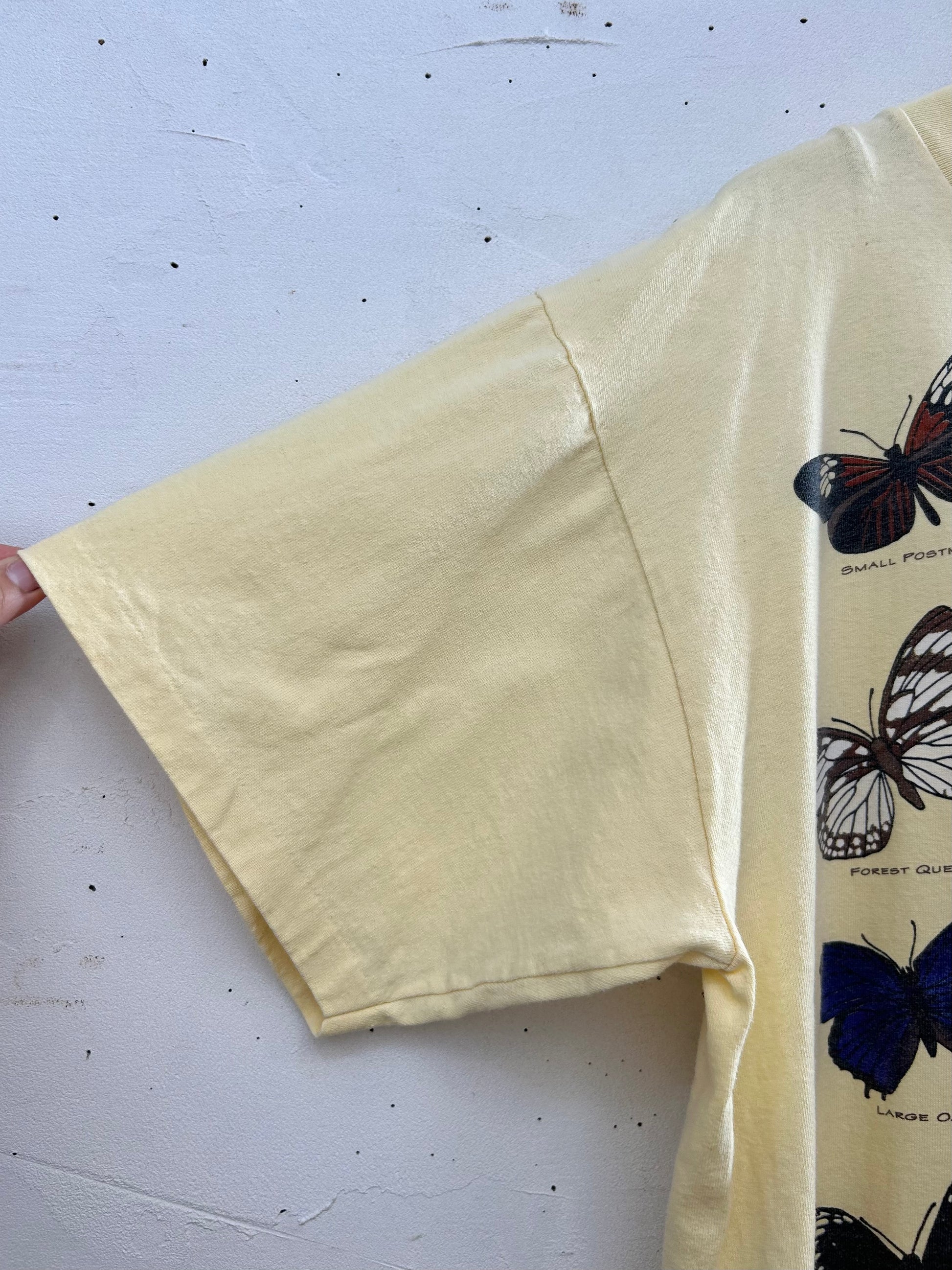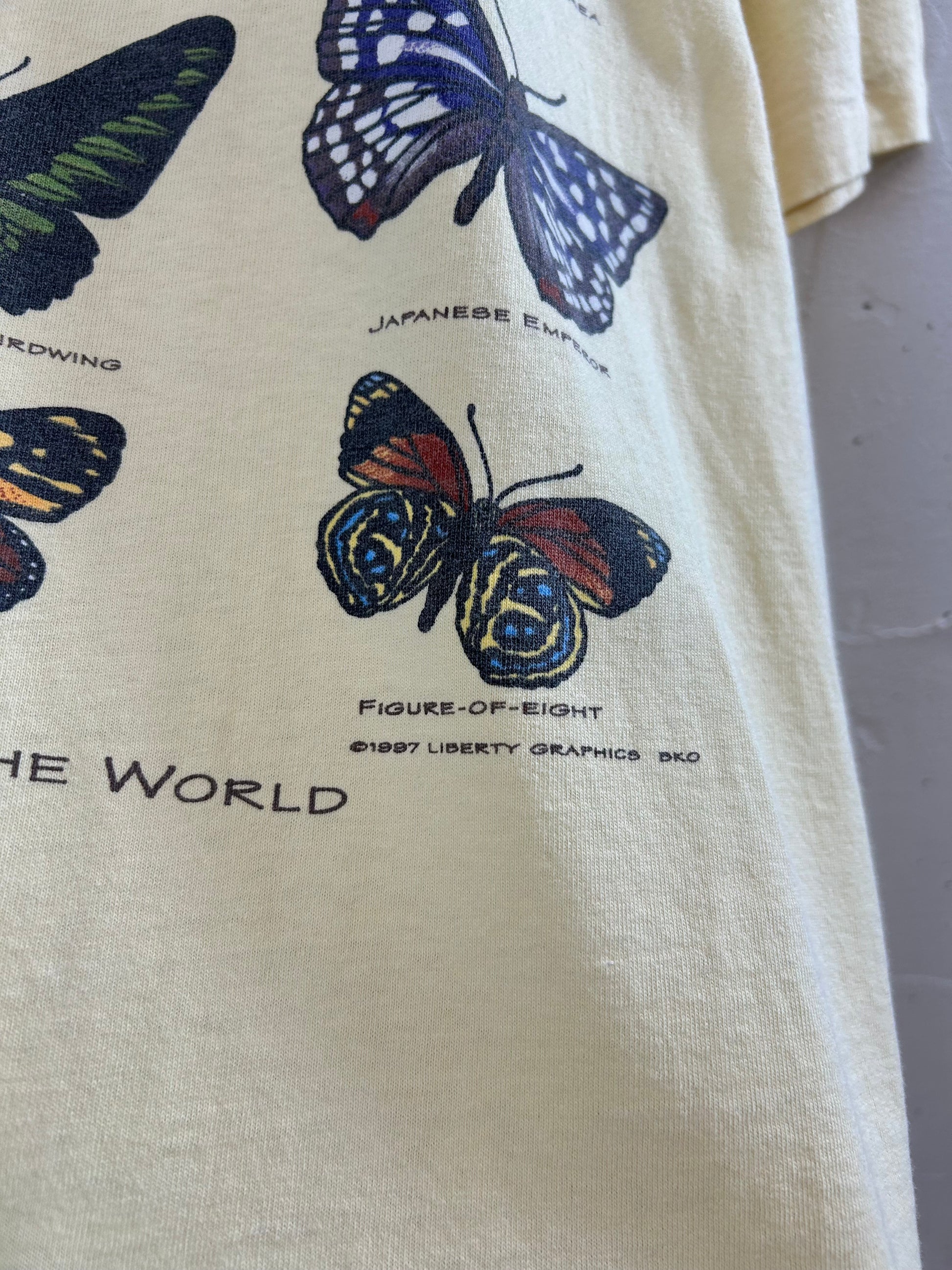 柔らかなイエローボディに、様々な蝶々がプリントされた1着。