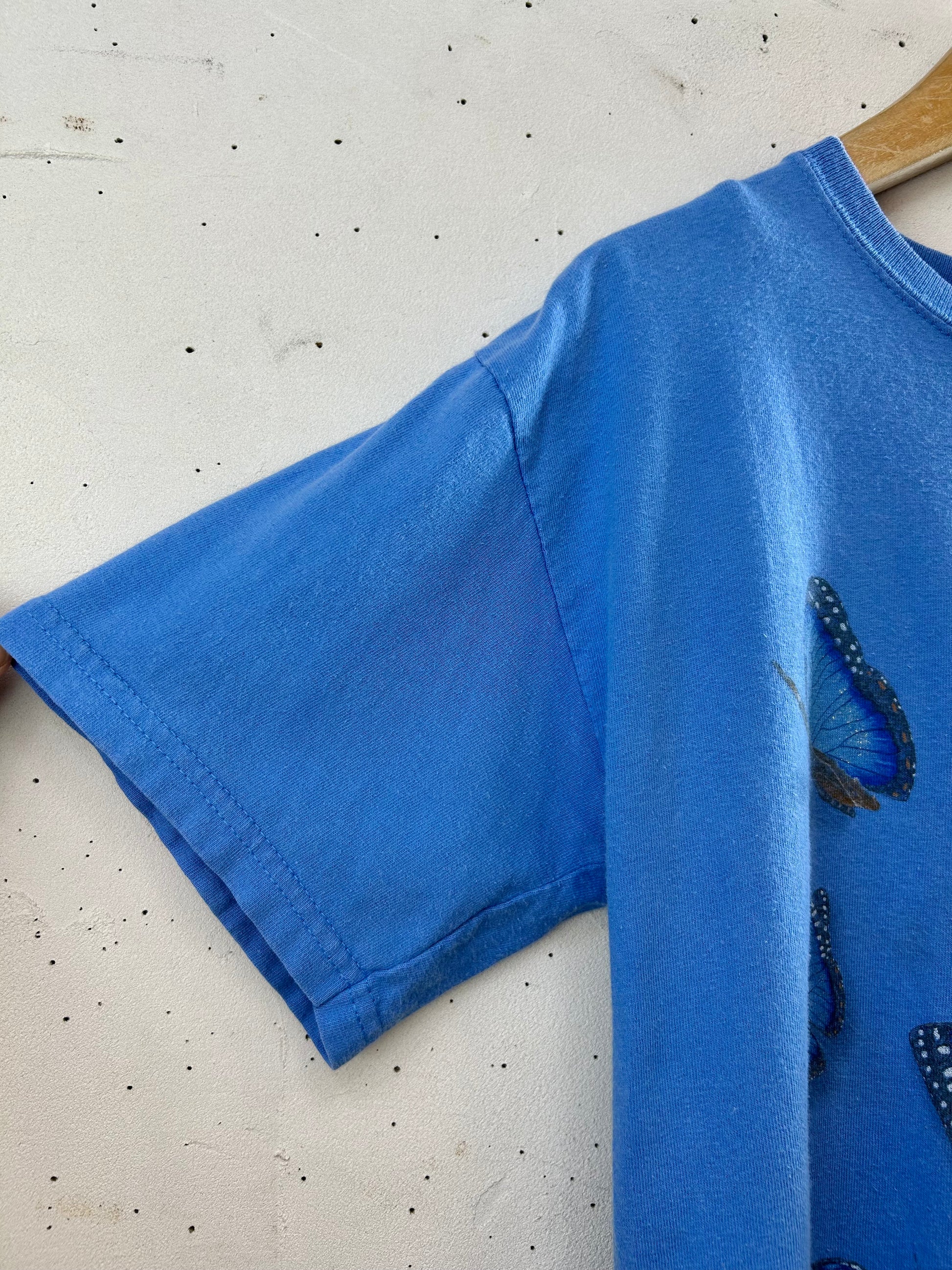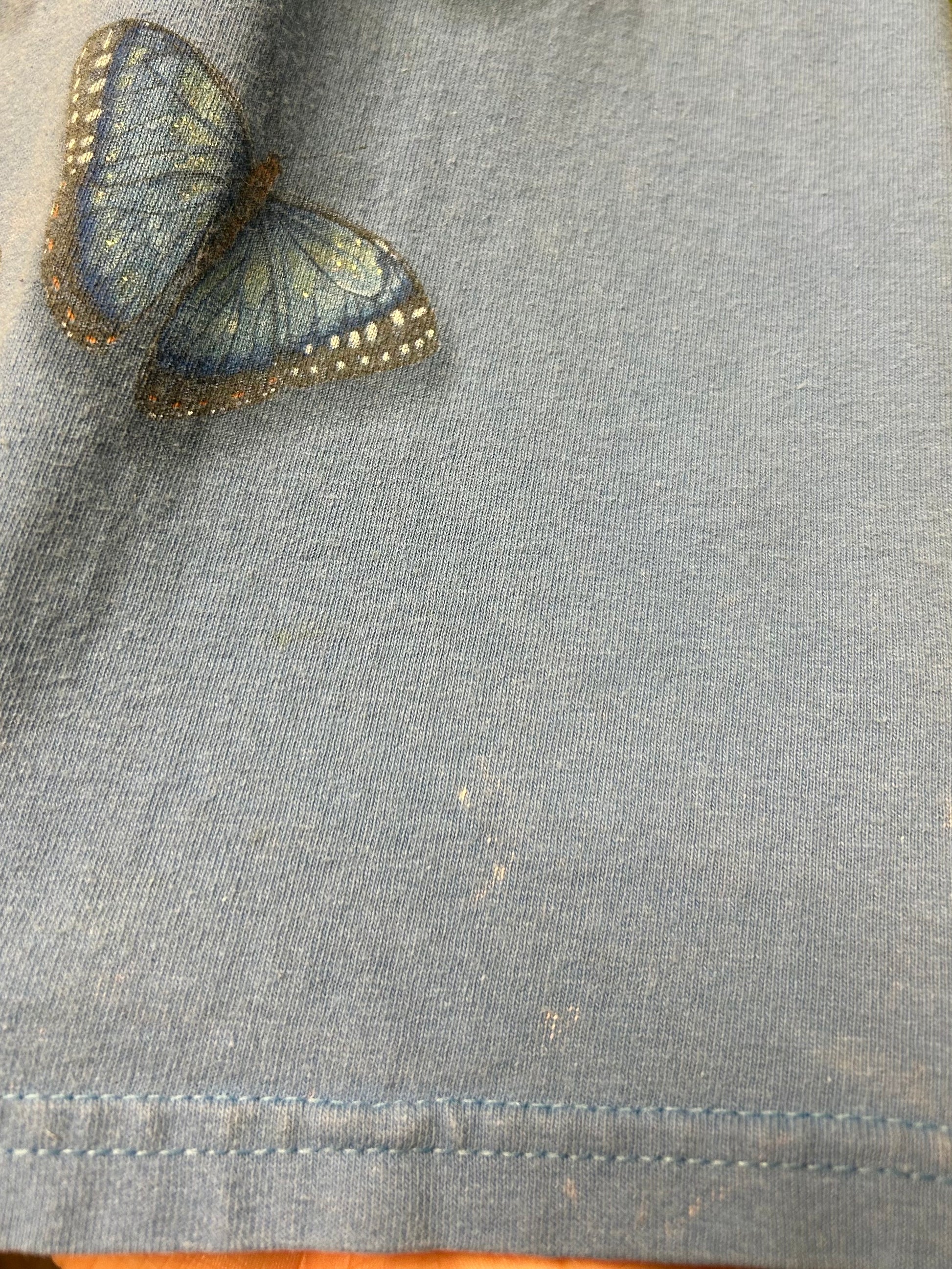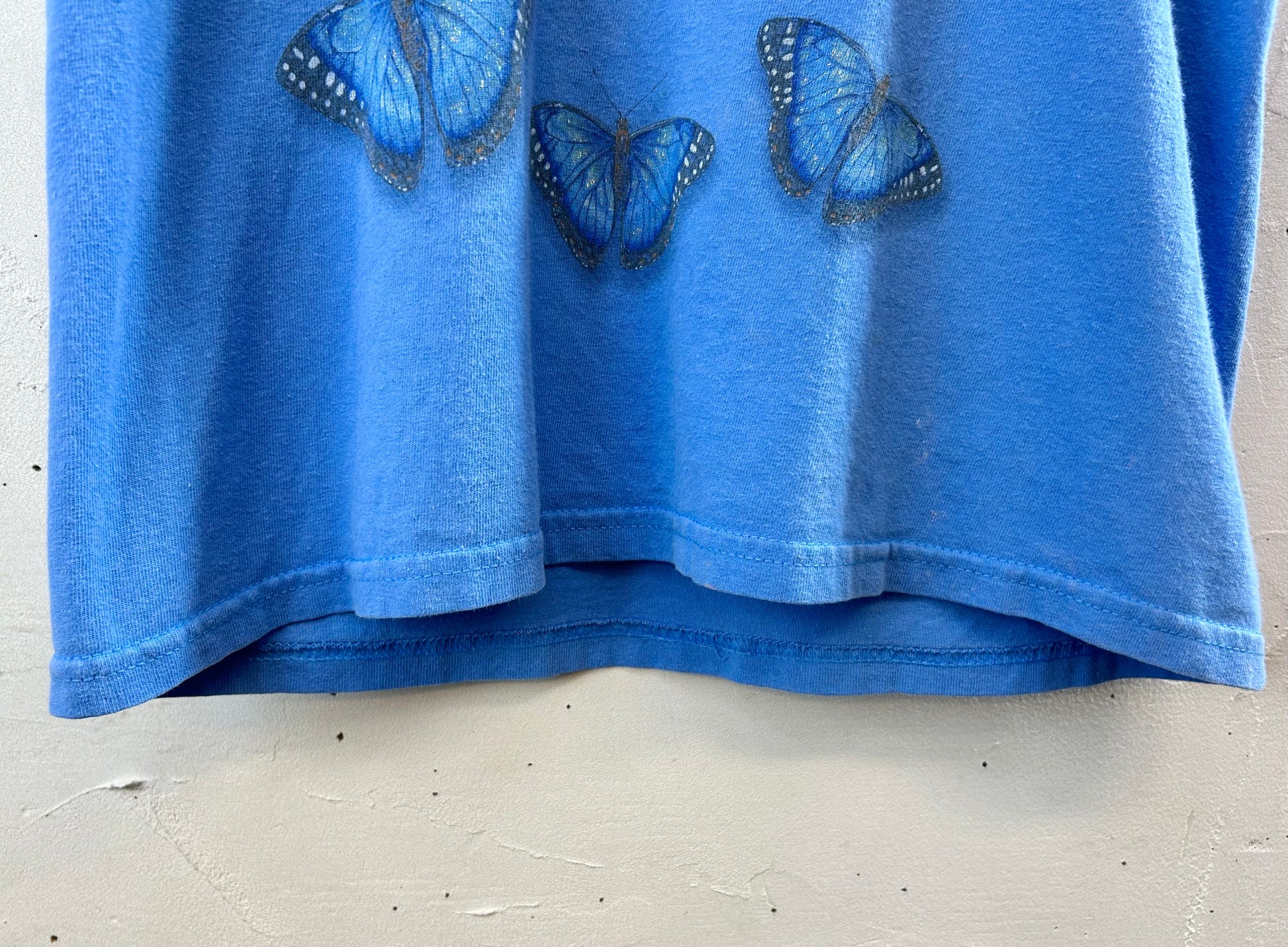 くすみブルーボディに、綺麗な蝶々が両面にプリントされた1着。