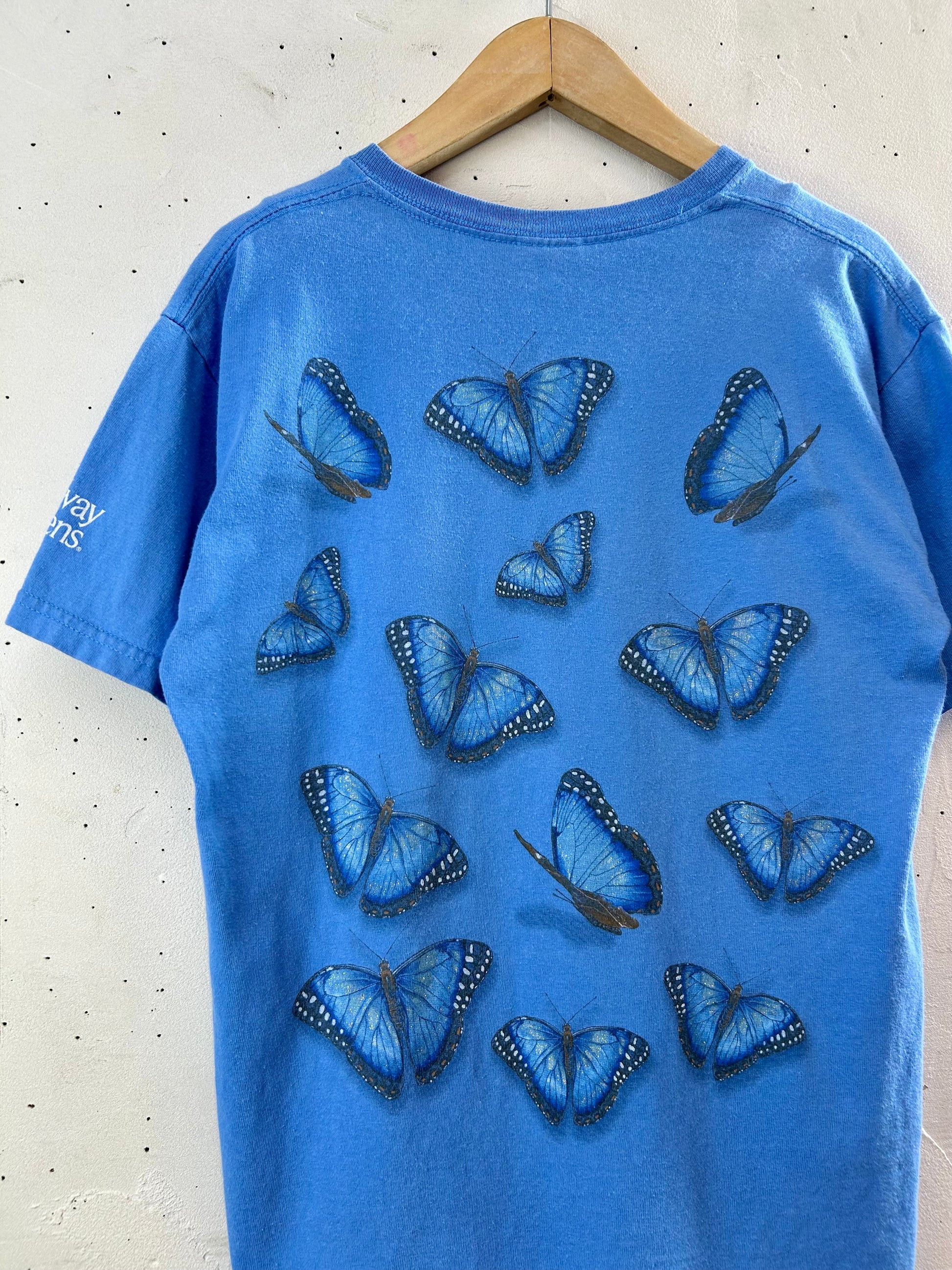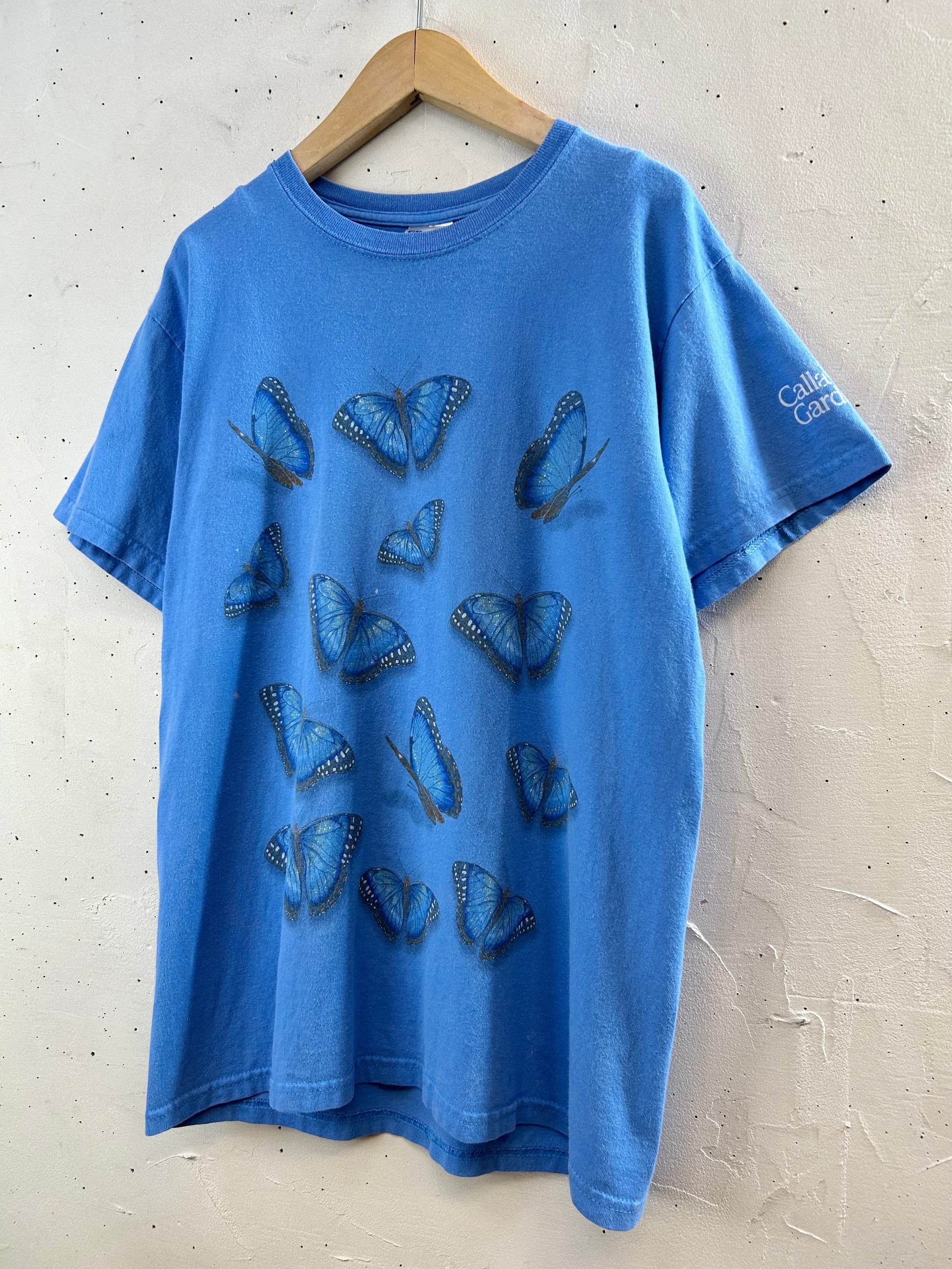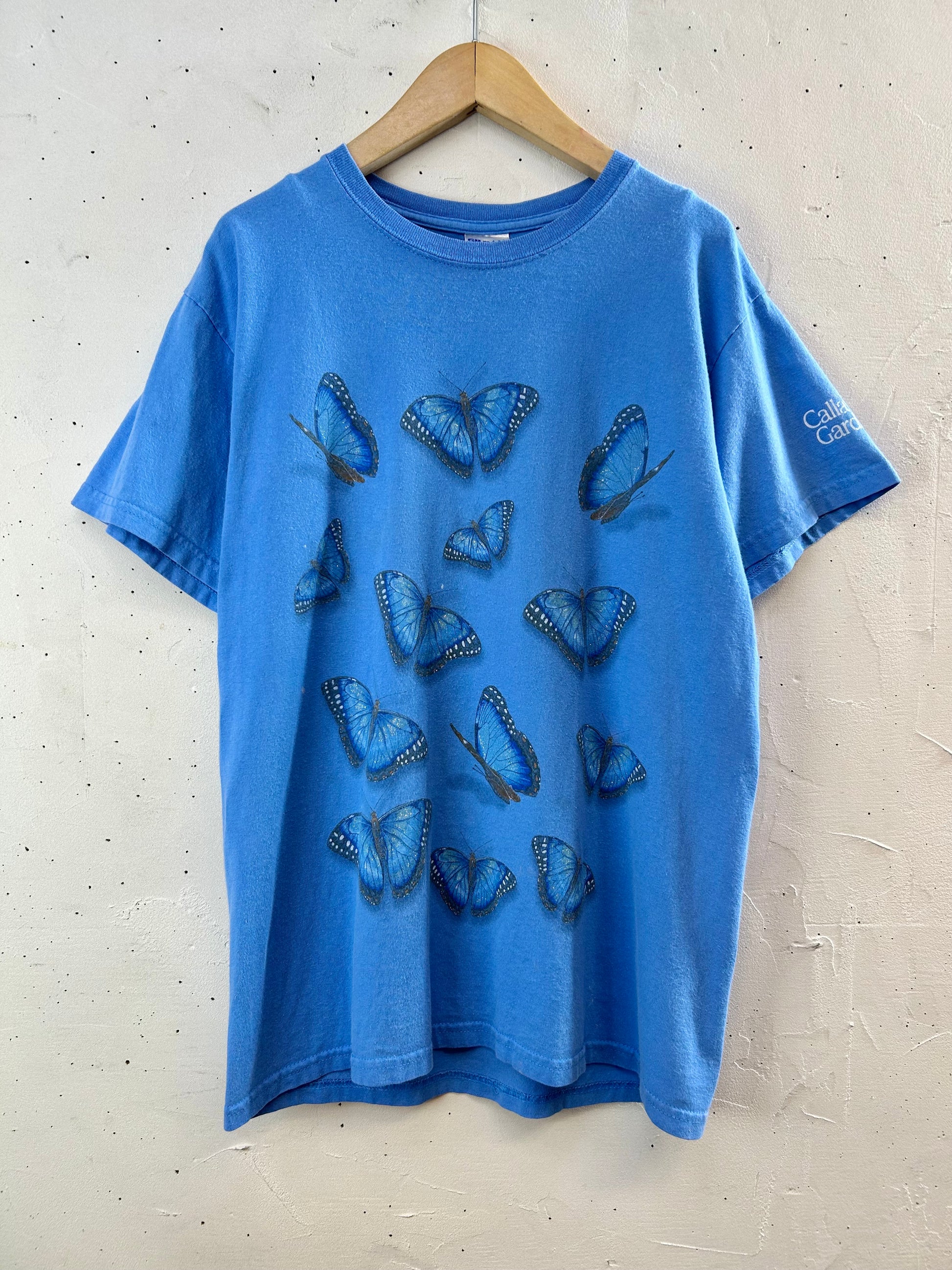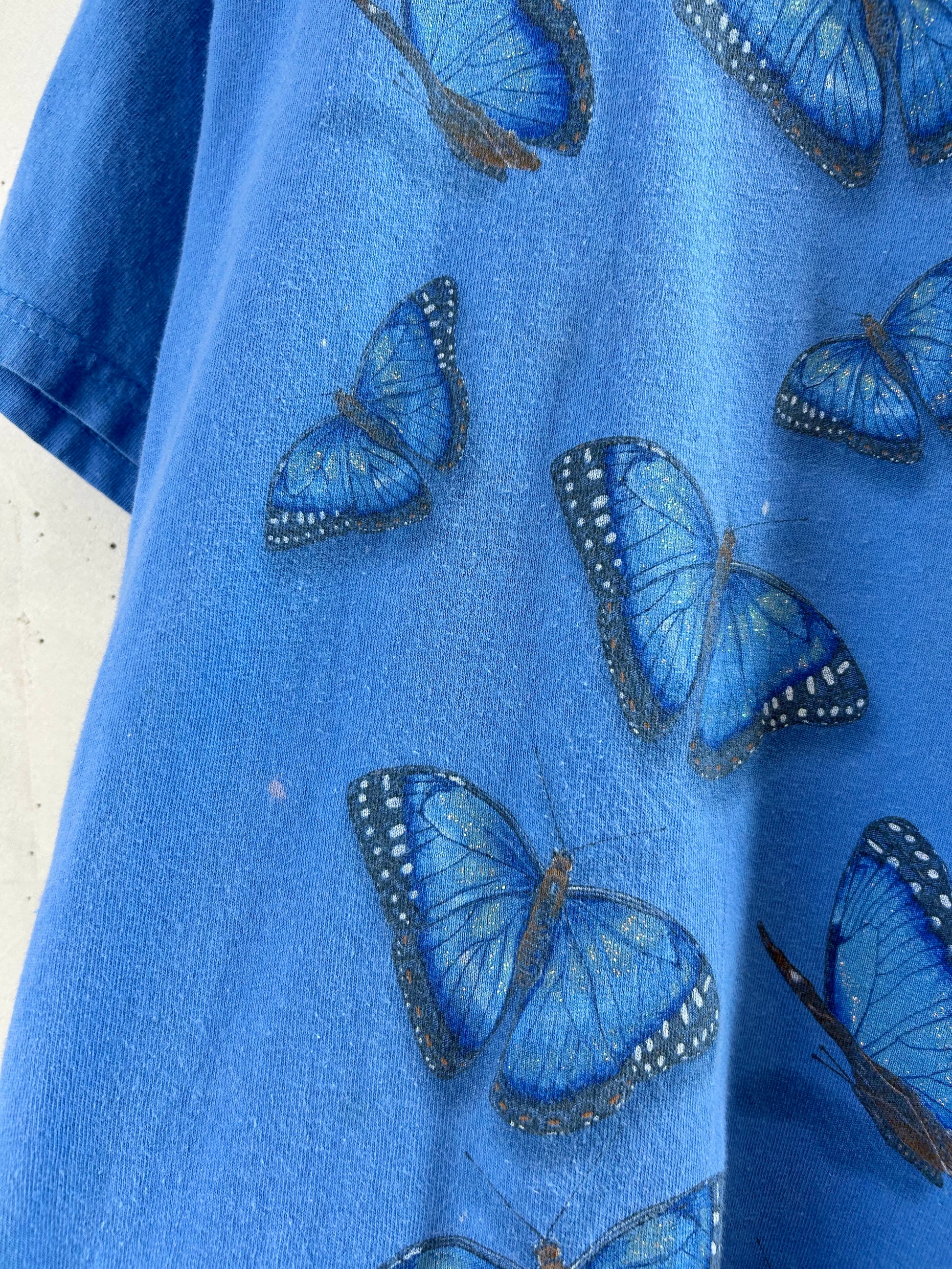くすみブルーボディに、綺麗な蝶々が両面にプリントされた1着。