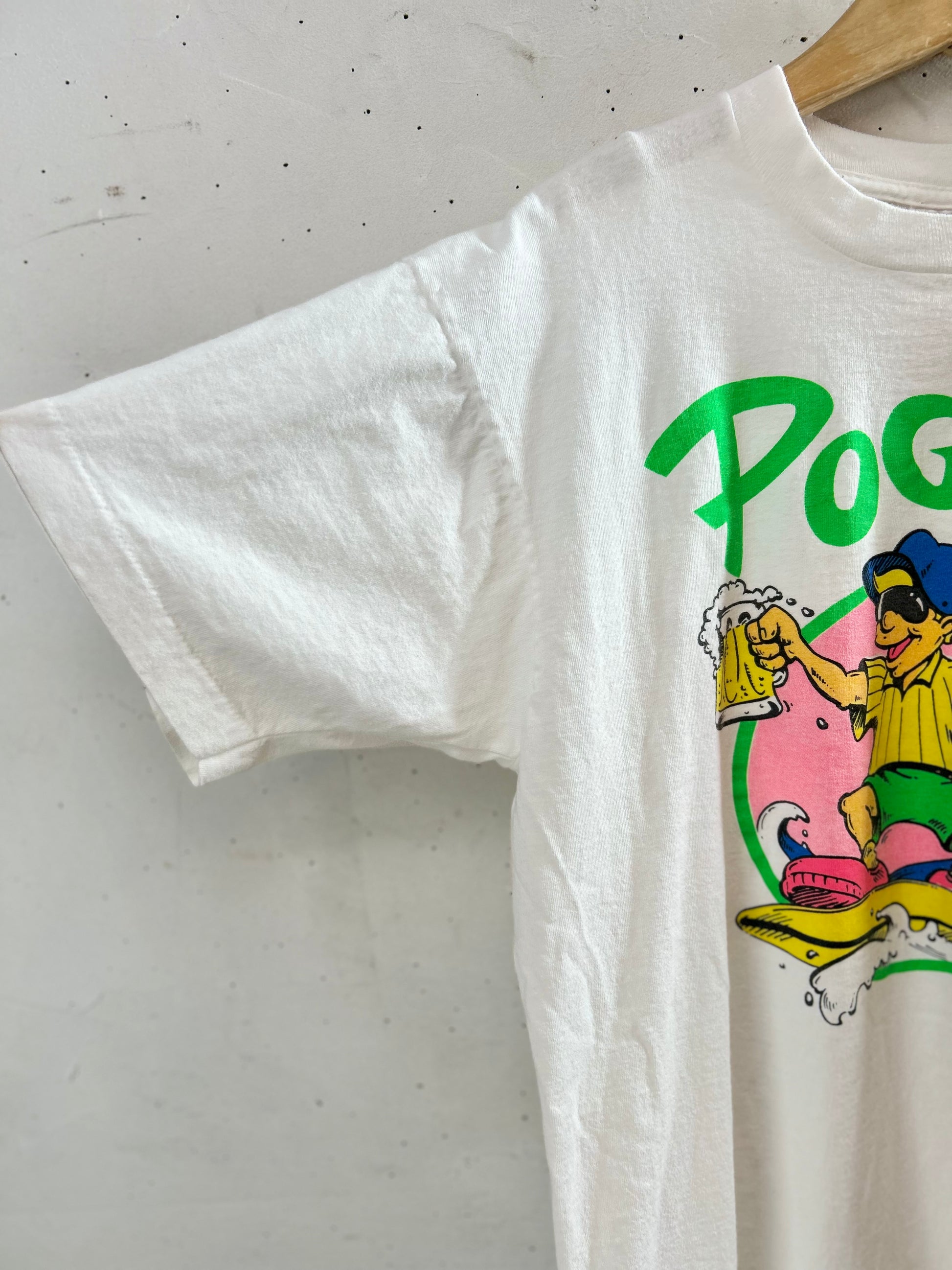 FRUIT OF THE LOOMのボディに、ハンバーガーとビールを持ち波に乗りノリノリな男のプリントがUSビンテージTシャツ。