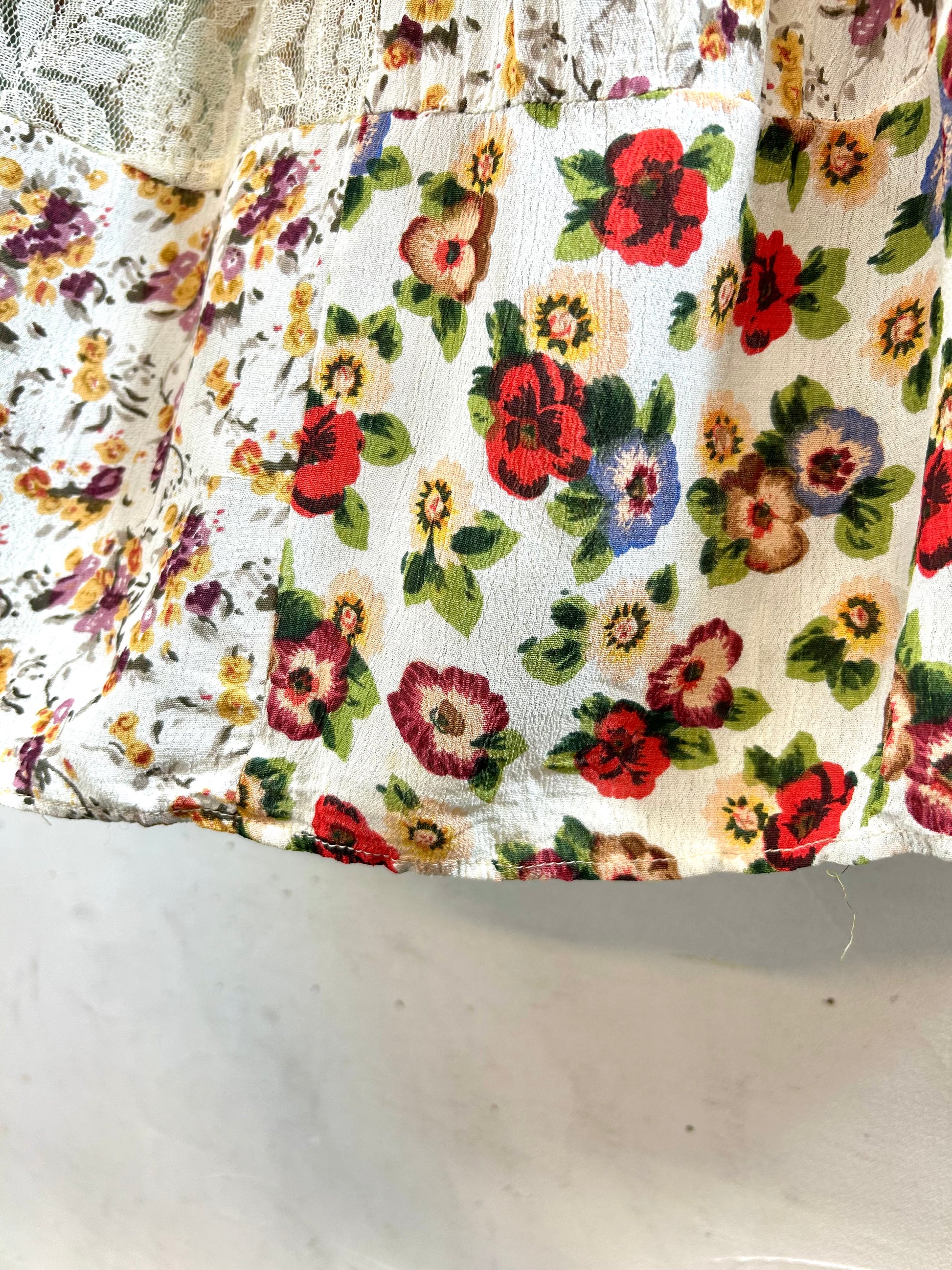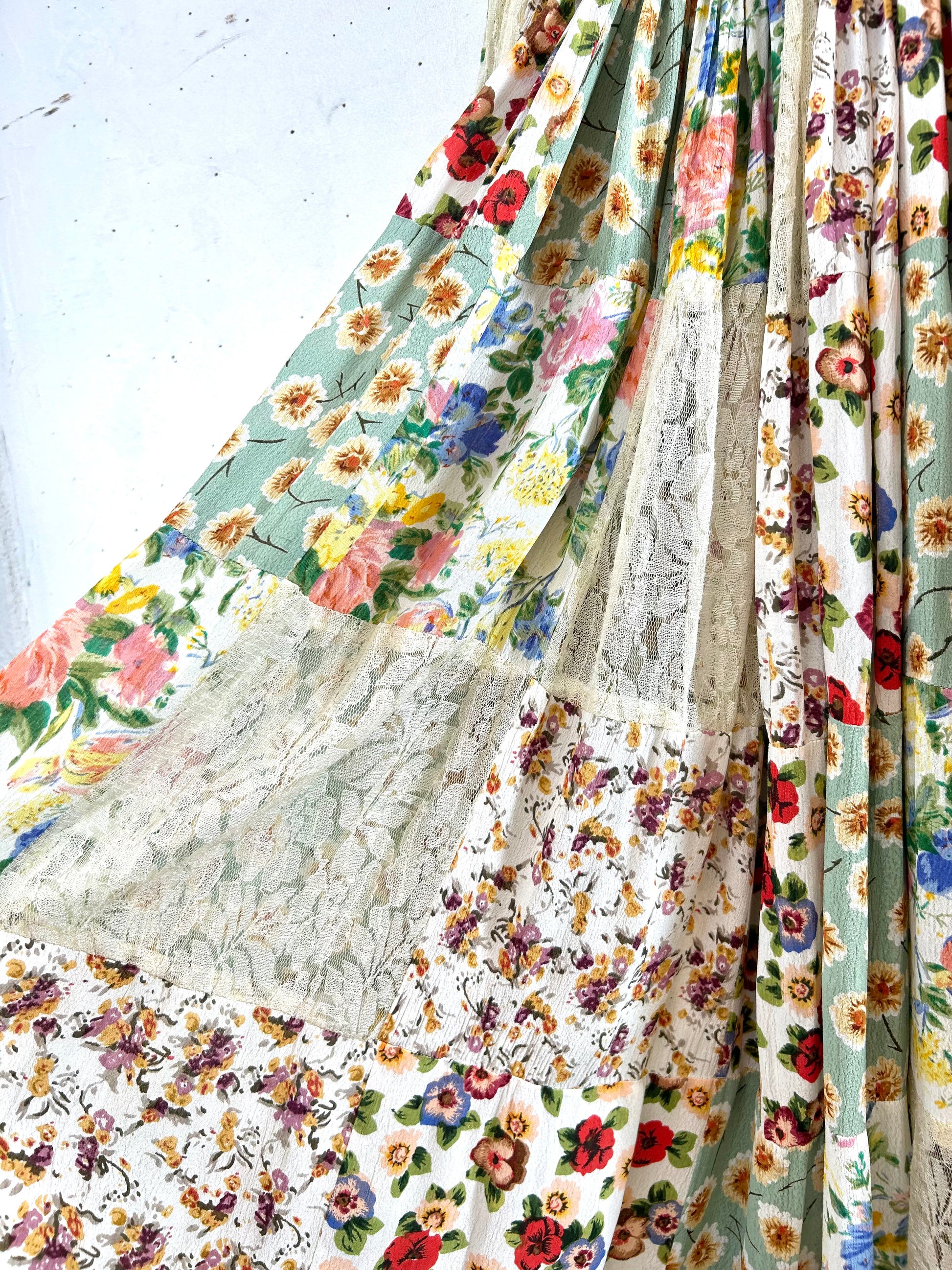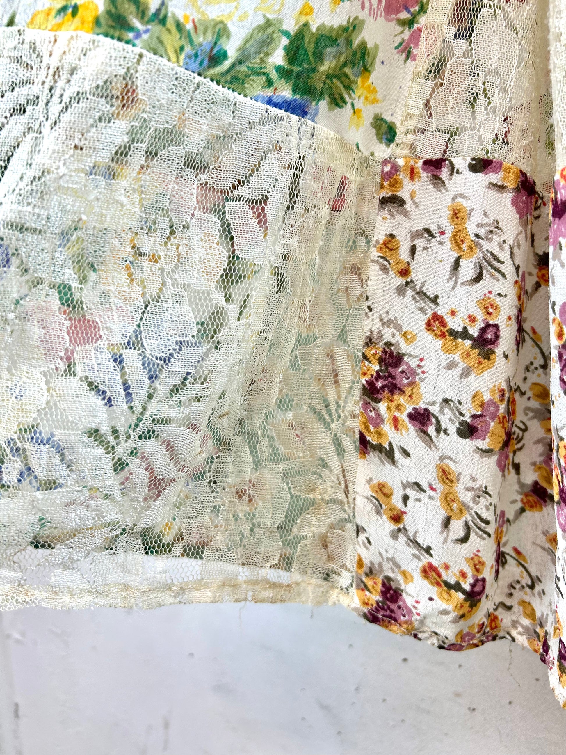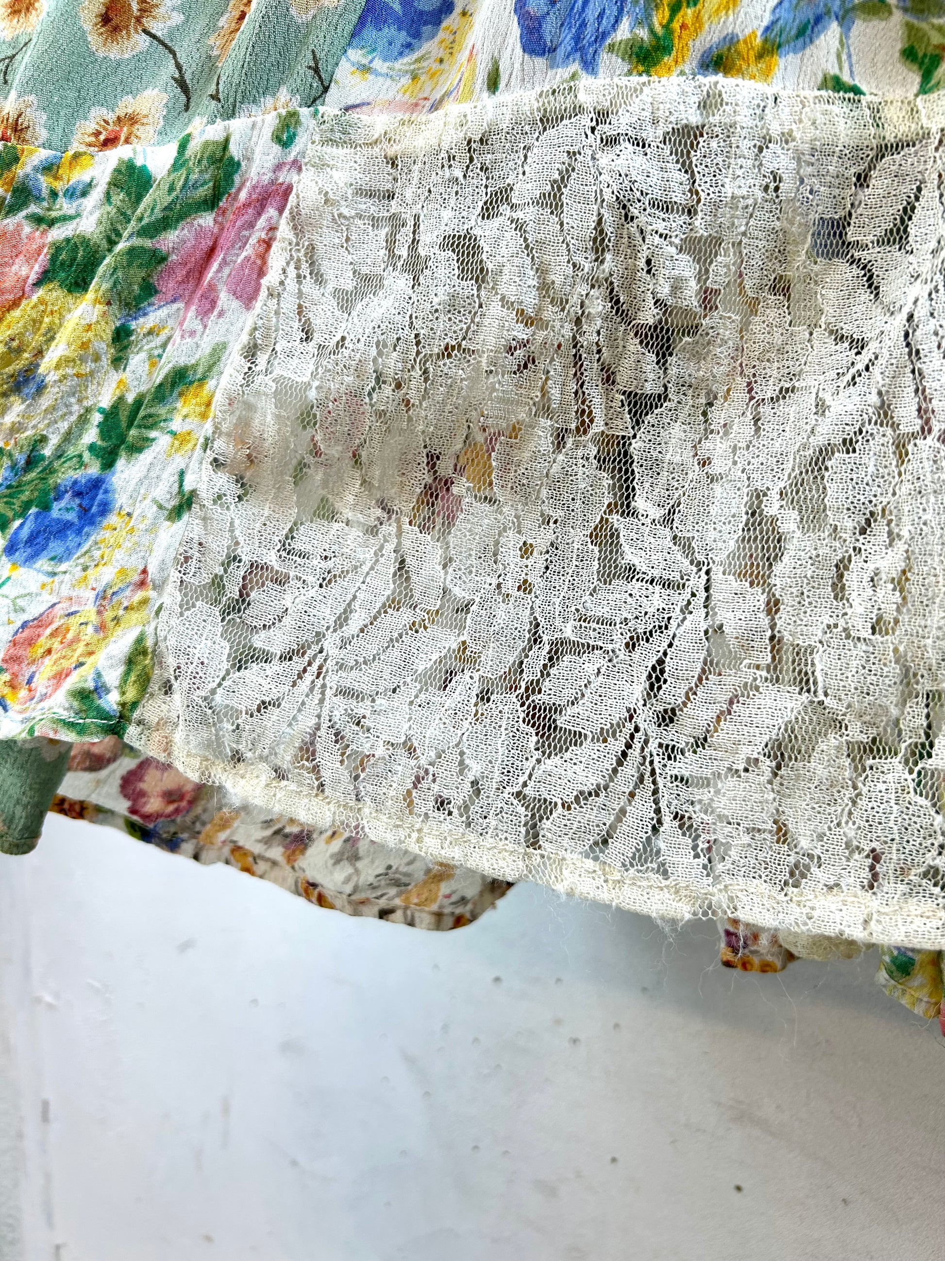 たっぷりと使われた様々な花柄の生地とレースの贅沢なパッチワークが目を奪います。