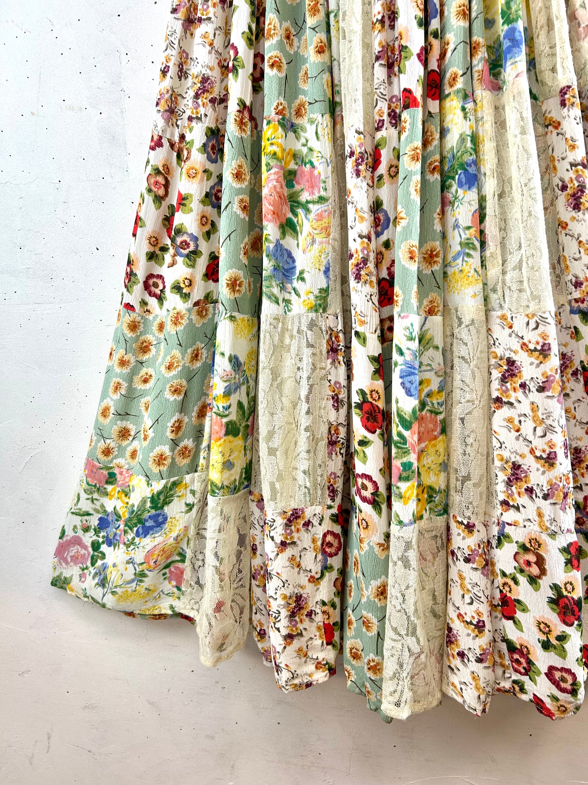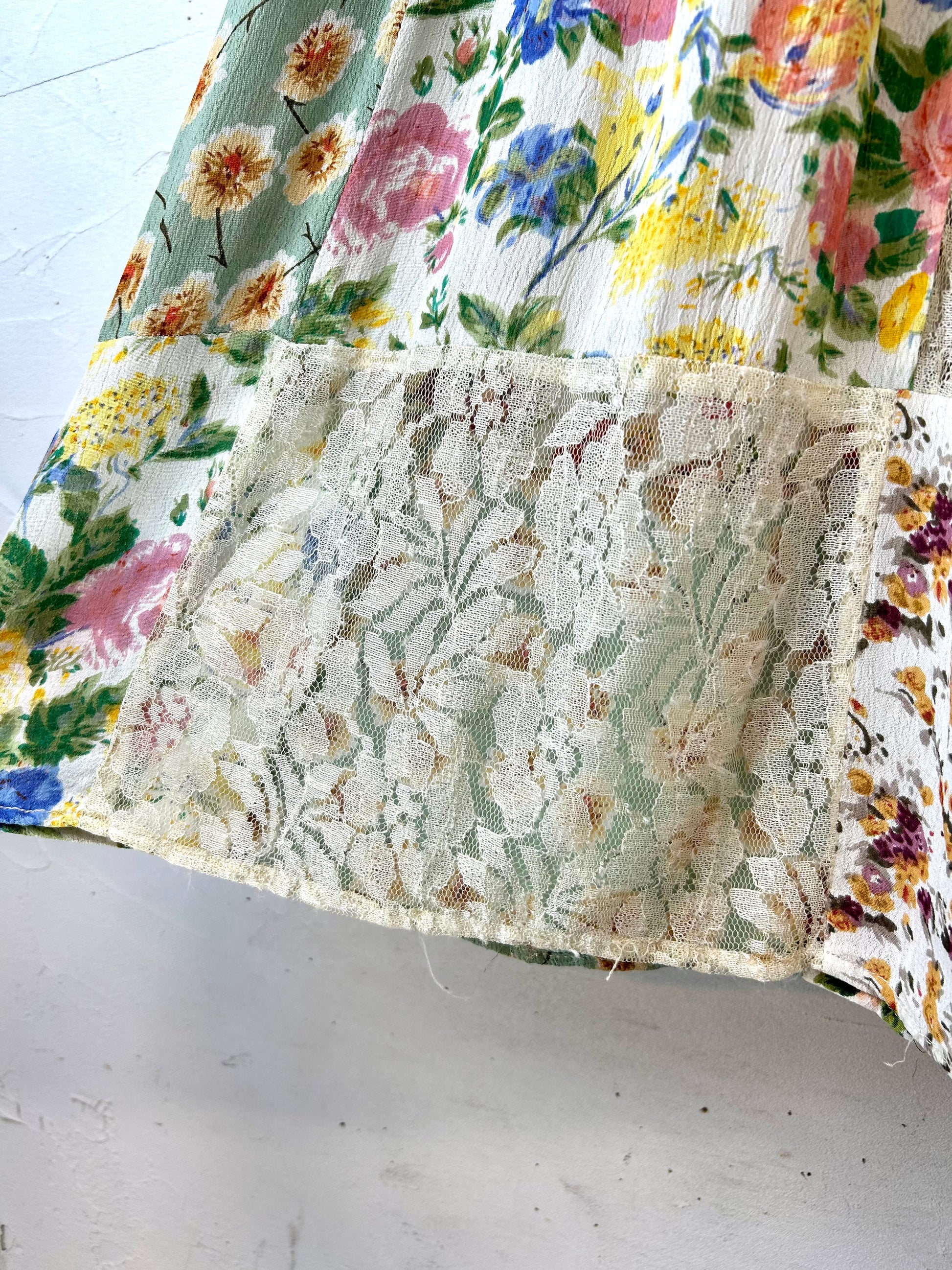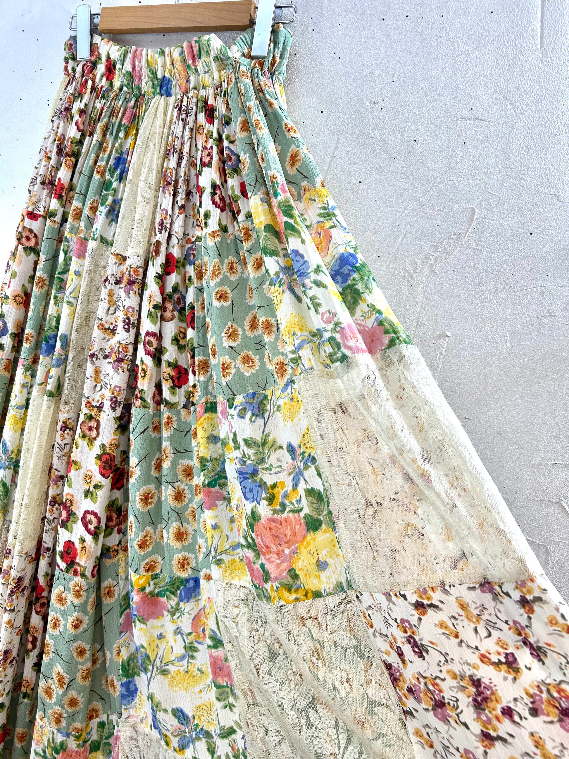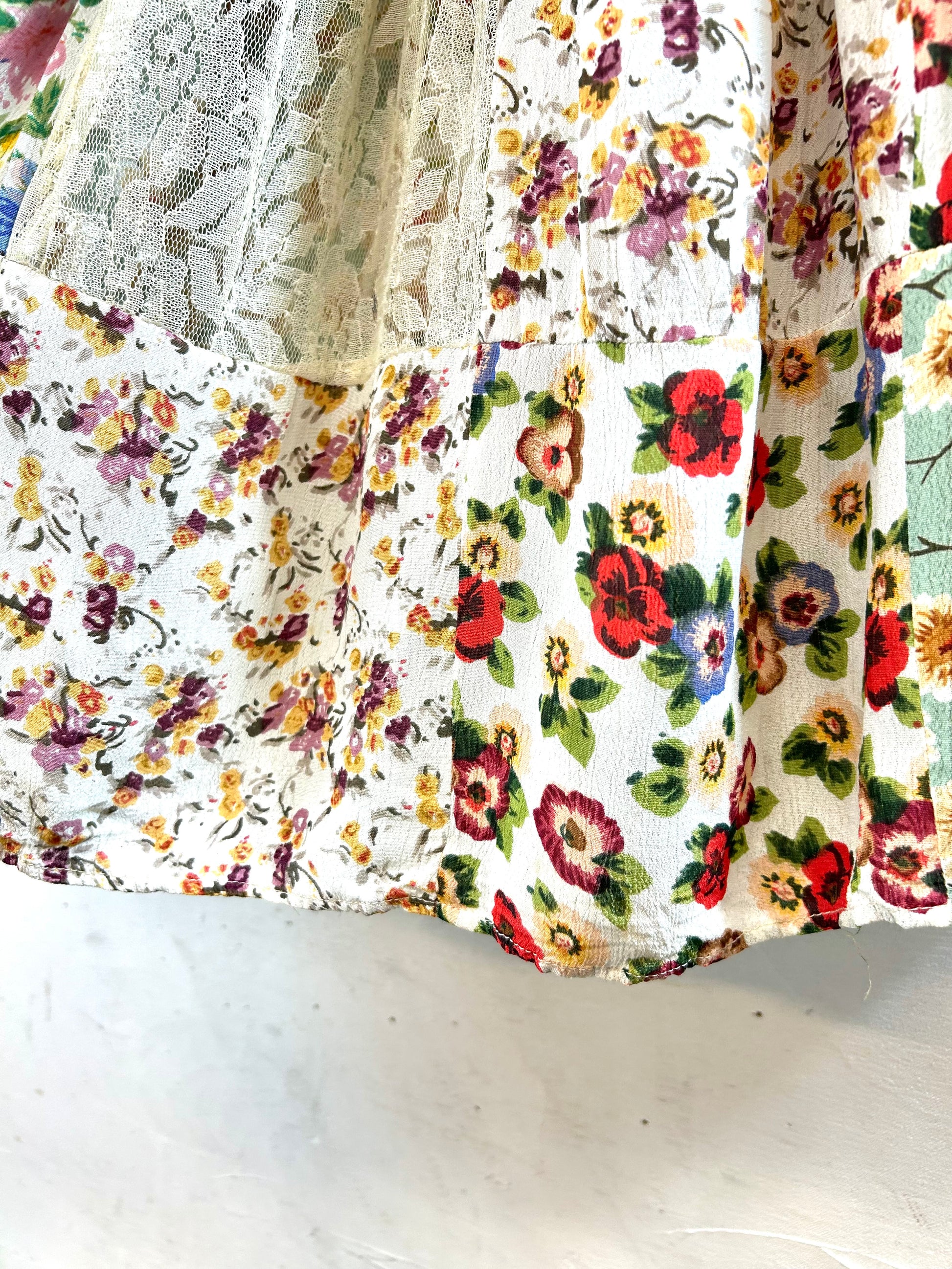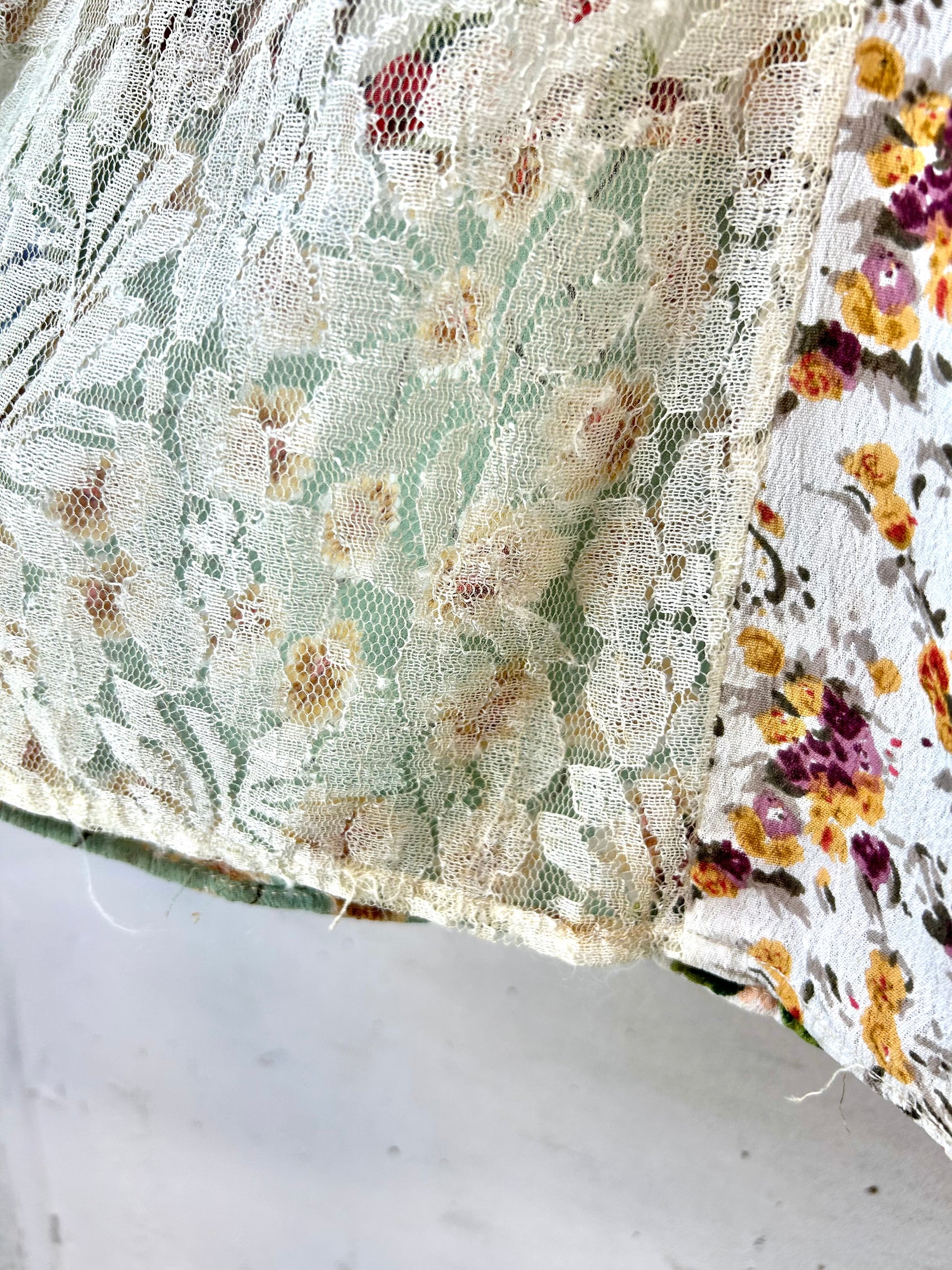 たっぷりと使われた様々な花柄の生地とレースの贅沢なパッチワークが目を奪います。