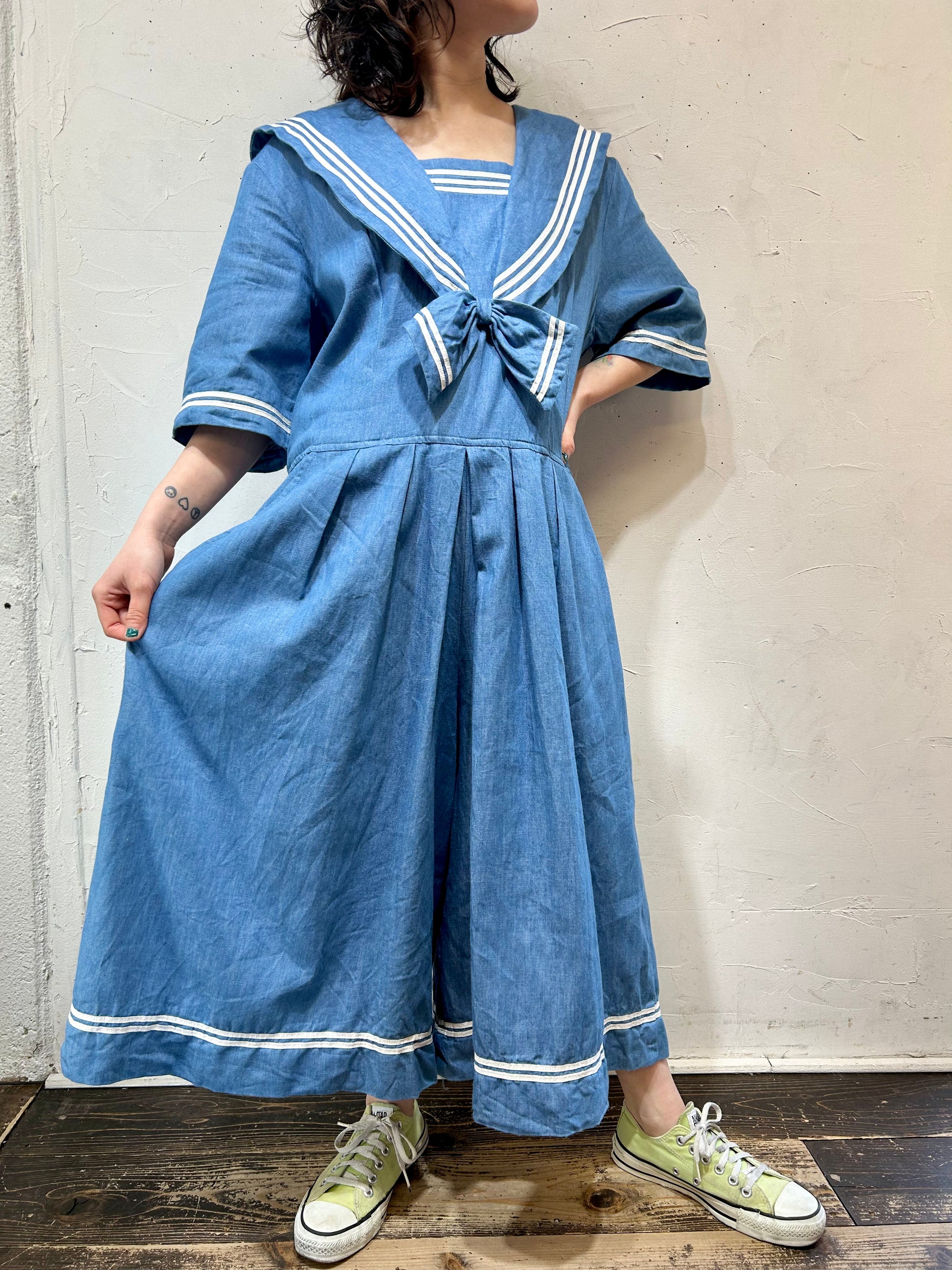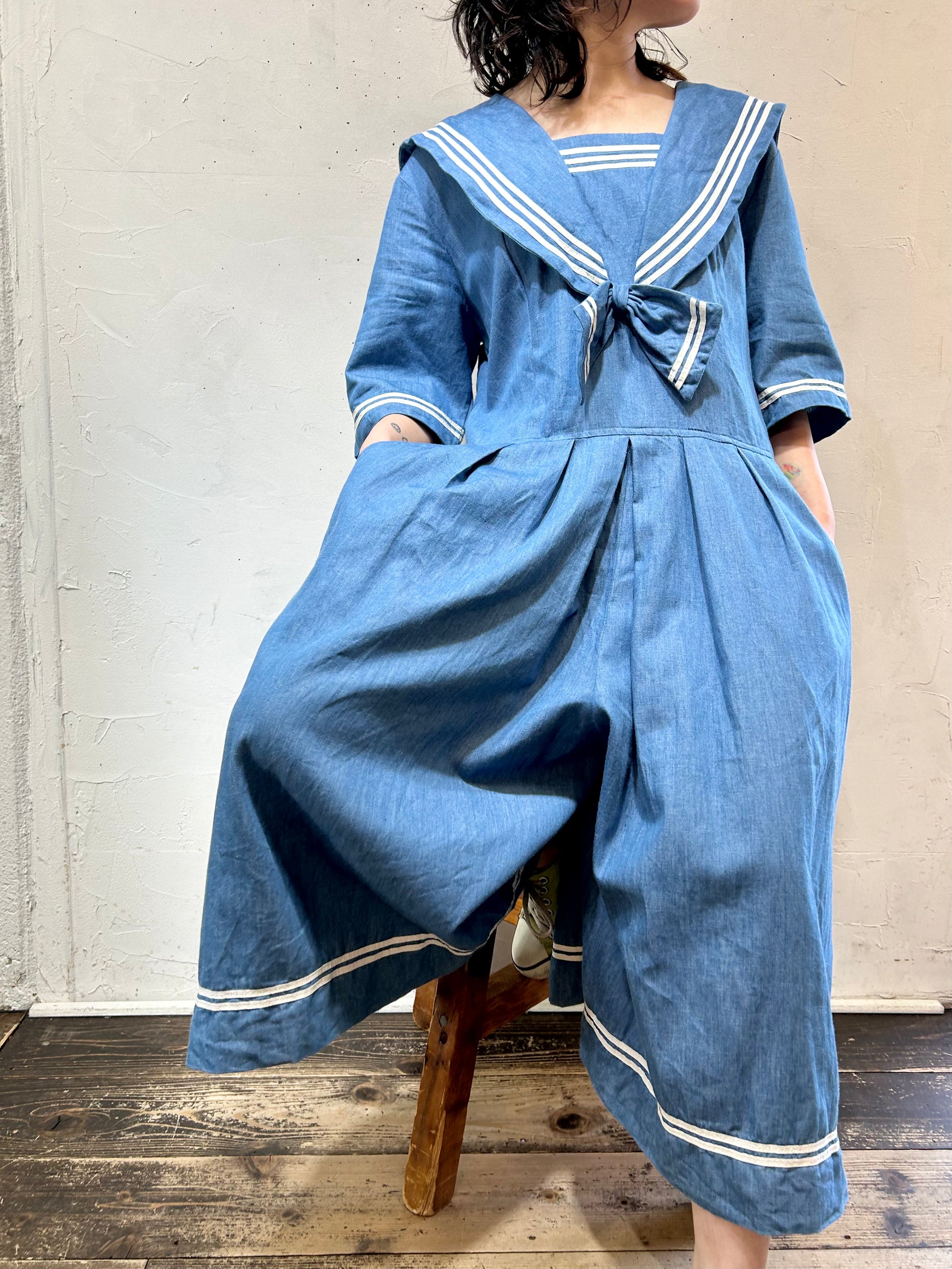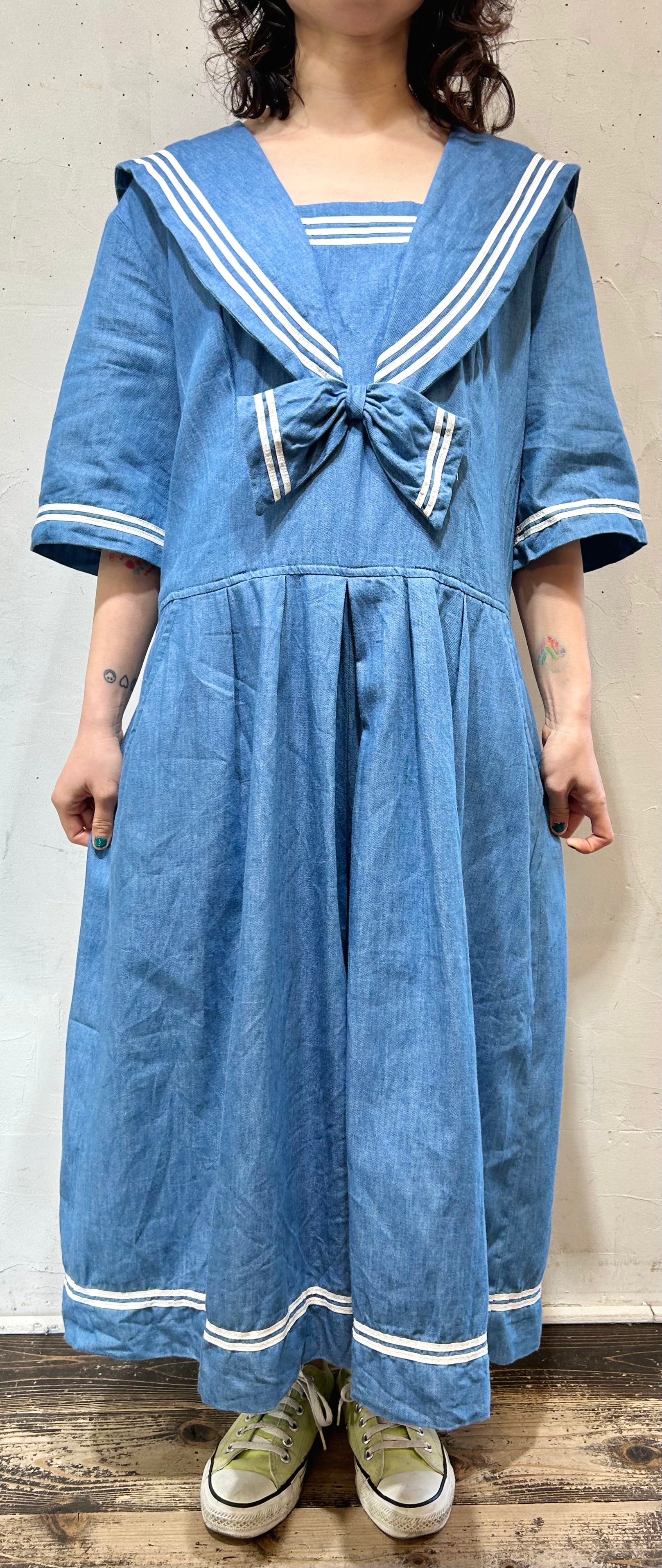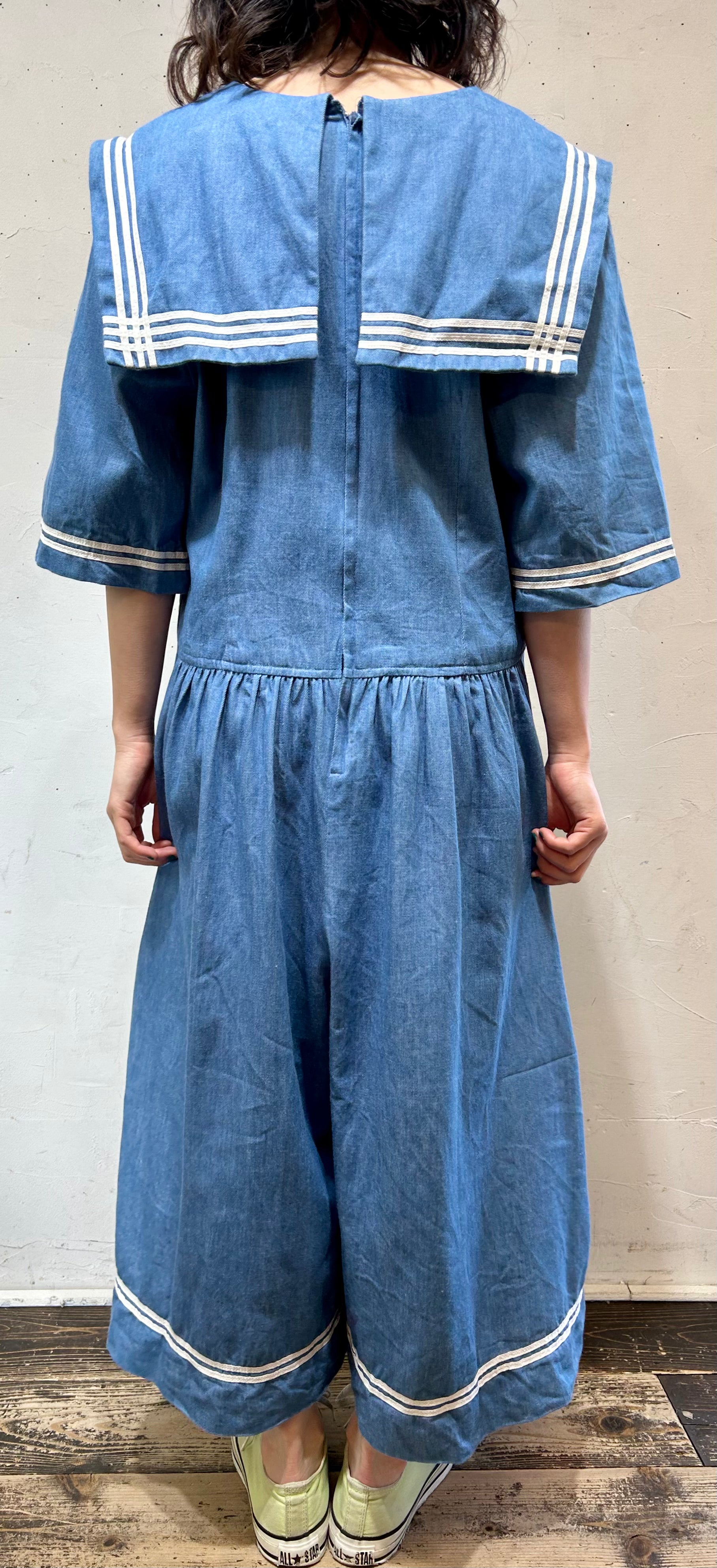 デニムボディにホワイトのラインが入ったビッグセーラーカラーやリボンがマリンな雰囲気で可愛らしい1着。