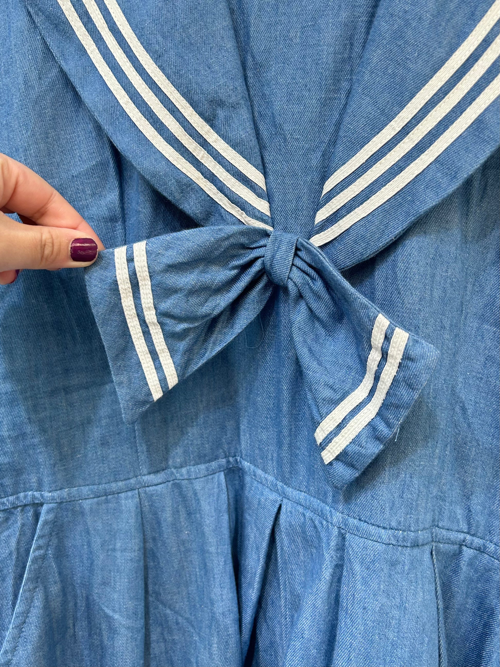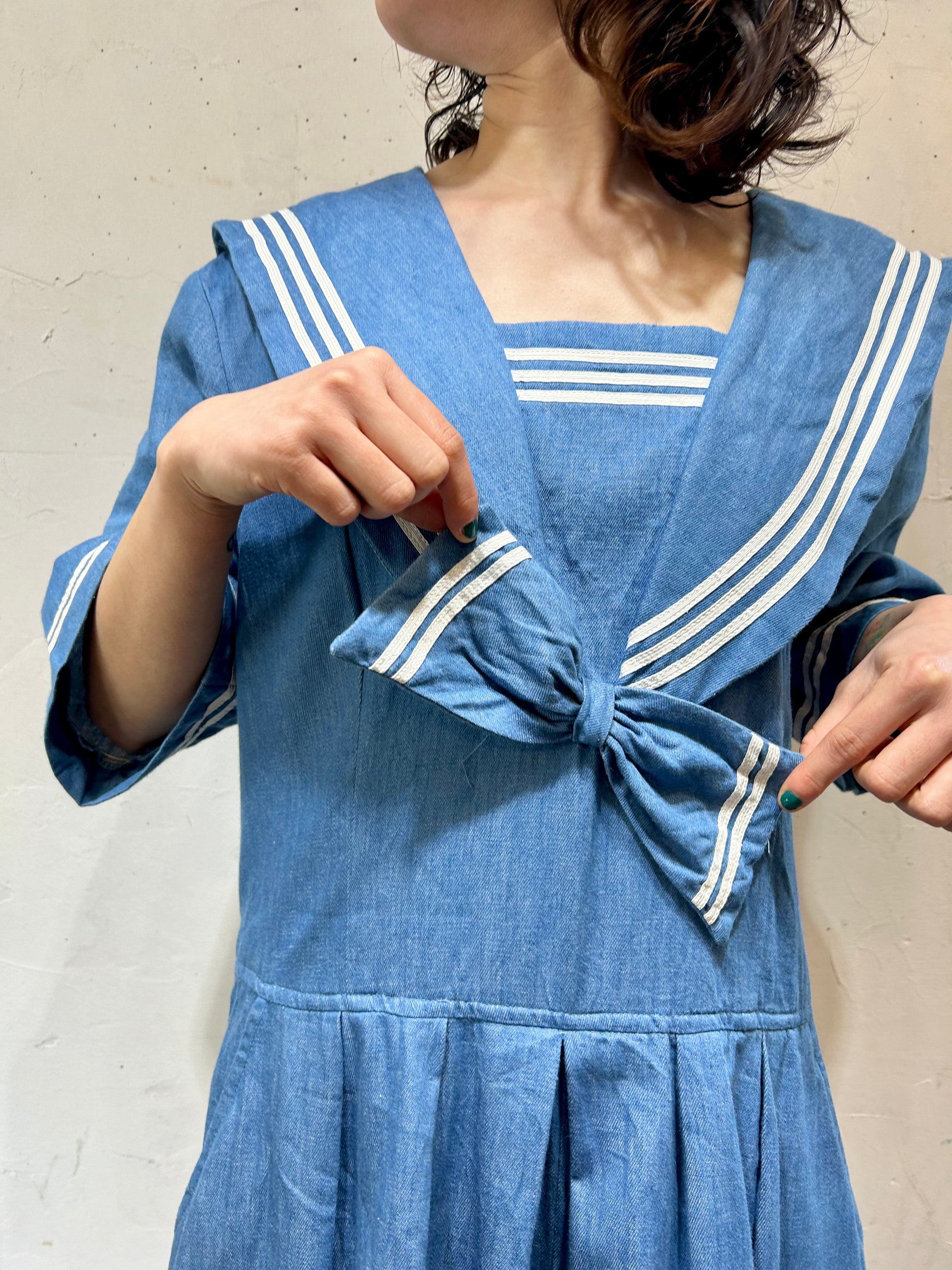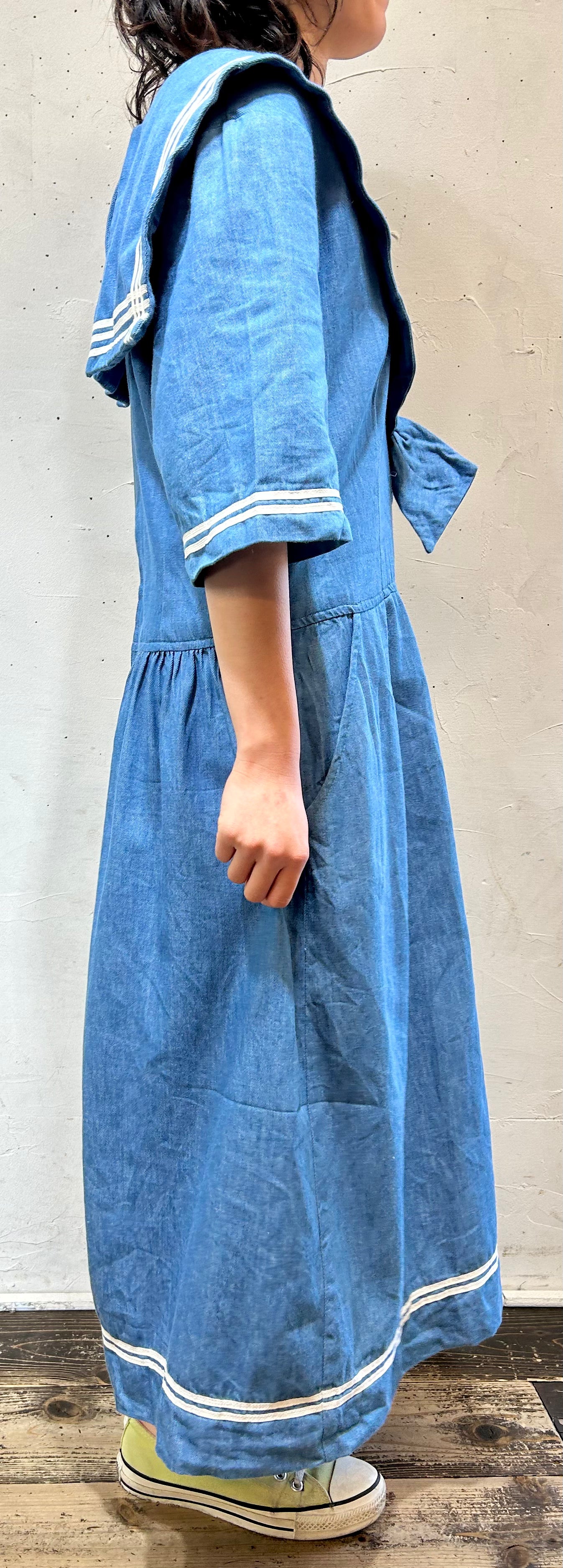 デニムボディにホワイトのラインが入ったビッグセーラーカラーやリボンがマリンな雰囲気で可愛らしい1着。