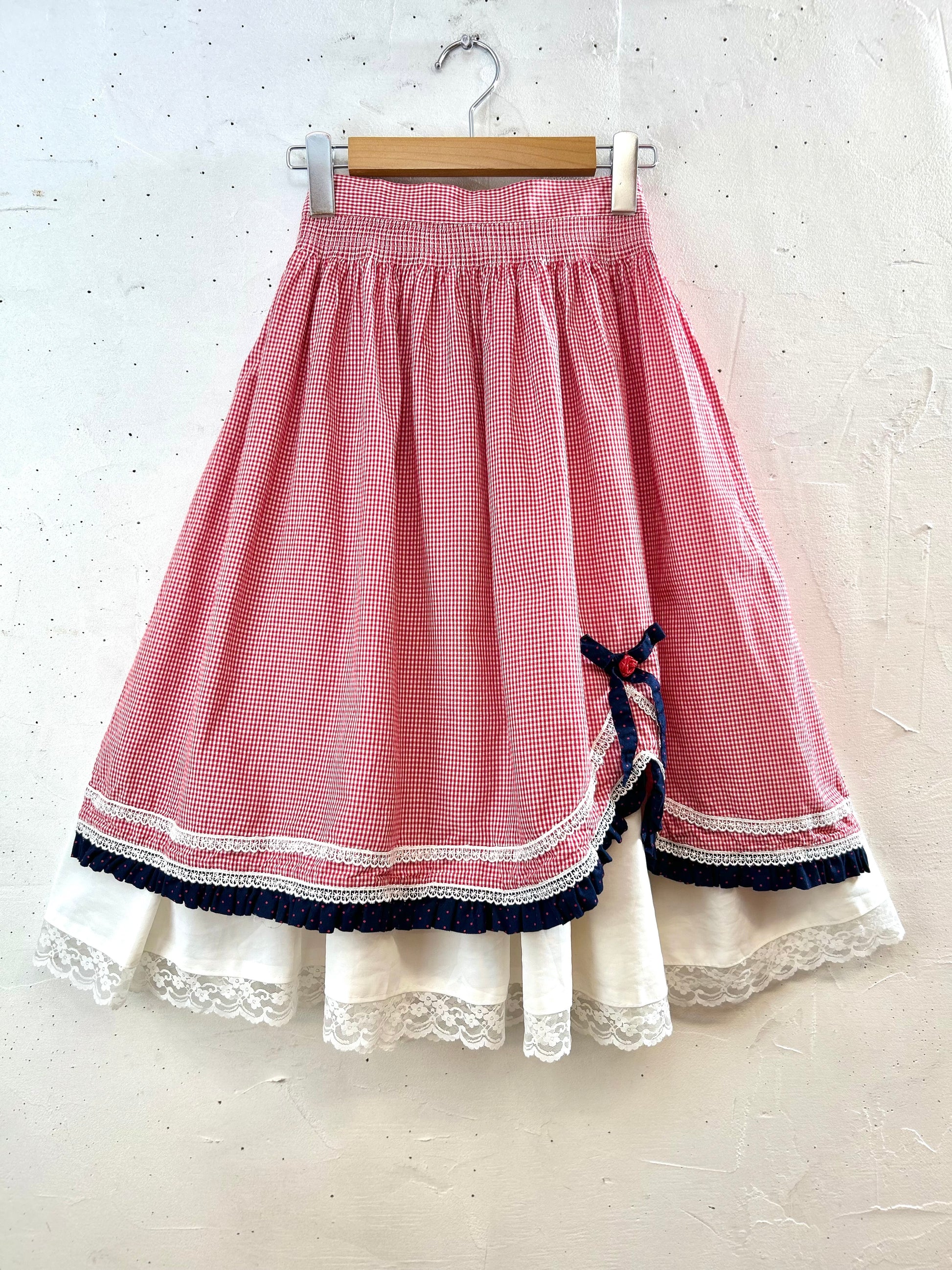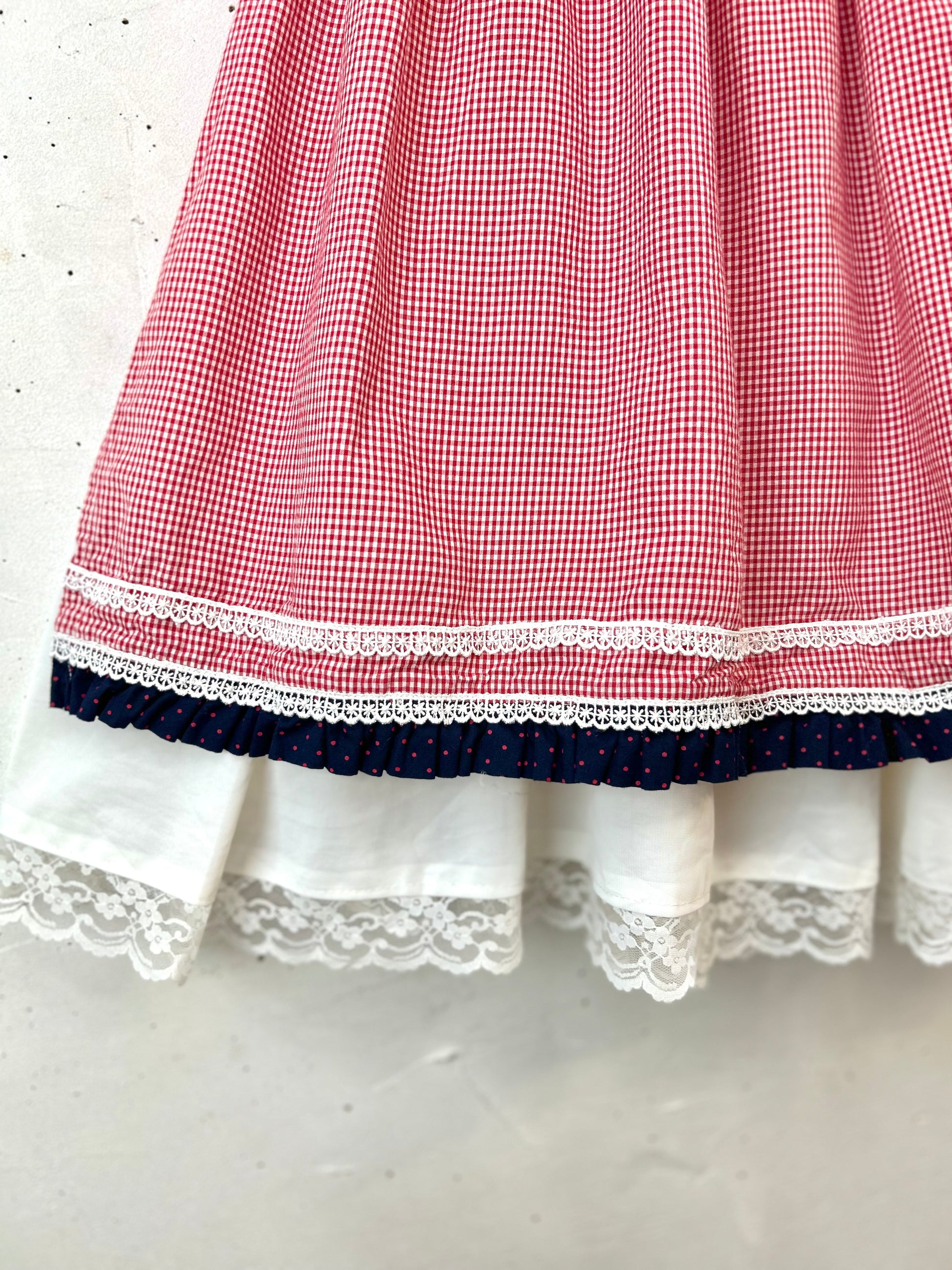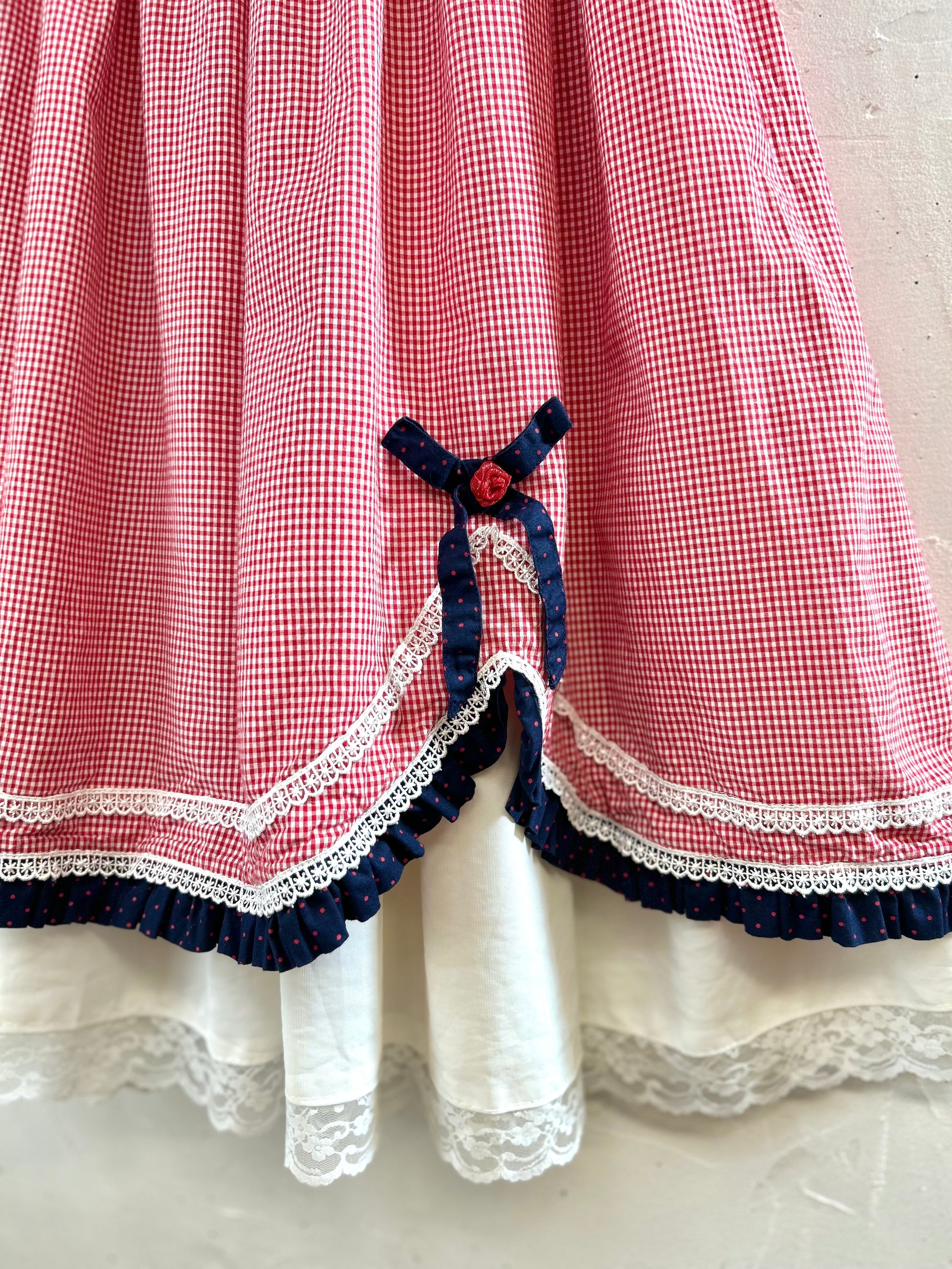 赤いギンガムチェックの生地にレース、フリル、リボンがあしらわれたキュートなアイテム。