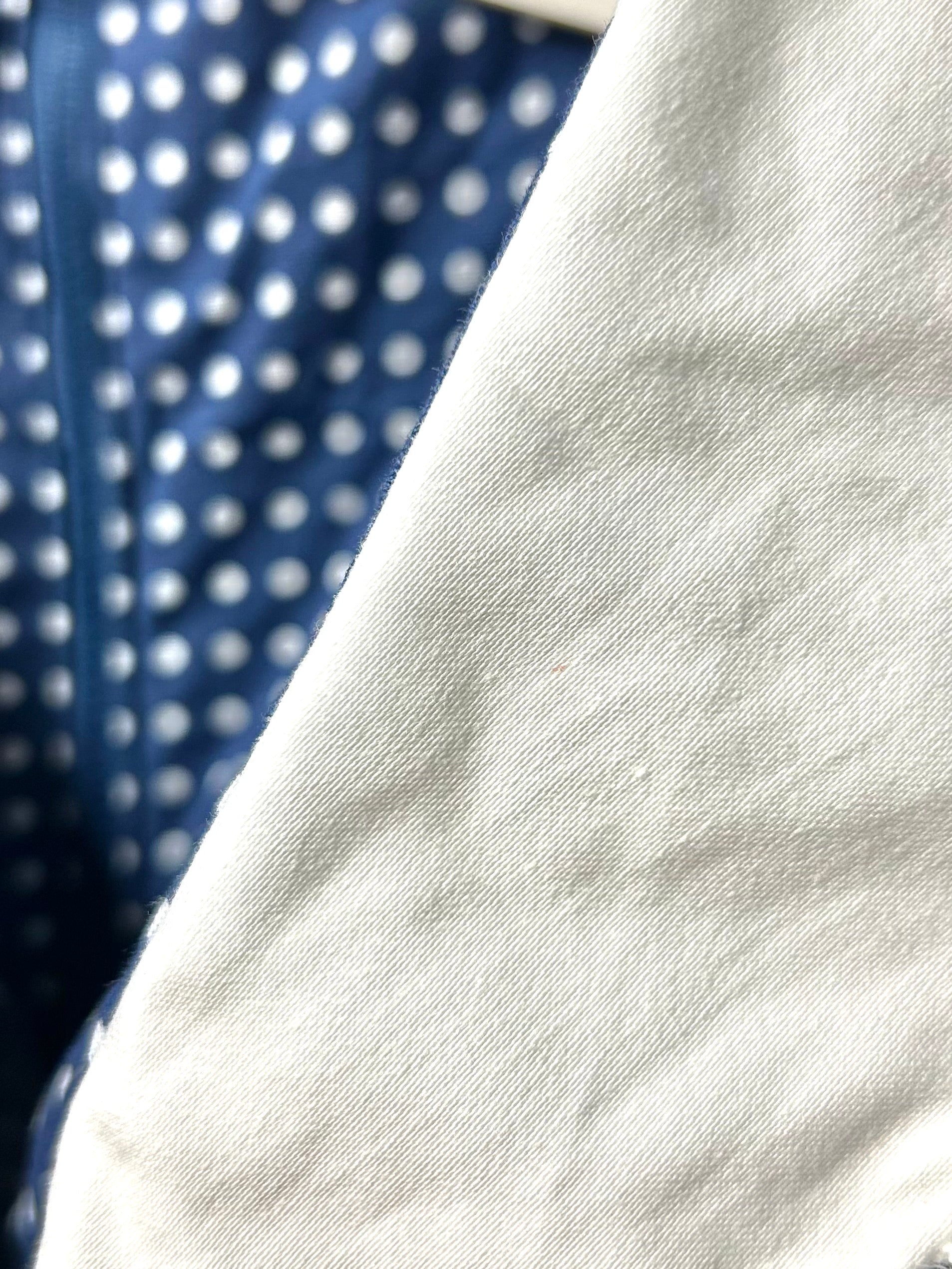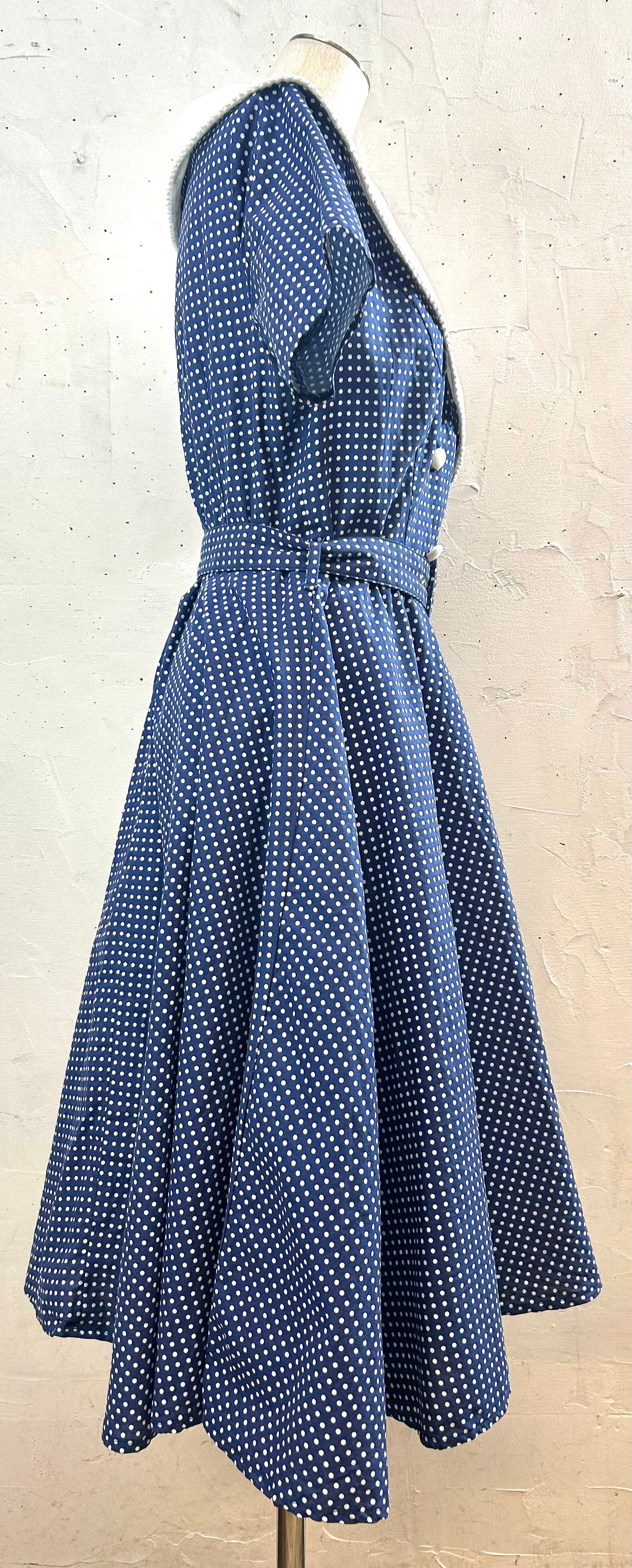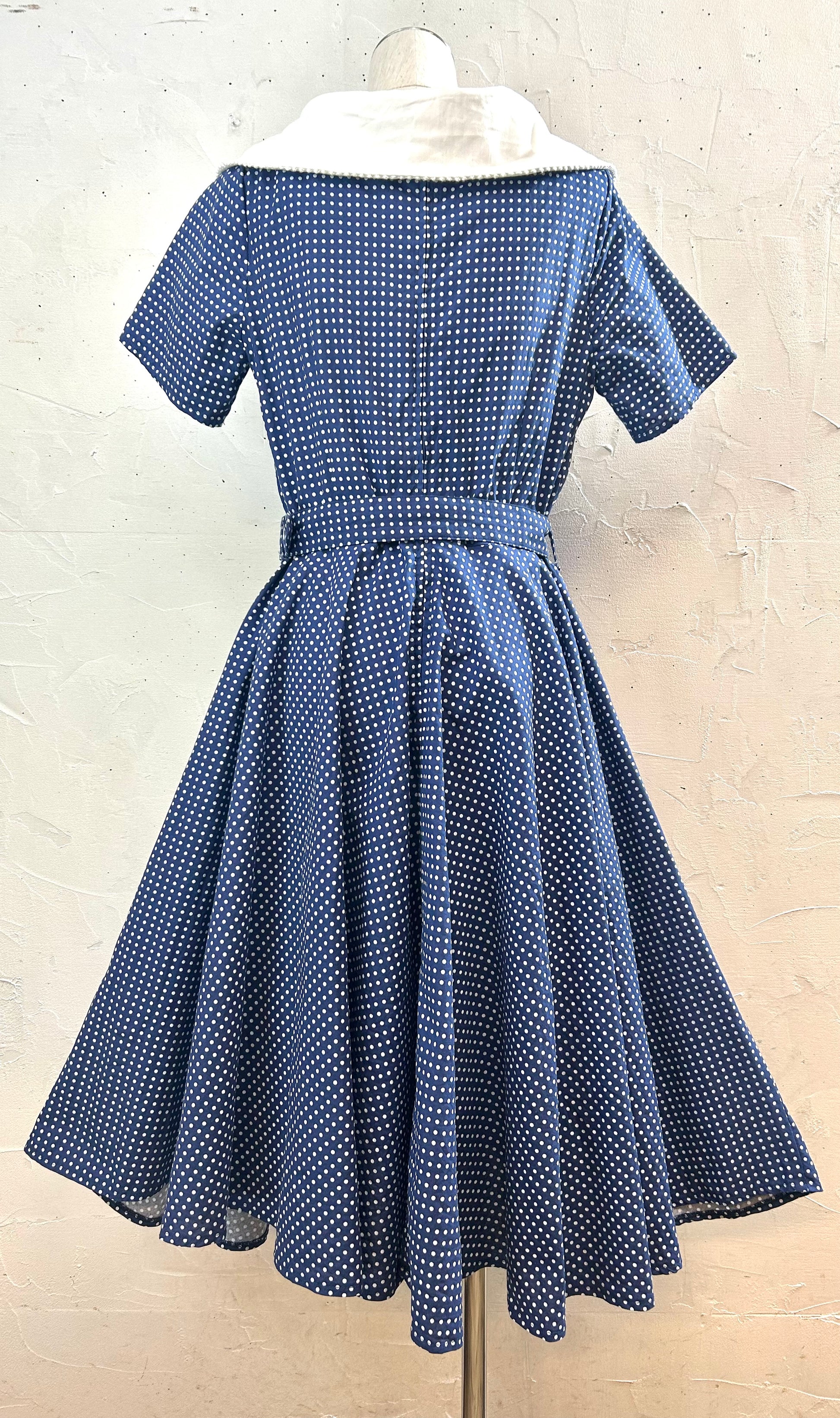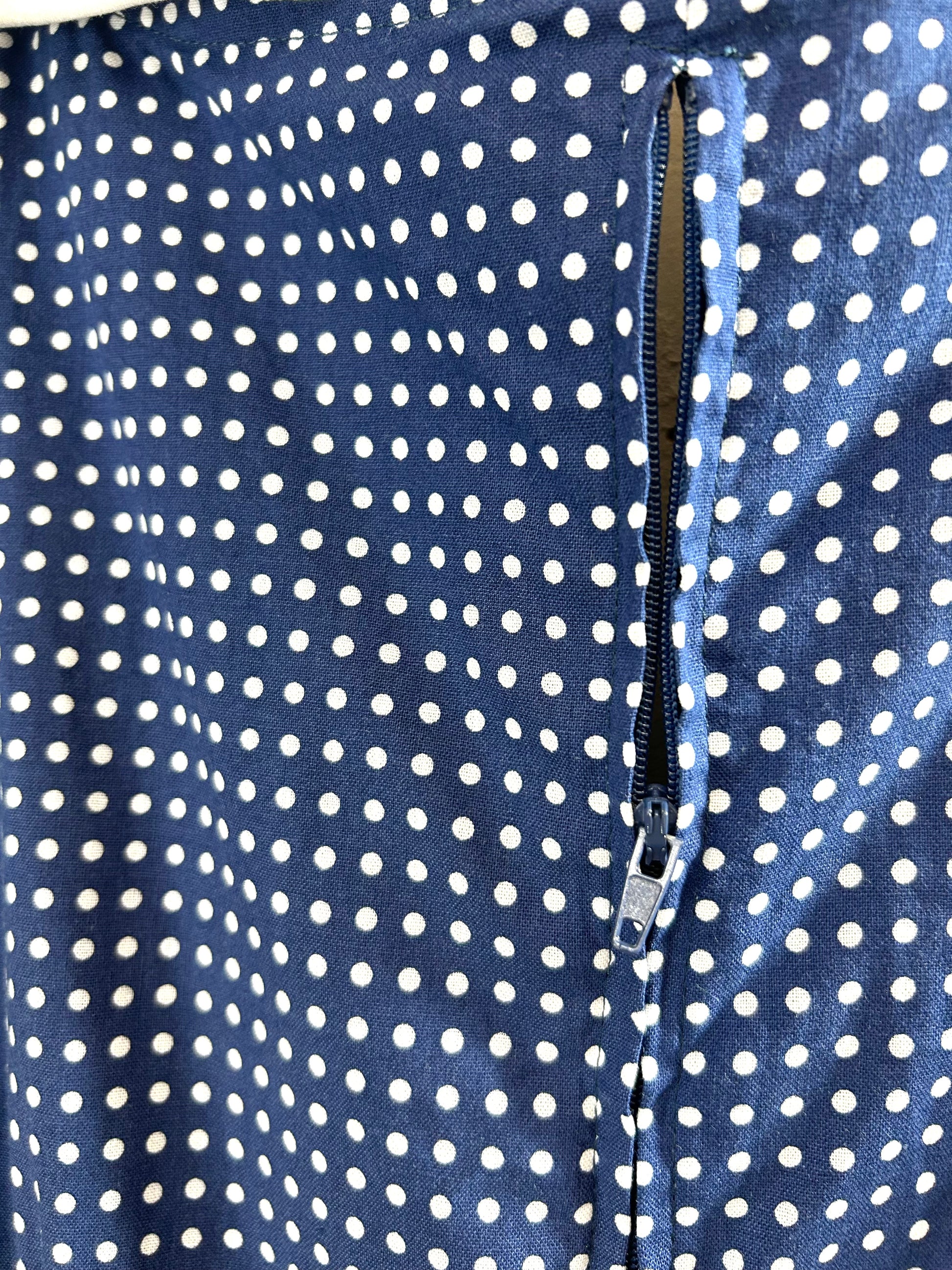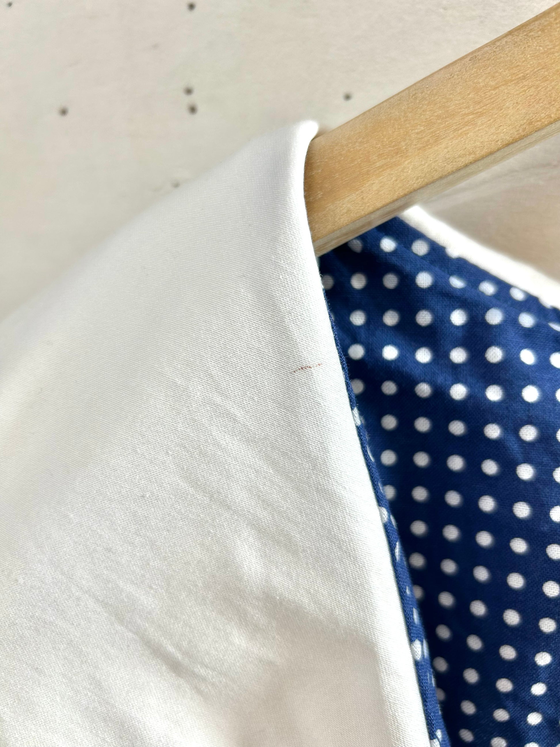 ネイビーベースのドット柄にホワイトカラーがとても雰囲気があり、深めのデコルテなどディテールまで高いこだわりが感じられます。