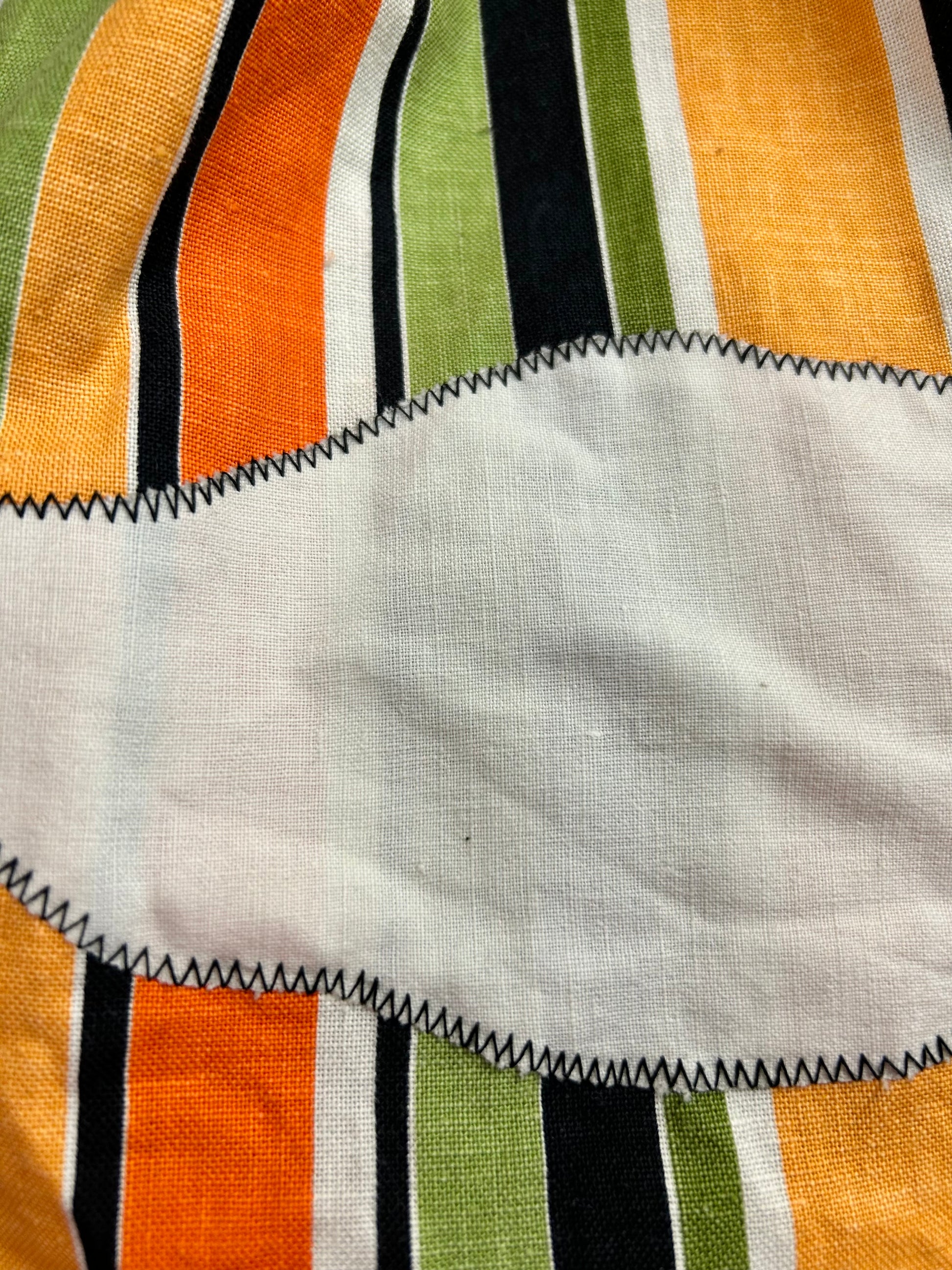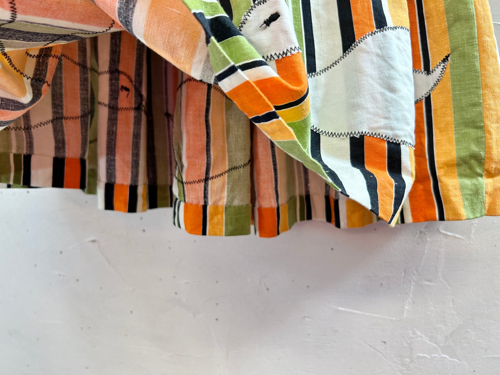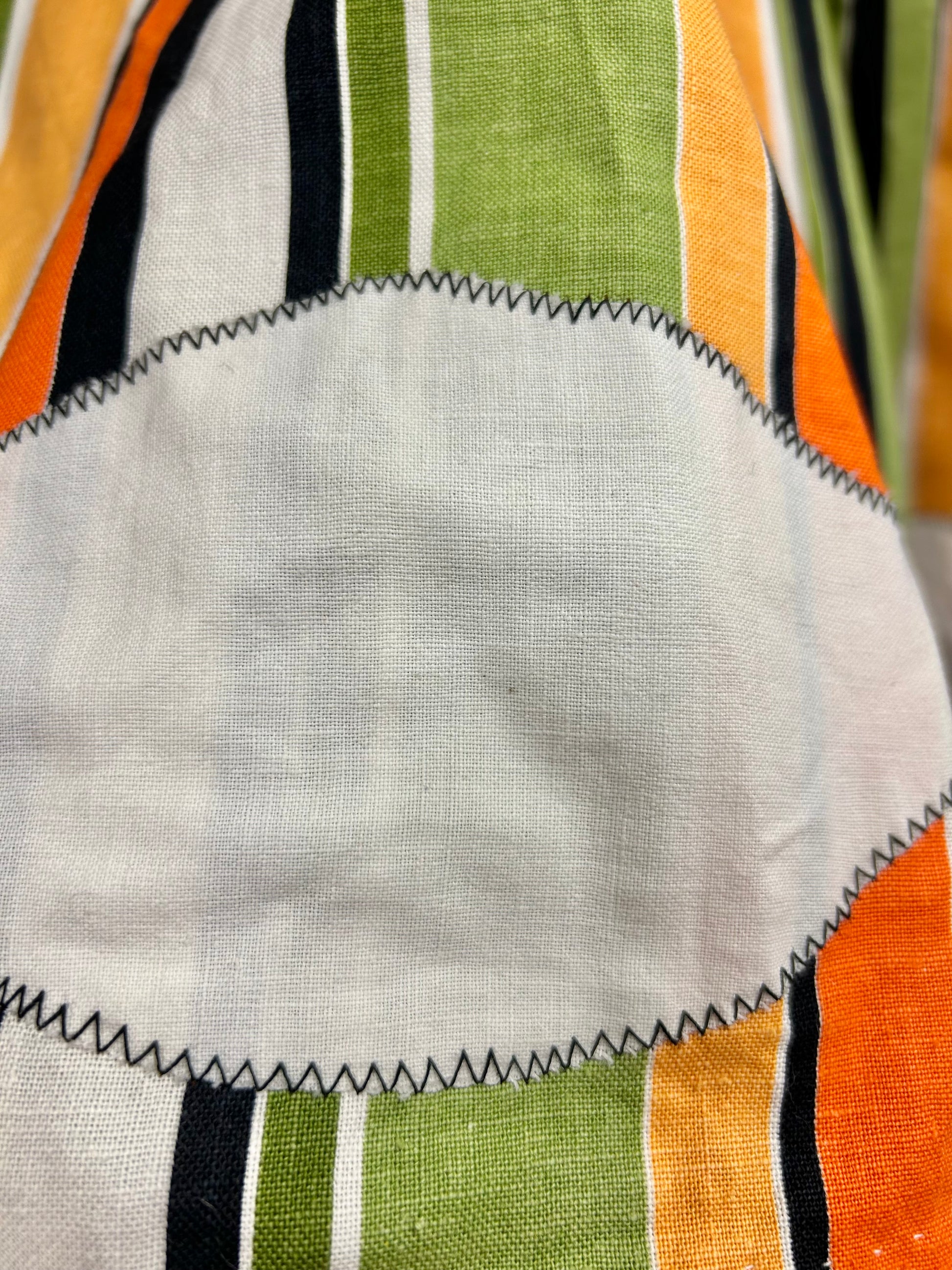 シトラスカラーにブラックが効いたストライプボディに、アヒルのパッチが裾一周に施された一着。