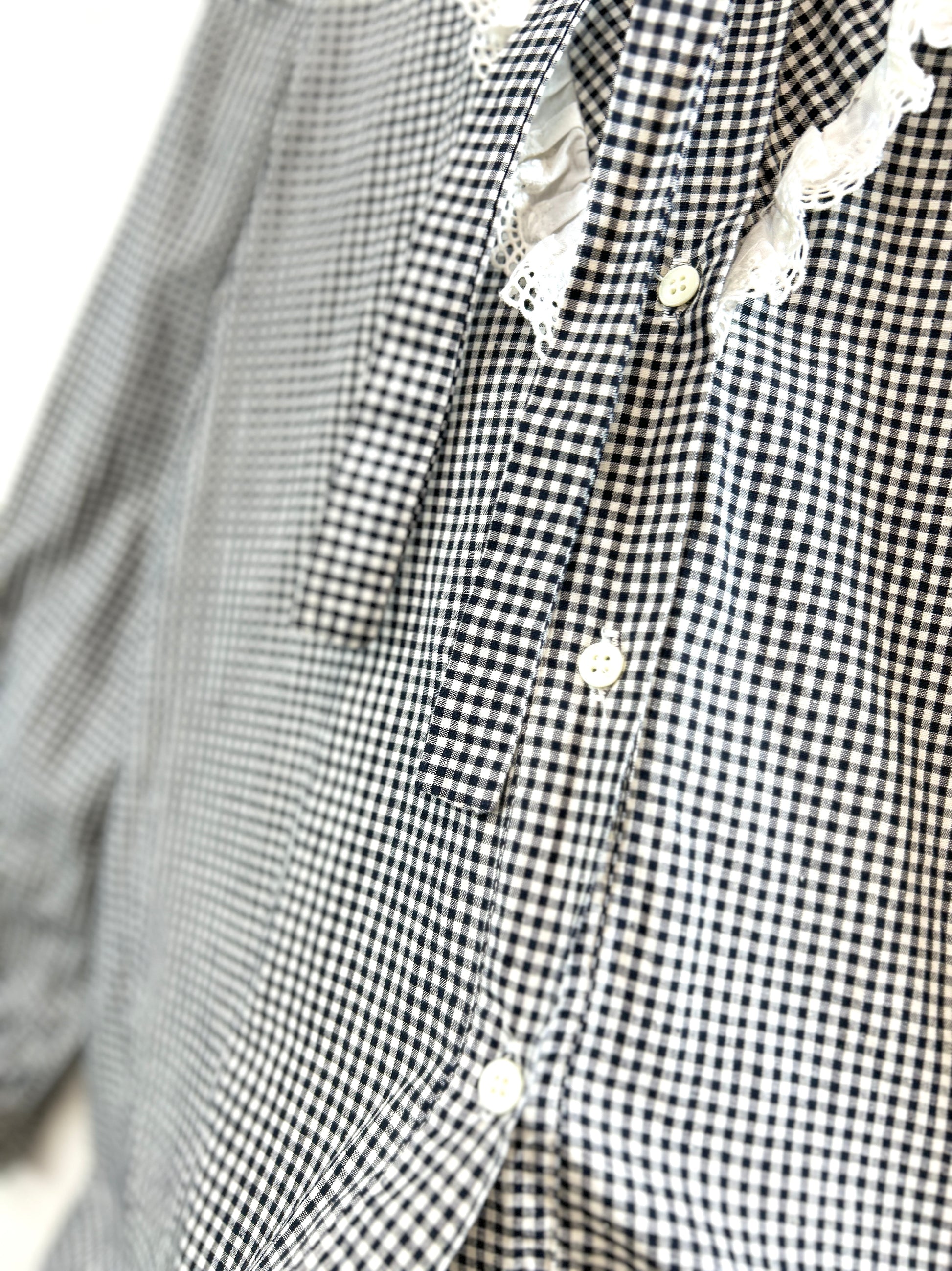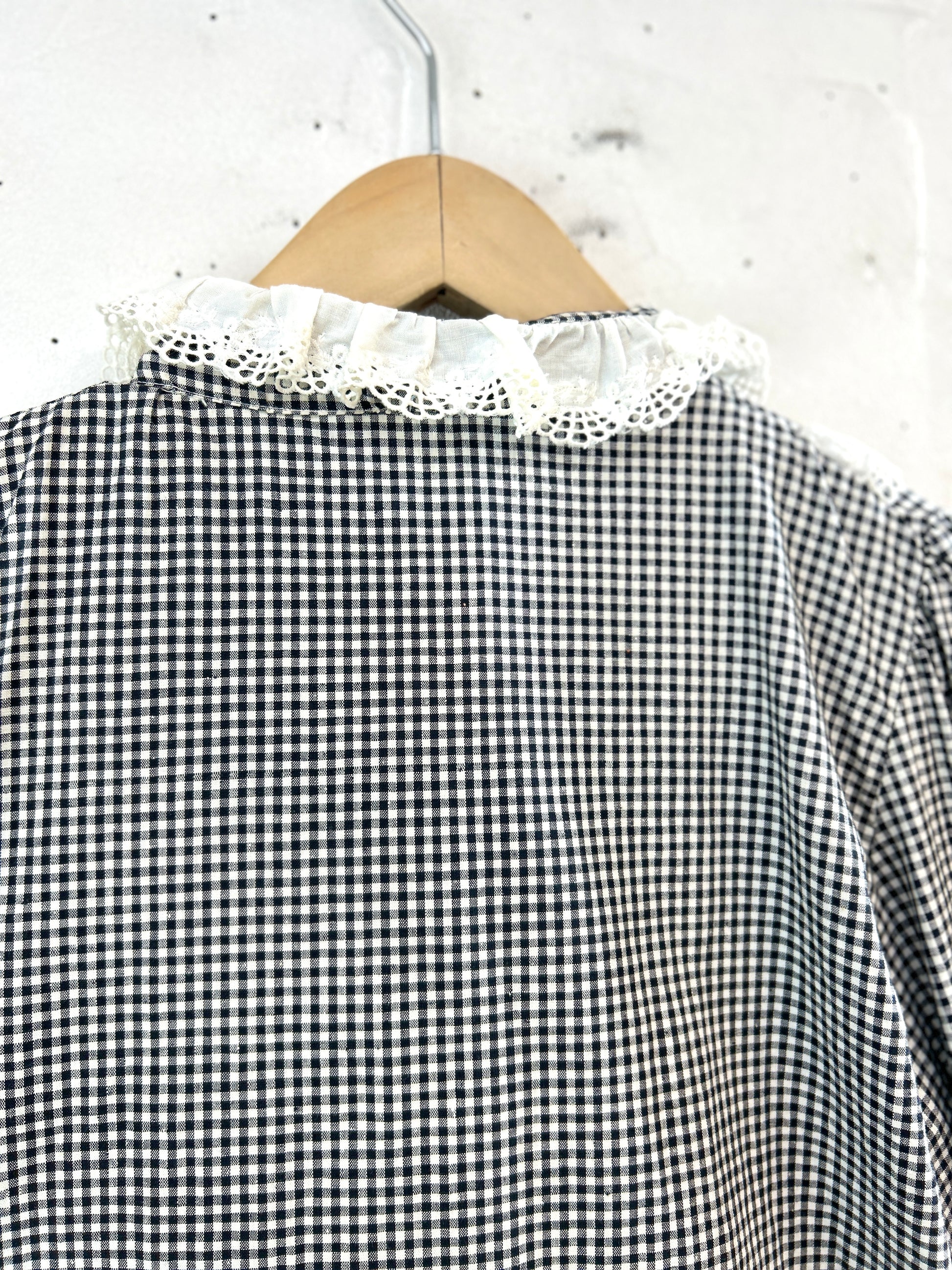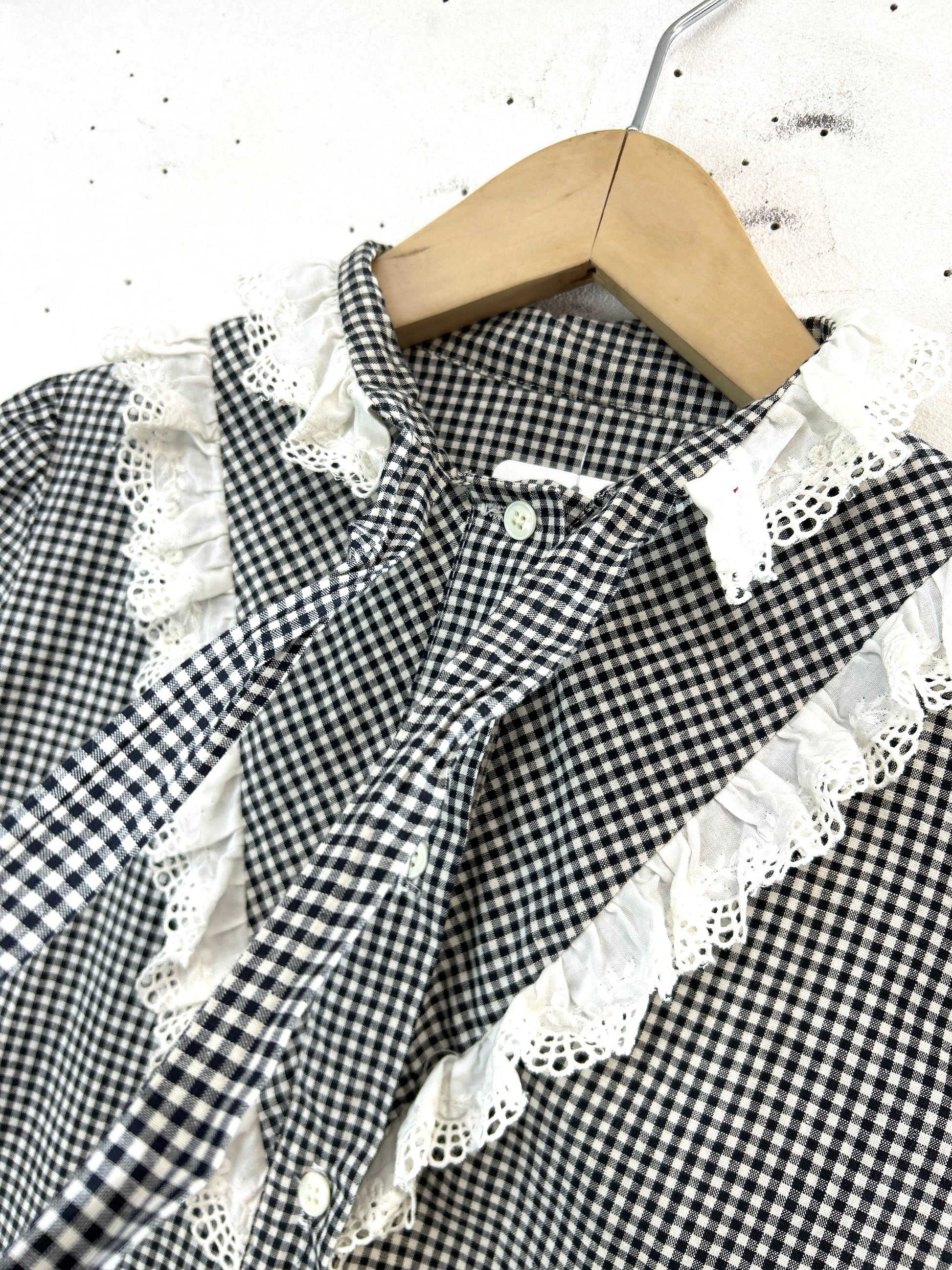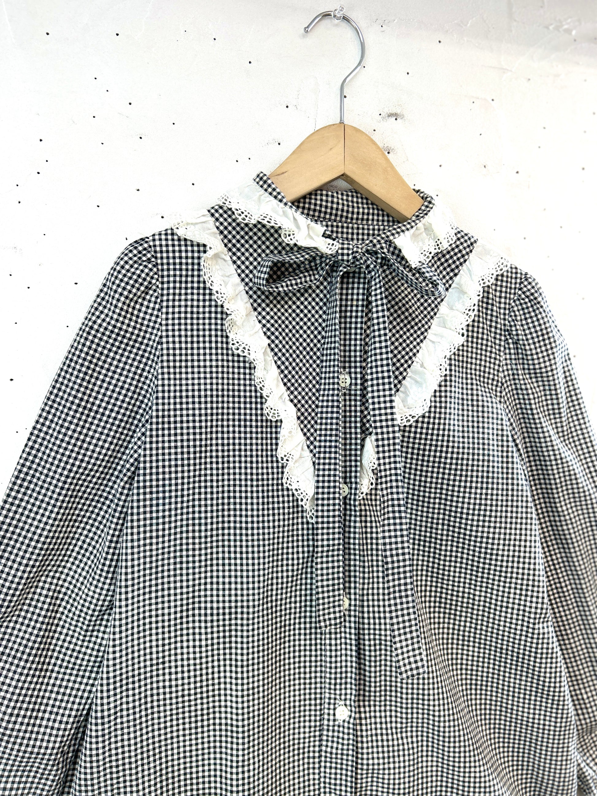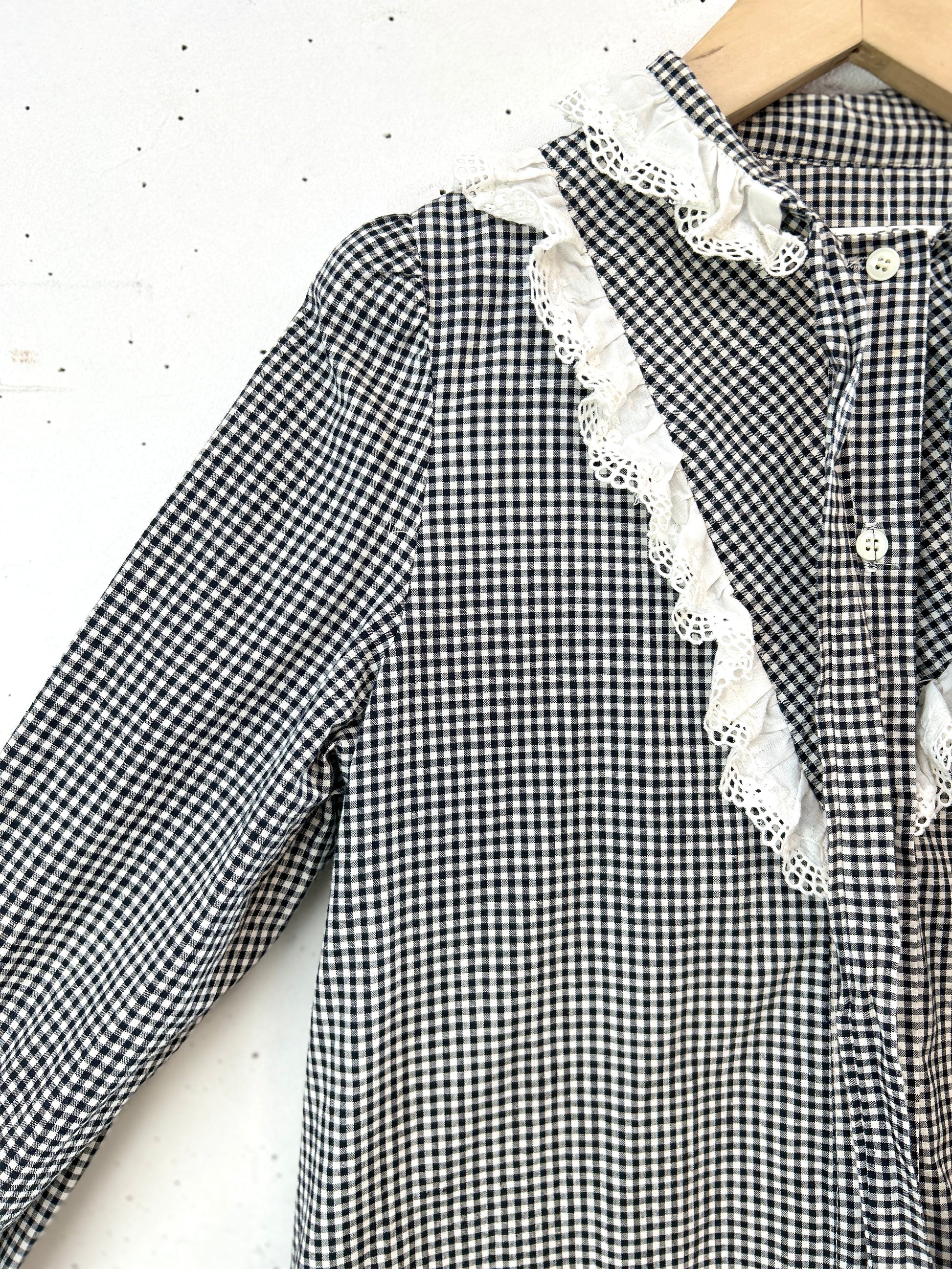 ブラック&ホワイトのトラディショナルなチェックにレースやリボンがアクセントになった上品な一着。