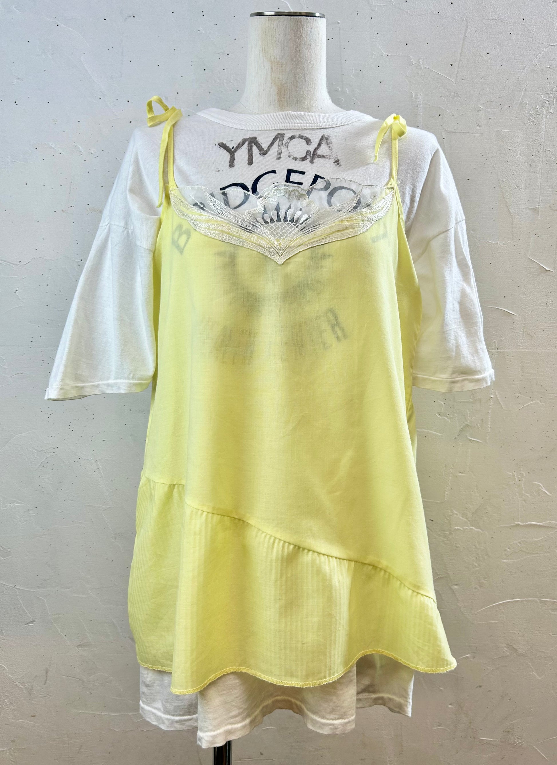 淡いイエローカラーのボディに、胸元のレースがアクセントになったアイテム。