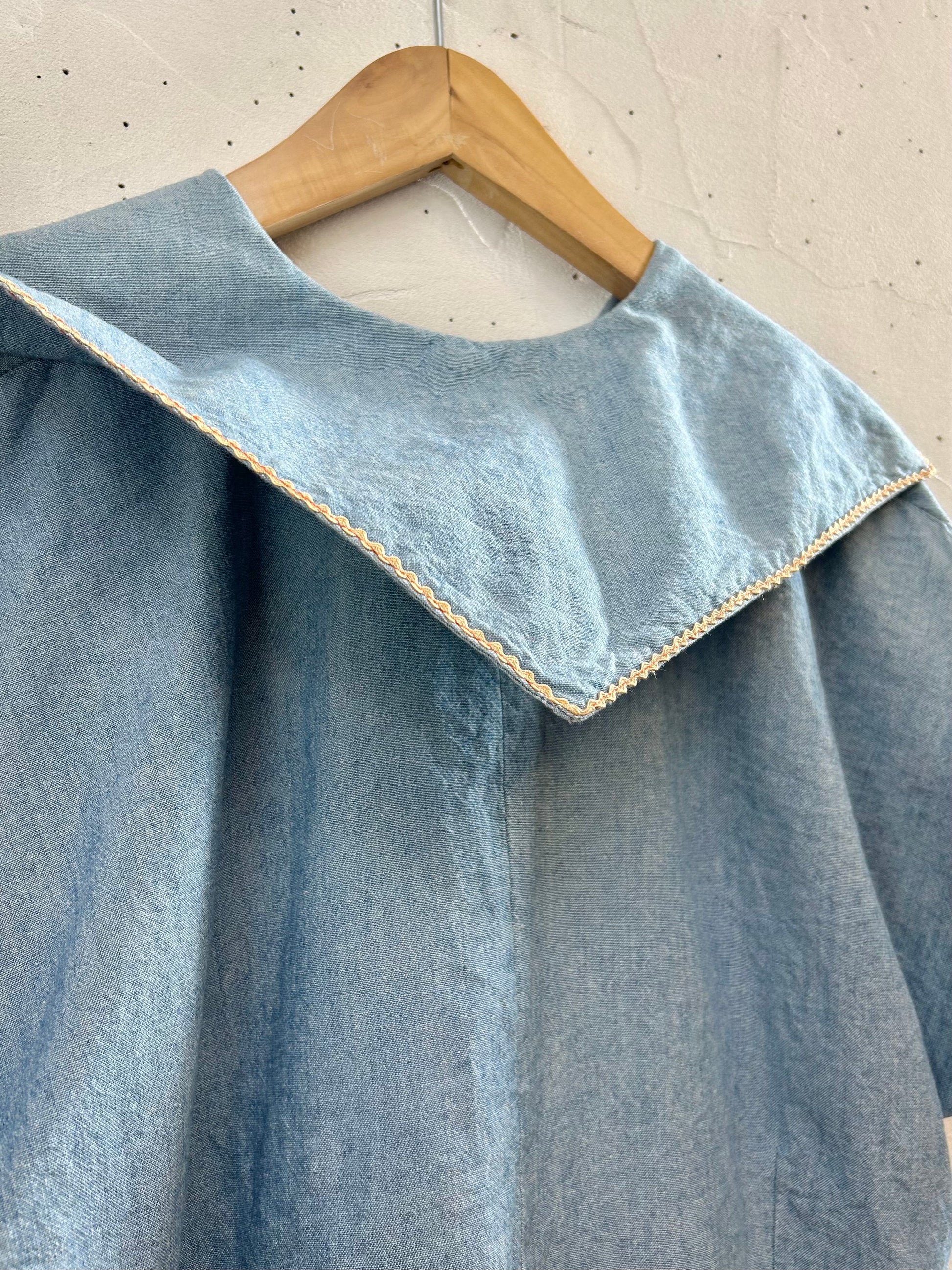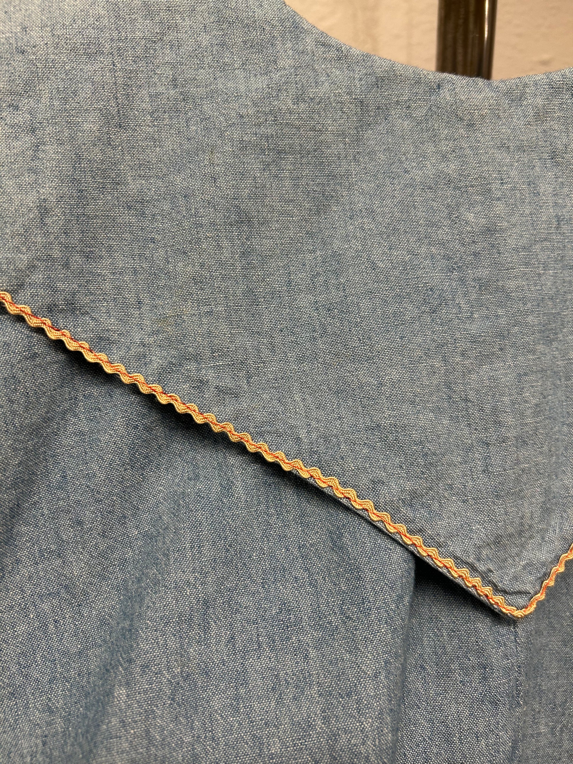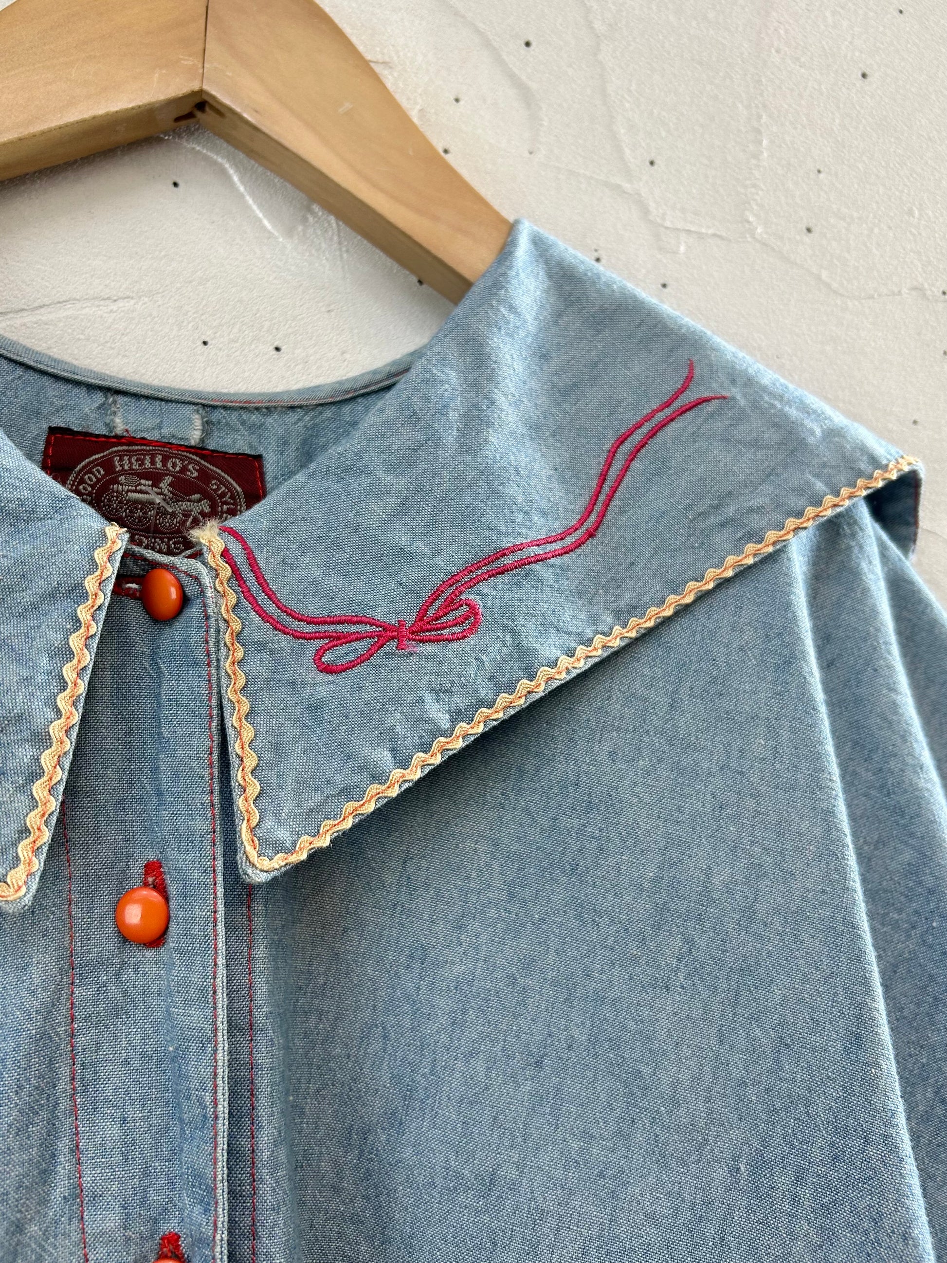 シャンブレーボディに、ヤマミチテープやリボンの刺繍が施された可愛らしい一着。