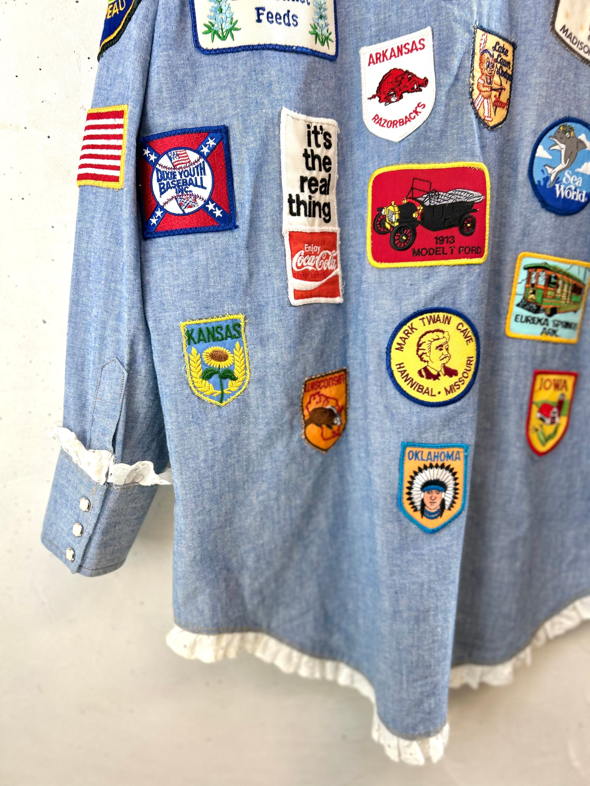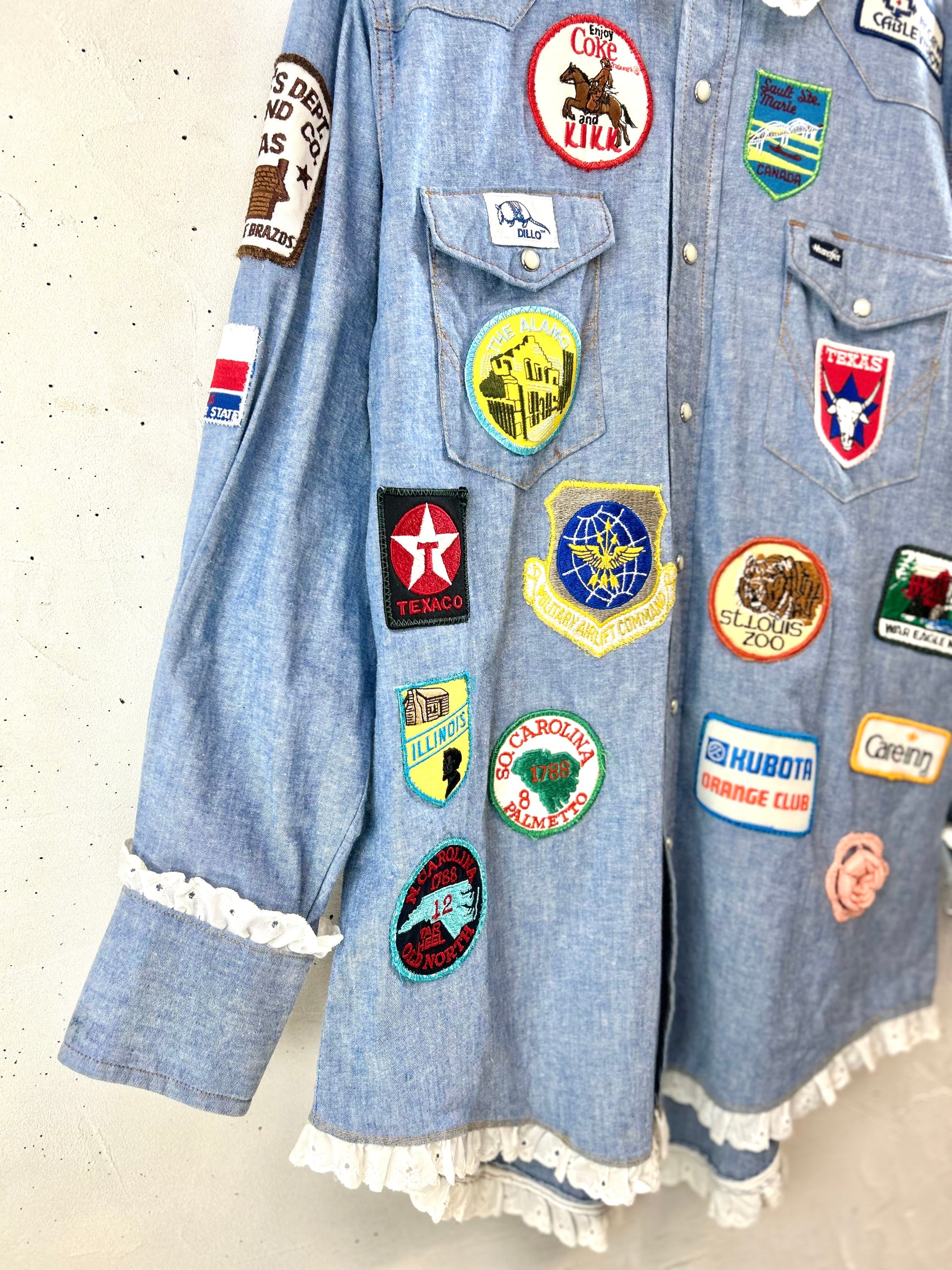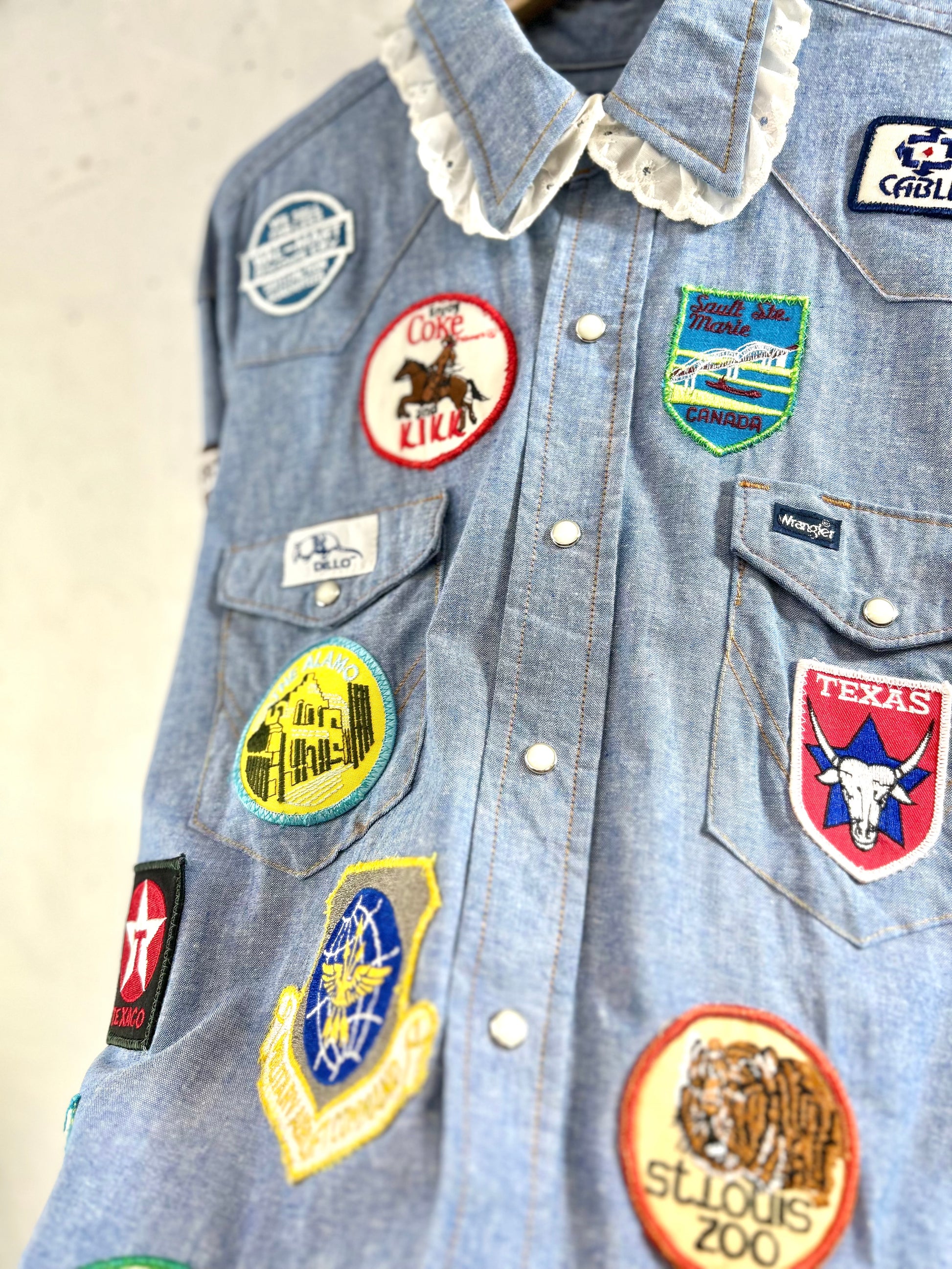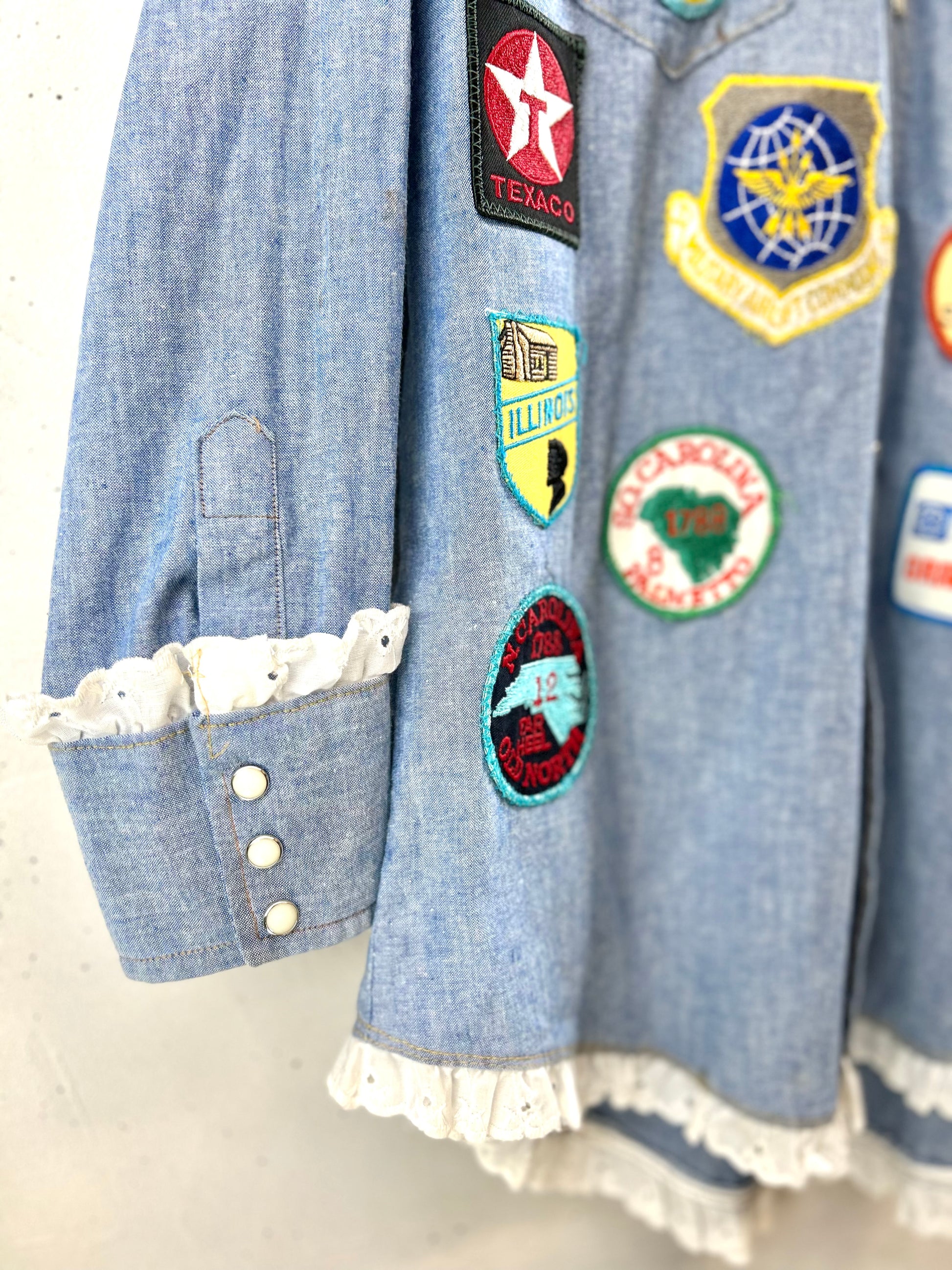 シャンブレーのさらっとした生地感のボディに、沢山のワッペンとレースがカスタムされた存在感のある1着。