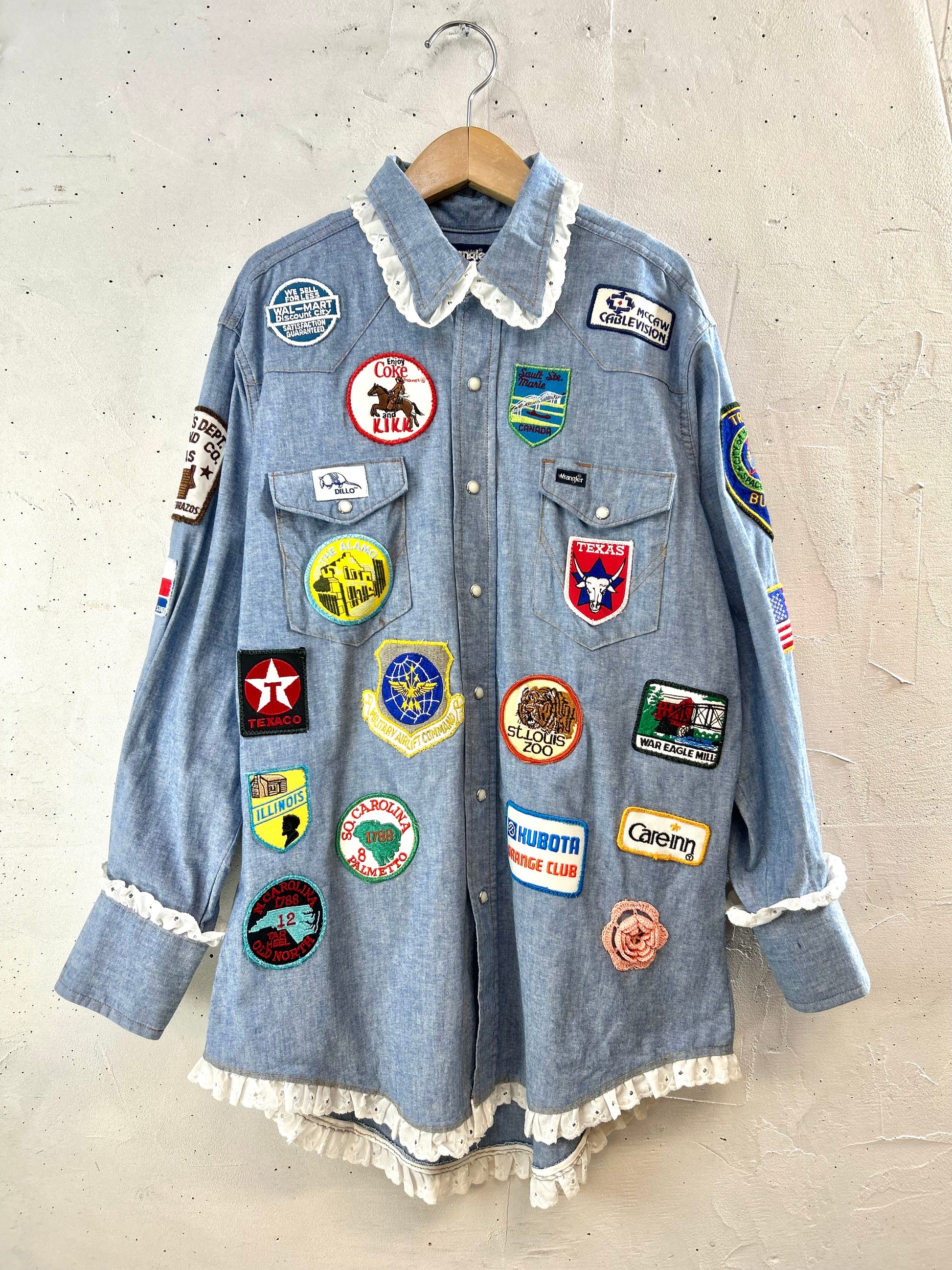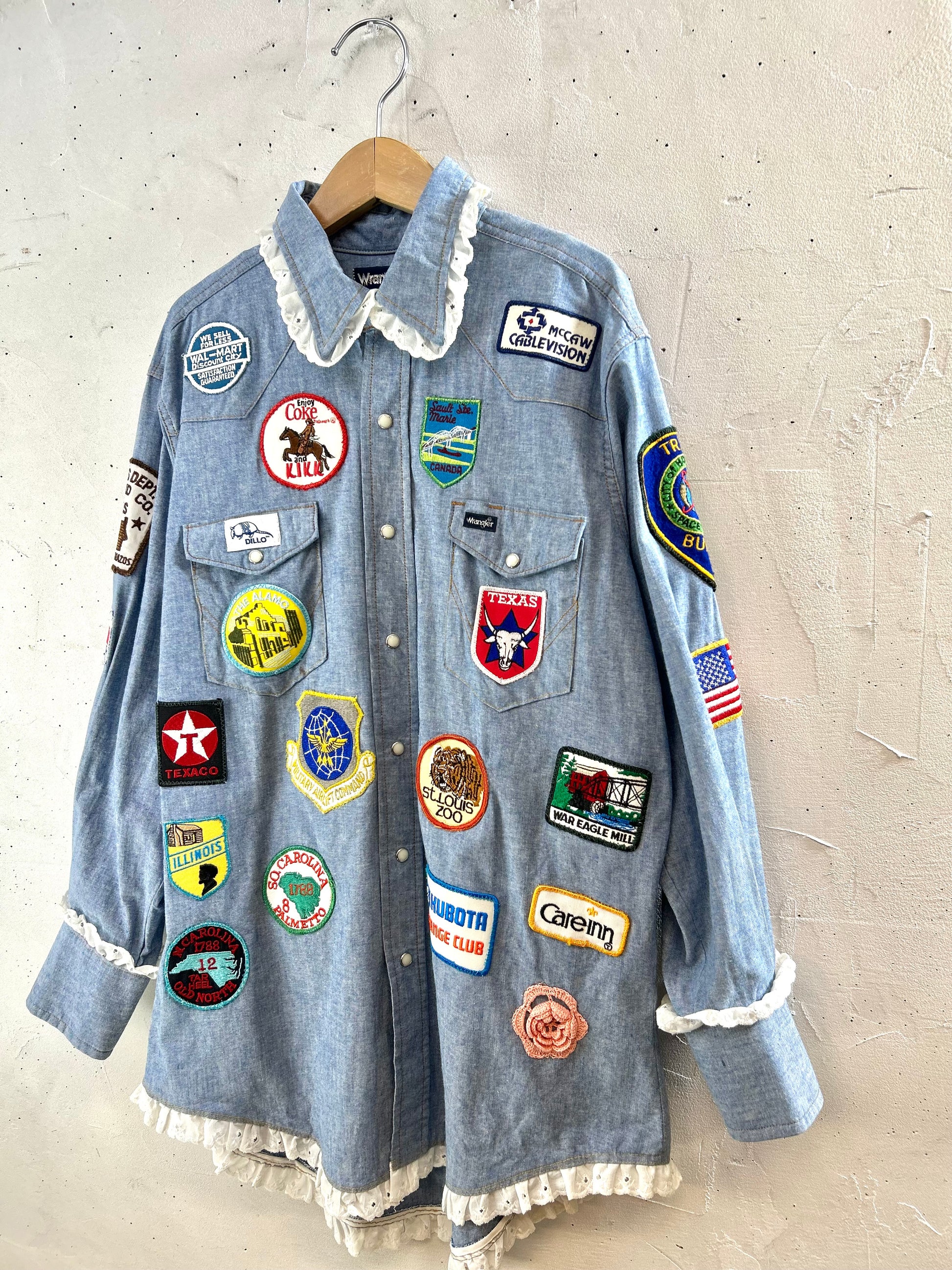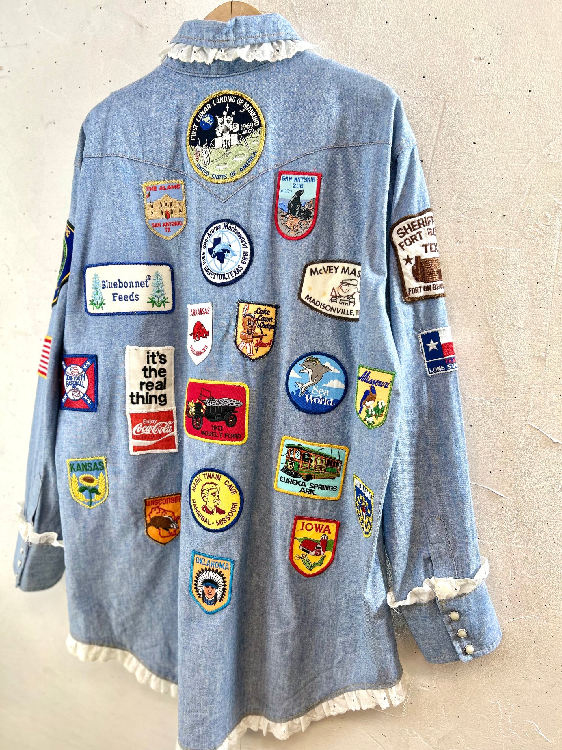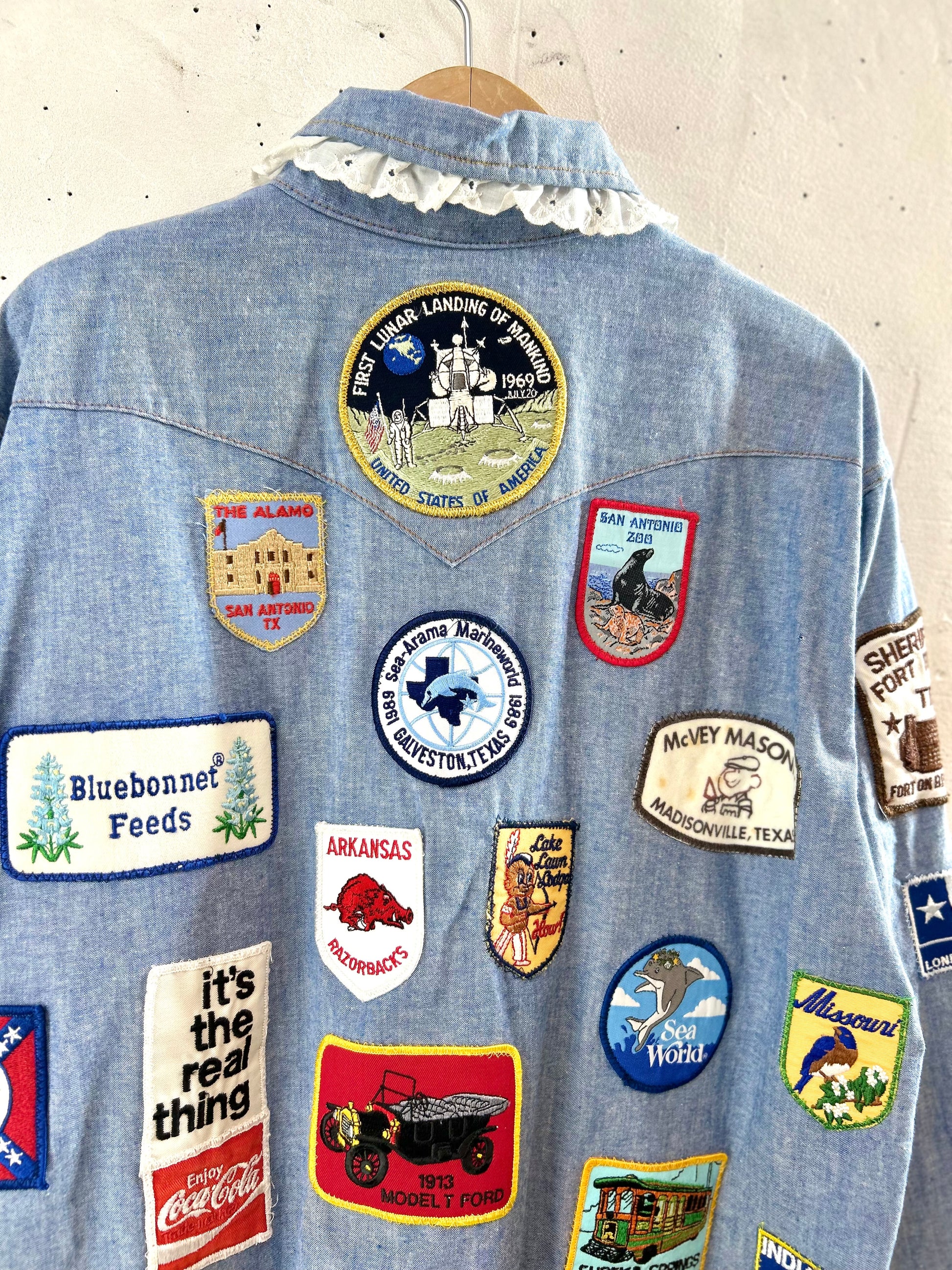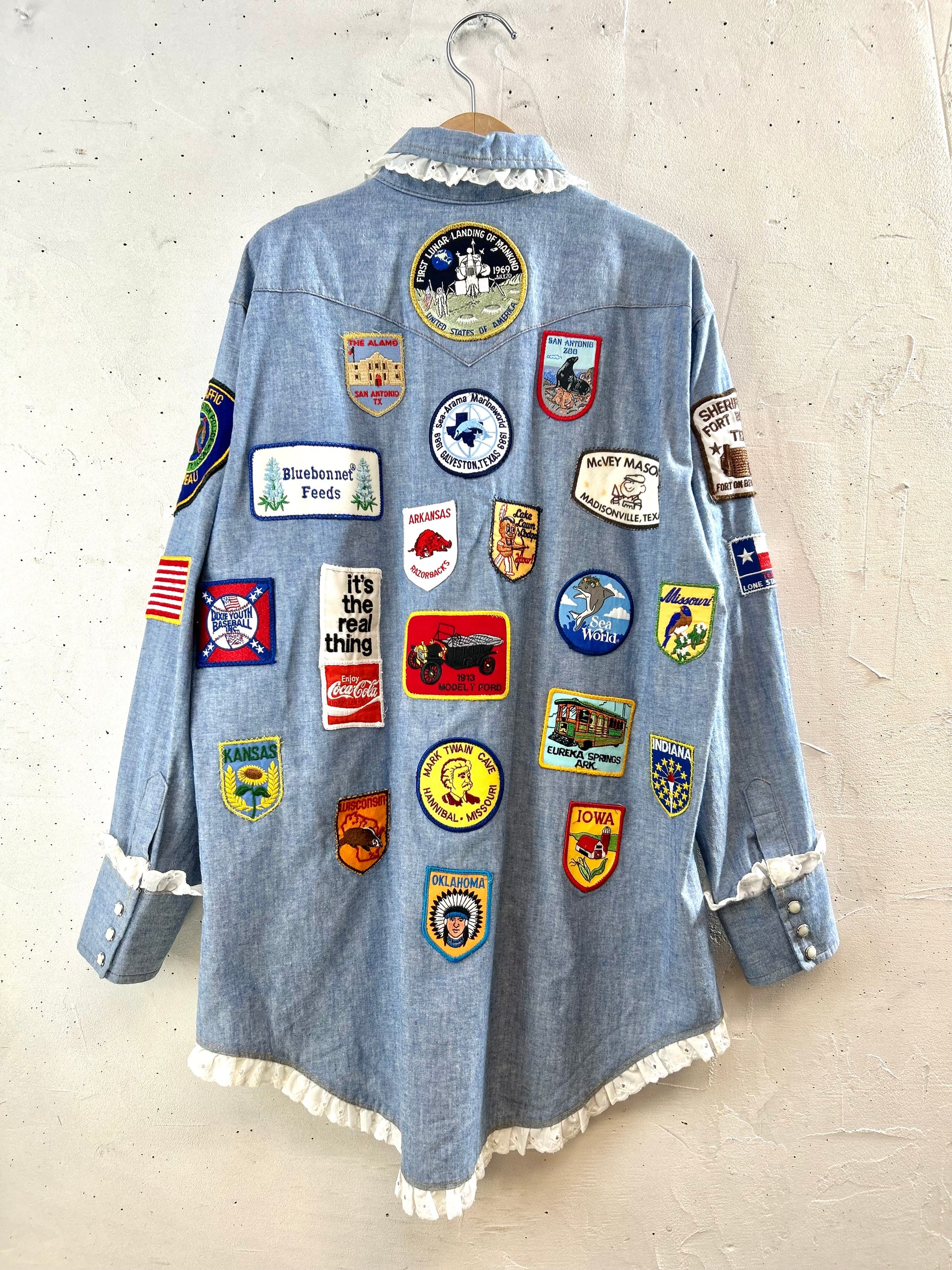 シャンブレーのさらっとした生地感のボディに、沢山のワッペンとレースがカスタムされた存在感のある1着。