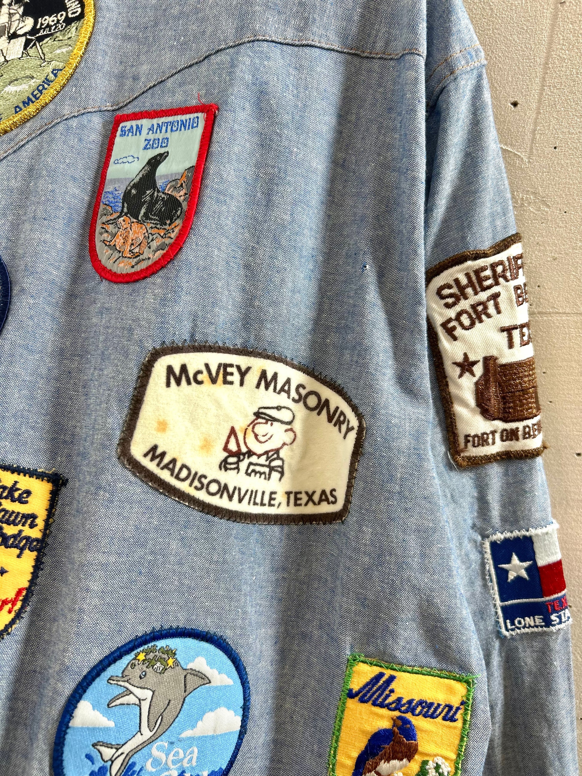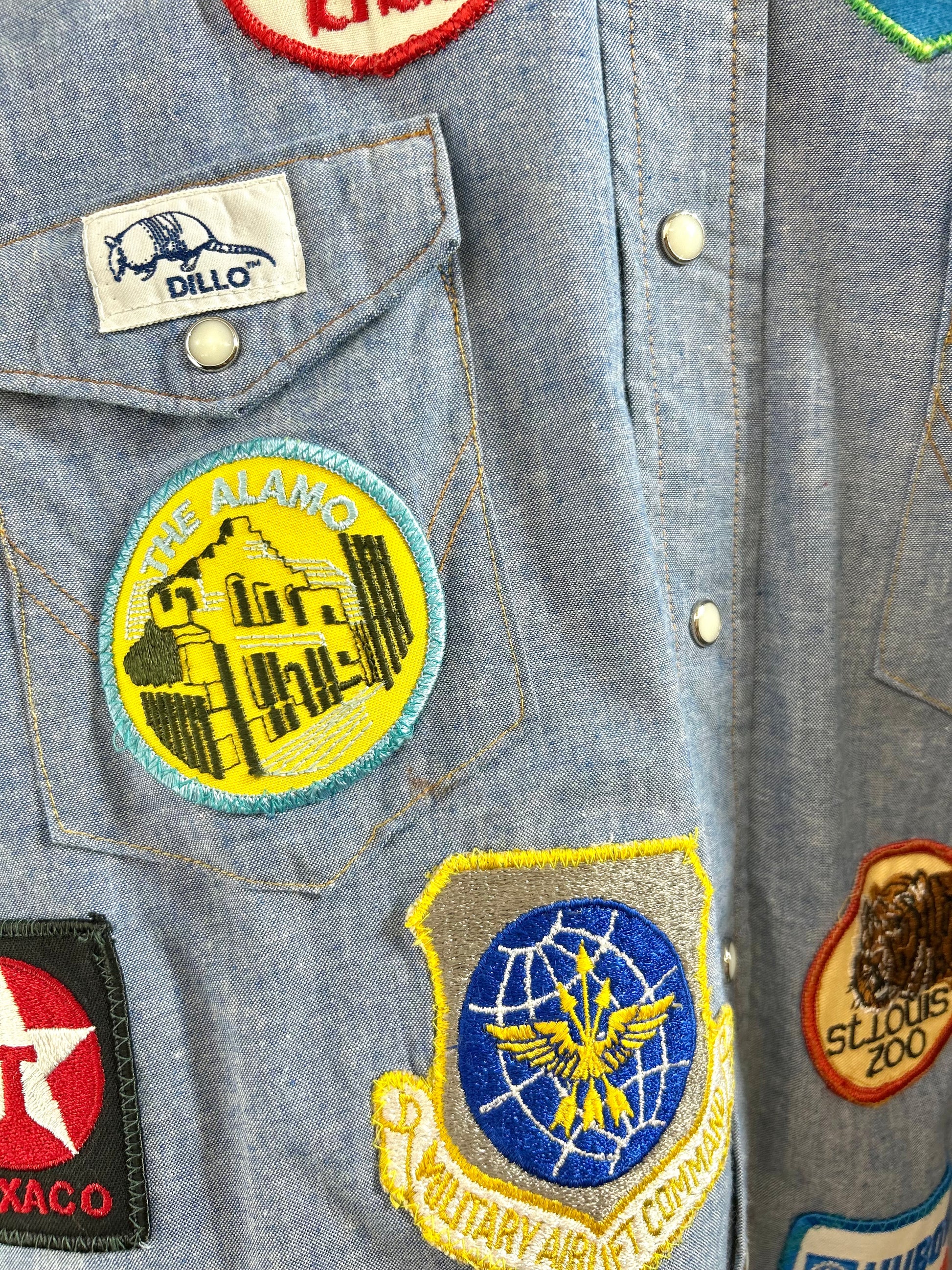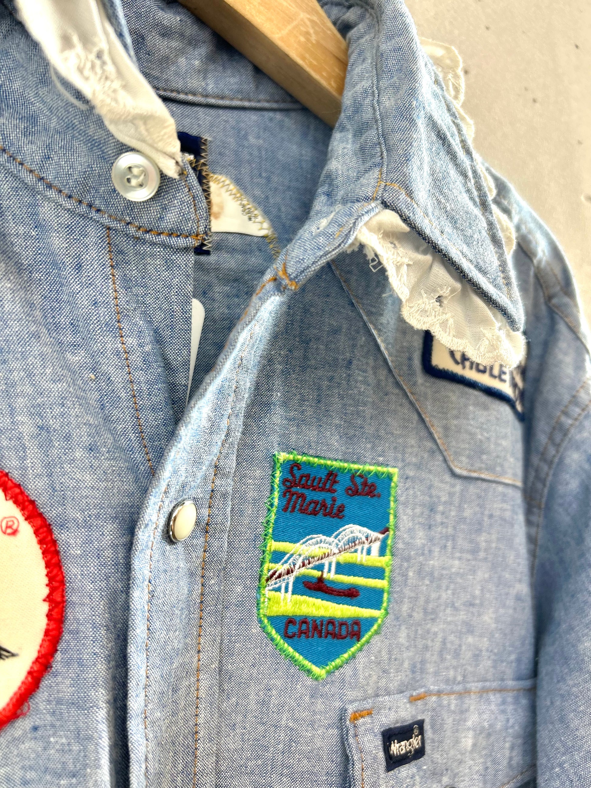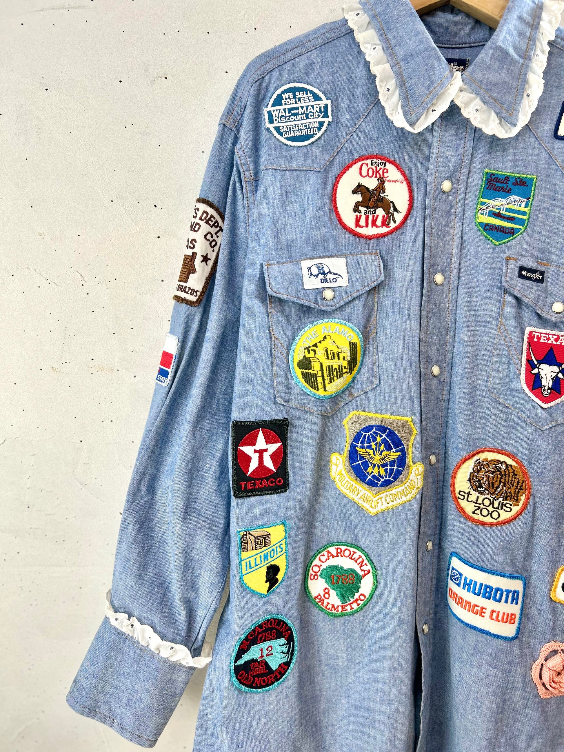 シャンブレーのさらっとした生地感のボディに、沢山のワッペンとレースがカスタムされた存在感のある1着。