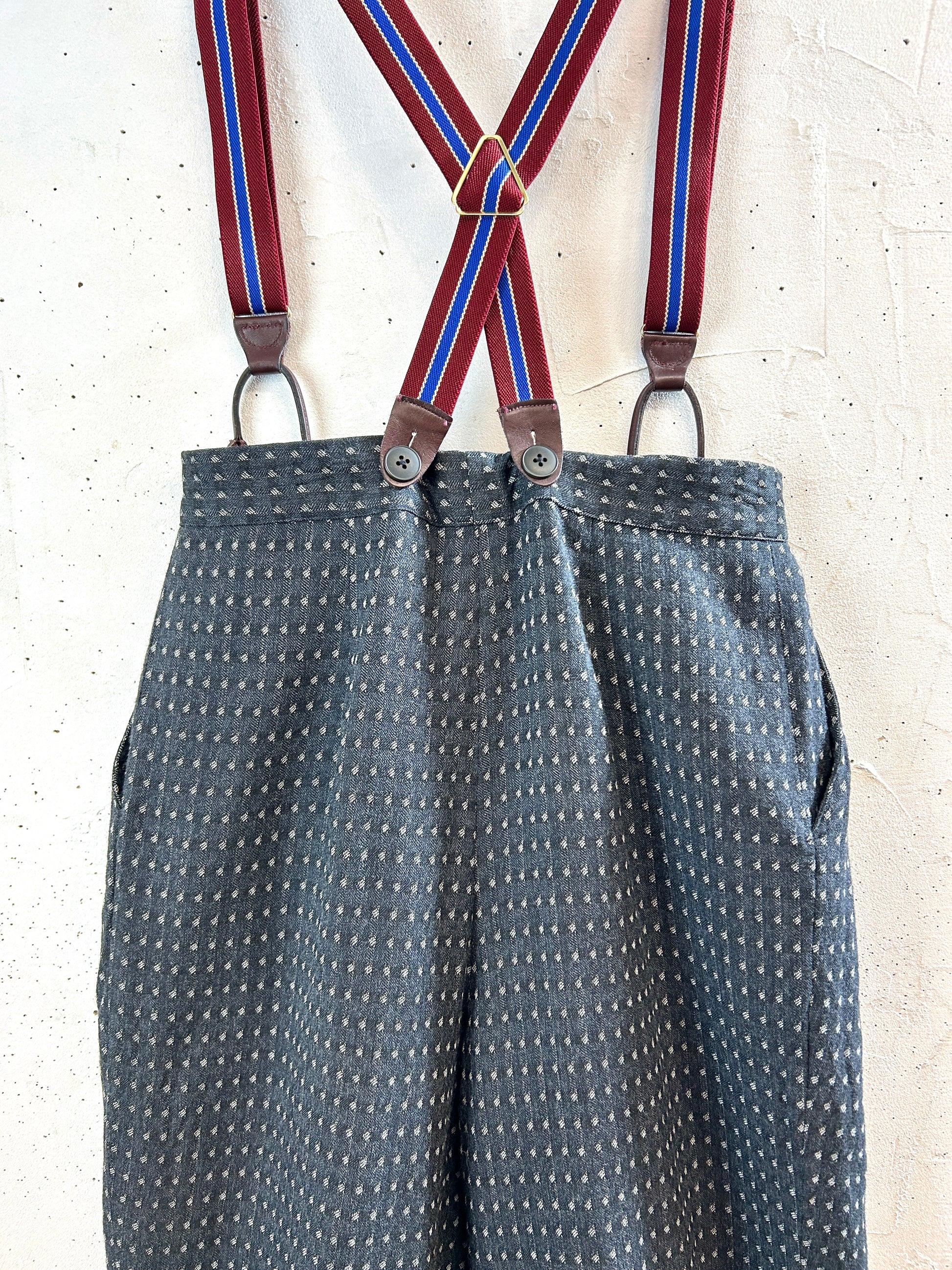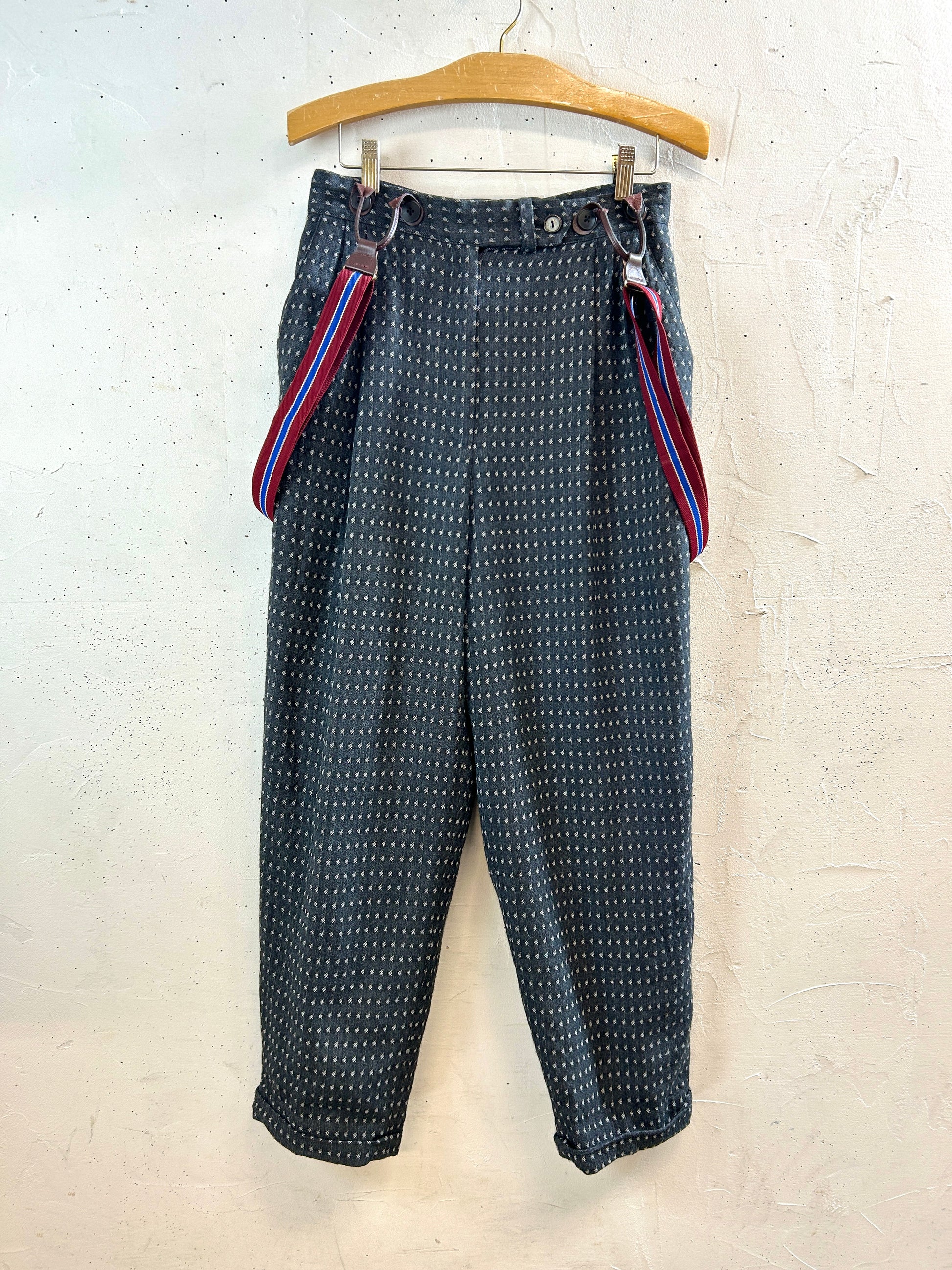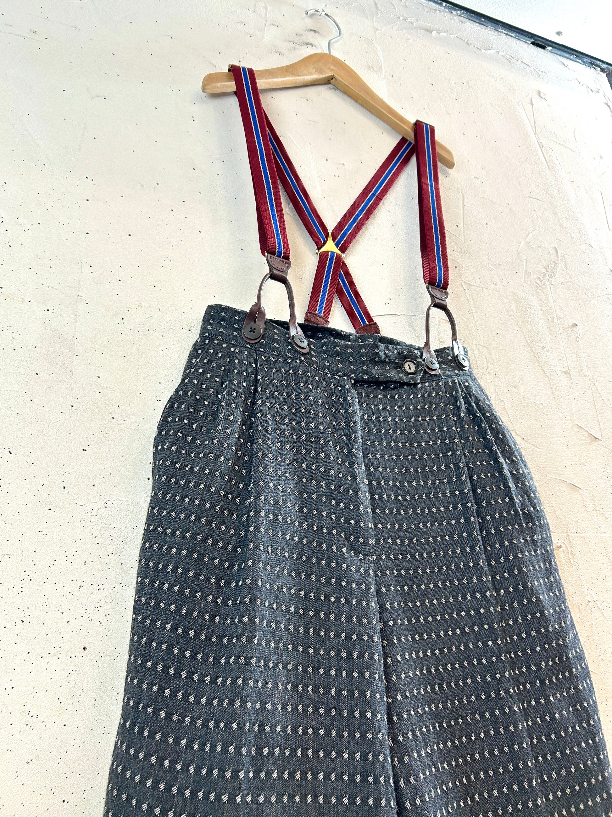 チャコールグレーとブラックのチェックになんとも言えない細かな織り柄の入ったデザイン性の高いサスペンダーの付いたウールパンツになります。