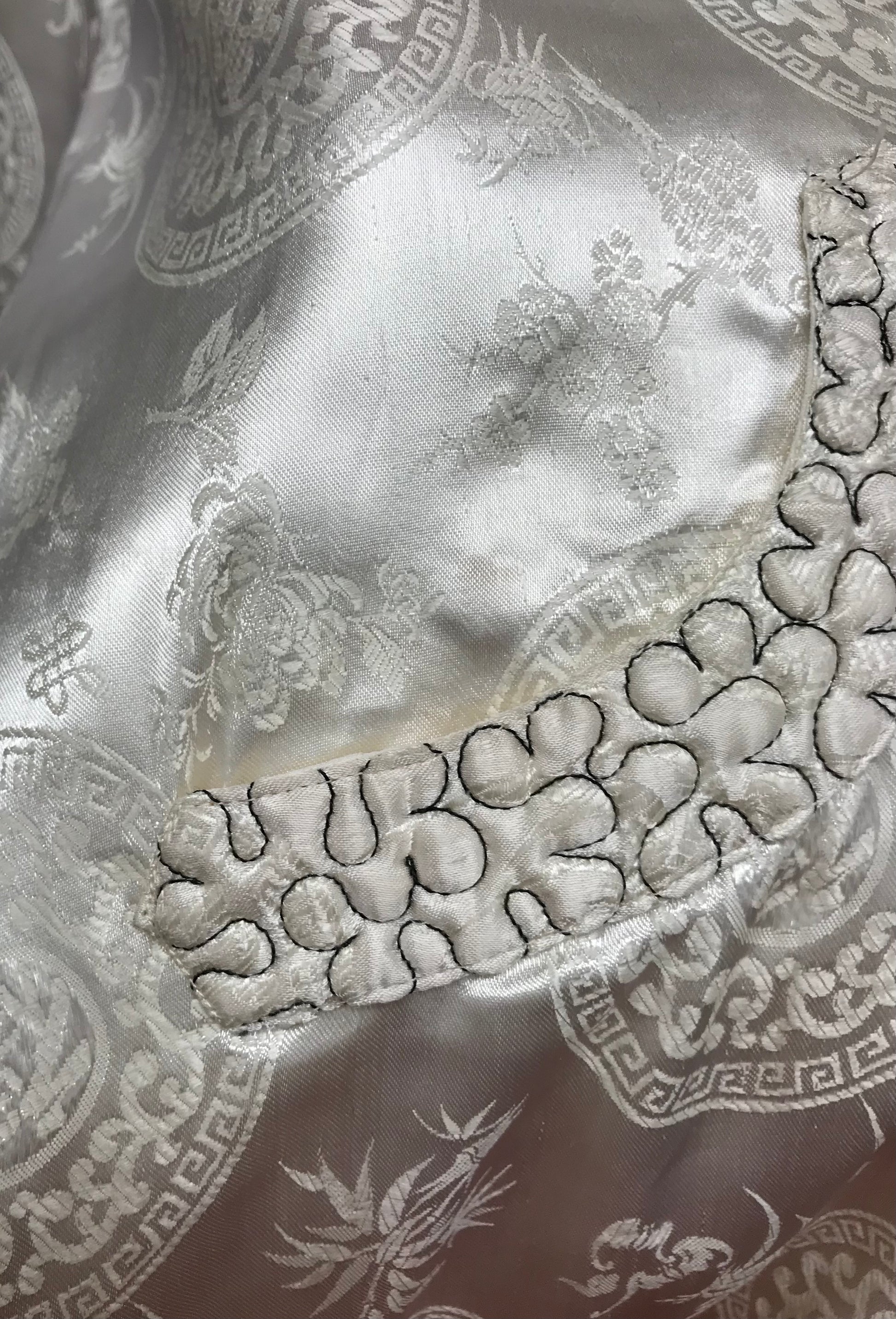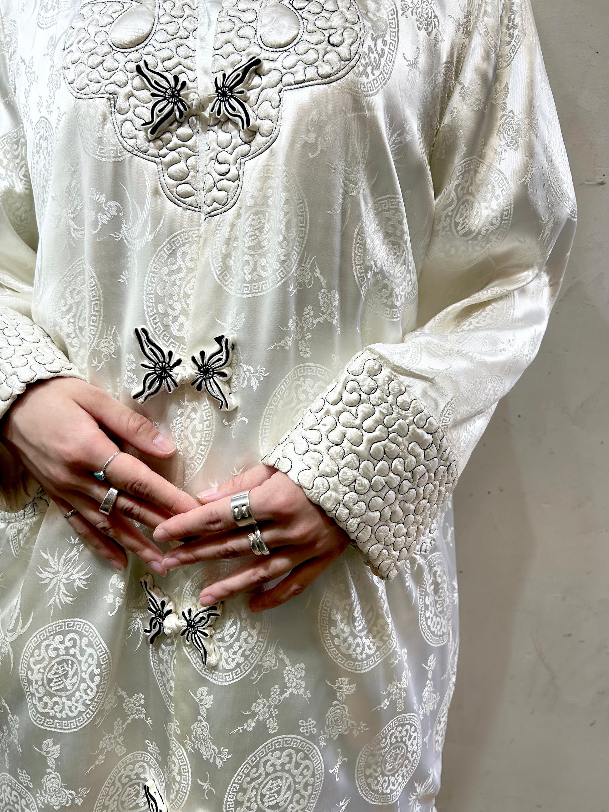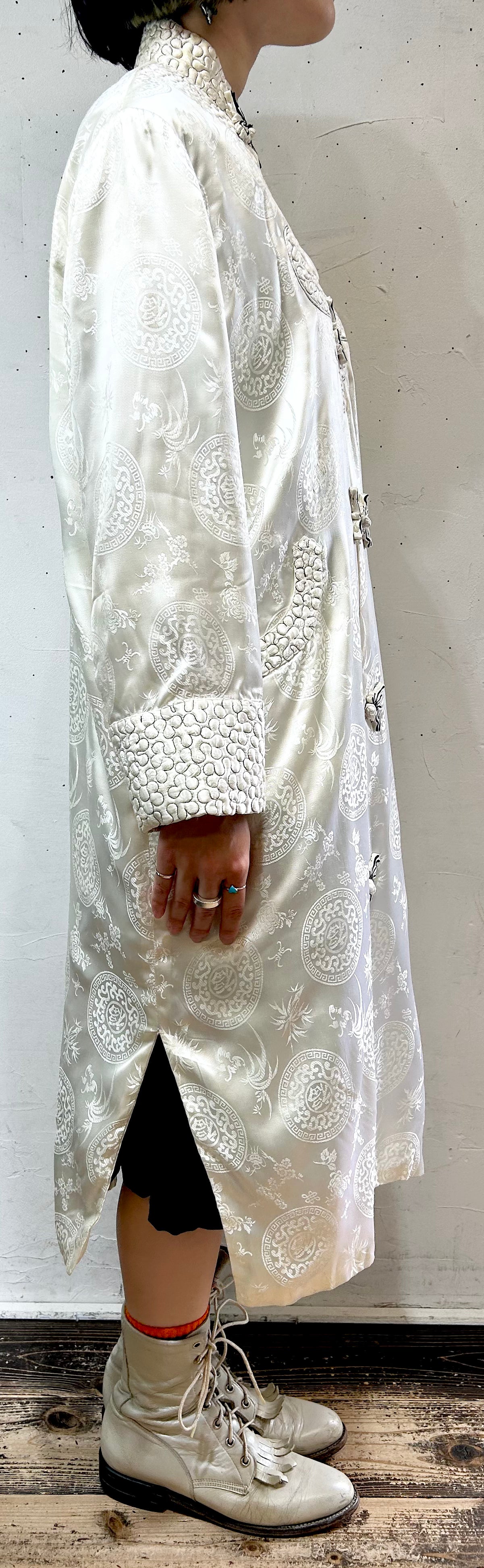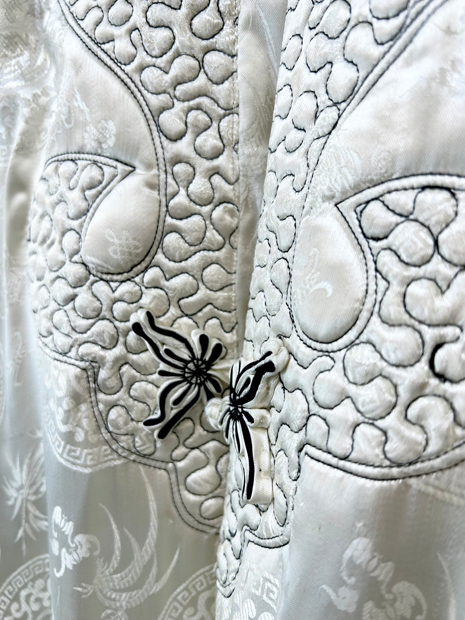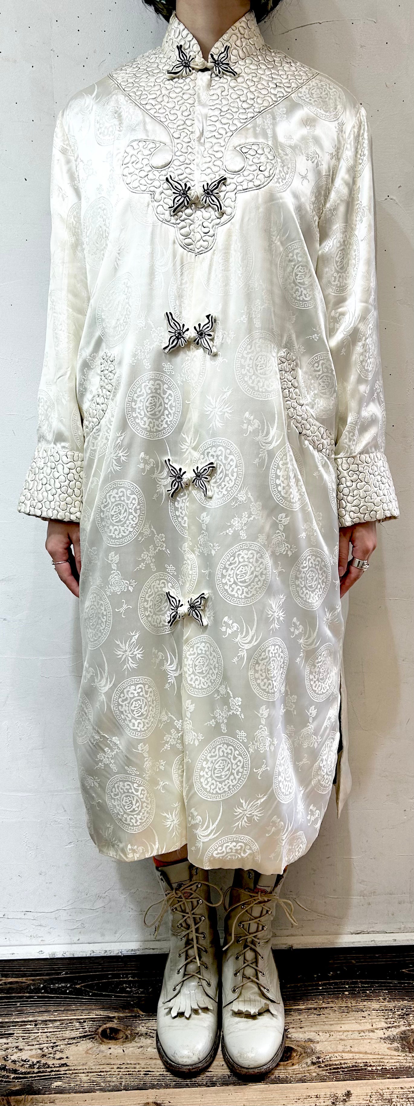 こちらのガウンはパッと目を惹くホワイトボディとブラックのステッチやチャイナボタンが魅力的な1着。