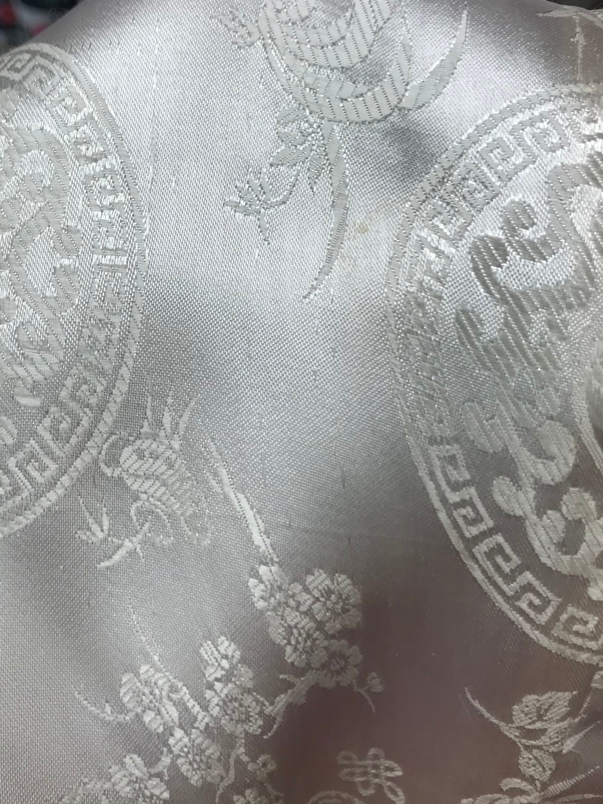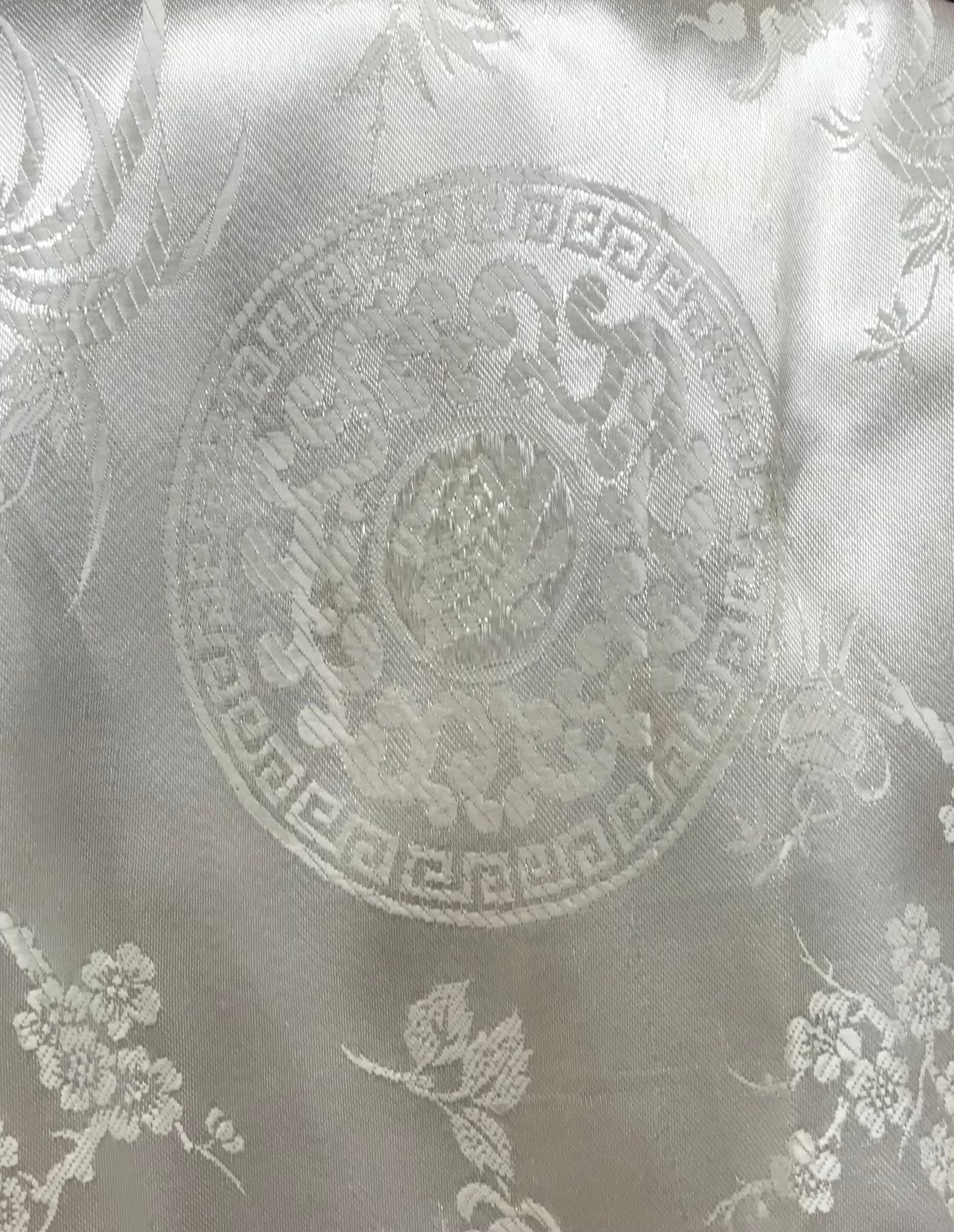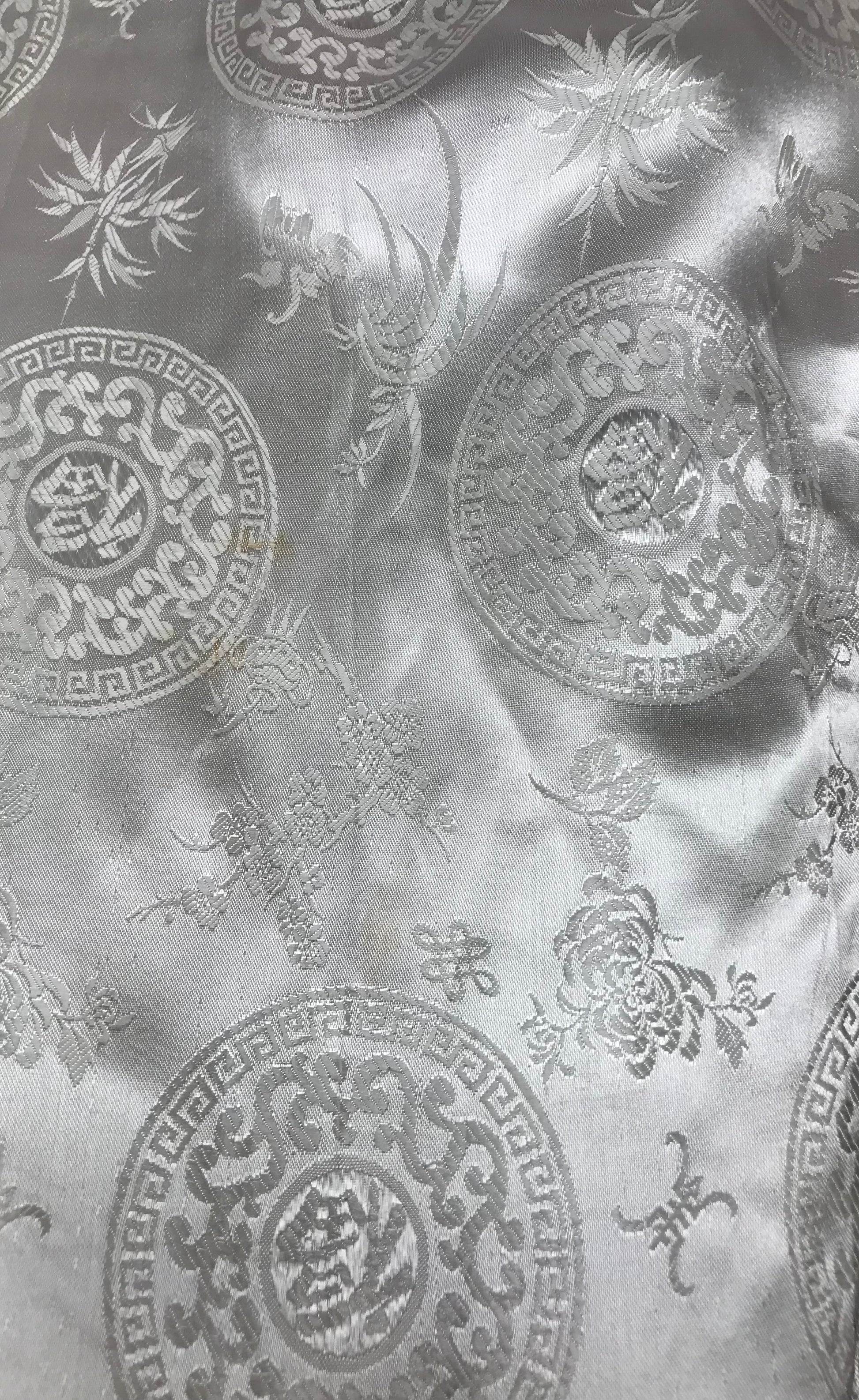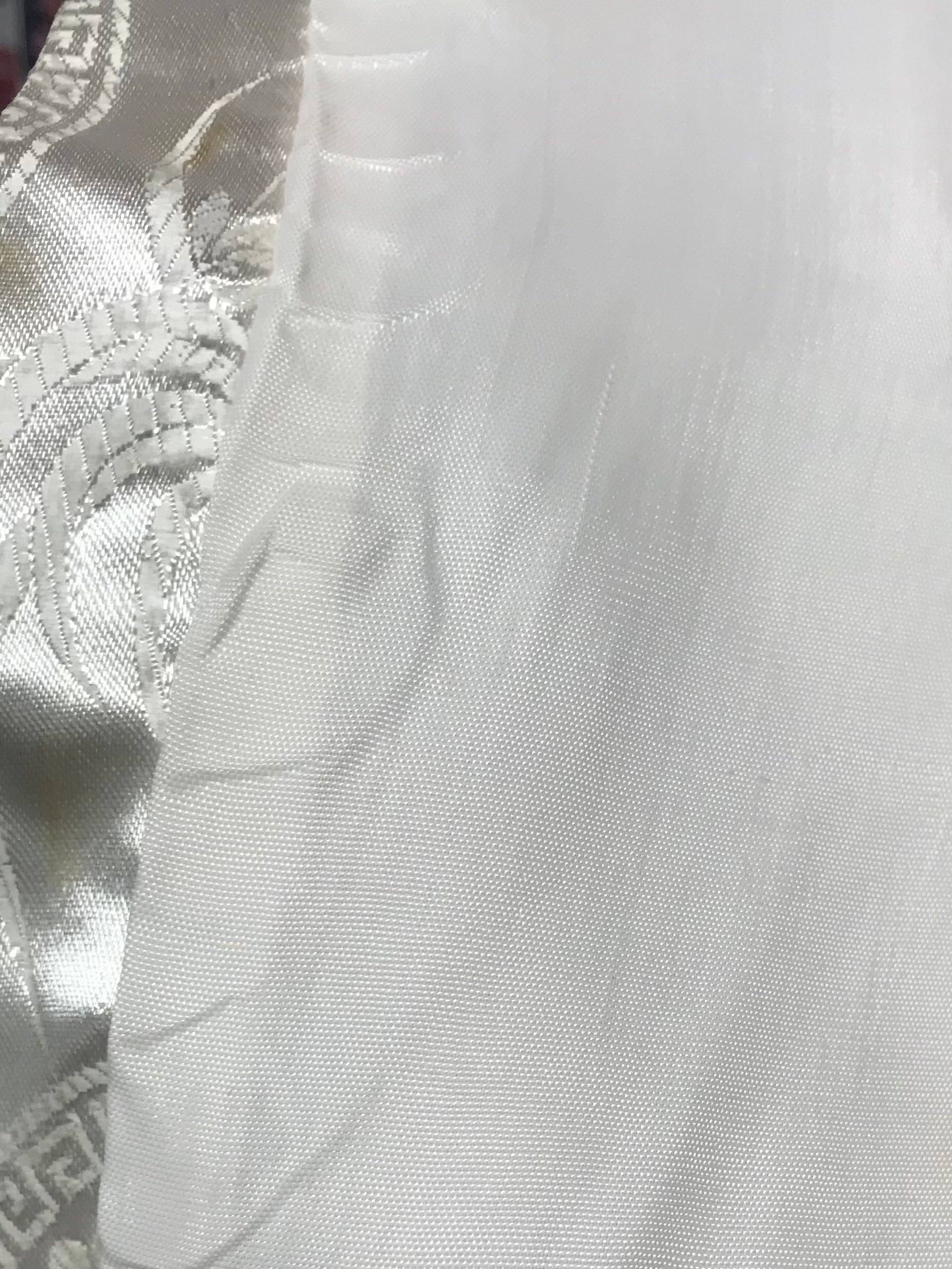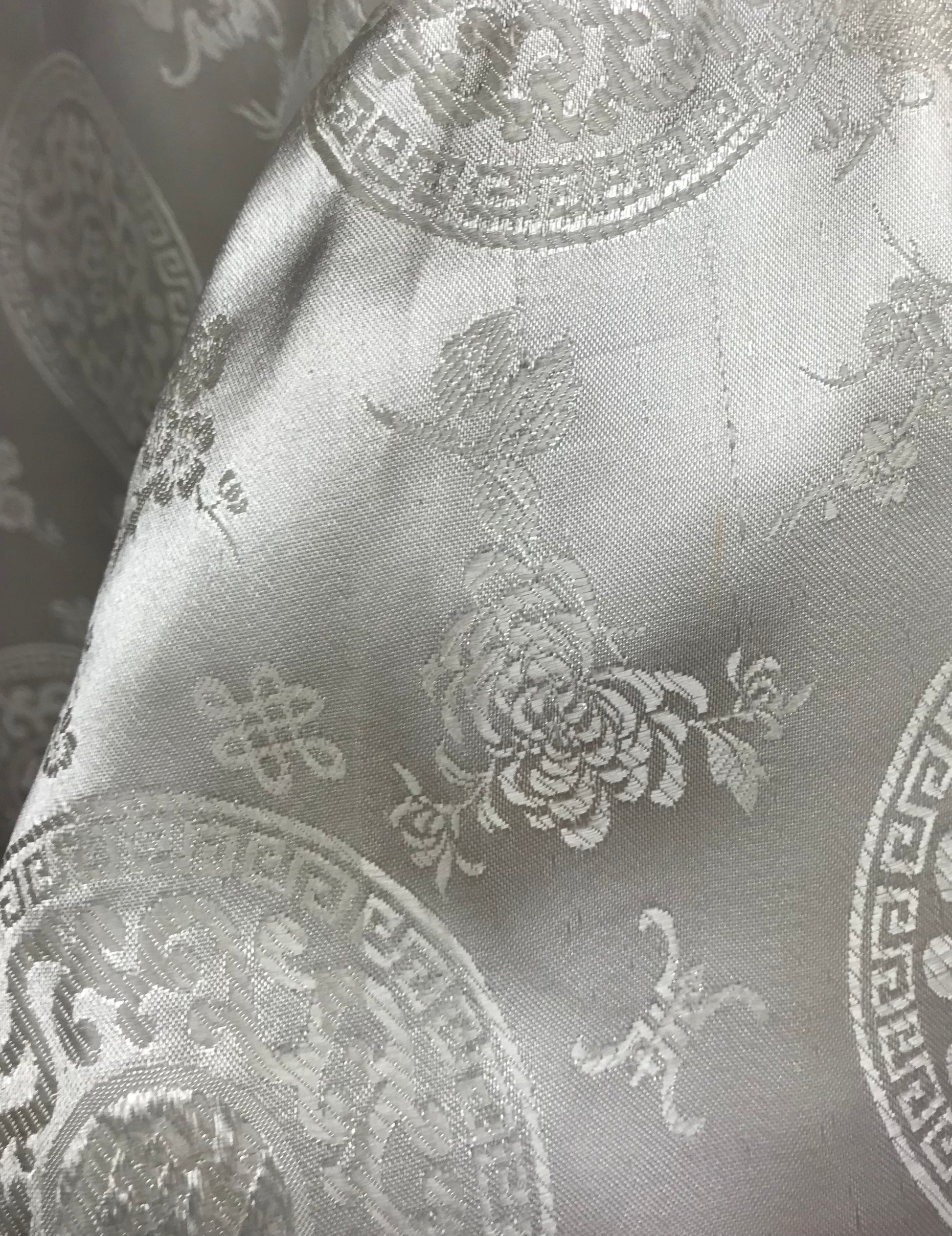 サテンの光沢感と草花の織り模様や、福の文字がデザインされた生地はどこから見ても惚れ惚れする美しさです。
