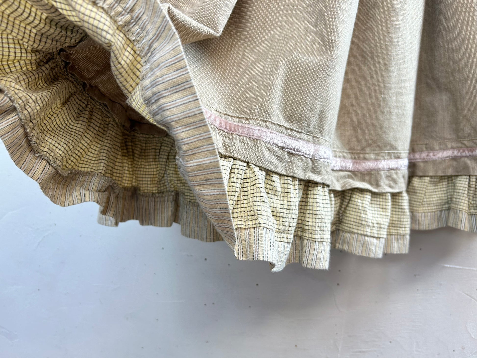 シンプルなベージュボディにチェックの切替やフリルが可愛いらしい一着。