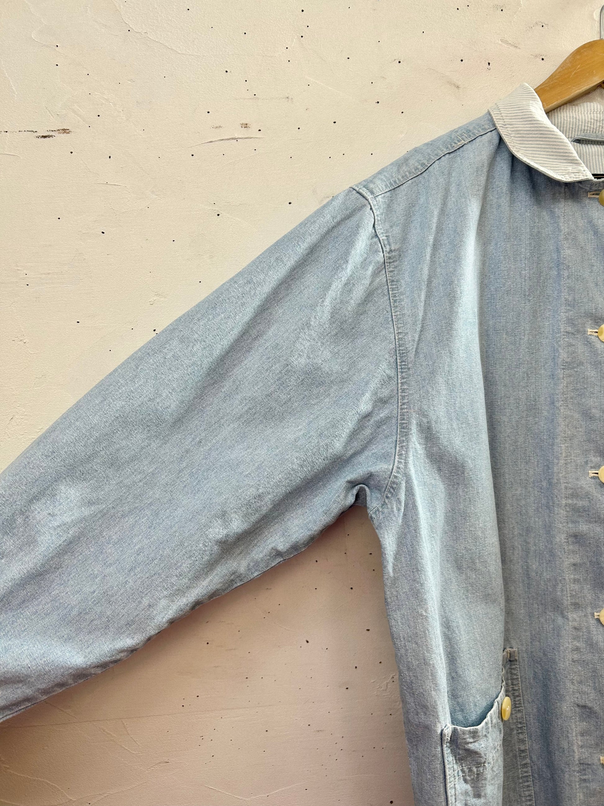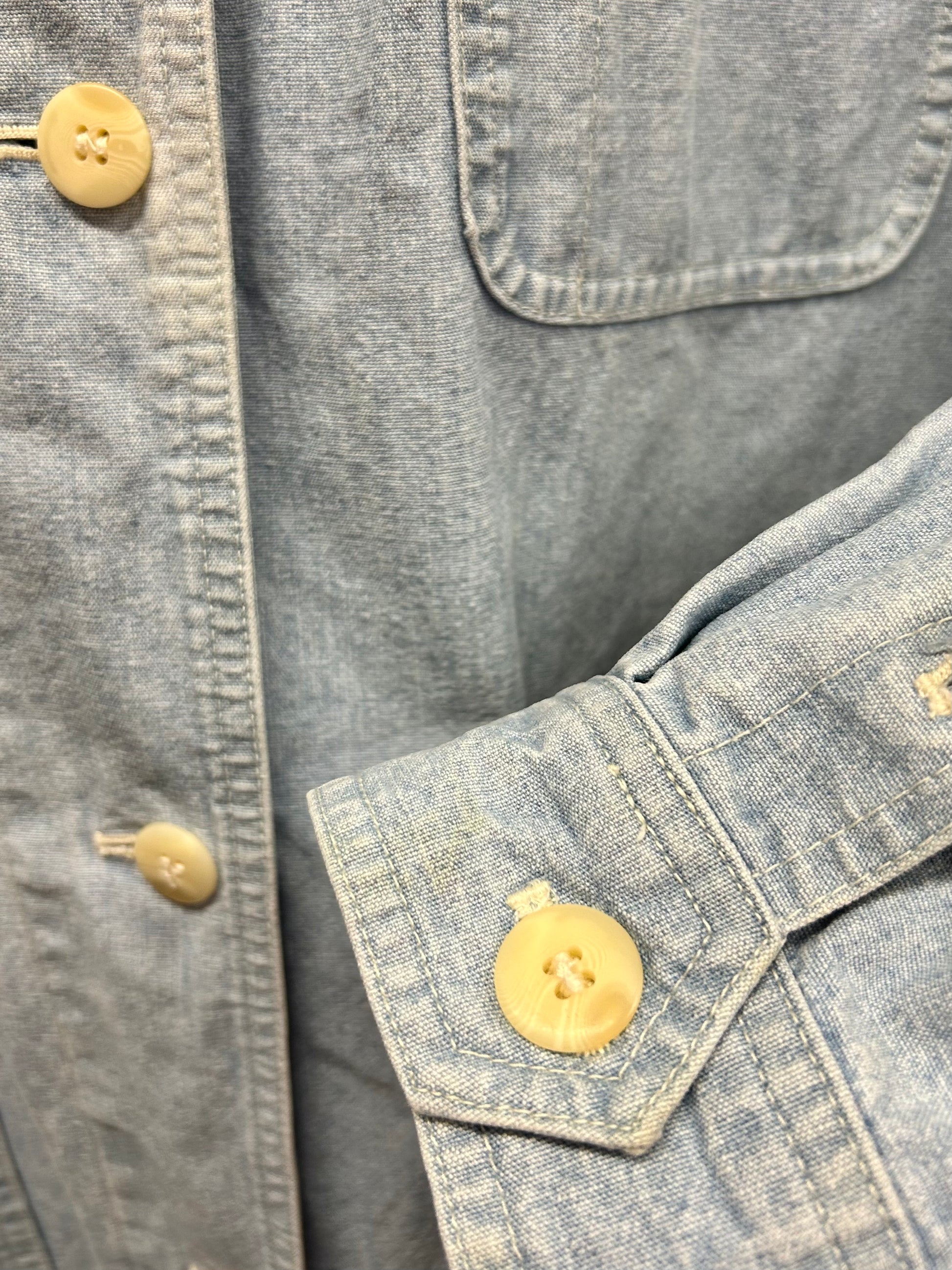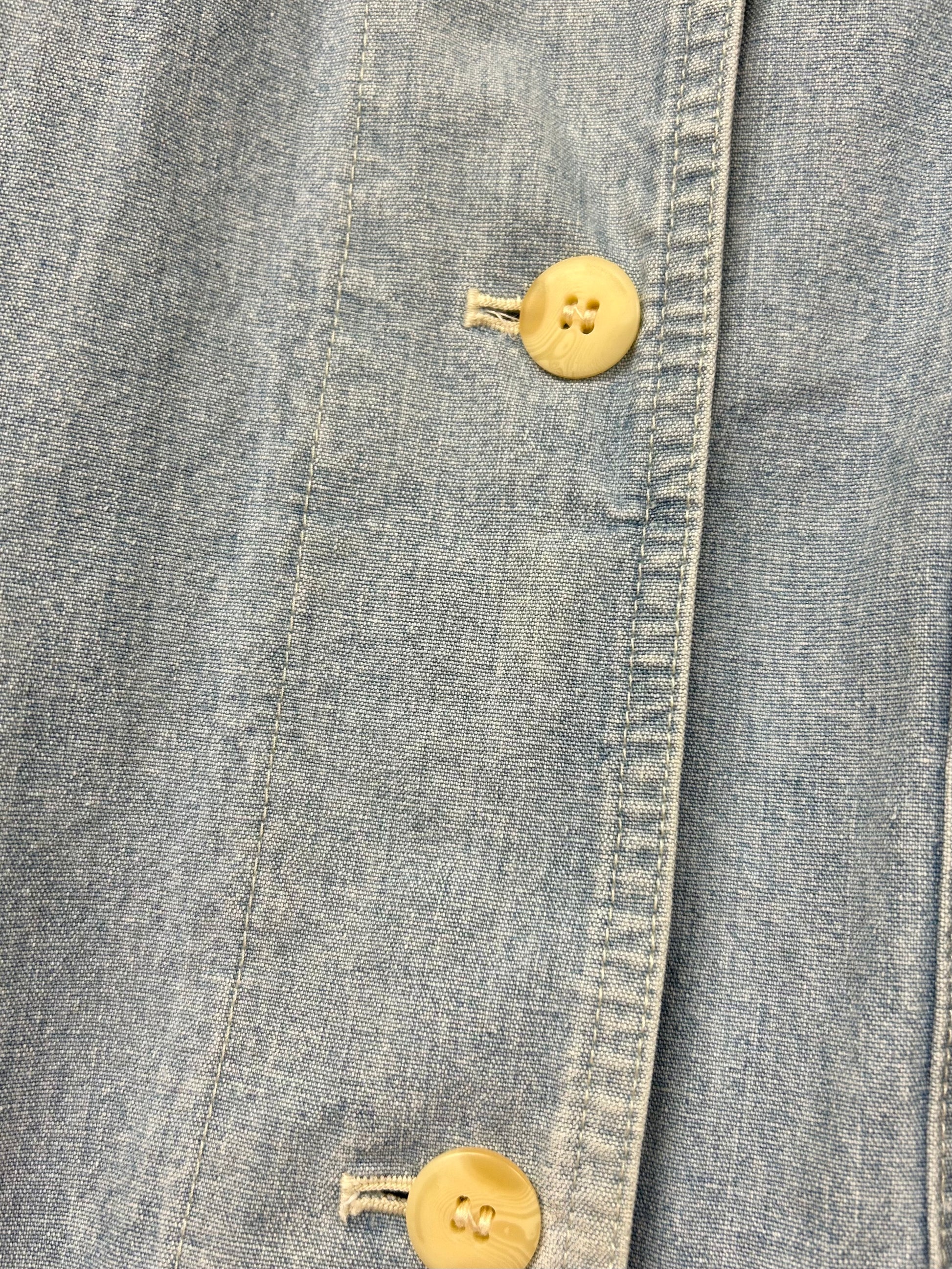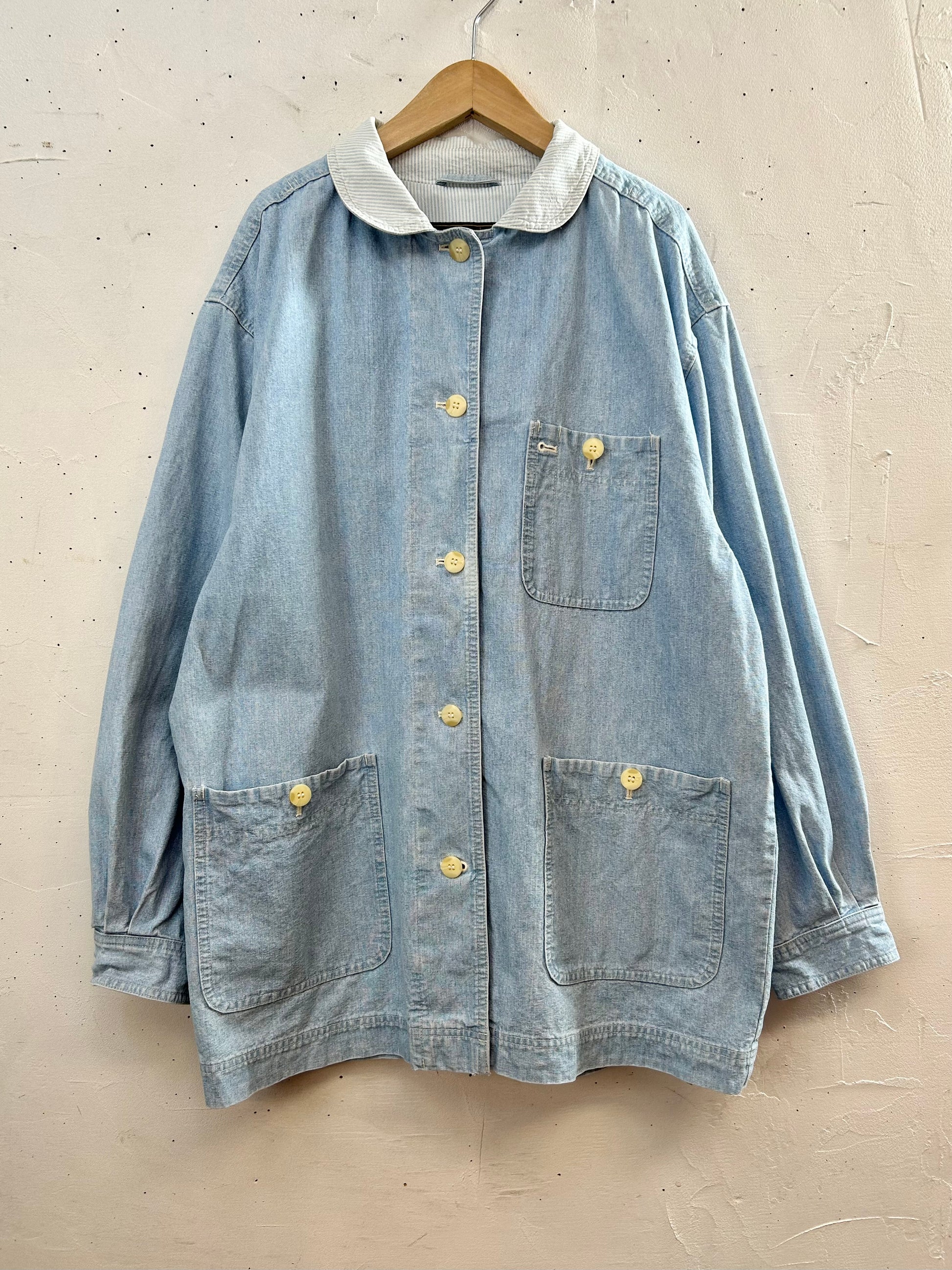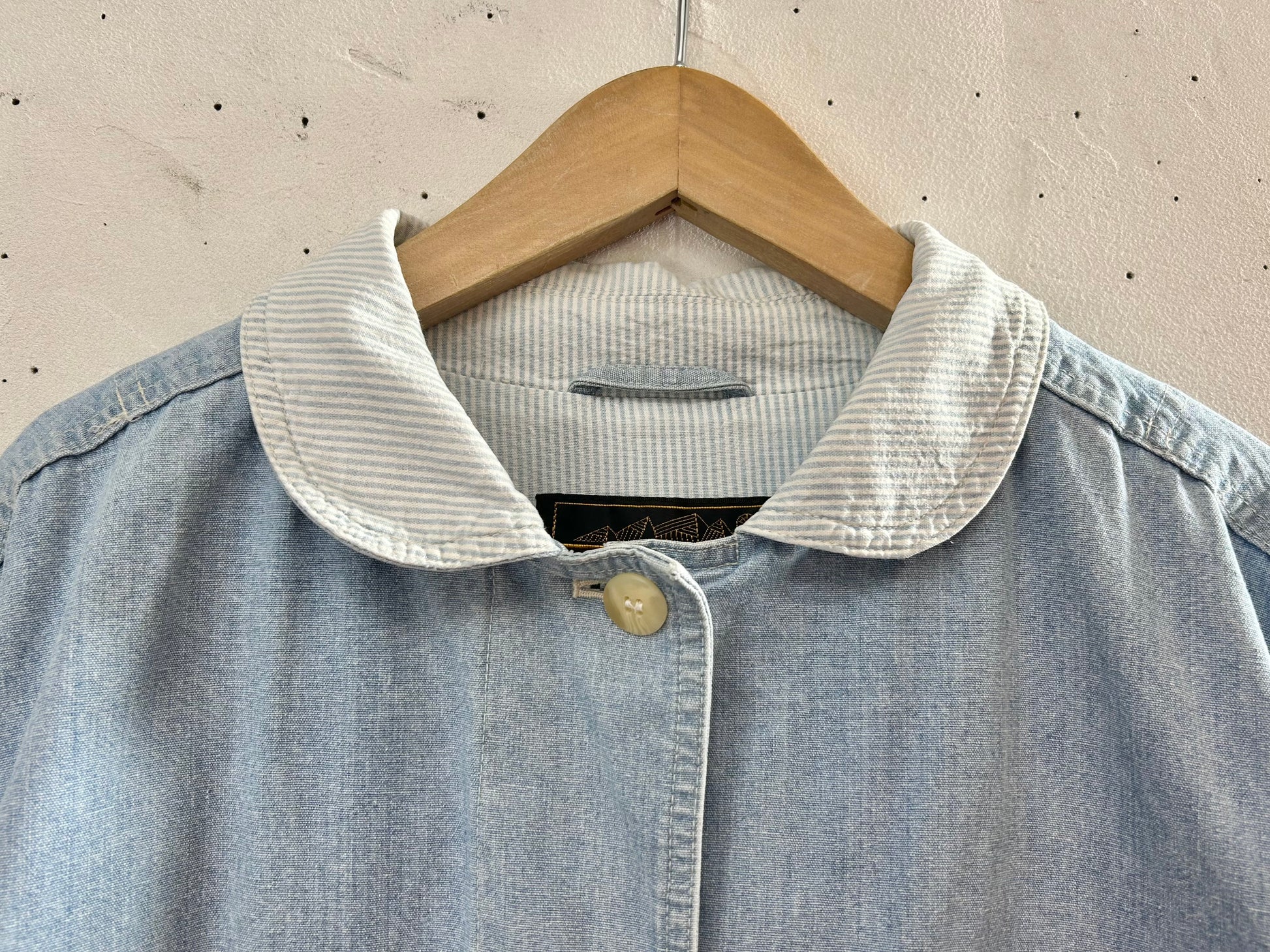ライトブルーのデニムボディにストライプの襟がポイントになった一着。