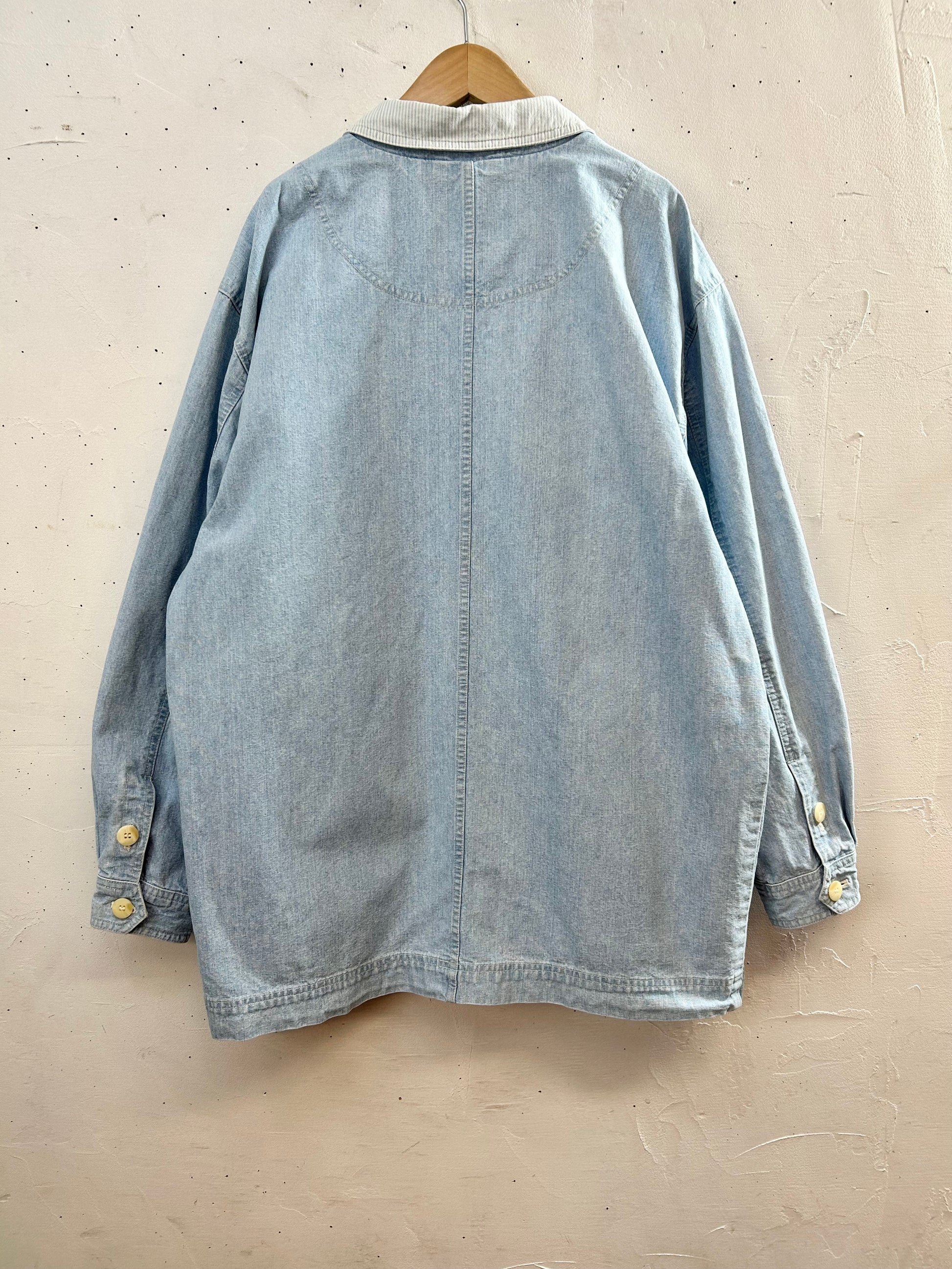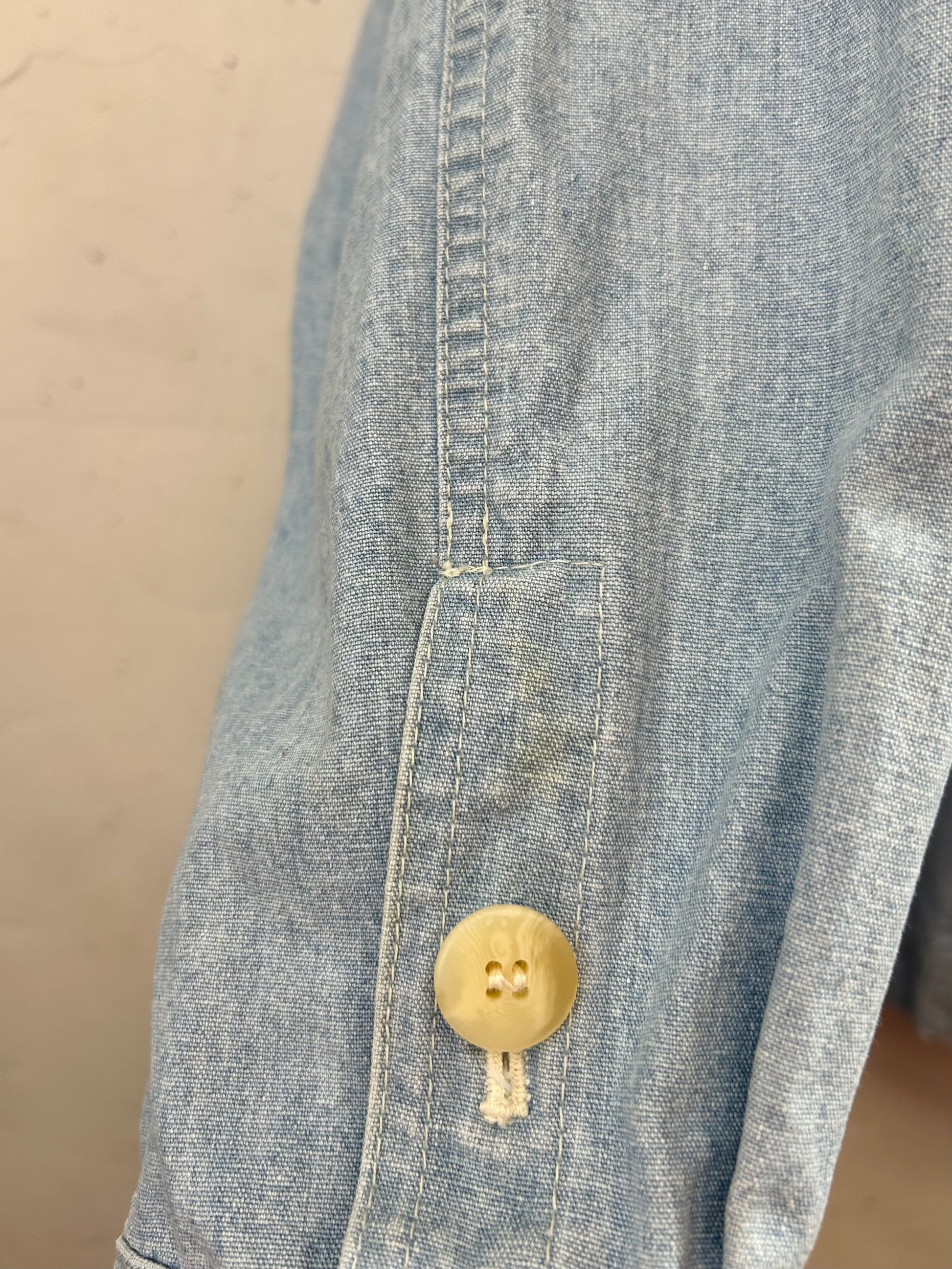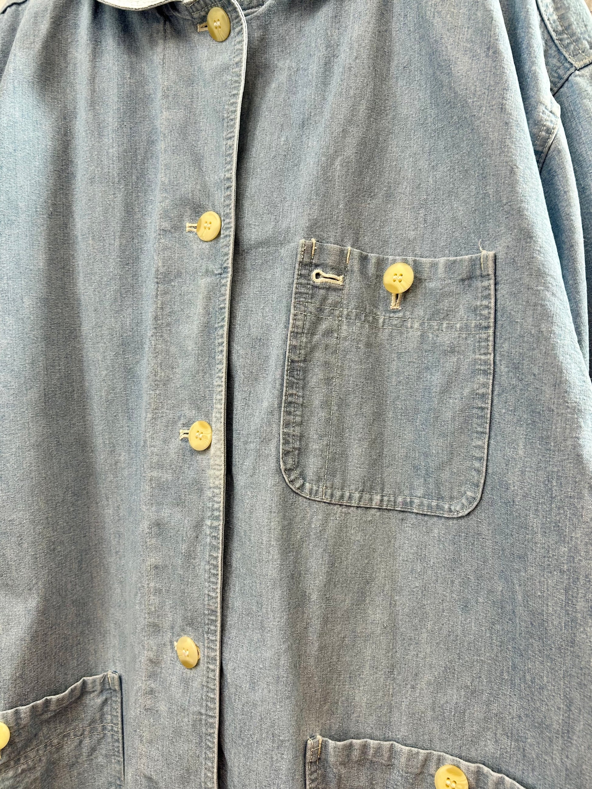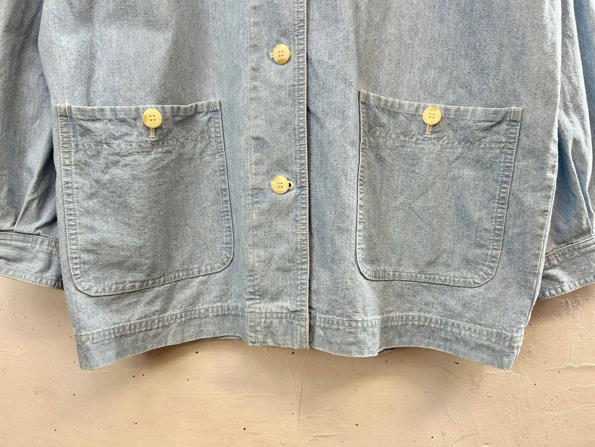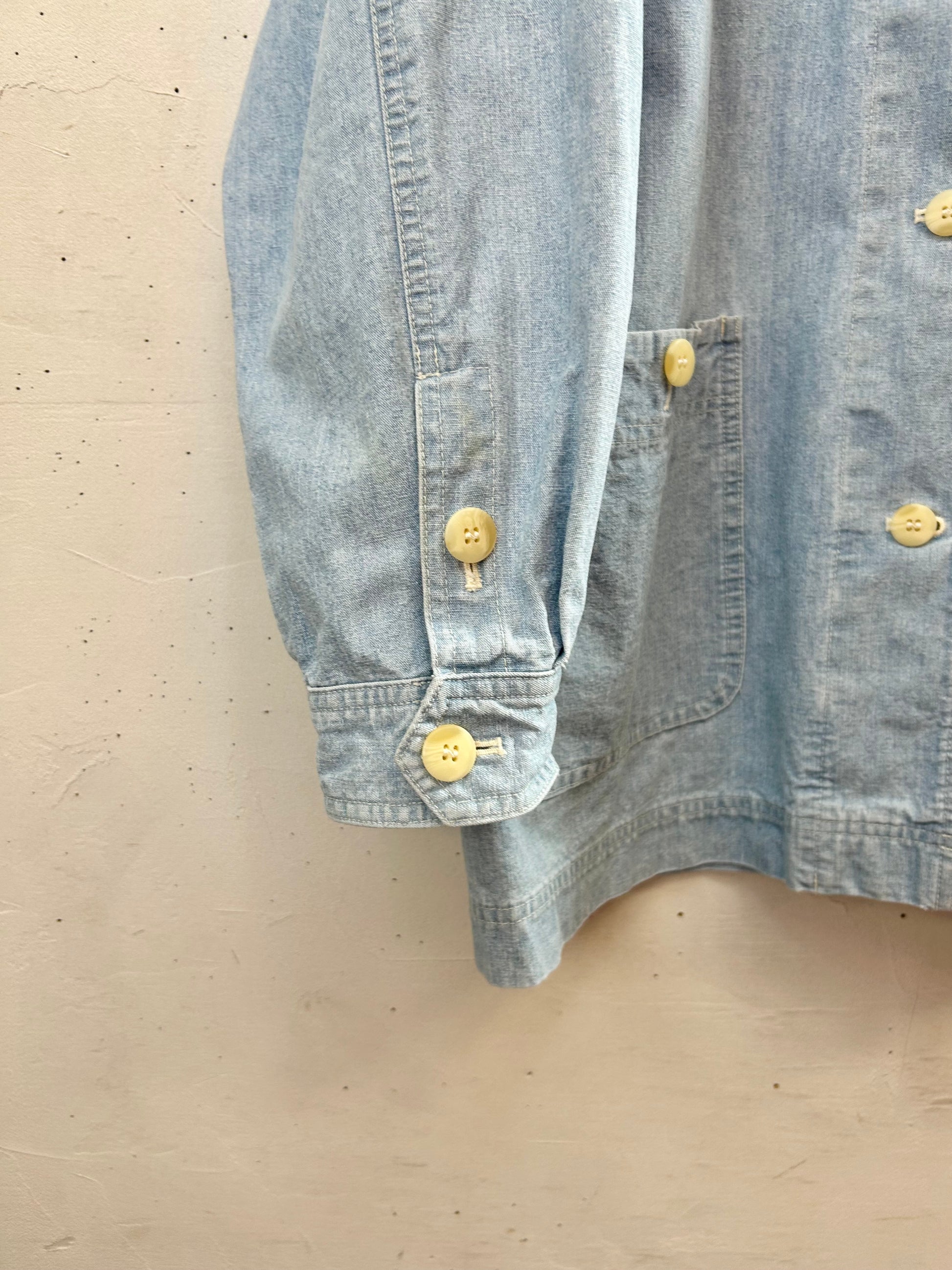 ライトブルーのデニムボディにストライプの襟がポイントになった一着。