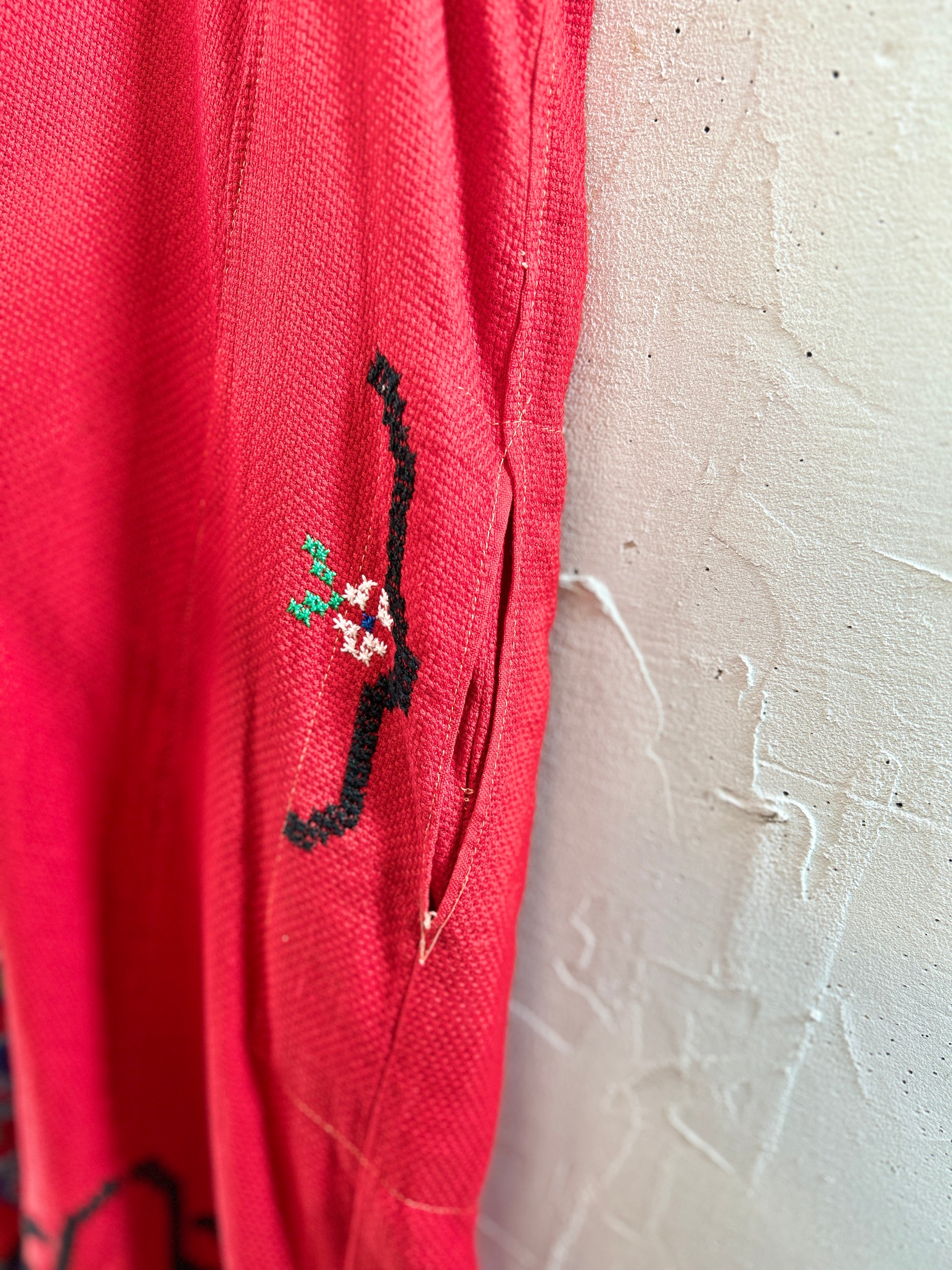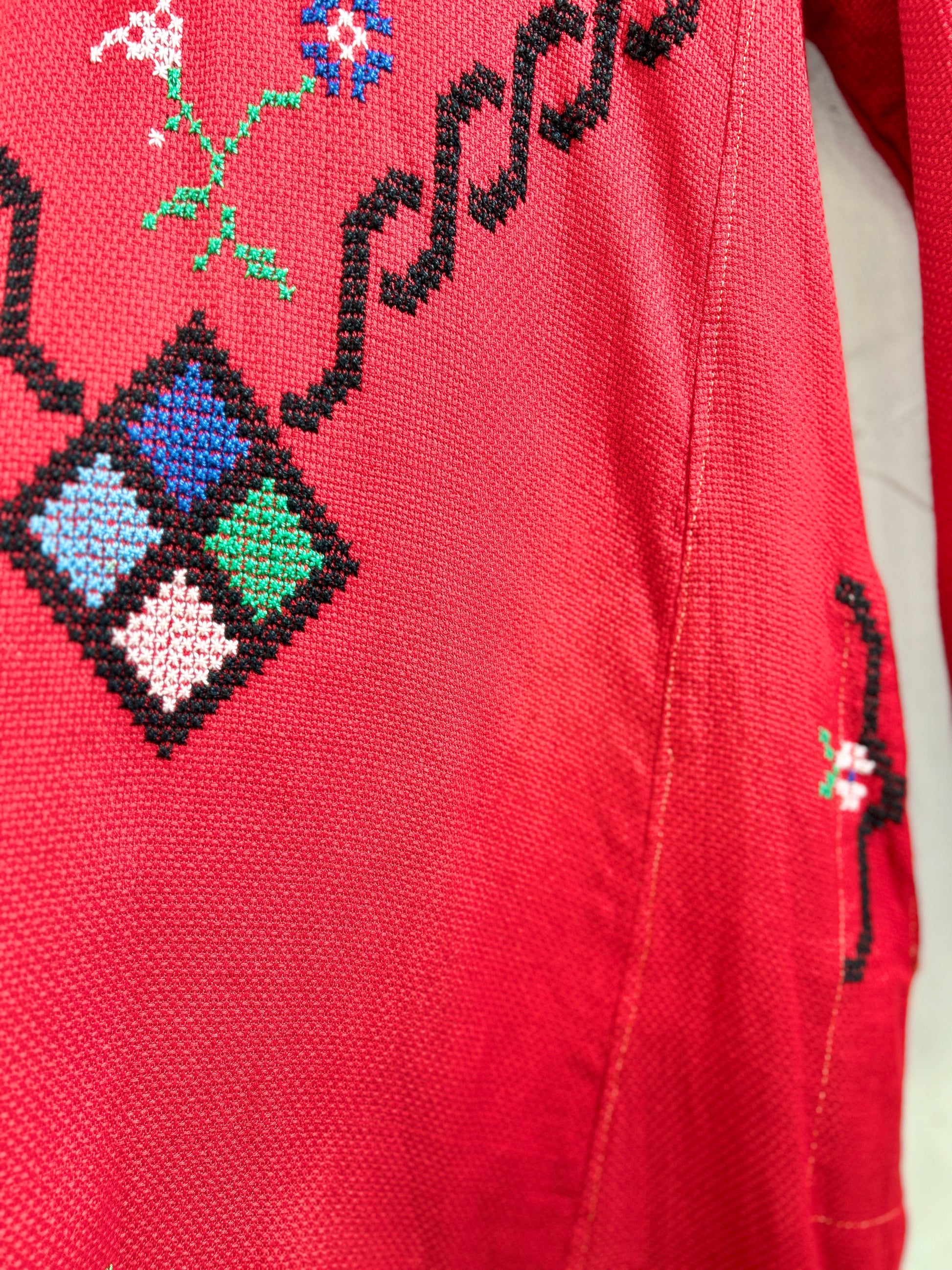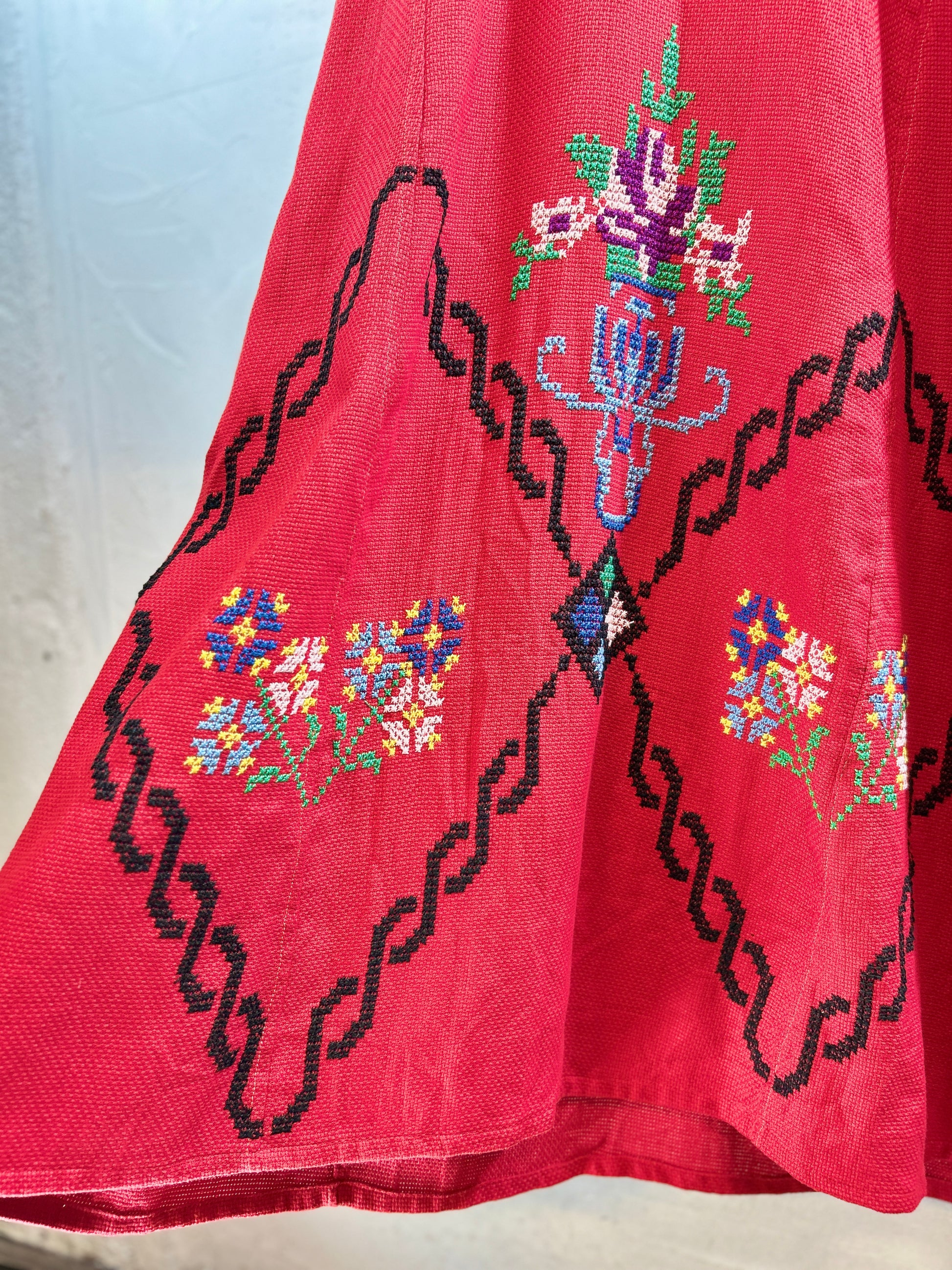 真っ赤なドレスに大胆に描かれたクロスステッチの絵柄が目を惹く1着。