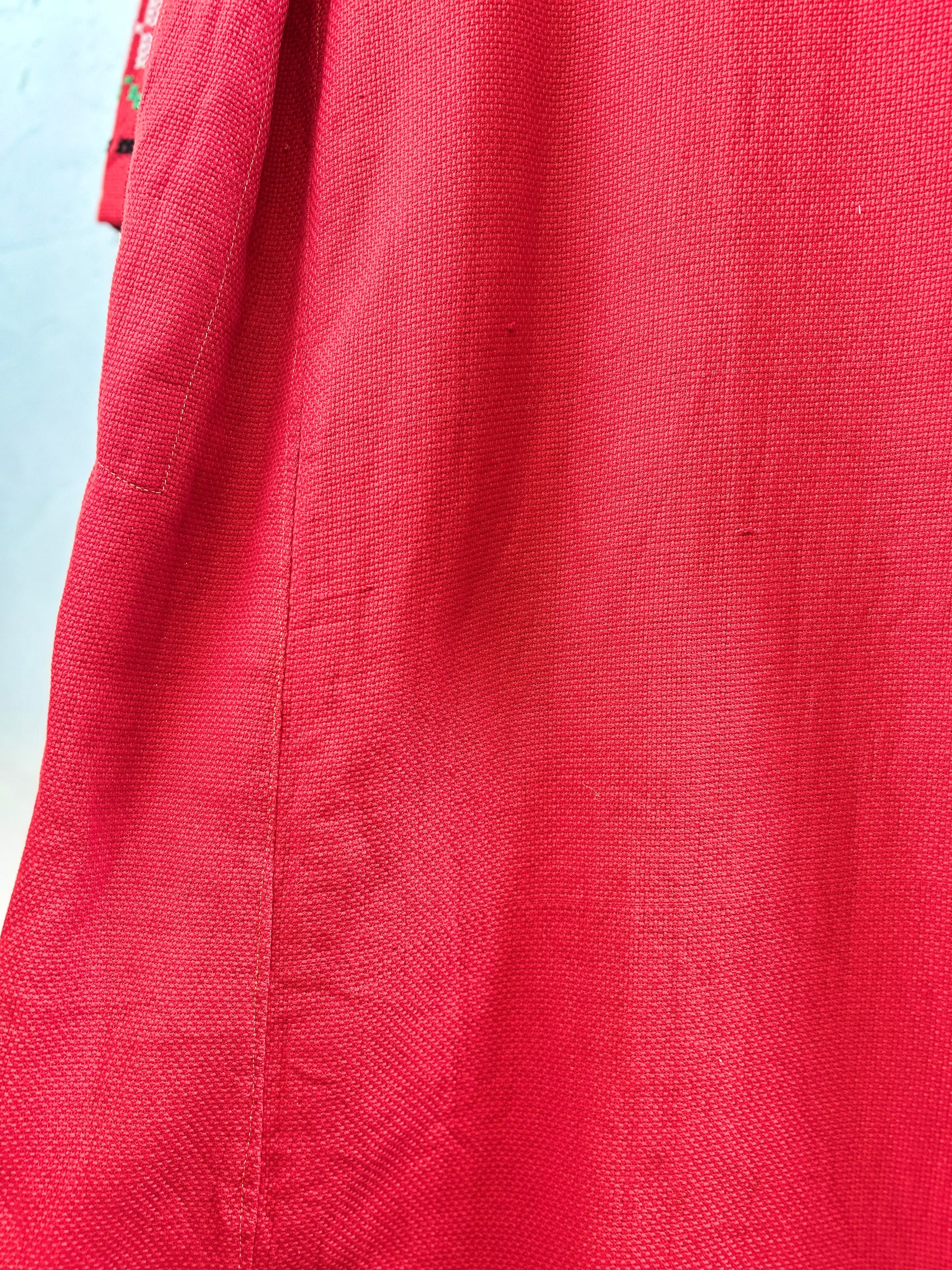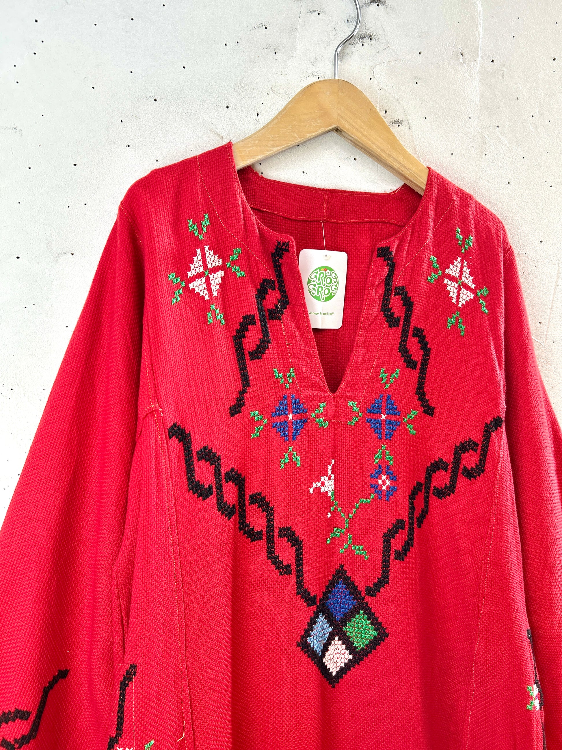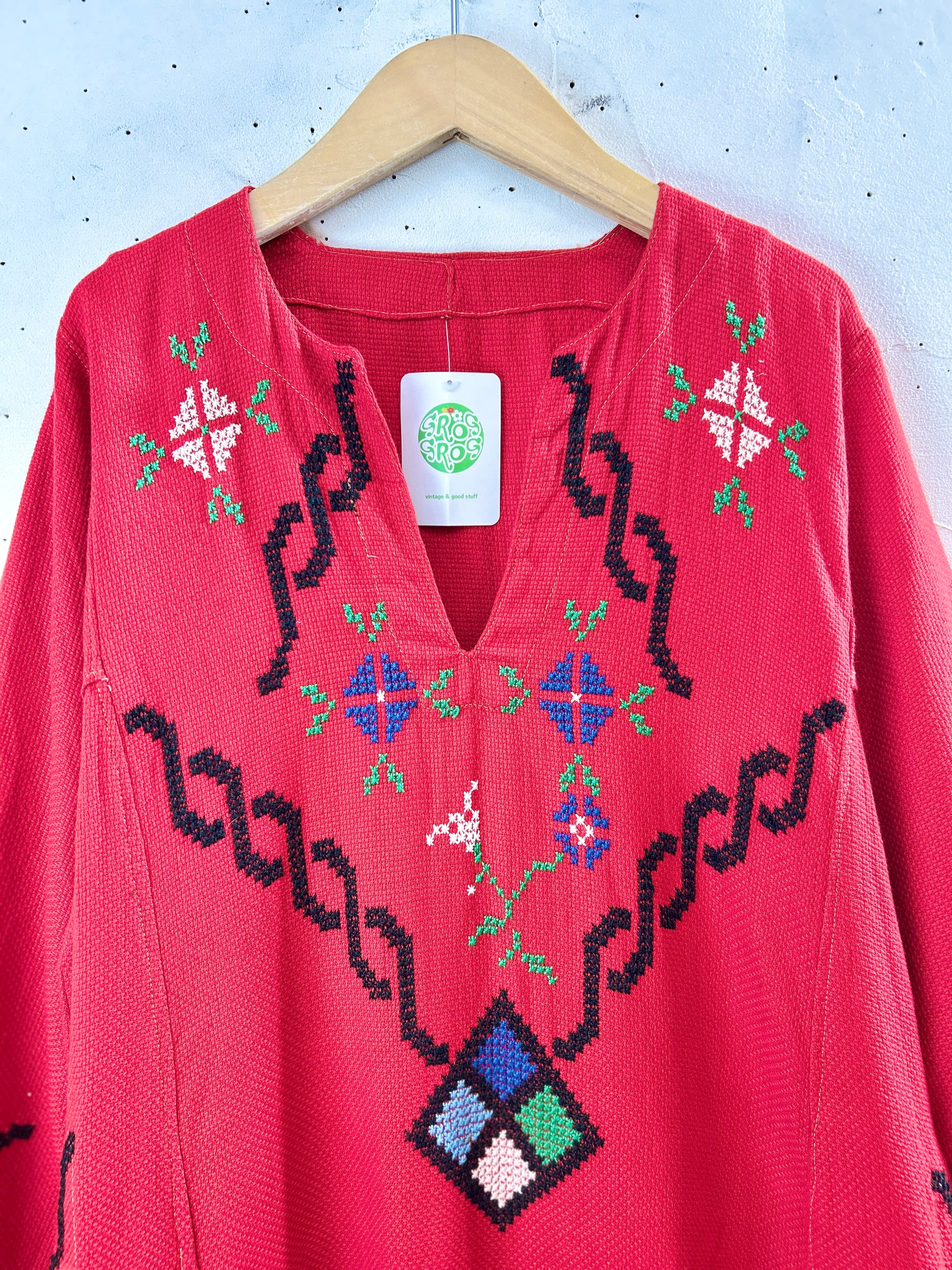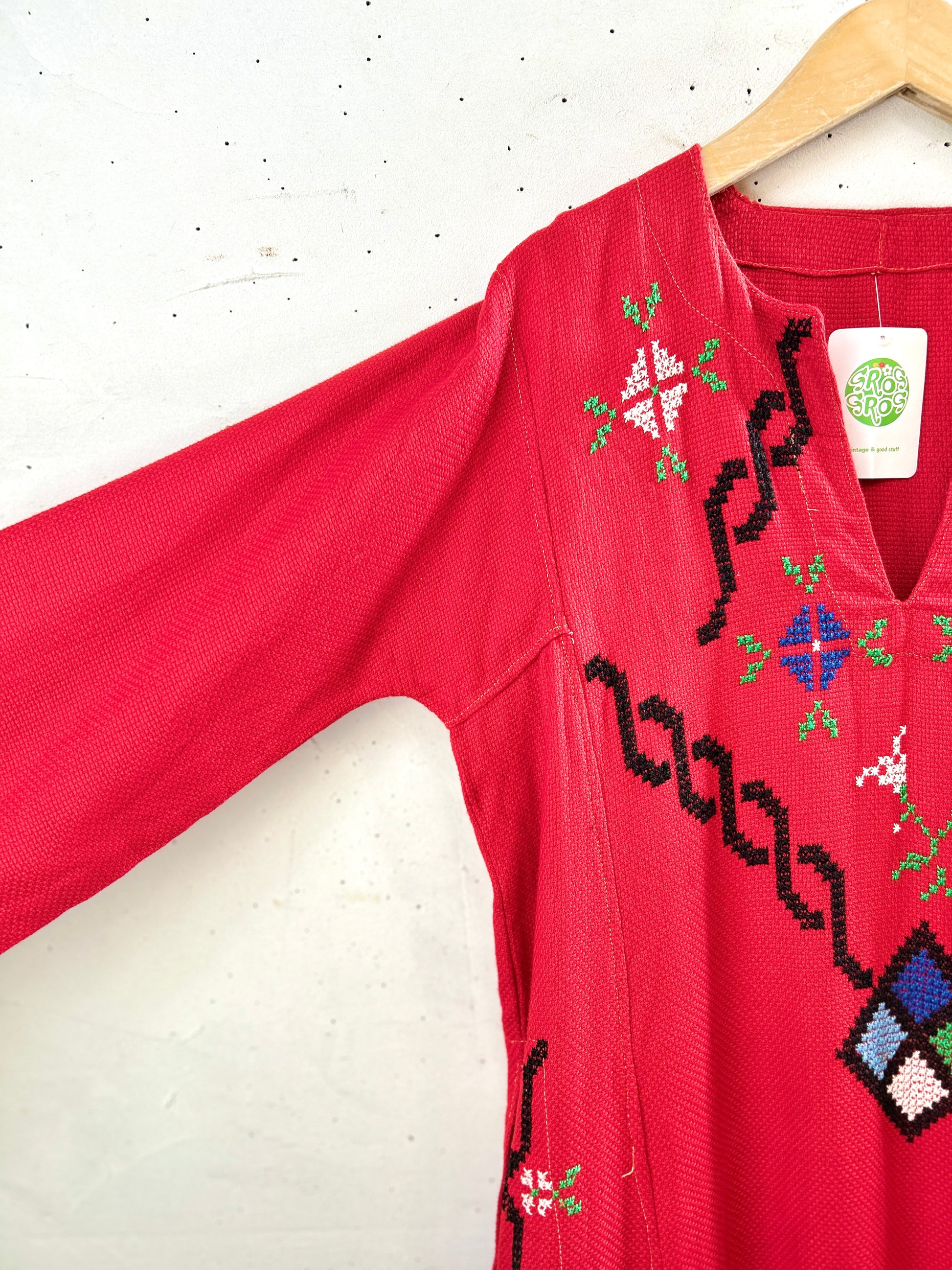 真っ赤なドレスに大胆に描かれたクロスステッチの絵柄が目を惹く1着。