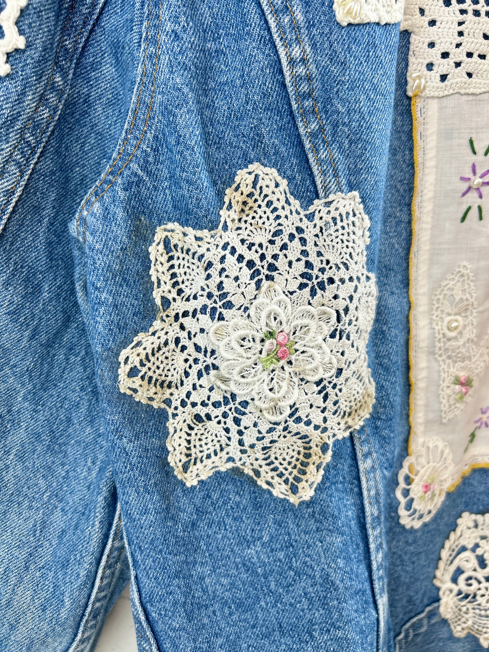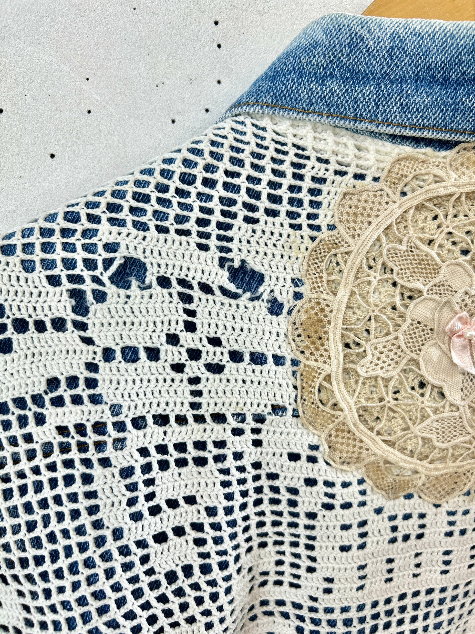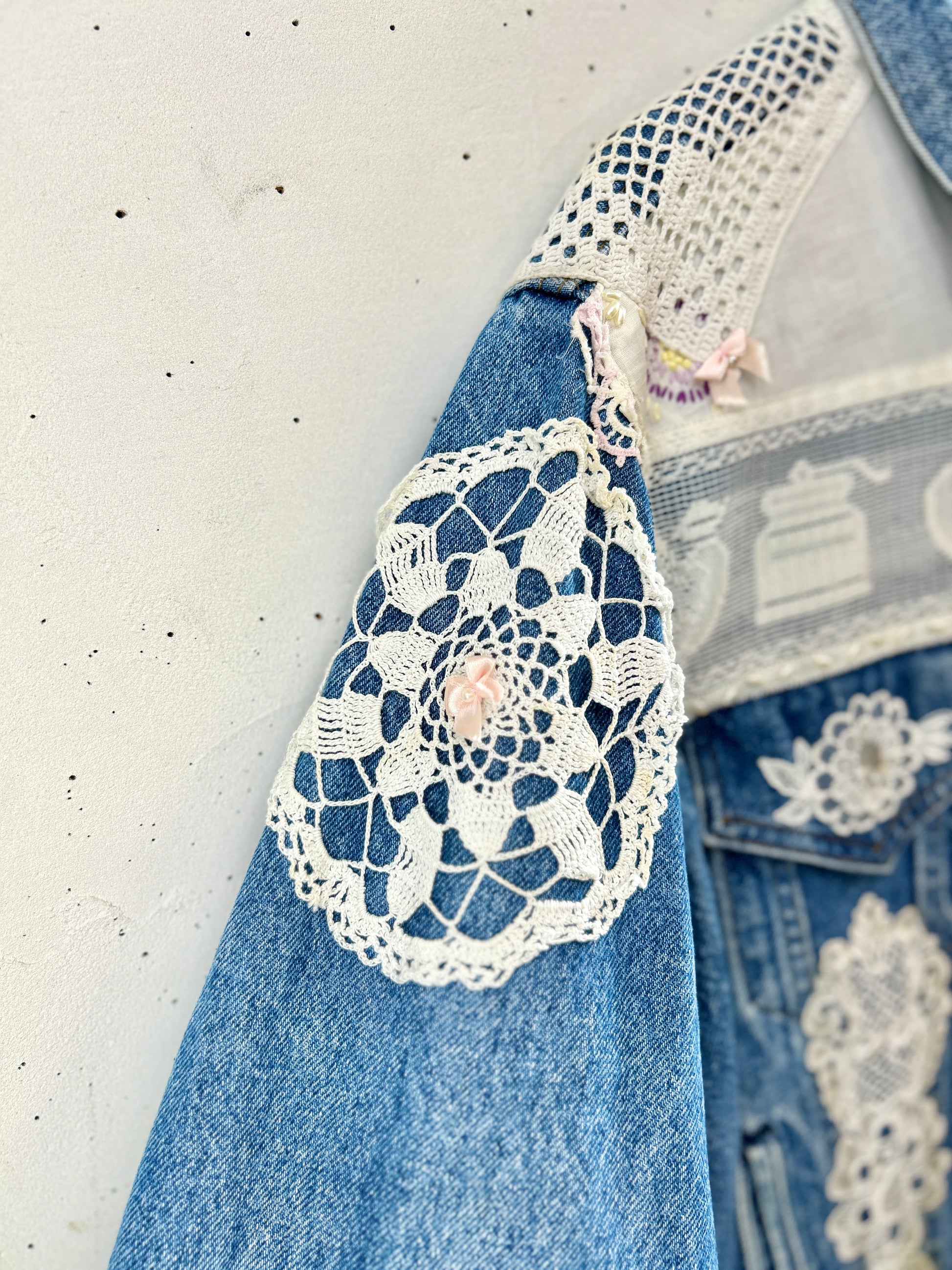 Levi’sのデニムに手の込んだ豪華なドイリーやレース編み等を贅沢に使用しカスタムした一着。